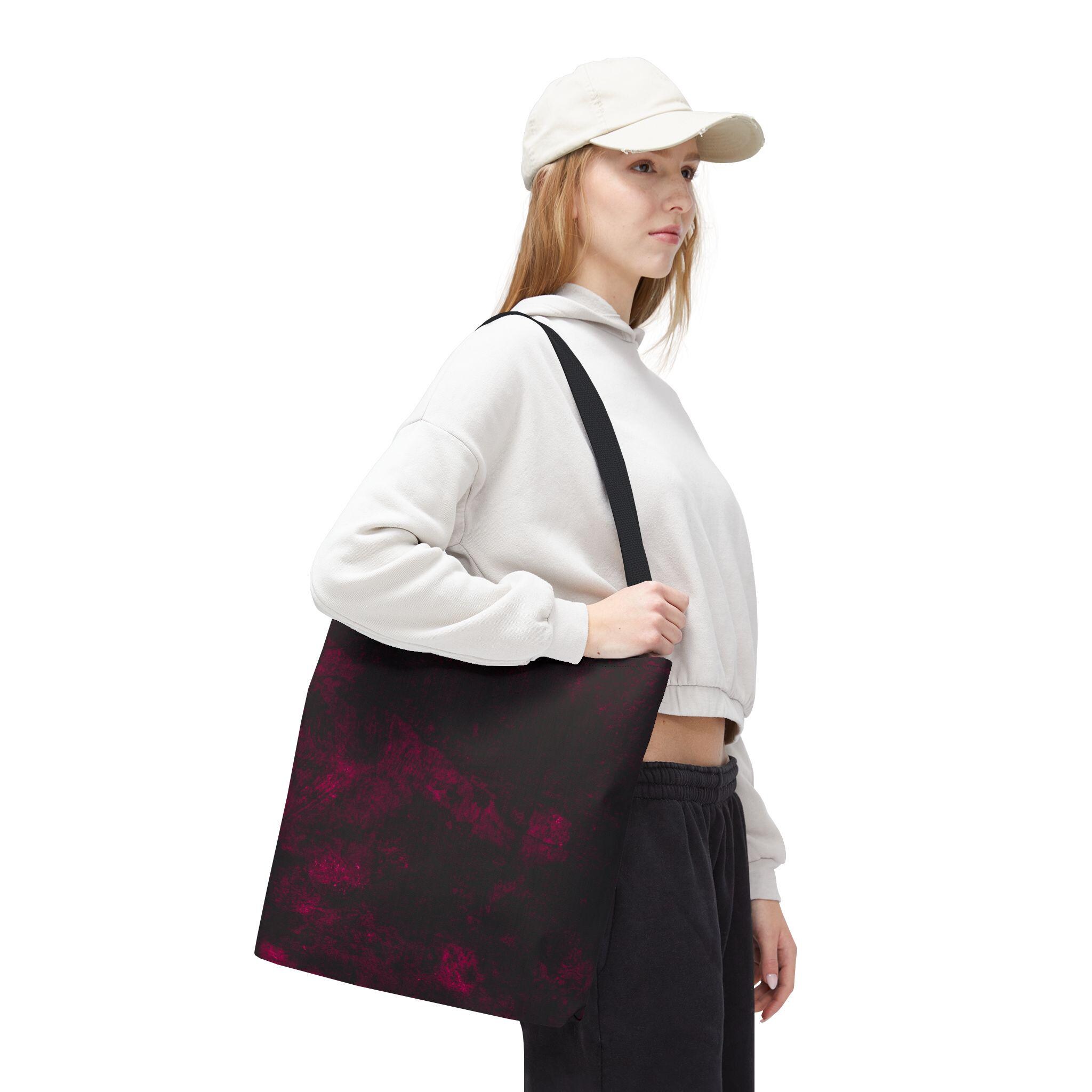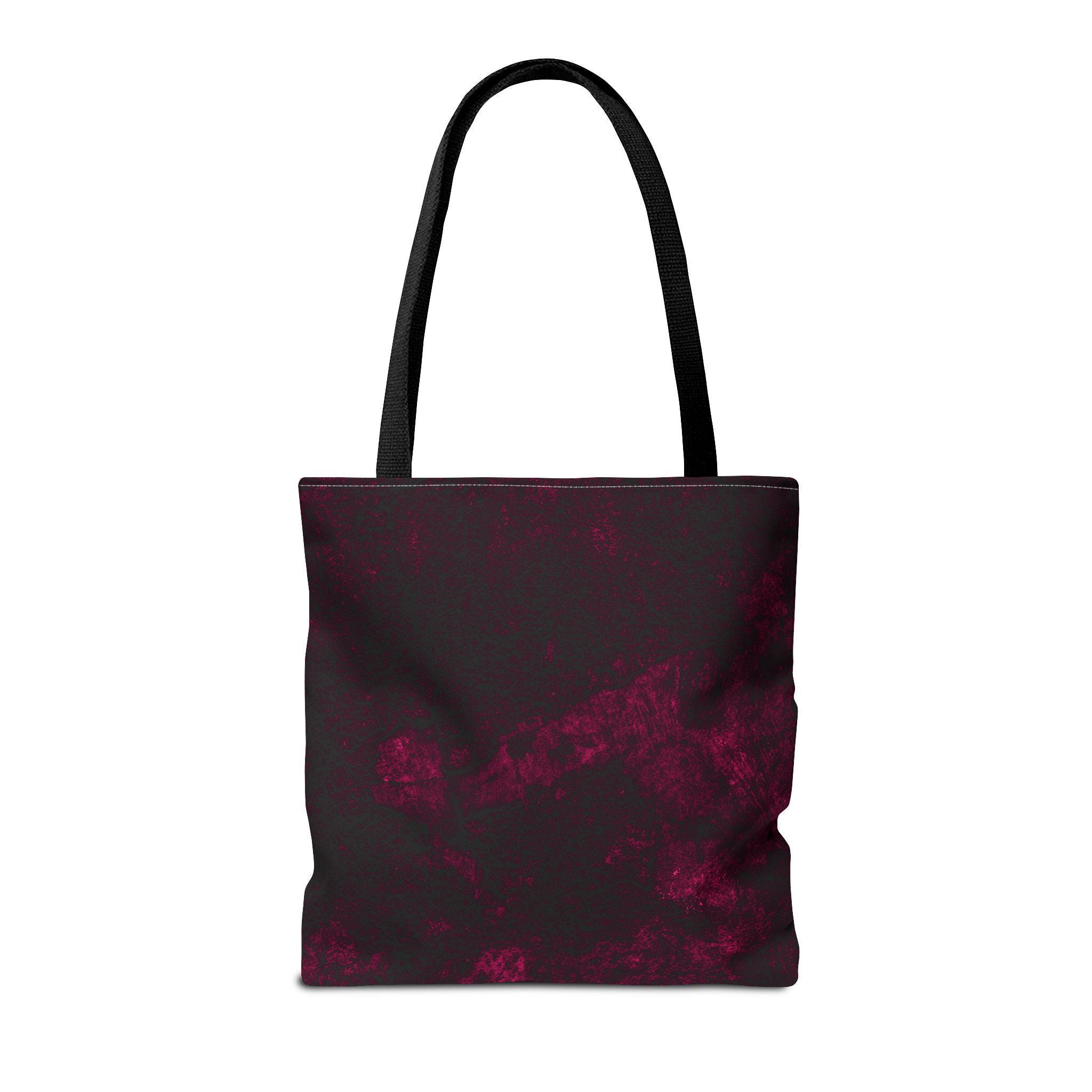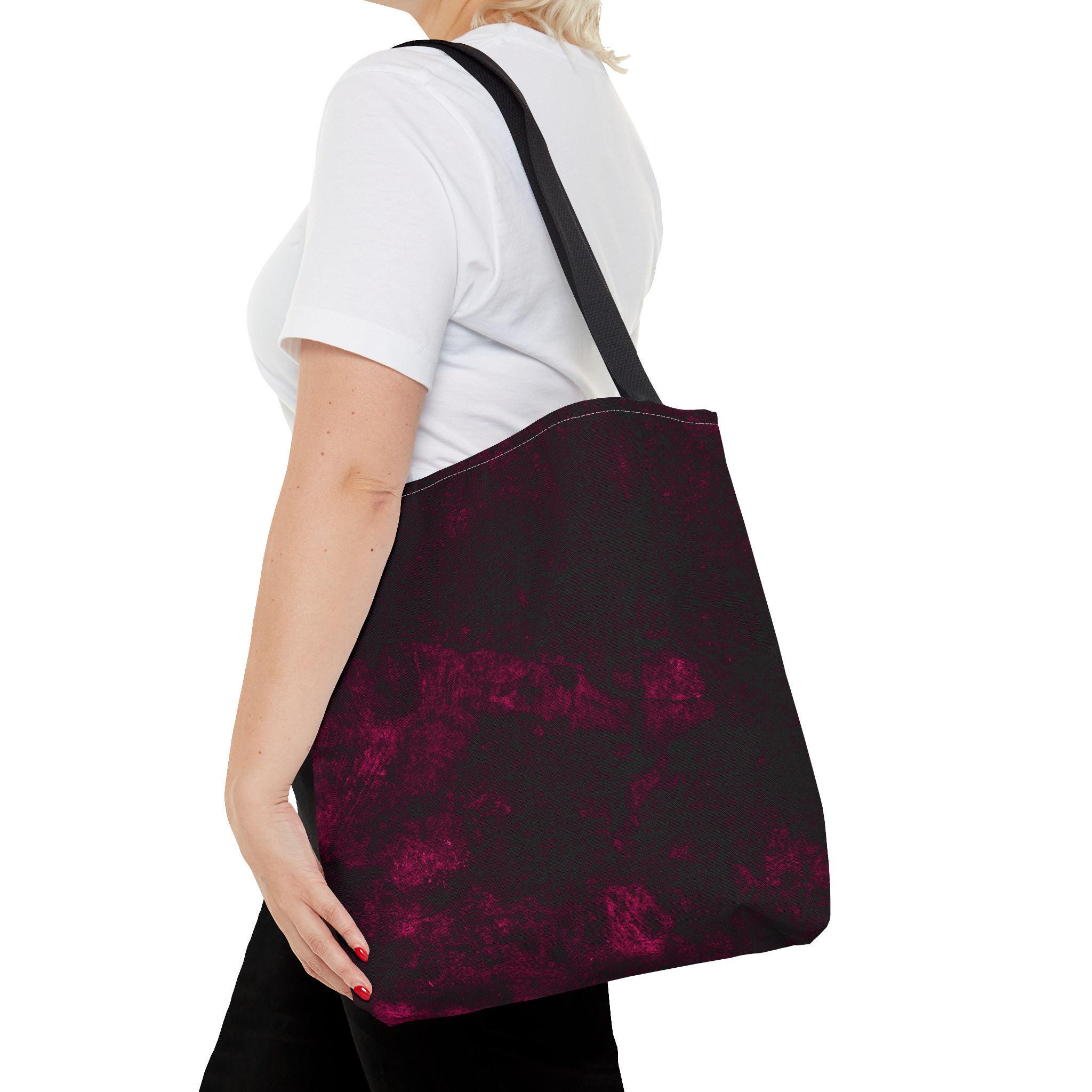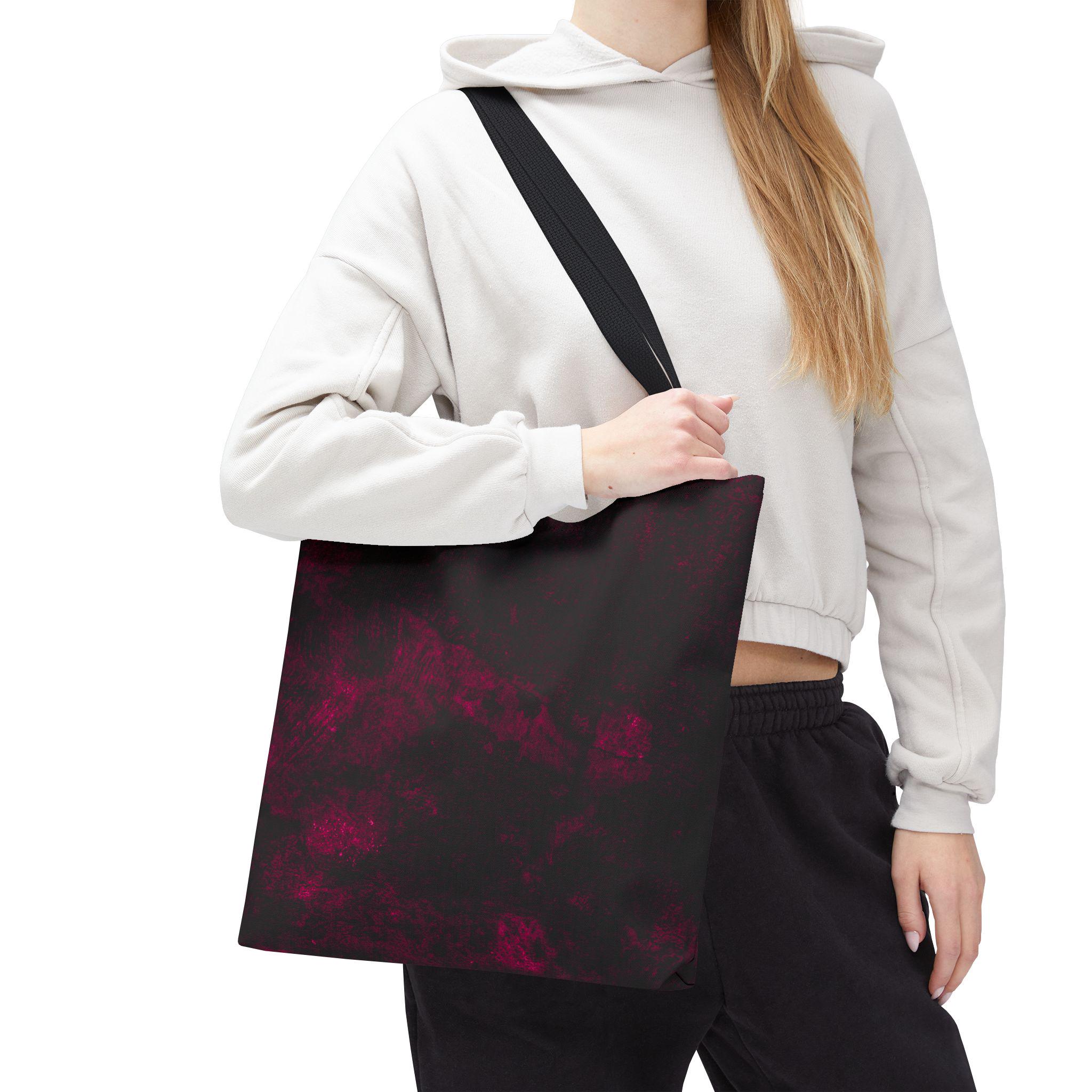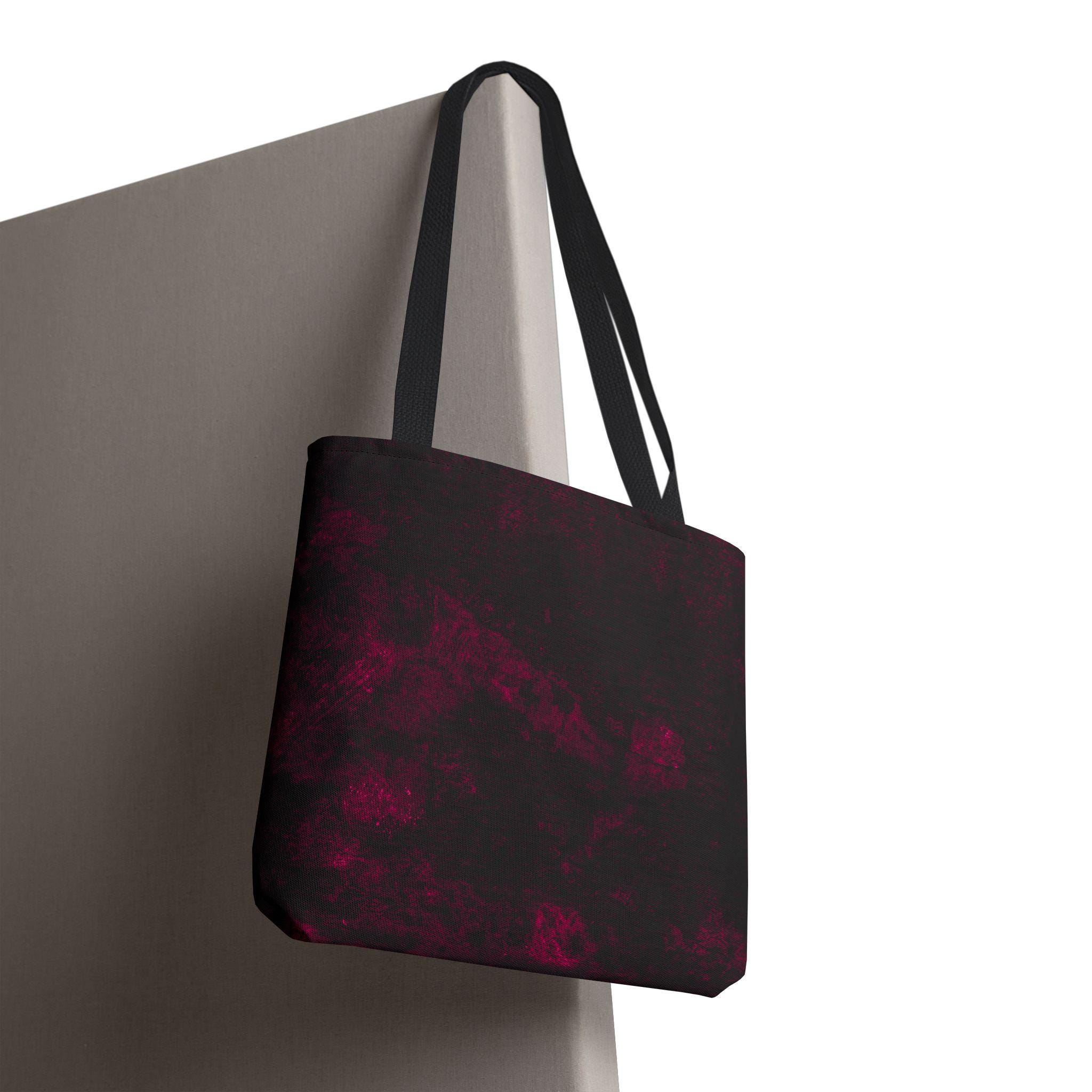 A deep, moody tote that feels like a private midnight sky folded into fabric. The dark base is laced with soft, smoky bursts of wine-red—subtle, expressive, and a little mysterious. Strong polyester construction and boxed corners give it structure; reinforced handles mean it moves with your day without fuss. Fits a sketchbook, a cardigan, a small market haul. It’s the bag that slips into your routine and adds a quiet, artful edge.