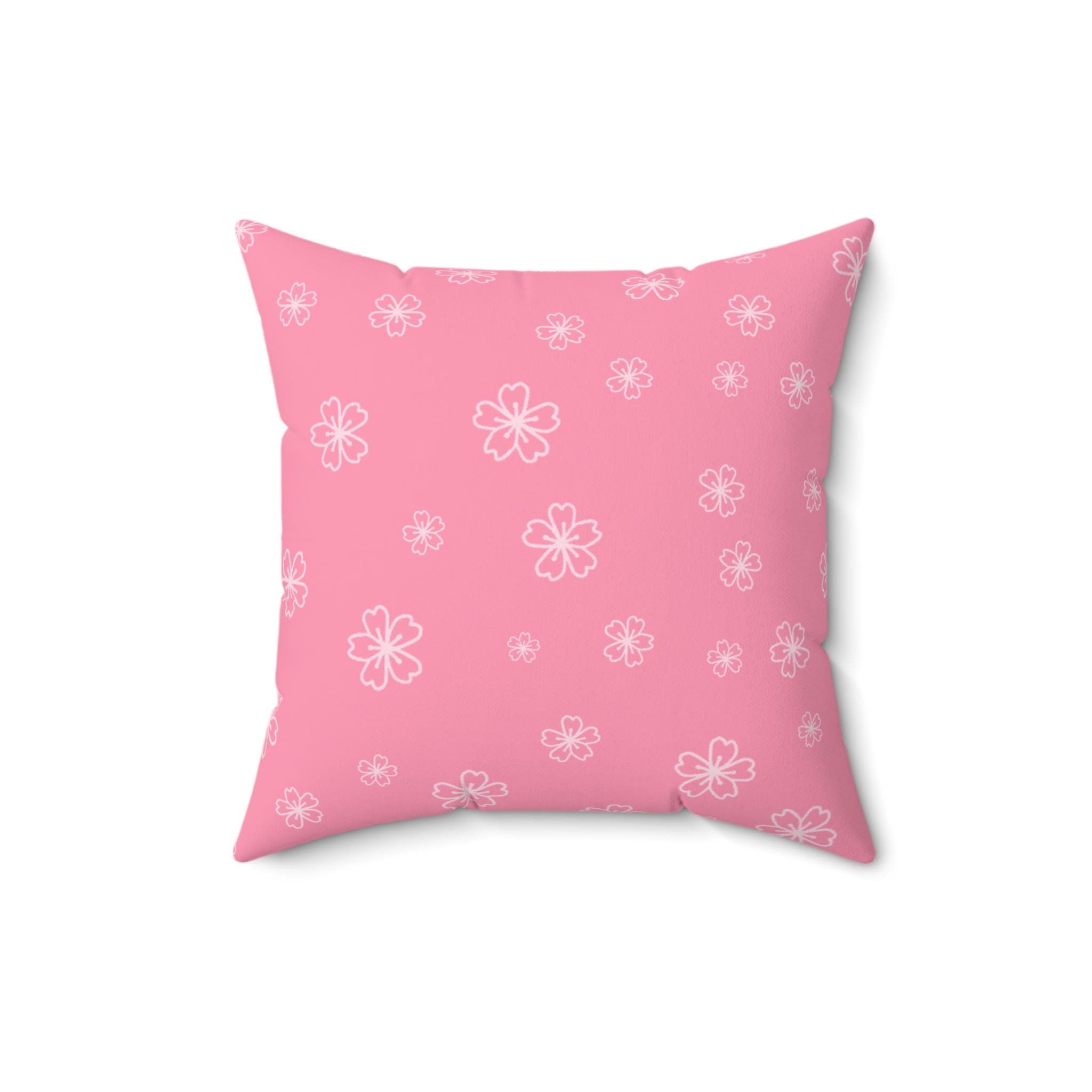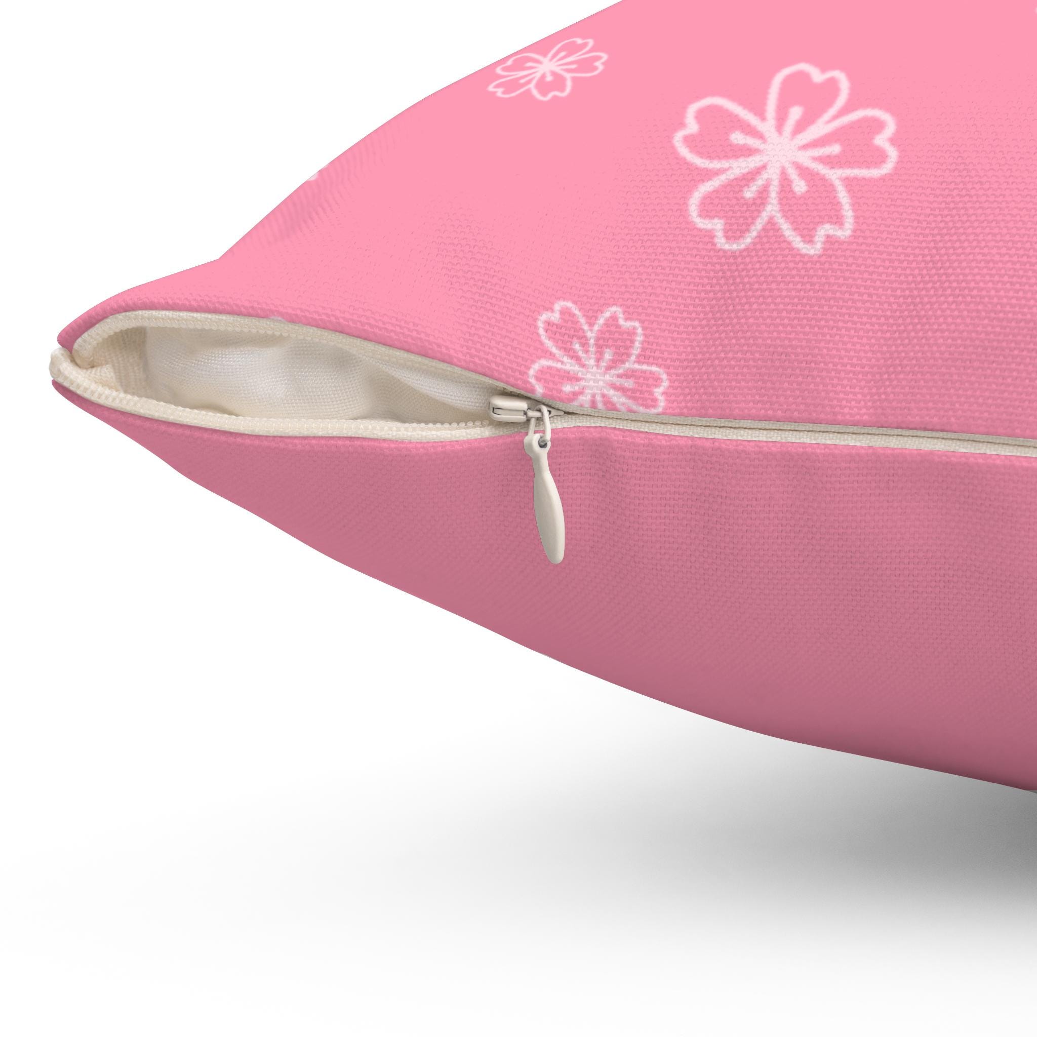 Soft, cheerful, and quietly nostalgic — this square pillow brings a gentle touch of spring to any room. The double-sided spun polyester cover showcases a hand-drawn white blossom pattern on a warm pink field, while the reverse is a solid coordinating pink for a clean, modern look. It arrives with a separately vacuum-packed recycled polyester insert that gives the cushion a plump, overfilled feel once assembled. Subtle details like the concealed beige zipper with metal head keep the silhouette tidy and let the floral surface remain the focus. Tuck it on a reading chair, layer it on a bed, or use it to brighten a cozy corner where slow mornings and soft light linger.