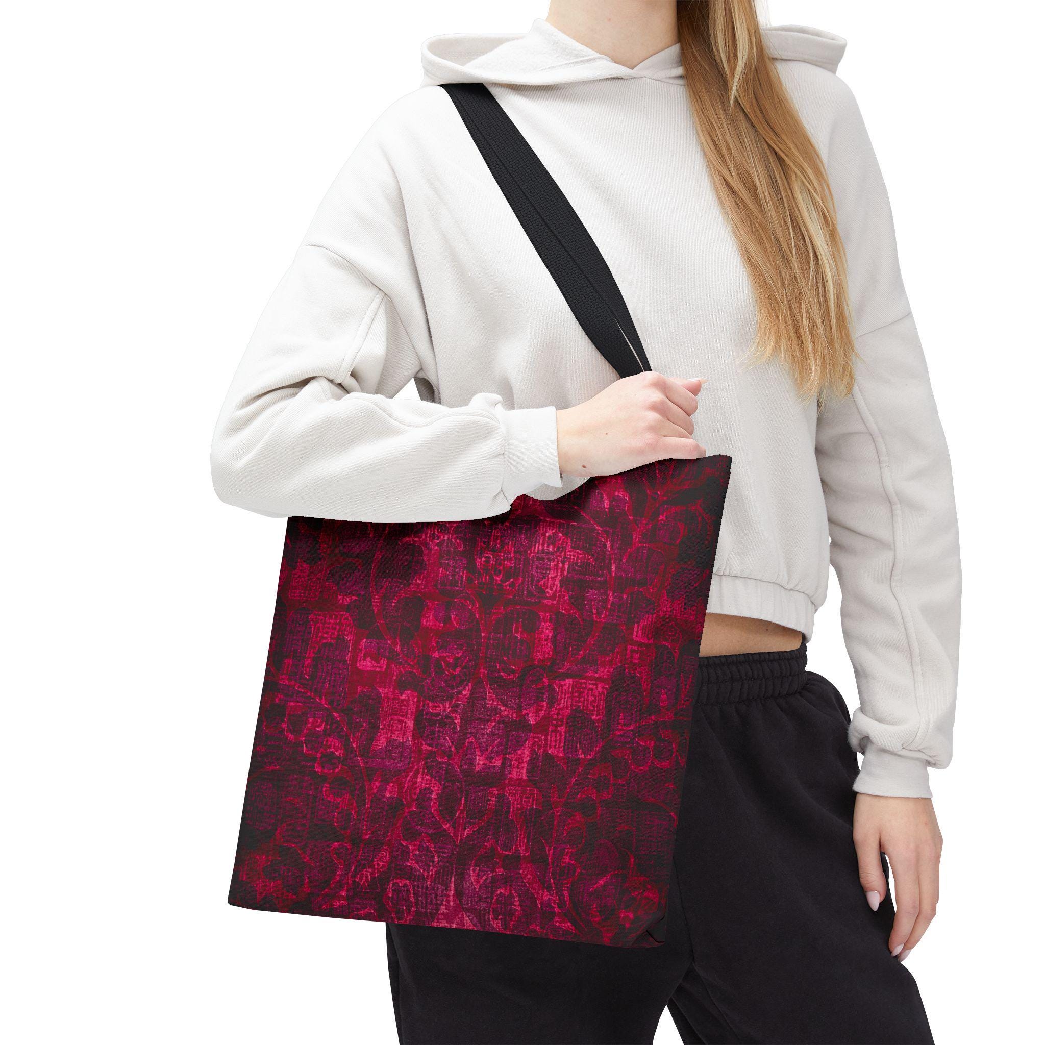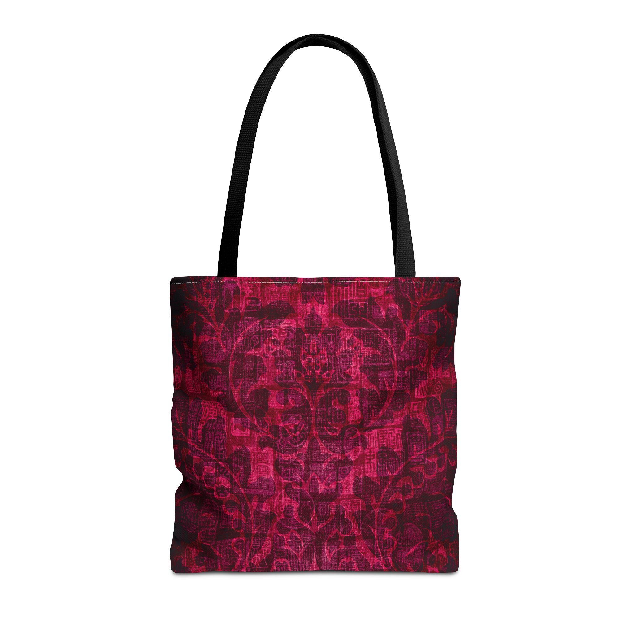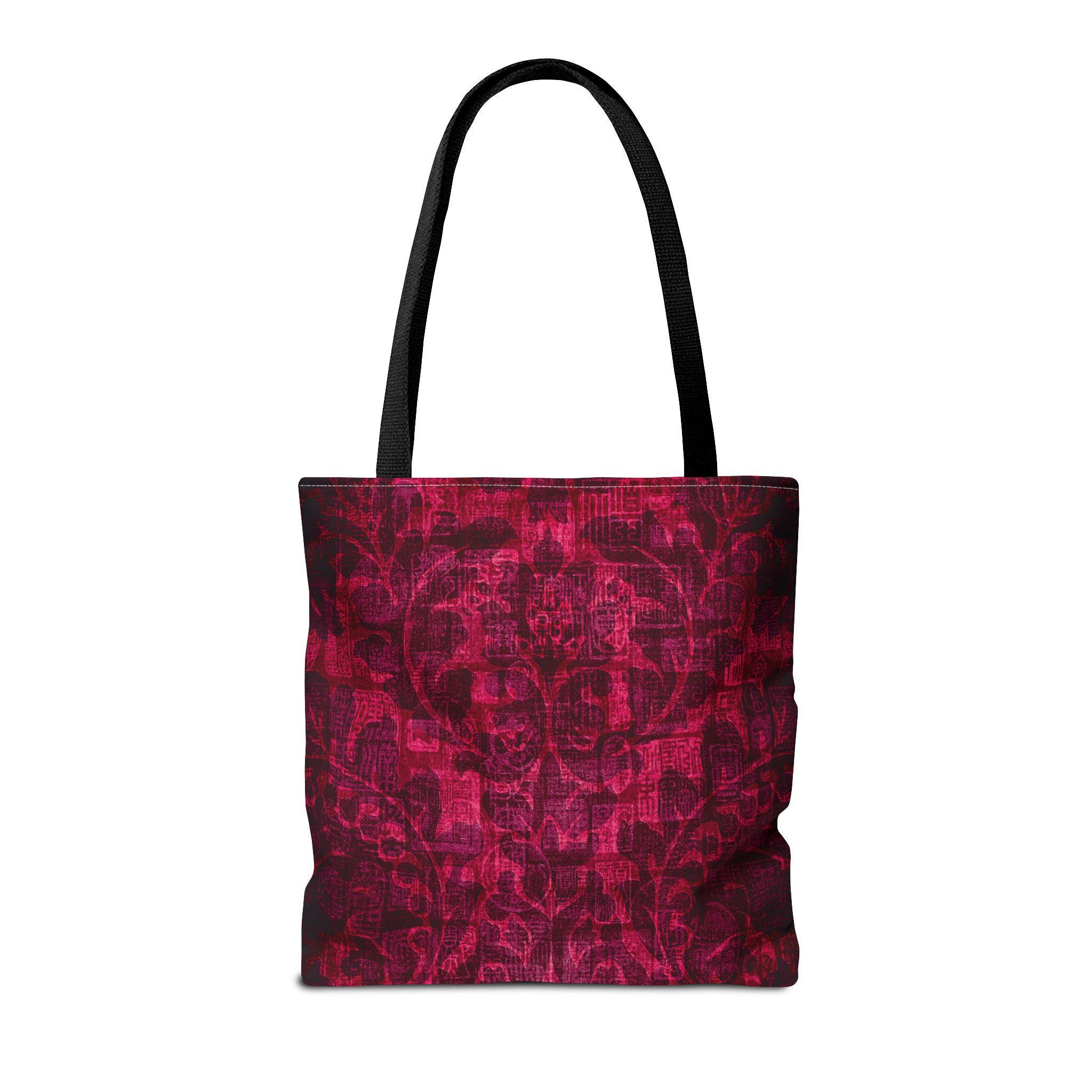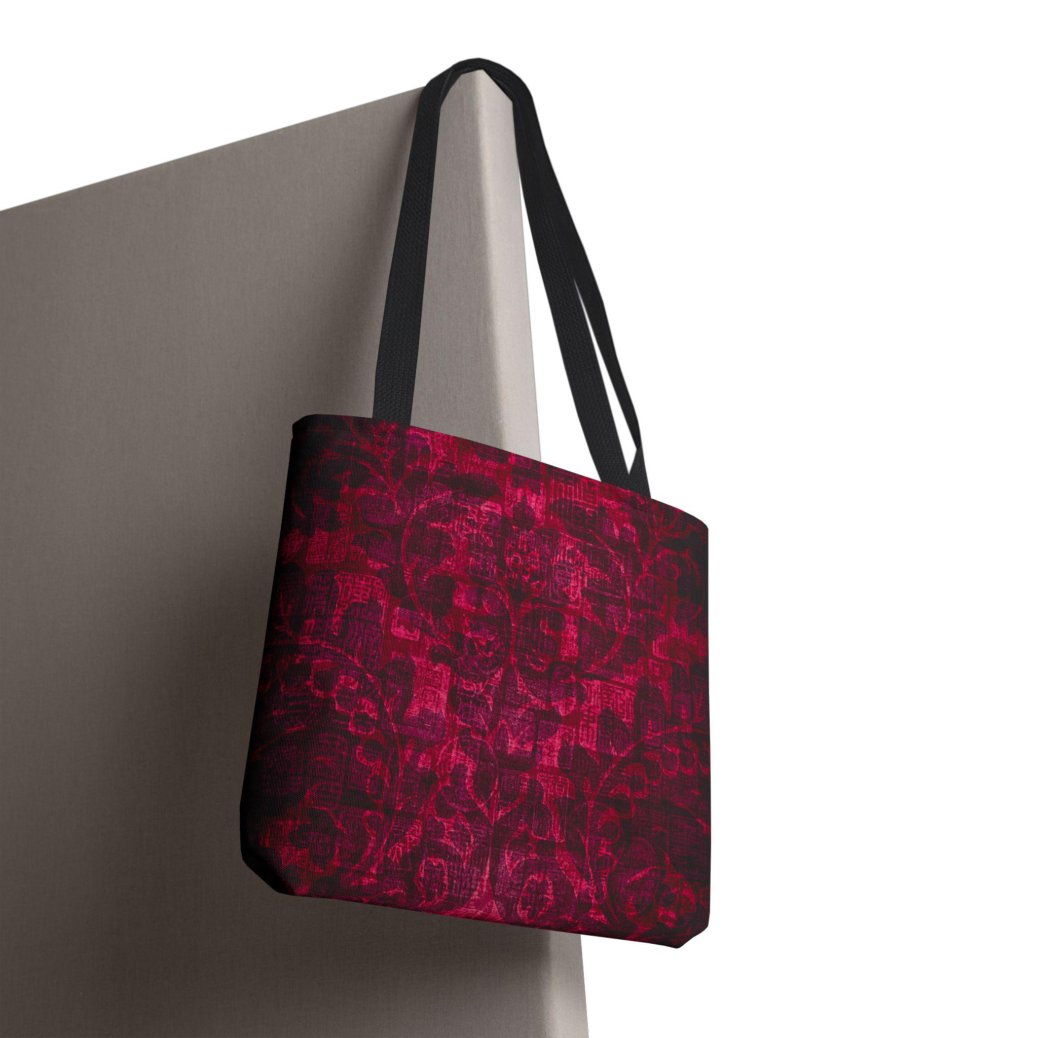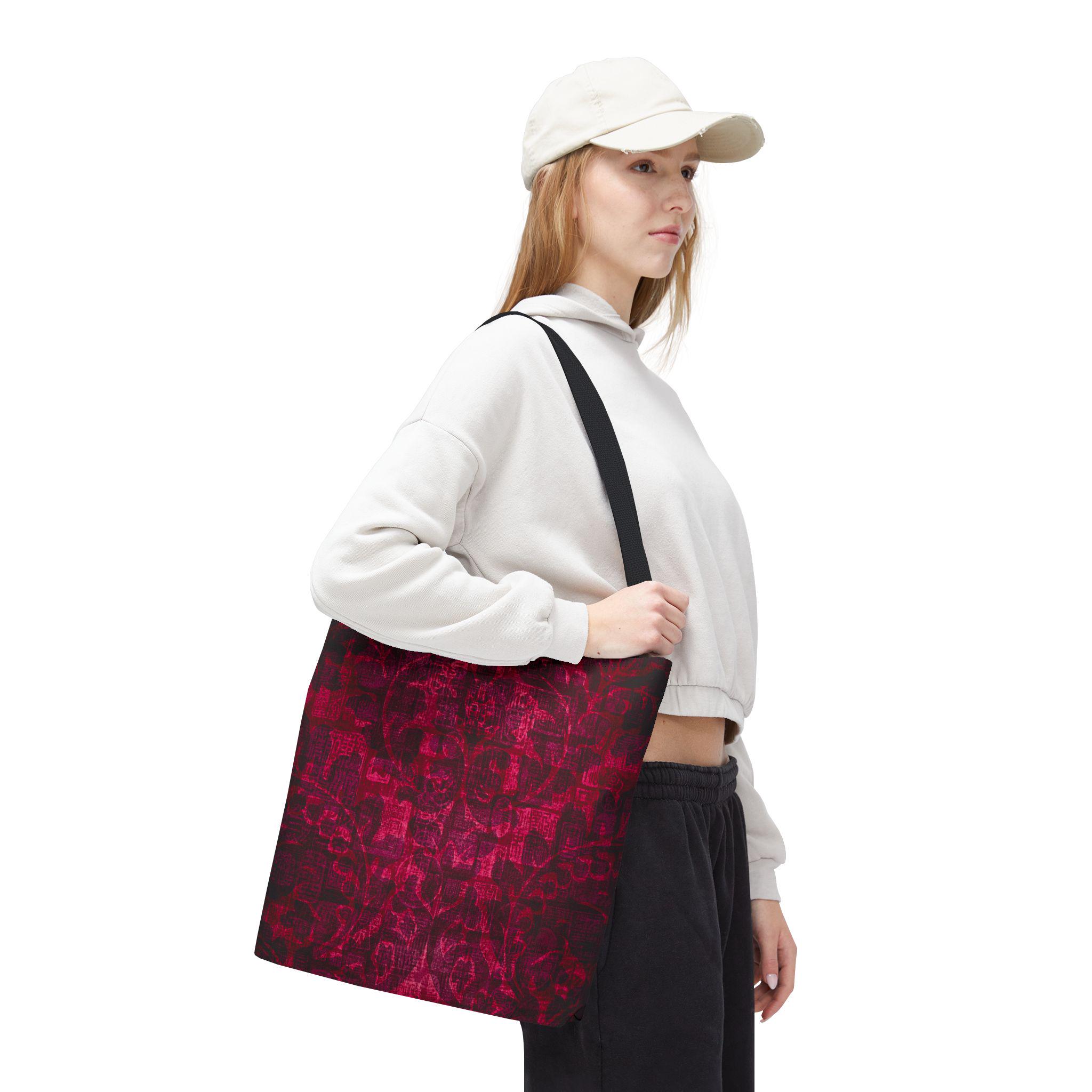 Carry a little mystery with you. This sturdy polyester tote features a deep, textured garnet print that feels both vintage and modern — like a worn velvet tapestry reimagined for everyday use. The roomy boxed corners give extra carry space without adding bulk, and reinforced handle stitching keeps the bag steady when you stash books, market finds, or a laptop. Inside, a non-woven laminate offers light structure and quick-dry durability, while black seamless stitching and black handles. It’s the kind of bag that settles into your routine: standing up to daily wear while quietly elevating outfits with rich, moody color and tactile patterning.