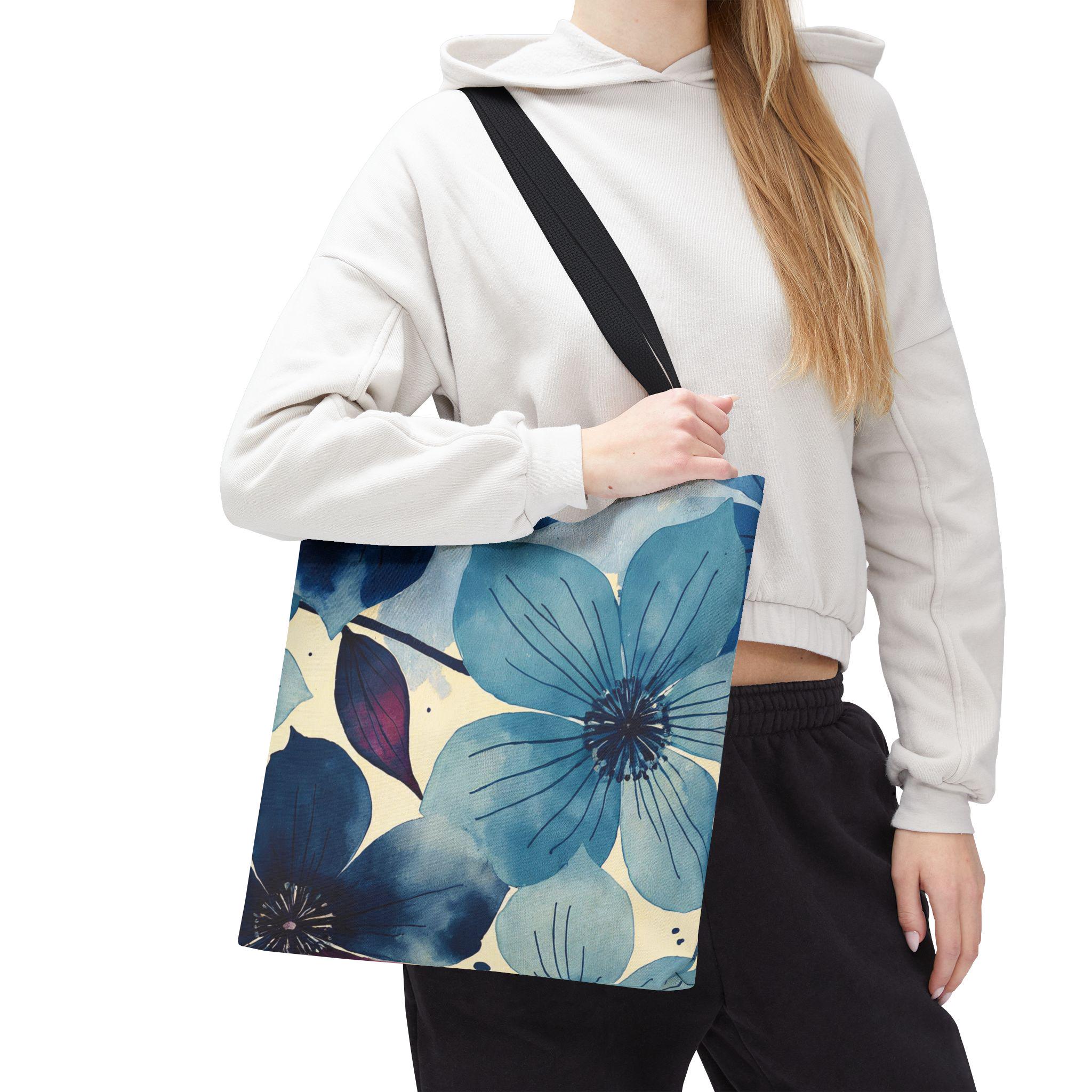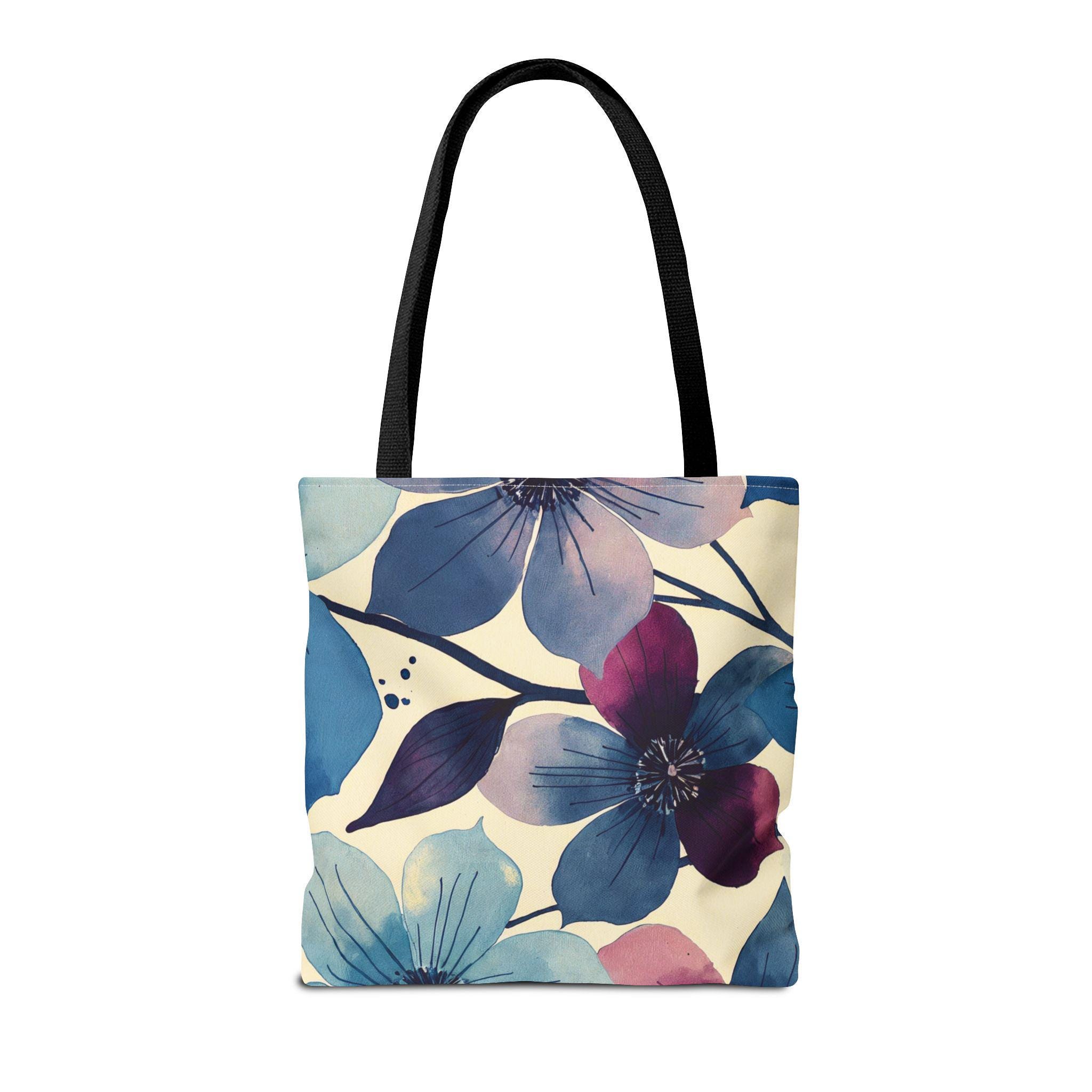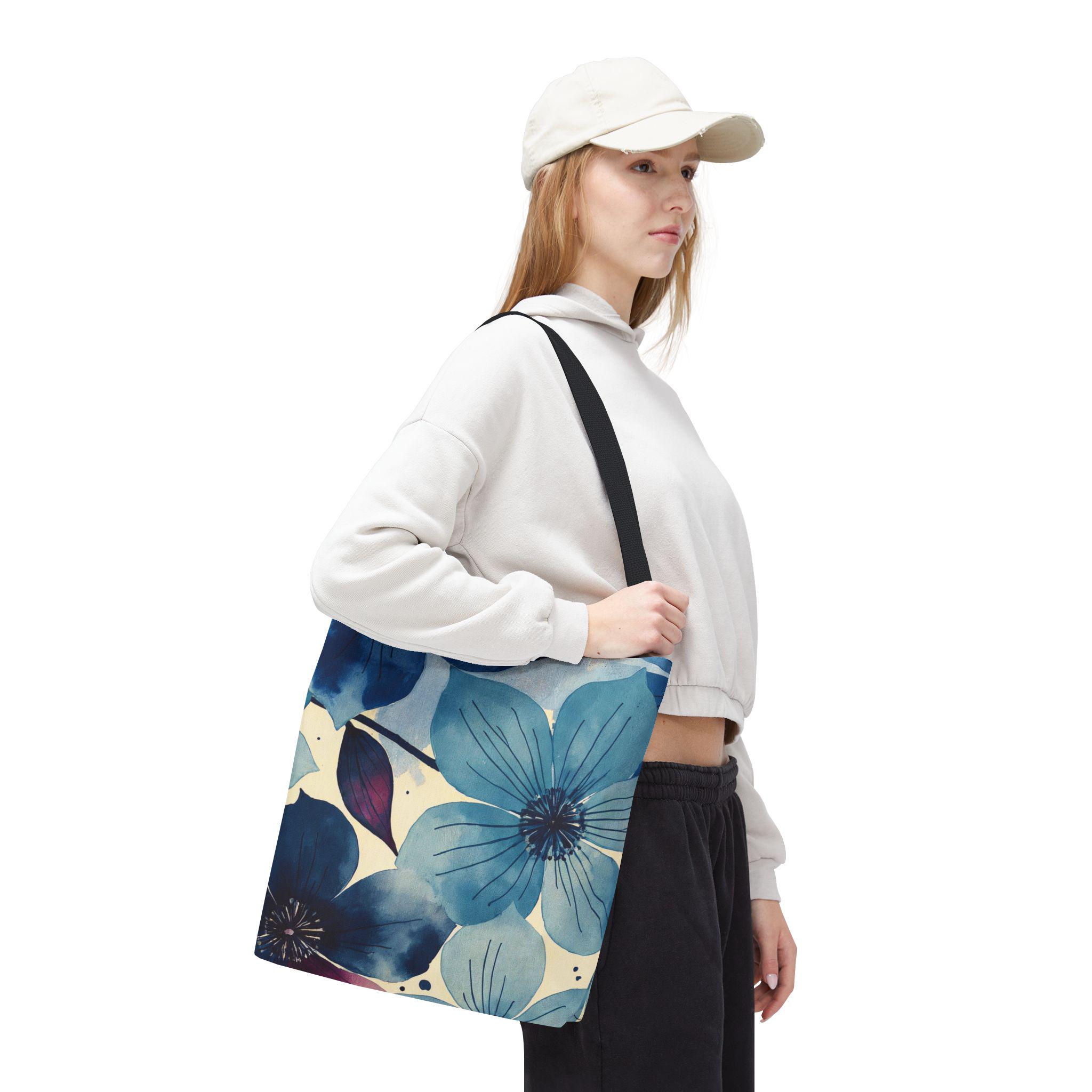 A soft, painterly floral tote that carries the calm of a coastal afternoon. Handheld or slung over your shoulder, the bag’s cool blue blooms and hints of warm magenta bring a quietly artistic touch to errands, markets, and slow weekend strolls. The roomy boxed corners and medium-weight polyester keep shape whether holding a sketchbook, small grocery run, or a stack of library finds. Reinforced handles and neat black inner stitching mean it travels with you without fuss. It feels like bringing a small bouquet of watercolor flowers along for the day — subtle, fresh, and thoughtfully made.