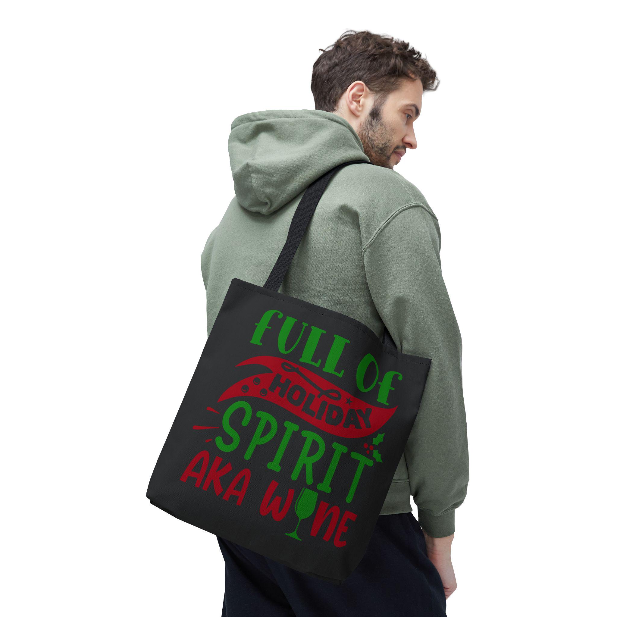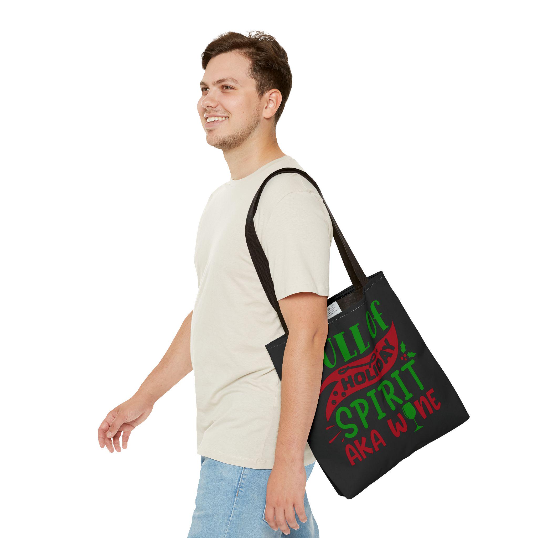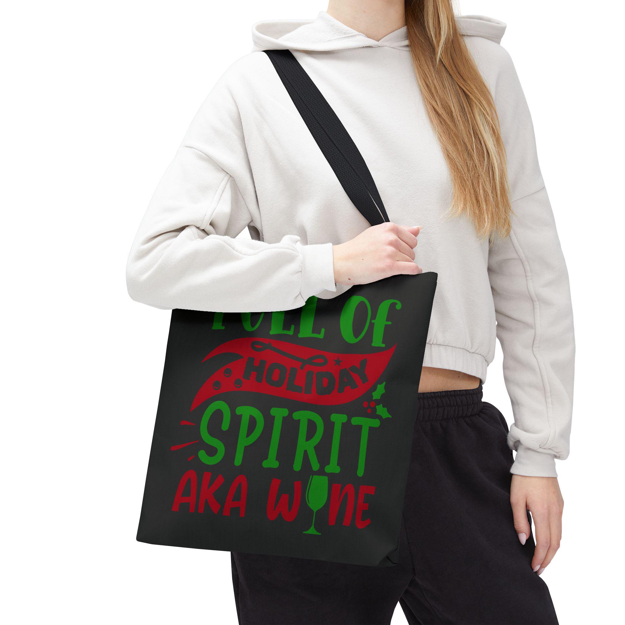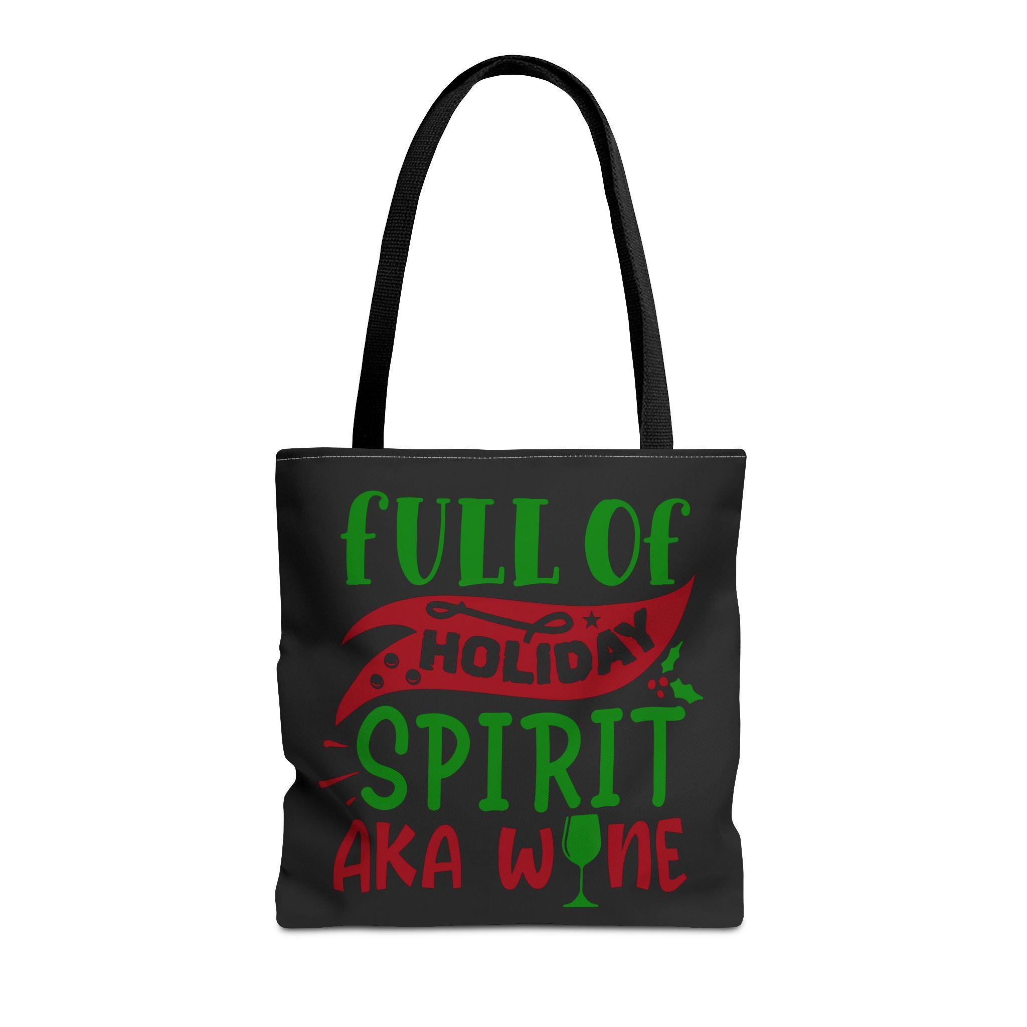 Carry a little holiday mischief with you. This roomy polyester tote wears a cheeky, festive slogan in bold red and green — “Full of Holiday Spirit aka Wine” — that reads like a wink to friends and family. The matte-black background makes the colors pop, while the boxed corners and reinforced handle stitching give the bag structure for groceries, party supplies, or a bottle (or two). It’s the kind of everyday accessory that brings a laugh at the farmer’s market, swaps, or casual holiday gatherings and becomes part of the seasonal rituals in your closet.