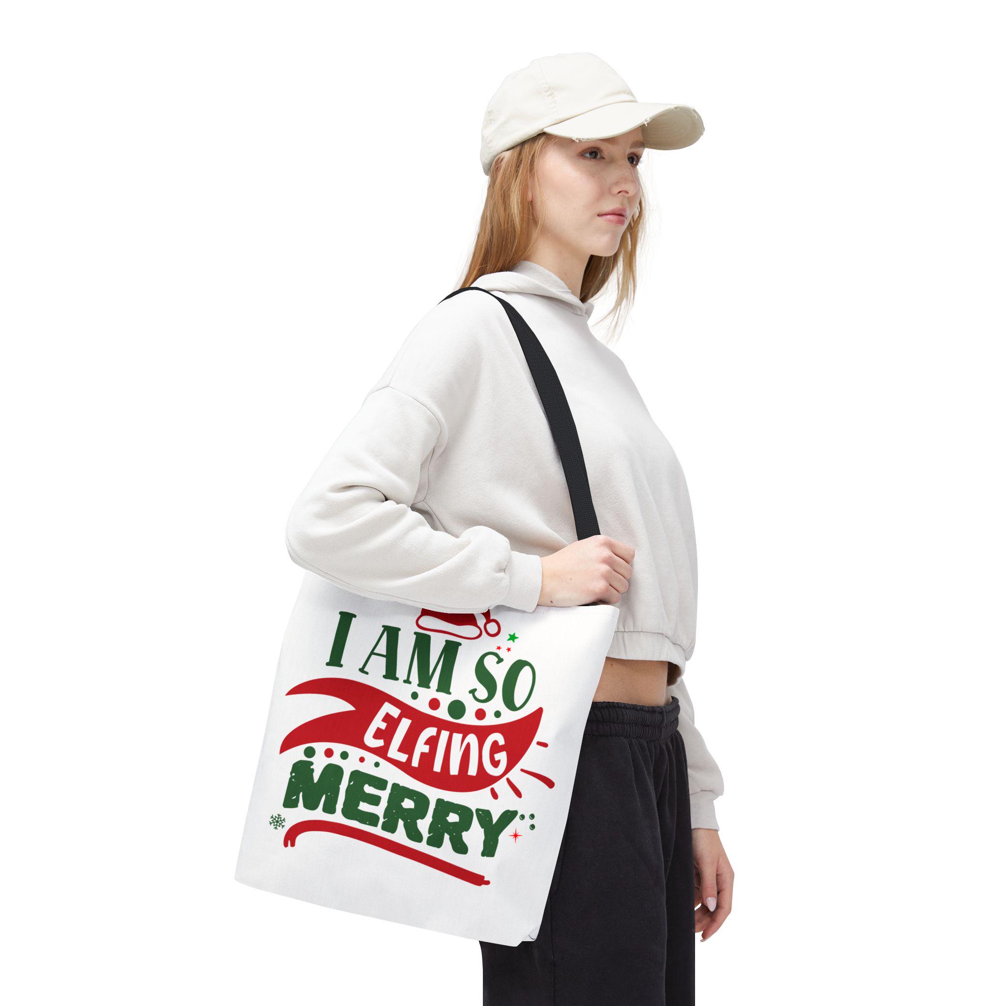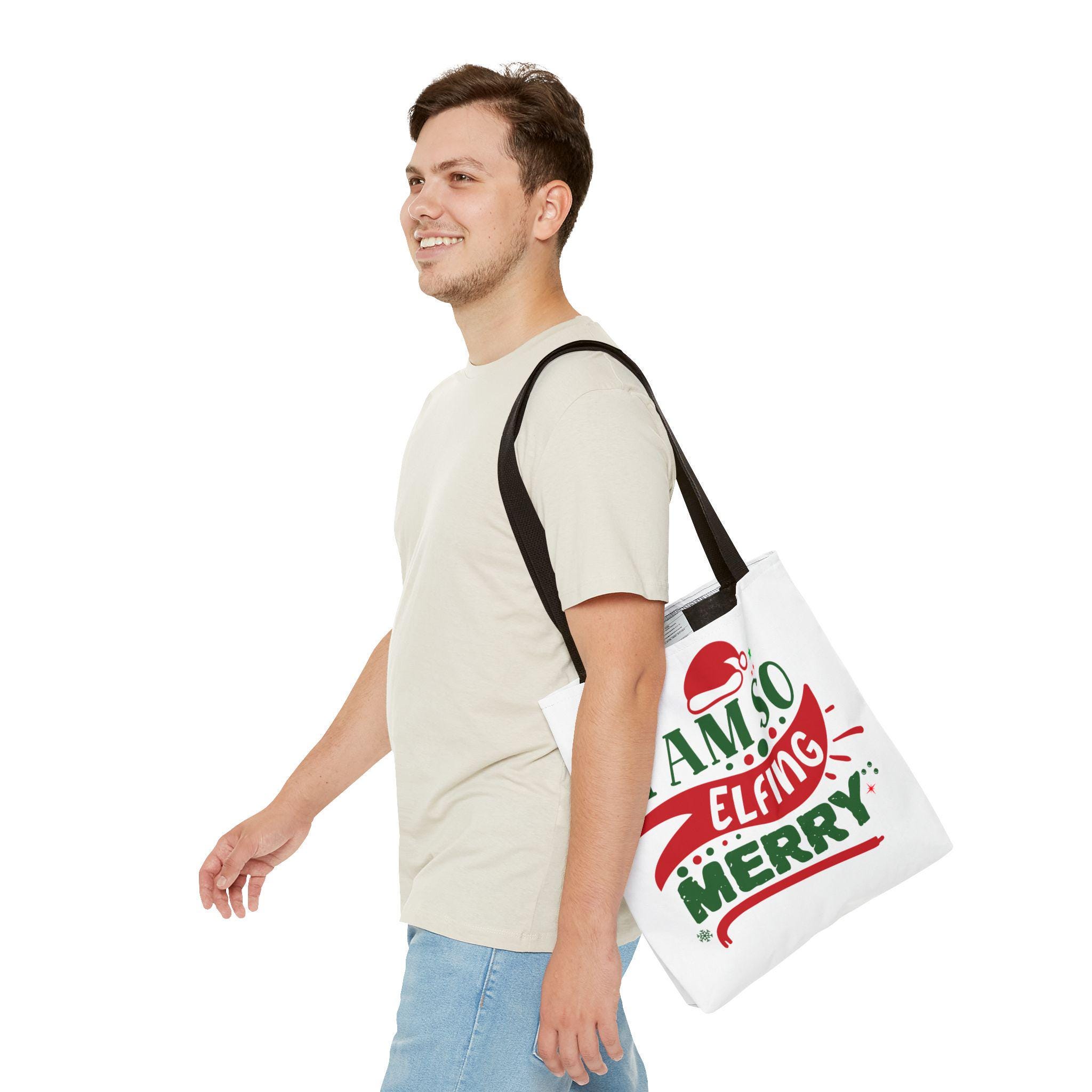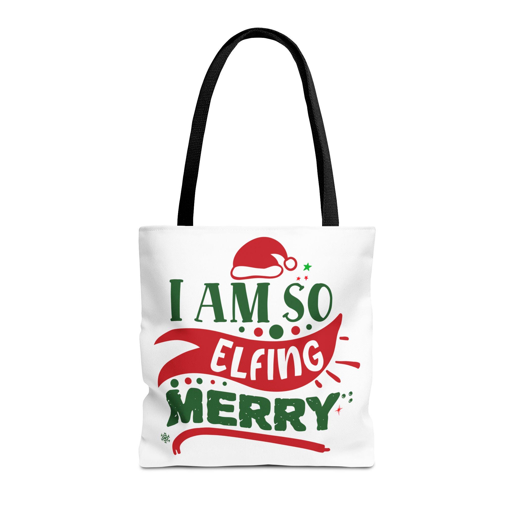 Bright, cheeky, and built for holiday mischief — this roomy tote carries your cookies, cards, and festive plans with a wink. The front print reads “I AM SO ELFING MERRY” in playful red and green lettering, topped with a Santa cap and sprinkled with confetti stars. Lightweight yet sturdy polyester holds its shape and resists spills, while boxed corners add extra carrying space for groceries, party favors, or wrapping supplies. This tote lands easily into season-long traditions: market runs, cookie exchanges, tree-trimming nights, and neighborhood caroling—bringing a bit of humor and bright color wherever you go.