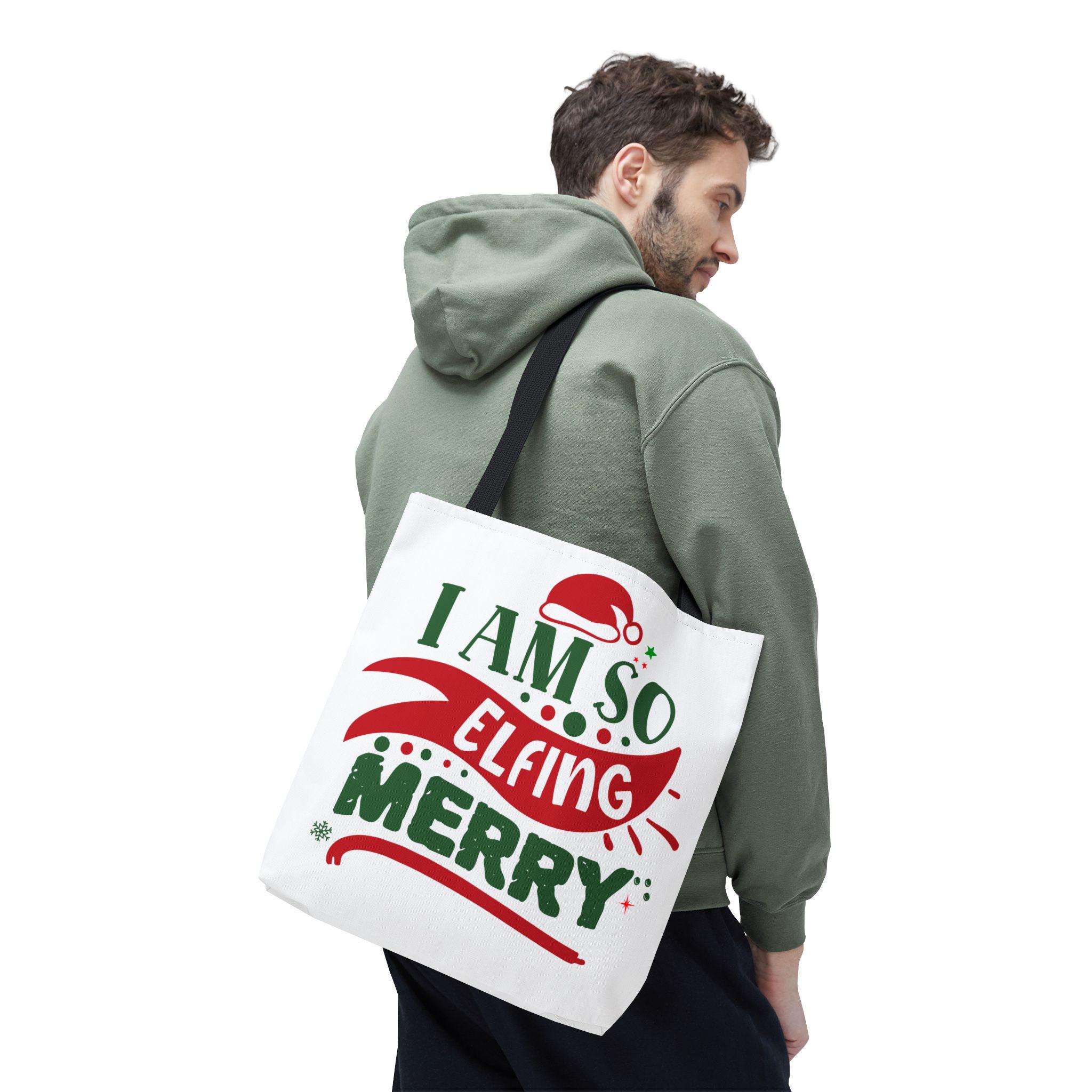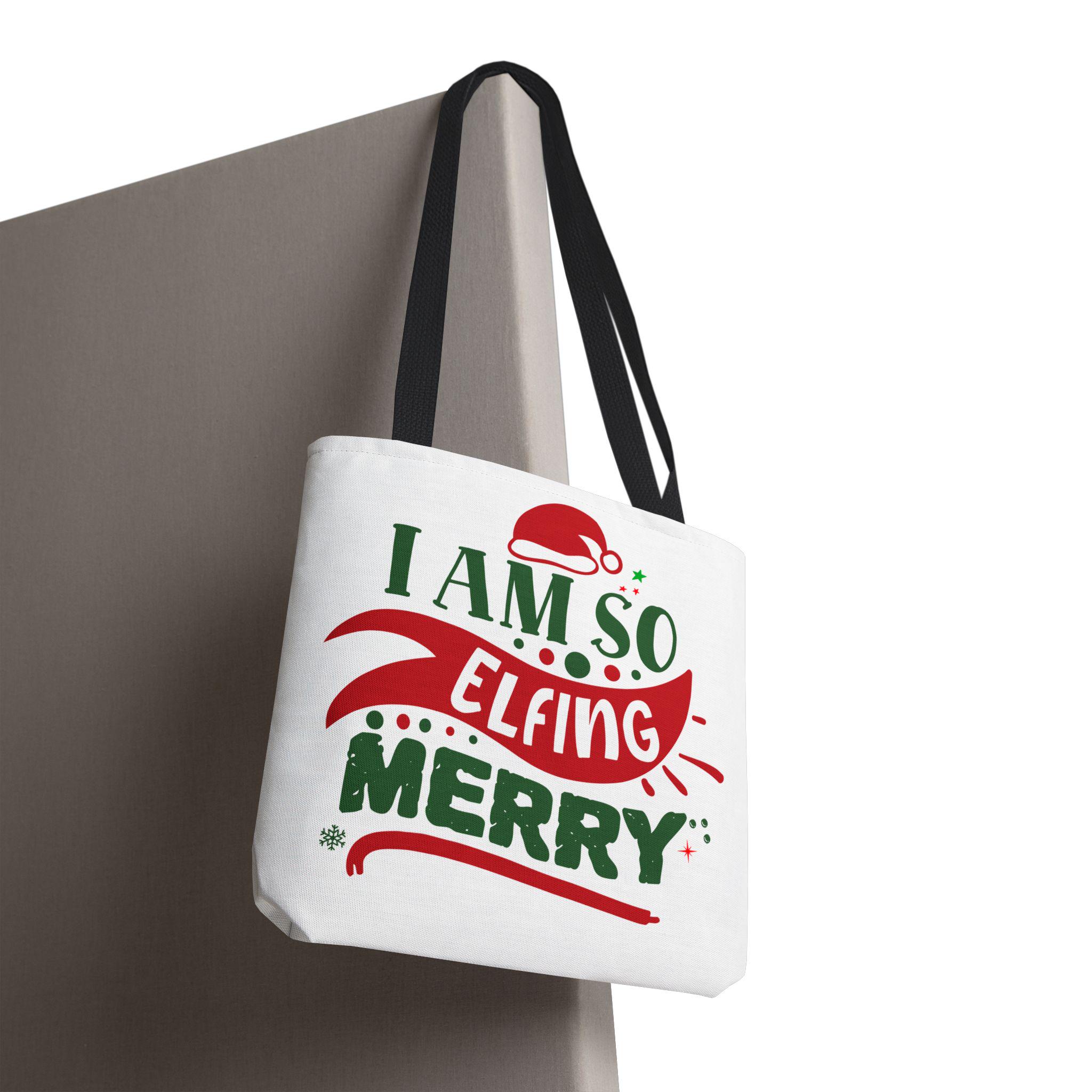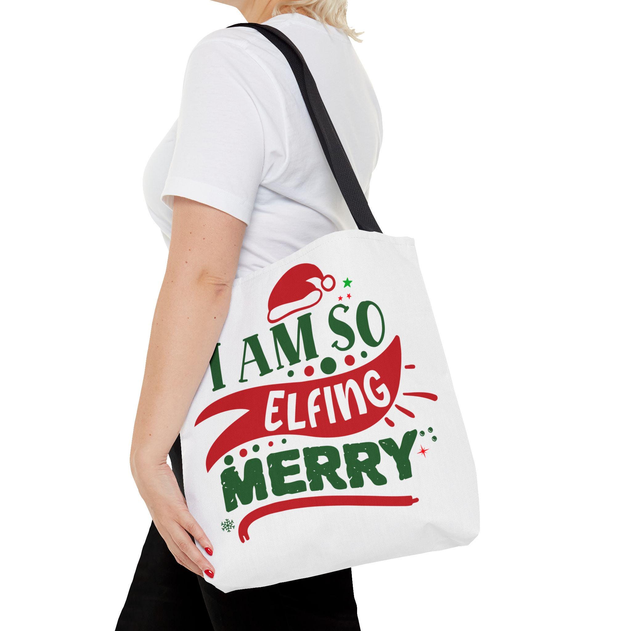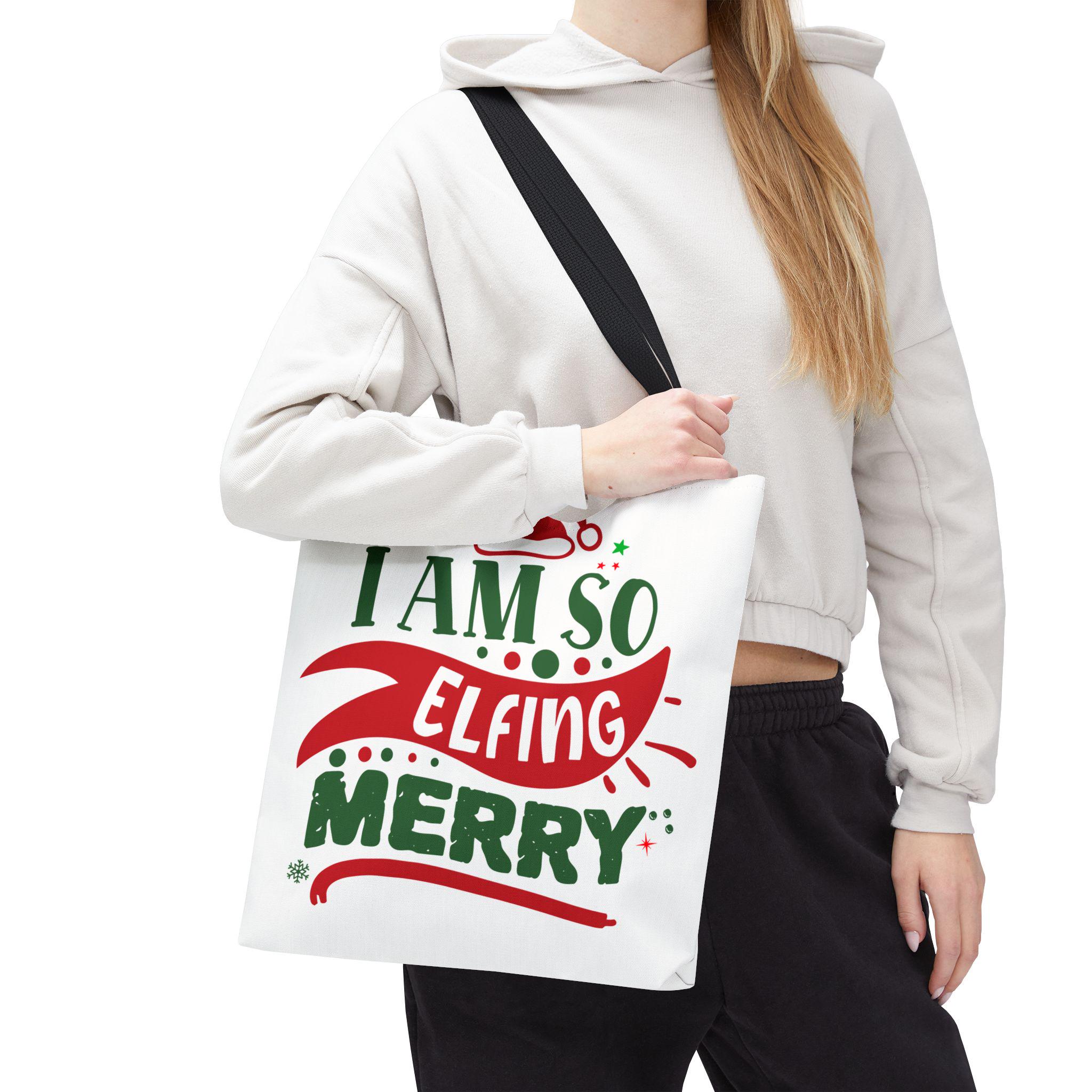 Bright, cheeky, and built for holiday mischief — this roomy tote carries your cookies, cards, and festive plans with a wink. The front print reads “I AM SO ELFING MERRY” in playful red and green lettering, topped with a Santa cap and sprinkled with confetti stars. Lightweight yet sturdy polyester holds its shape and resists spills, while boxed corners add extra carrying space for groceries, party favors, or wrapping supplies. This tote lands easily into season-long traditions: market runs, cookie exchanges, tree-trimming nights, and neighborhood caroling—bringing a bit of humor and bright color wherever you go.