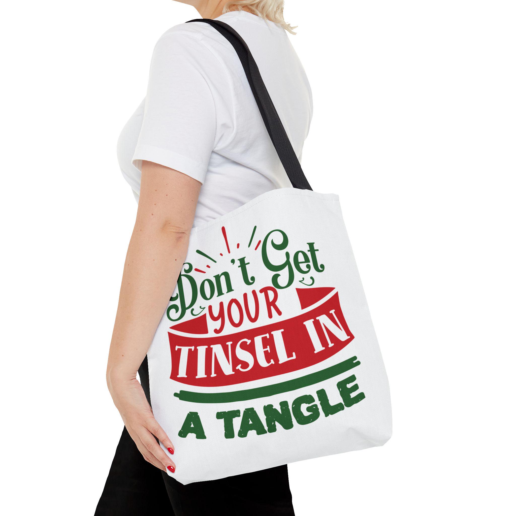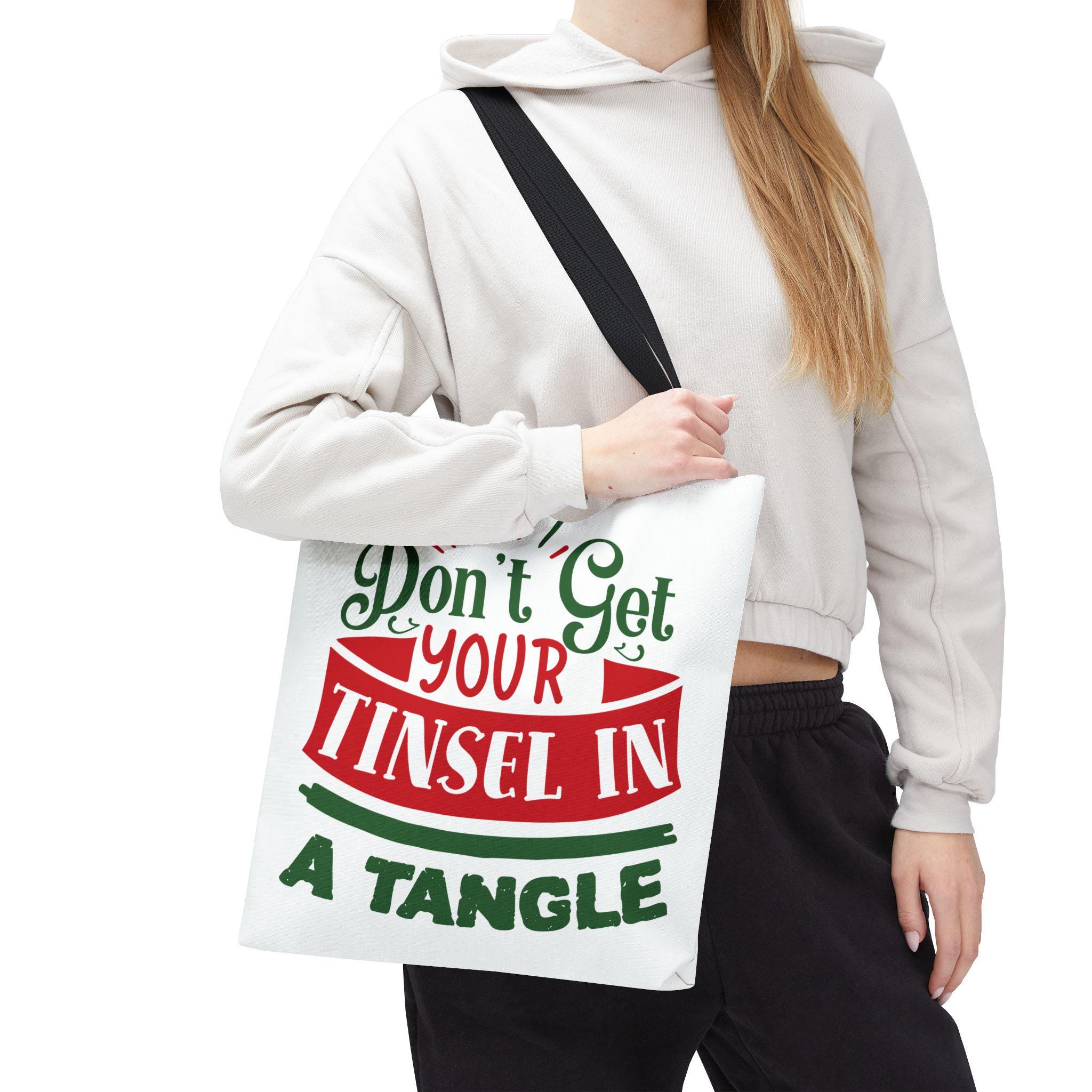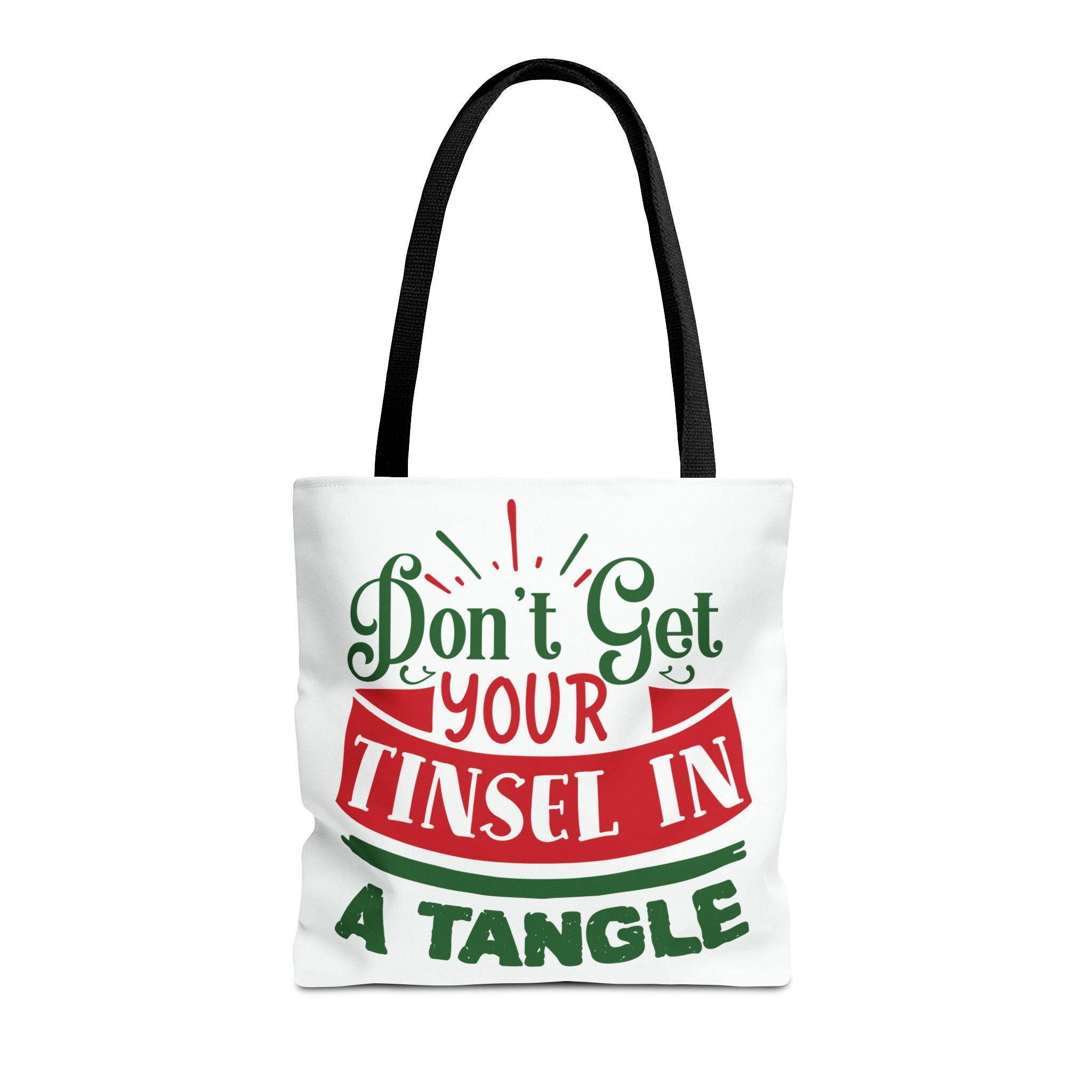 A cheerful, sturdy tote that carries holiday cheer without the stress. The playful red-and-green typography — “Don’t Get Your Tinsel in a Tangle” — turns everyday errands into a lighthearted moment. The roomy boxed corners and medium-weight polyester give this tote reliable structure for groceries, gift runs, or decorations, while reinforced handle stitching and a non-woven laminate lining keep it ready for repeated seasonal use. It’s the kind of bag you reach for when you want to bring a little humor and holiday spirit to wrapping parties, tree-trimming nights, and last-minute shopping trips.