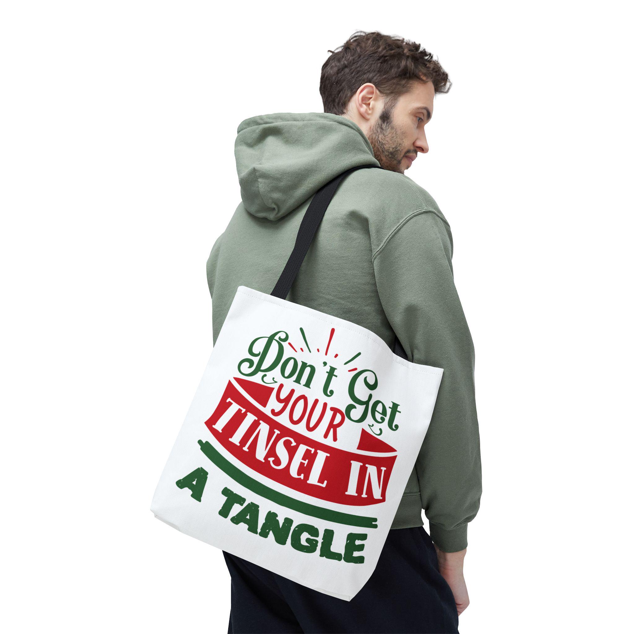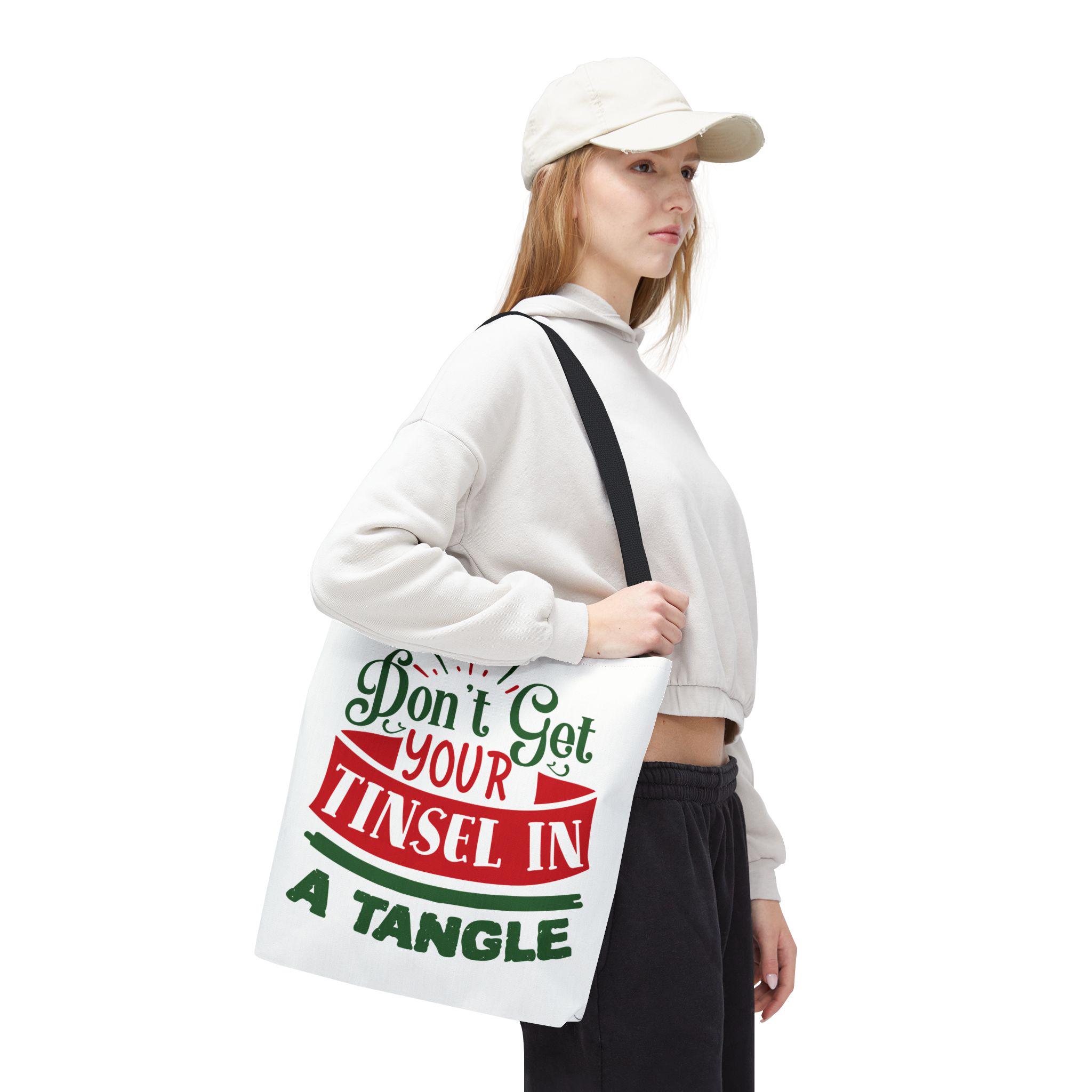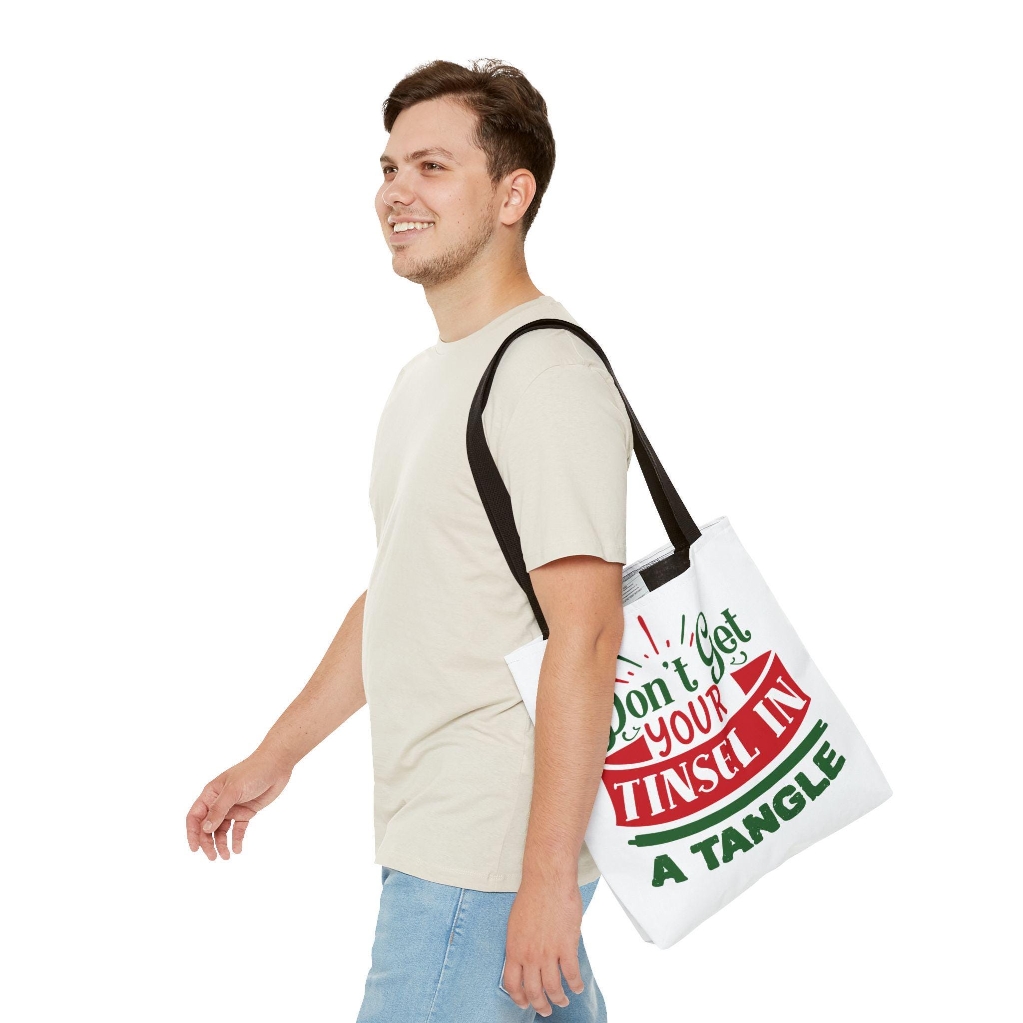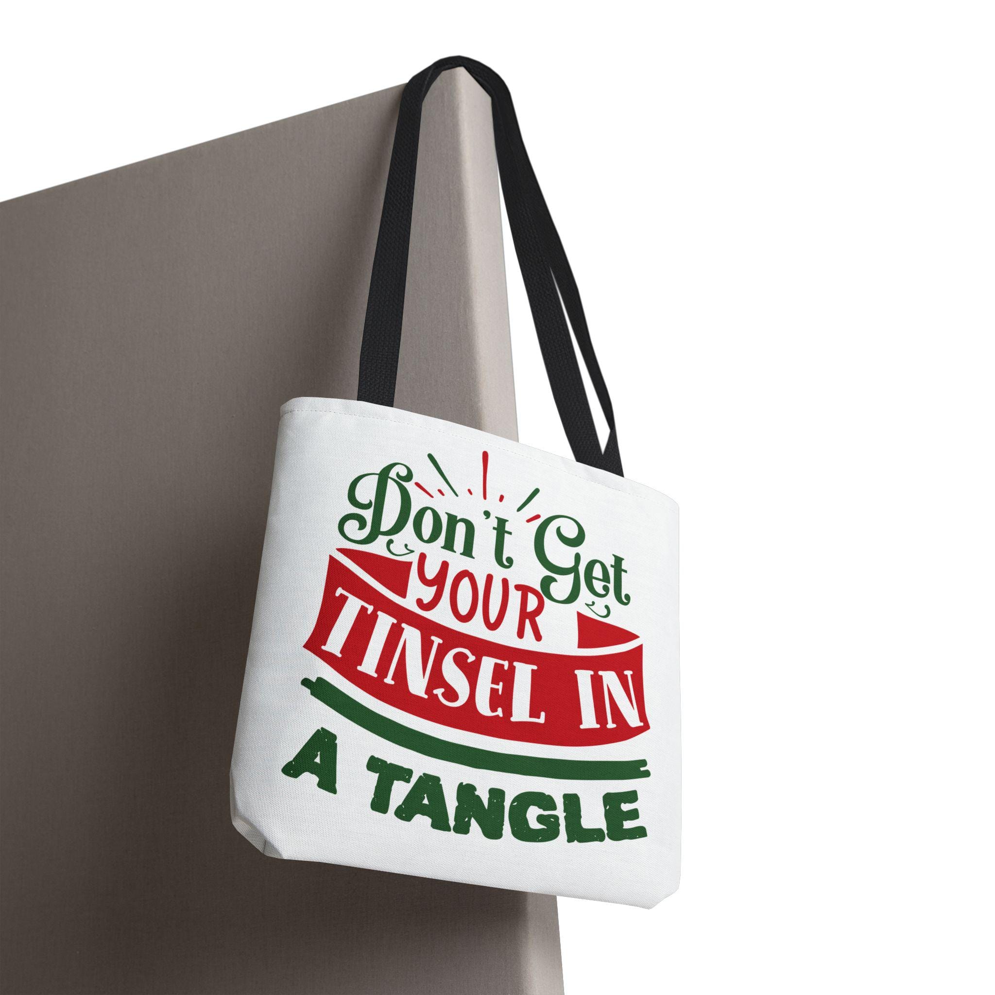 A cheerful, sturdy tote that carries holiday cheer without the stress. The playful red-and-green typography — “Don’t Get Your Tinsel in a Tangle” — turns everyday errands into a lighthearted moment. The roomy boxed corners and medium-weight polyester give this tote reliable structure for groceries, gift runs, or decorations, while reinforced handle stitching and a non-woven laminate lining keep it ready for repeated seasonal use. It’s the kind of bag you reach for when you want to bring a little humor and holiday spirit to wrapping parties, tree-trimming nights, and last-minute shopping trips.