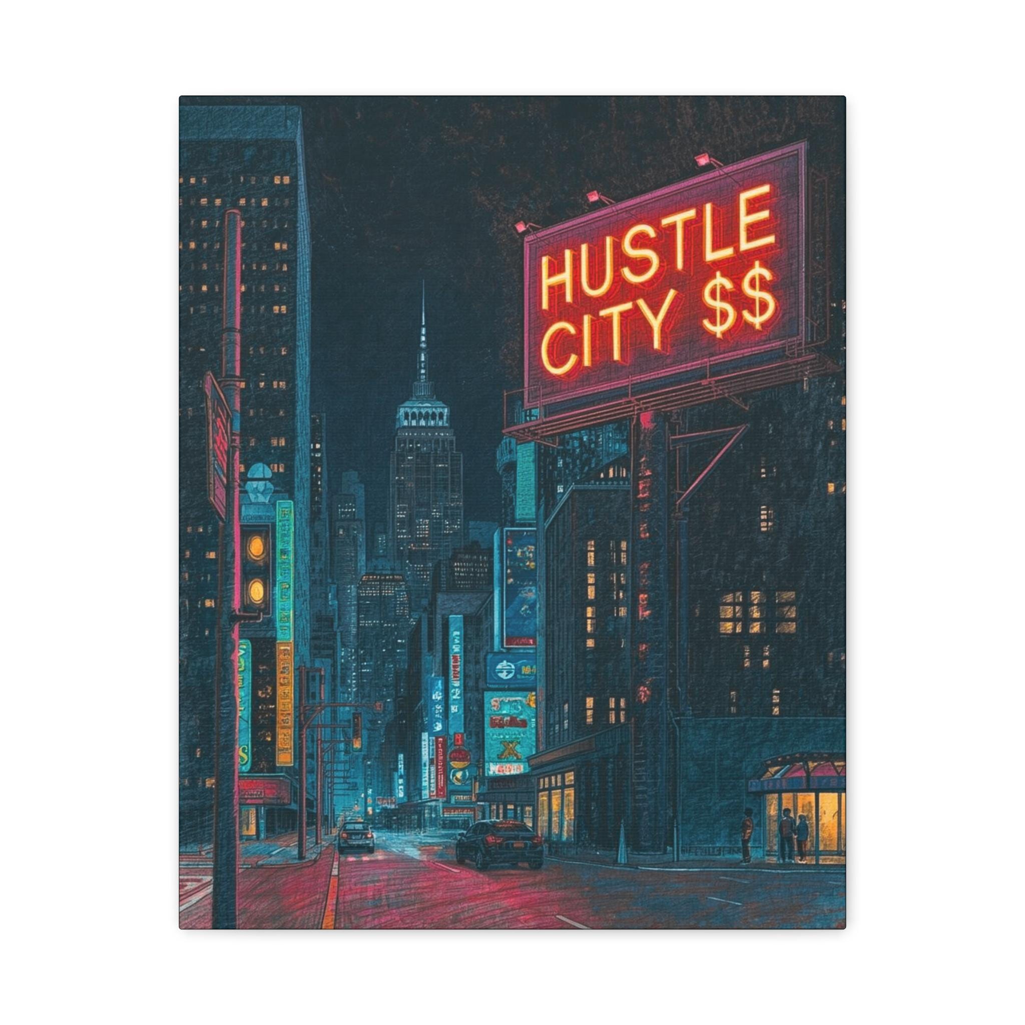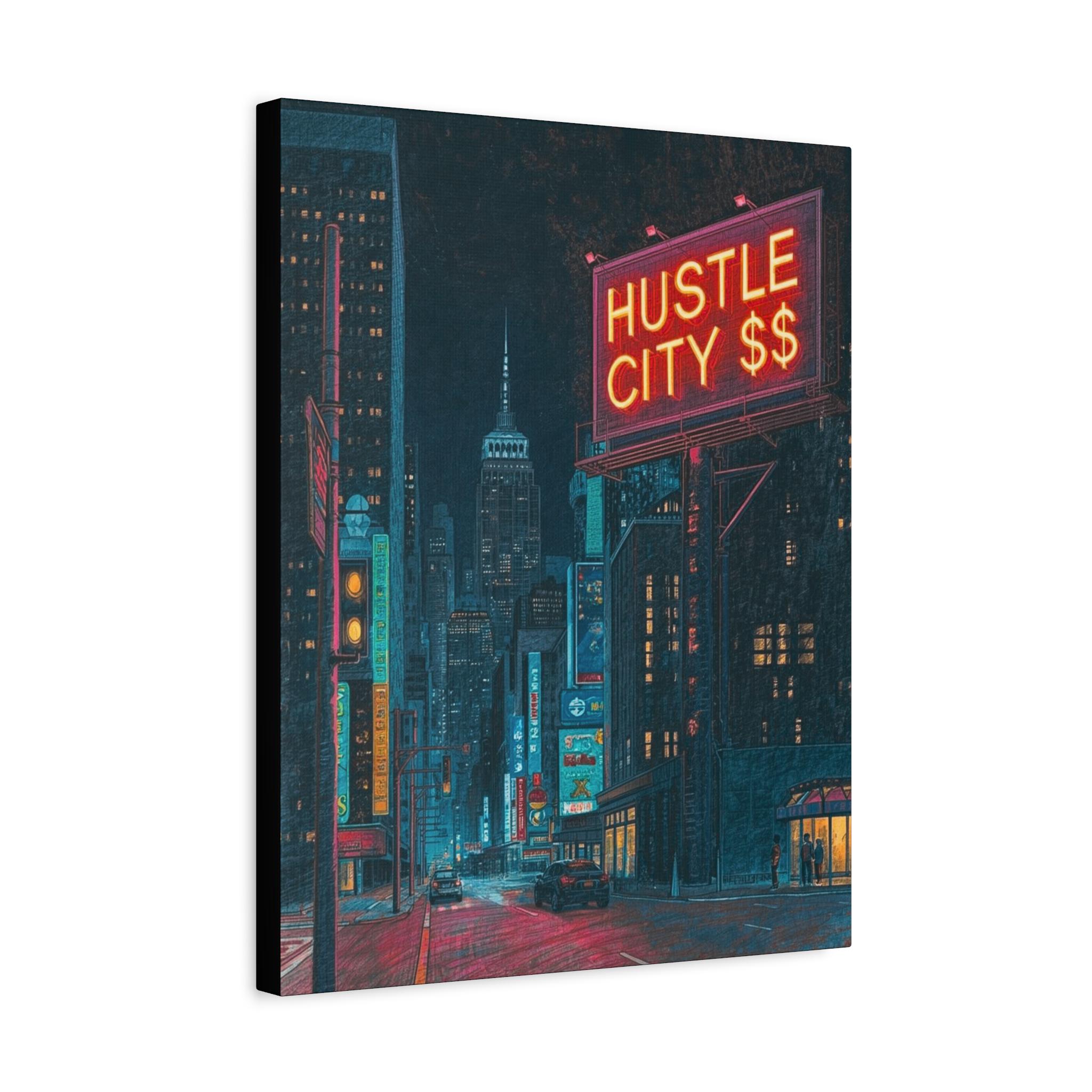 A matte stretched canvas that brings neon-lit city nights into your space. This gallery-style print captures a late-night urban scene—narrow streets, glowing signs, and rain-slick reflections—with rich, muted tones and a striking “HUSTLE CITY $$” billboard that draws the eye. The subtle matte finish softens glare for an intimate, cinematic look. Ready to hang right out of the box, it’s crafted to feel like a snapshot from a midnight wander through the city, a reminder of long nights, quiet ambition, and streets that never truly sleep.