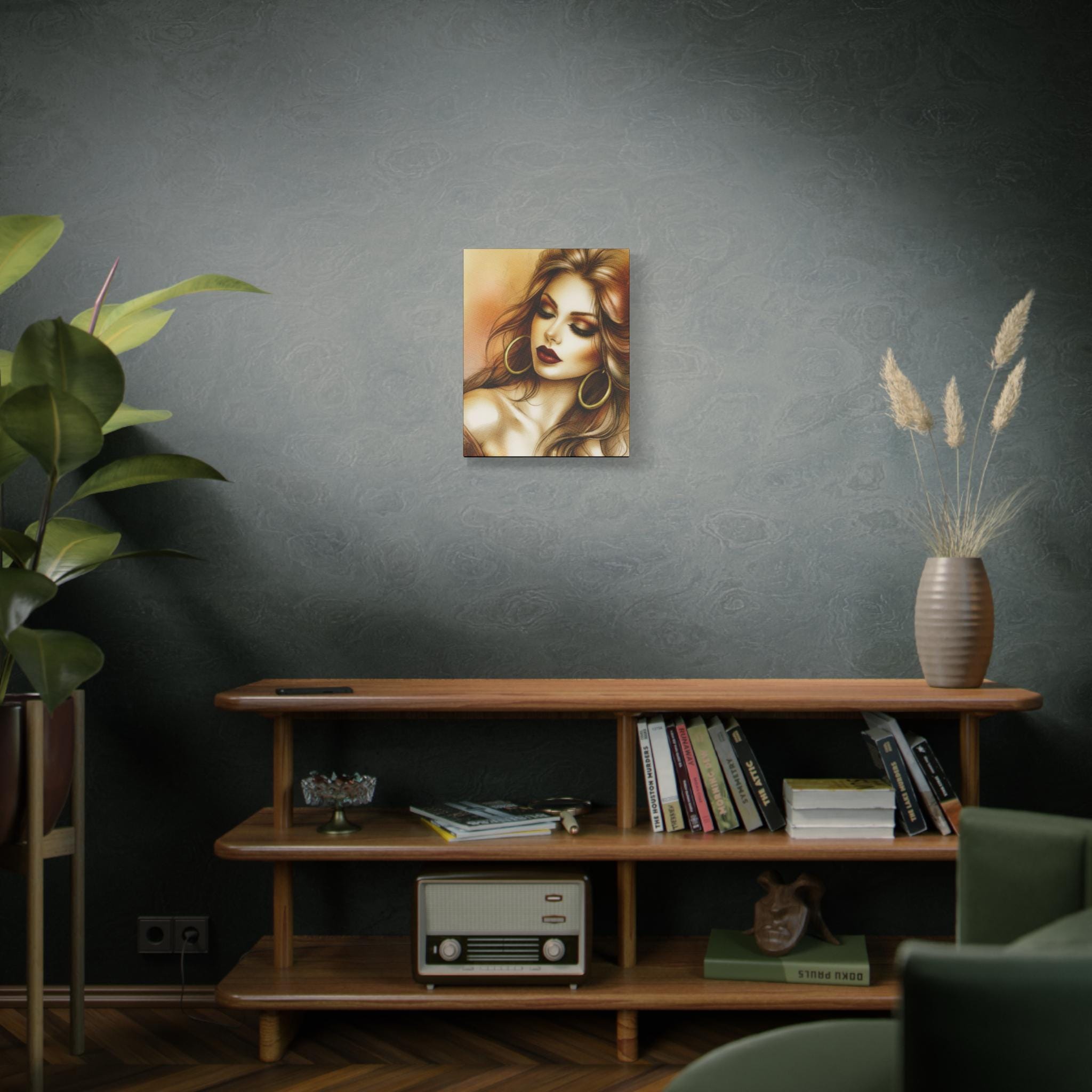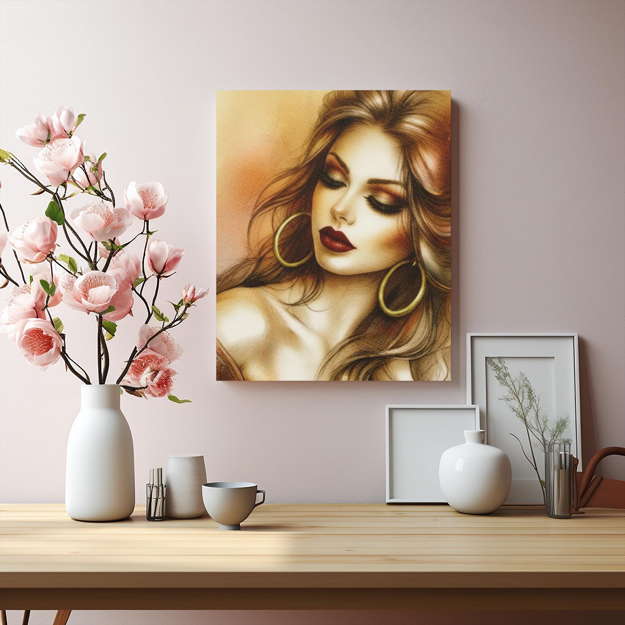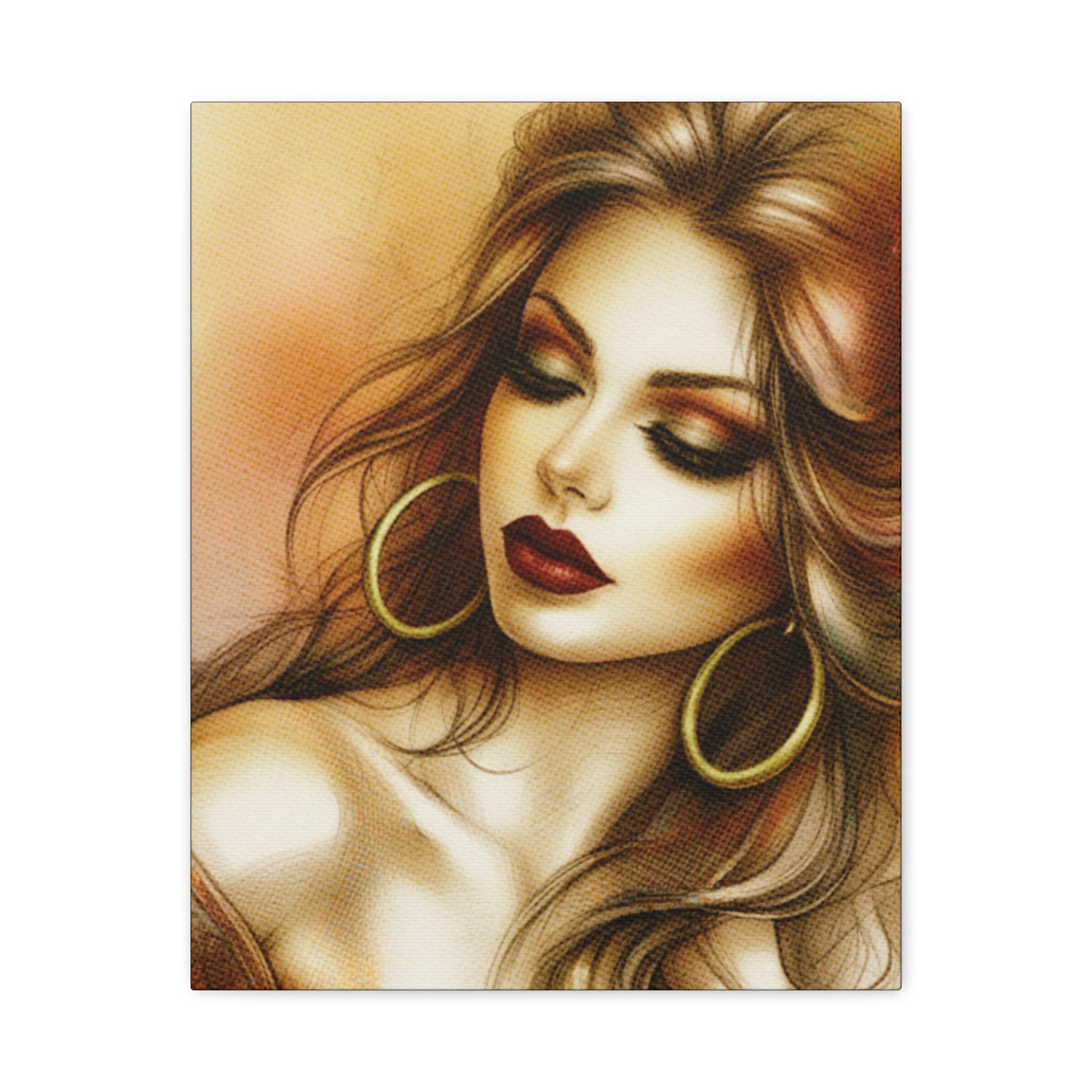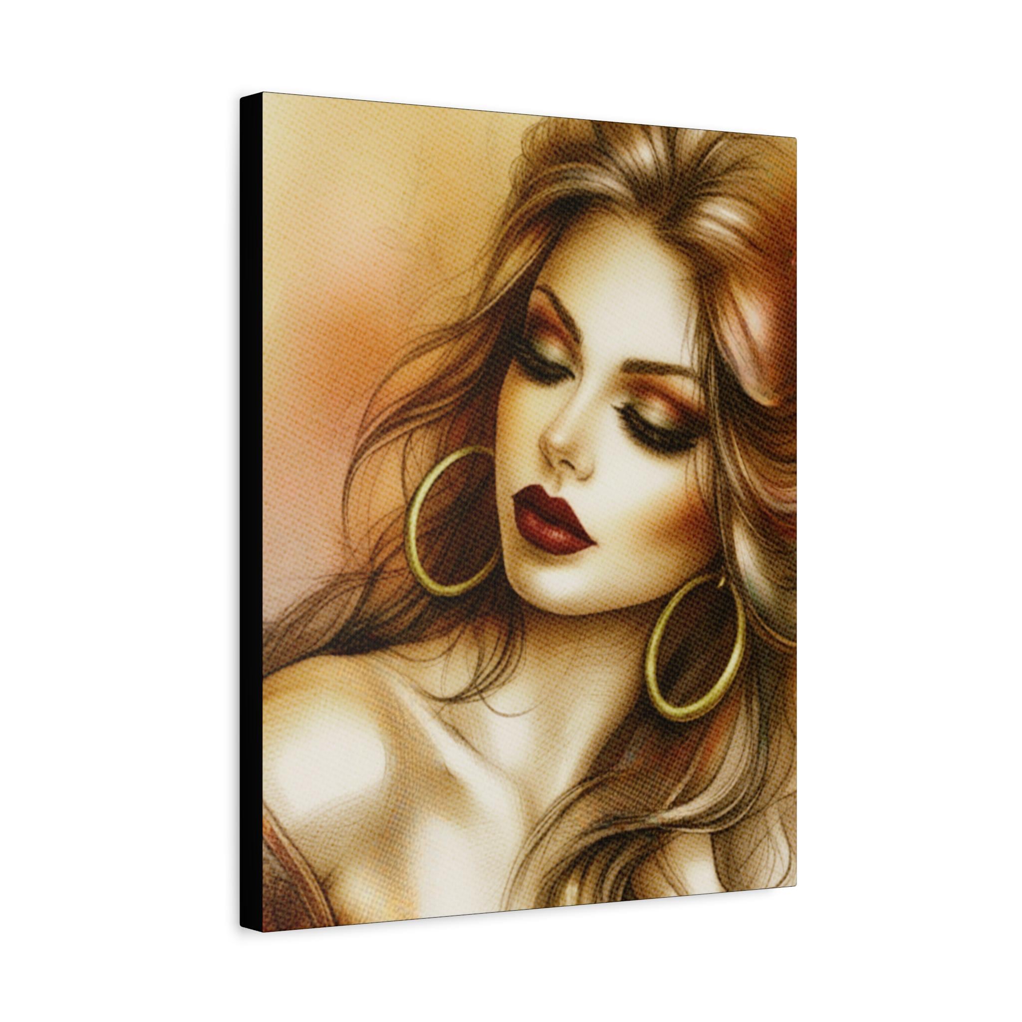 A luminous stretched canvas that captures a sultry, vintage-inspired portrait in warm golds and rose tones. The textured matte surface softens highlights and gives the artwork a gallery-quality feel, while the deep-stretched 1.25" profile creates a bold presence on the wall. Subtle details — from the soft brush-like gradients in her hair to the velvety, muted background — invite a slow, attentive look.