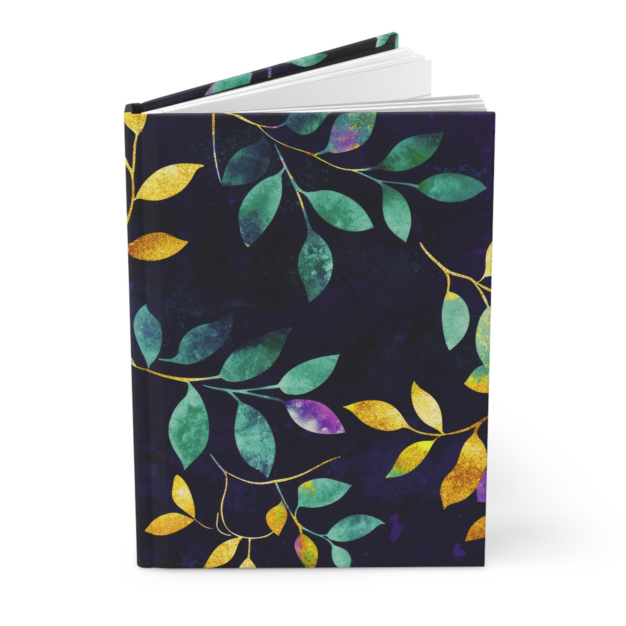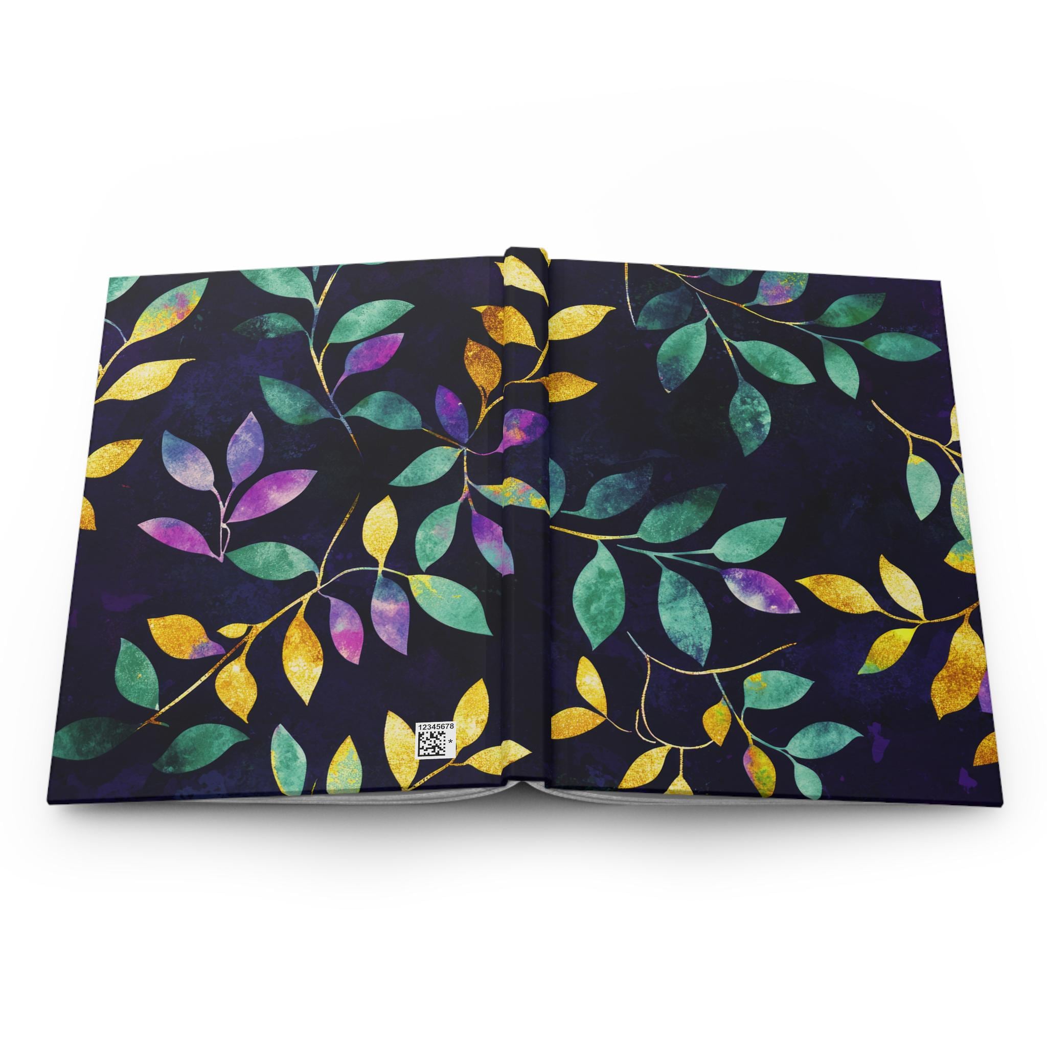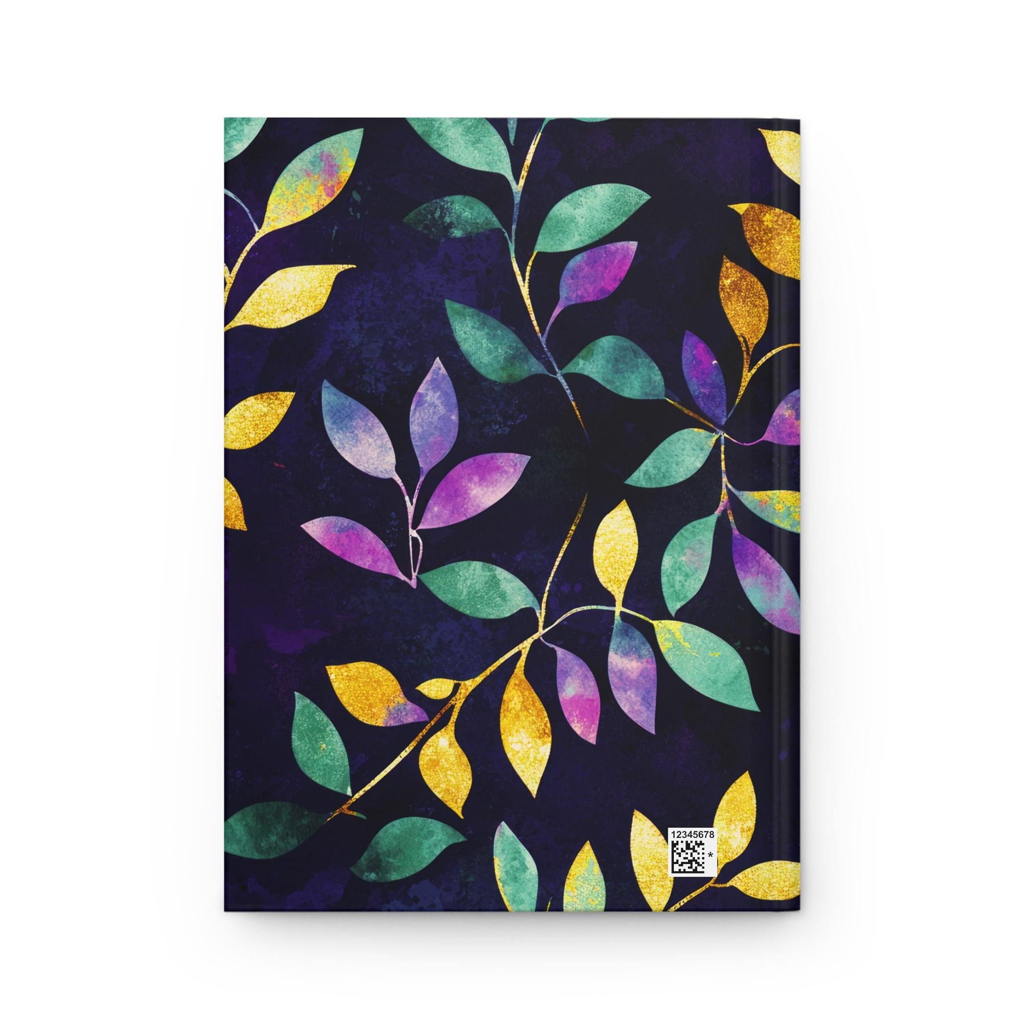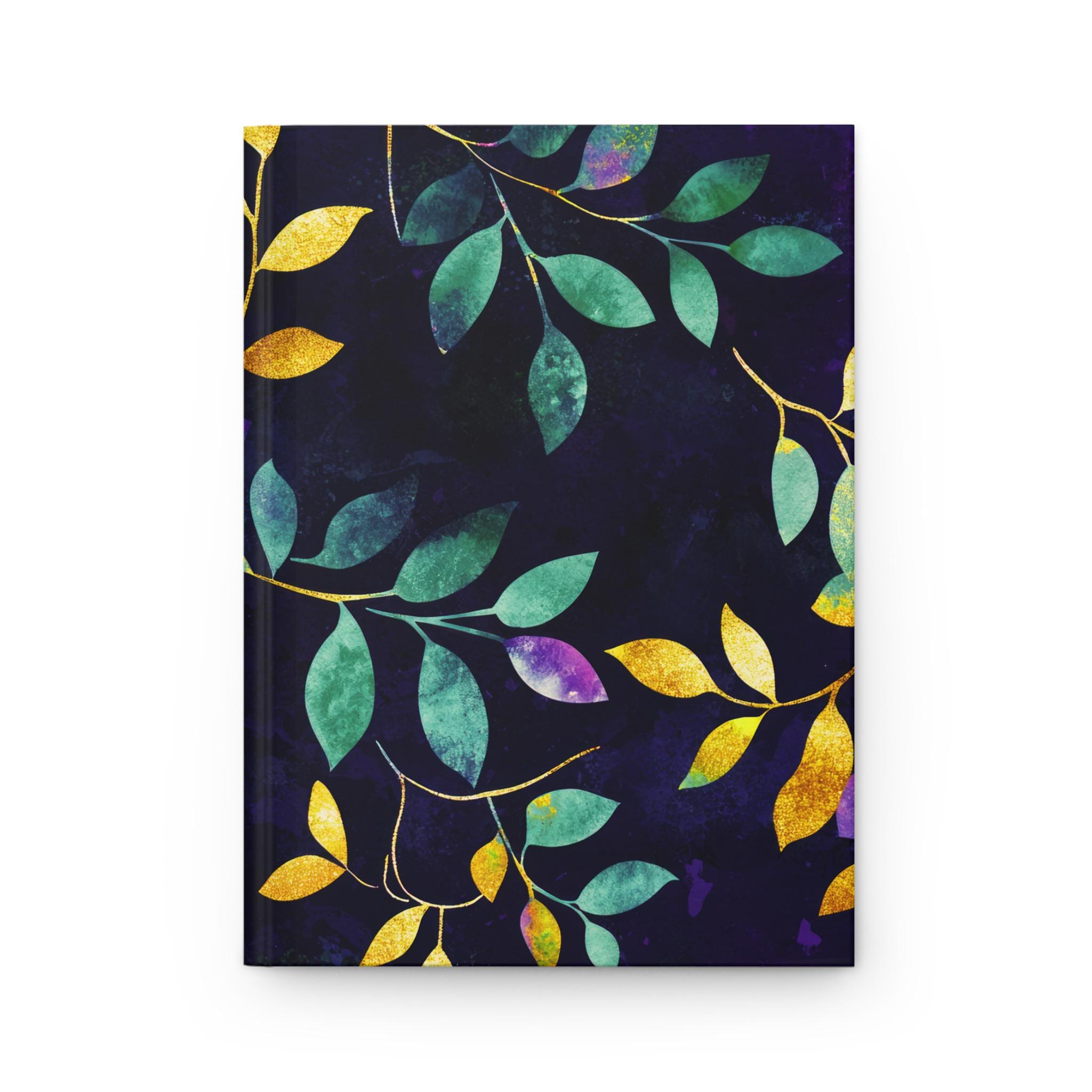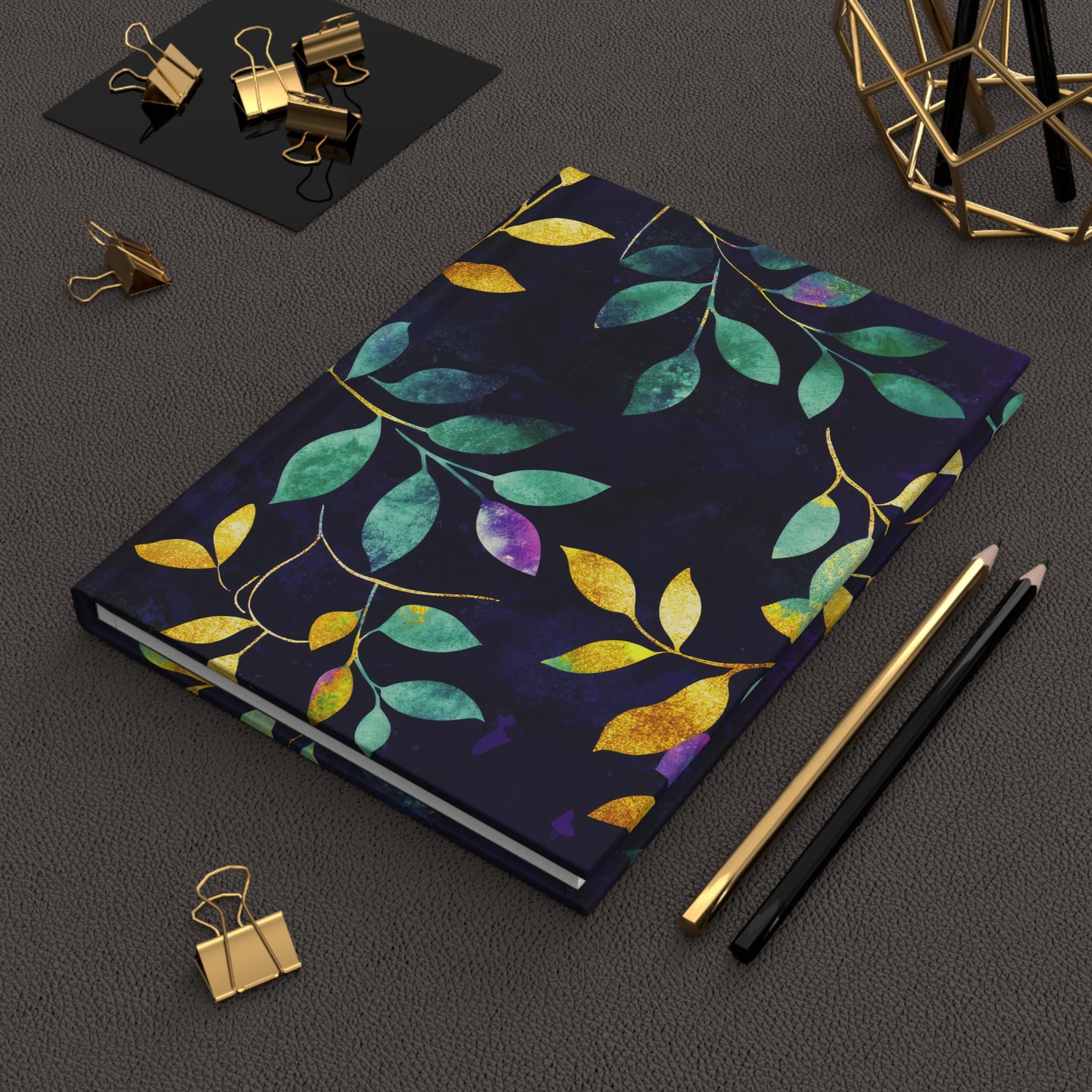 This hardcover journal brings quiet wonder to everyday notes. Its matte laminated cover softens the deep, night-sky background while watercolor leaves in teal, violet and gold seem to drift across the cover. Inside, 150 lined pages with perforations and a sewn case wrap binding make writing feel deliberate and easy — the spine opens flat so thoughts flow uninterrupted and individual pages can be neatly removed when needed. Keep it on your desk for plans and lists, stash it in a bag for on-the-go sketching, or let it live by your bedside as a place to collect small, honest moments.