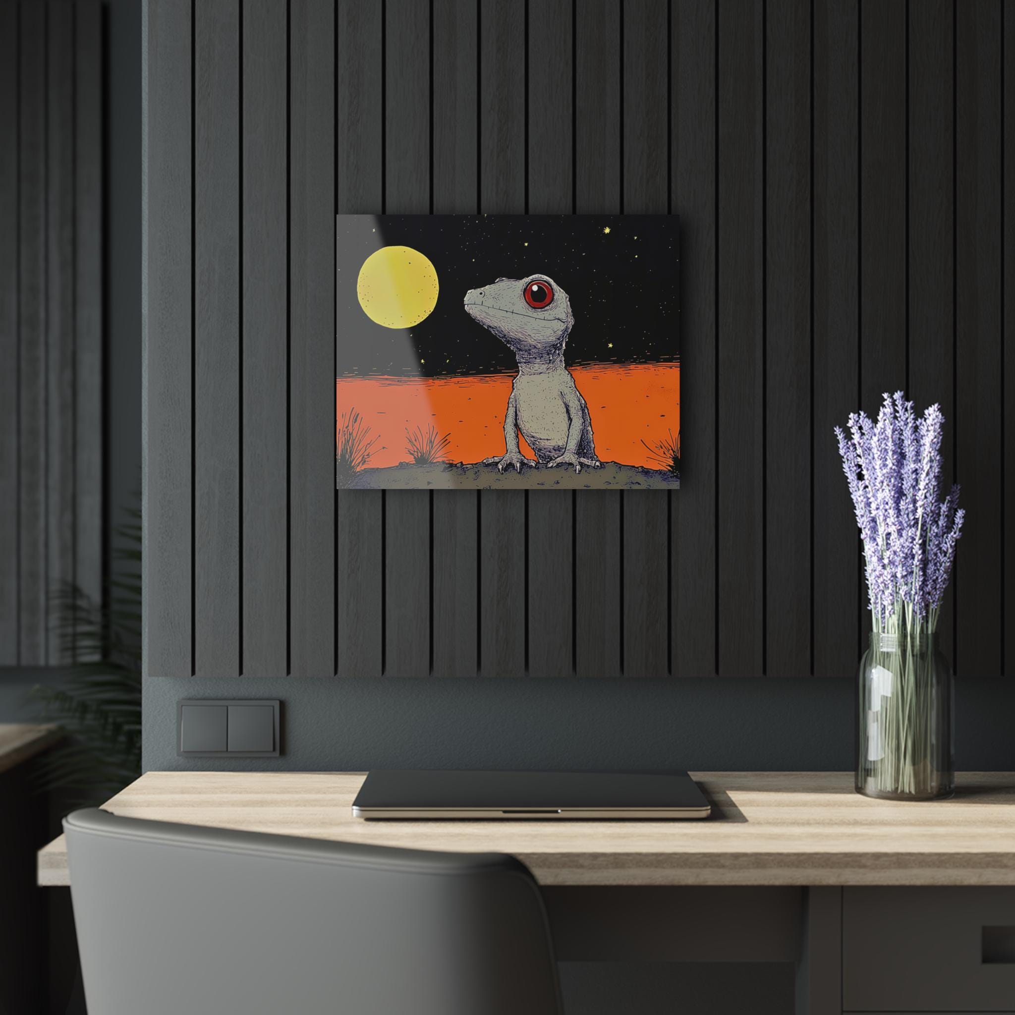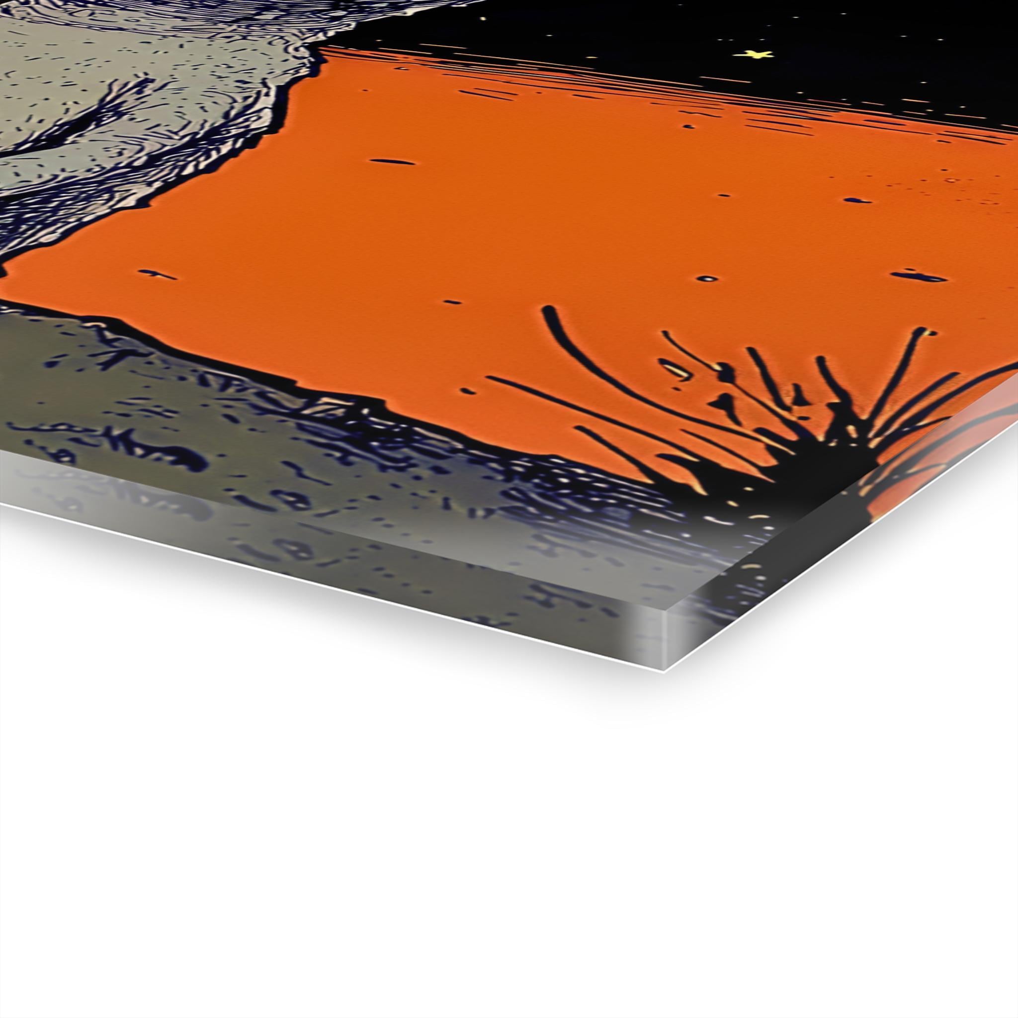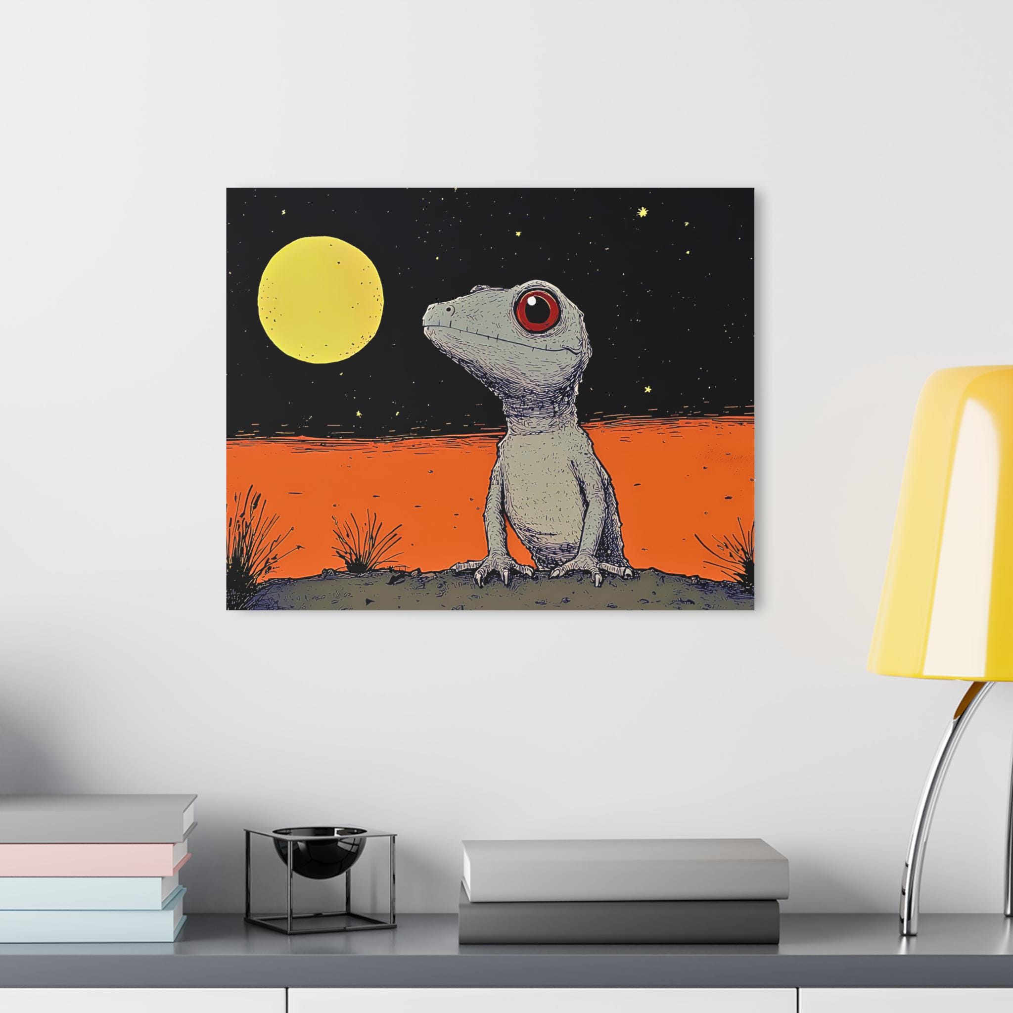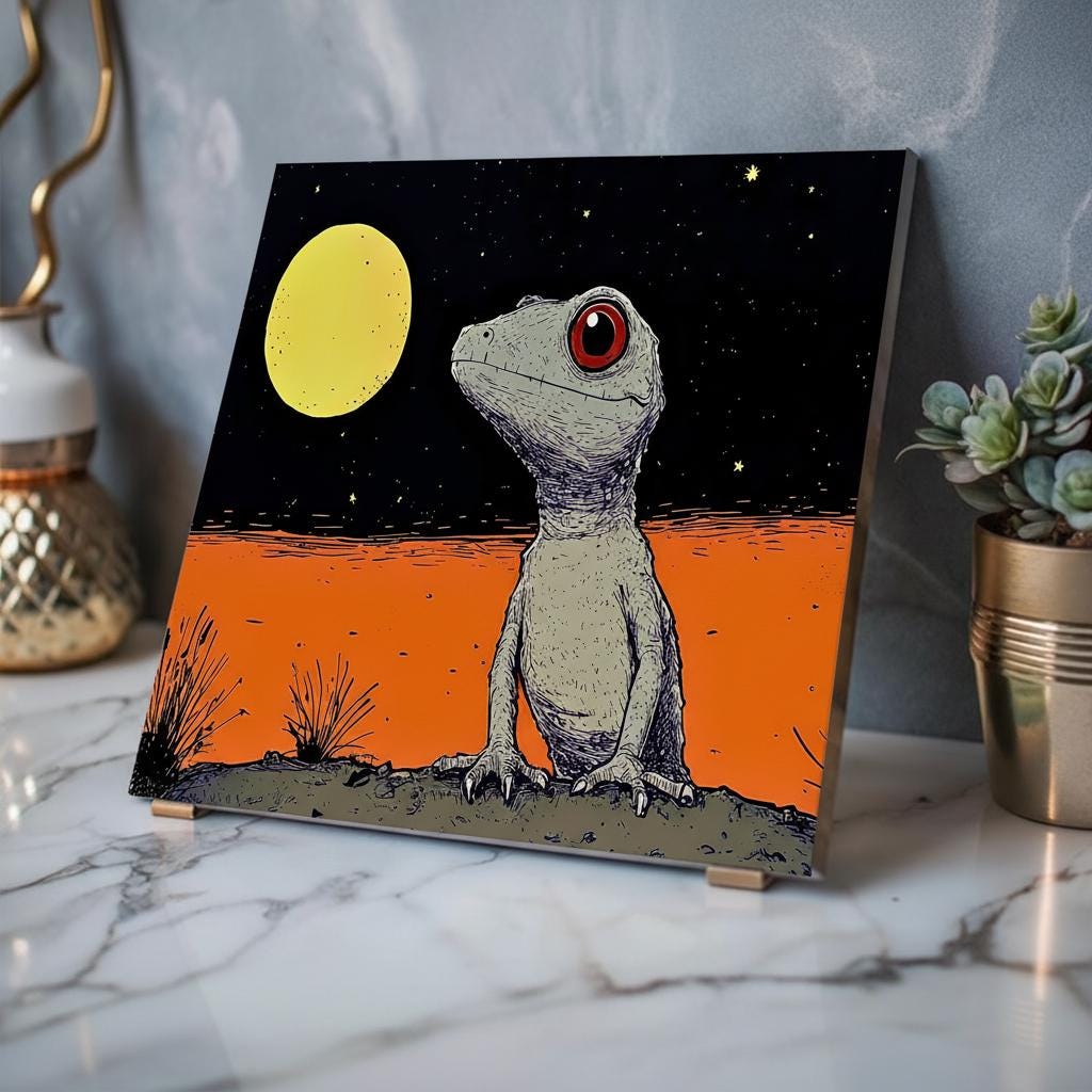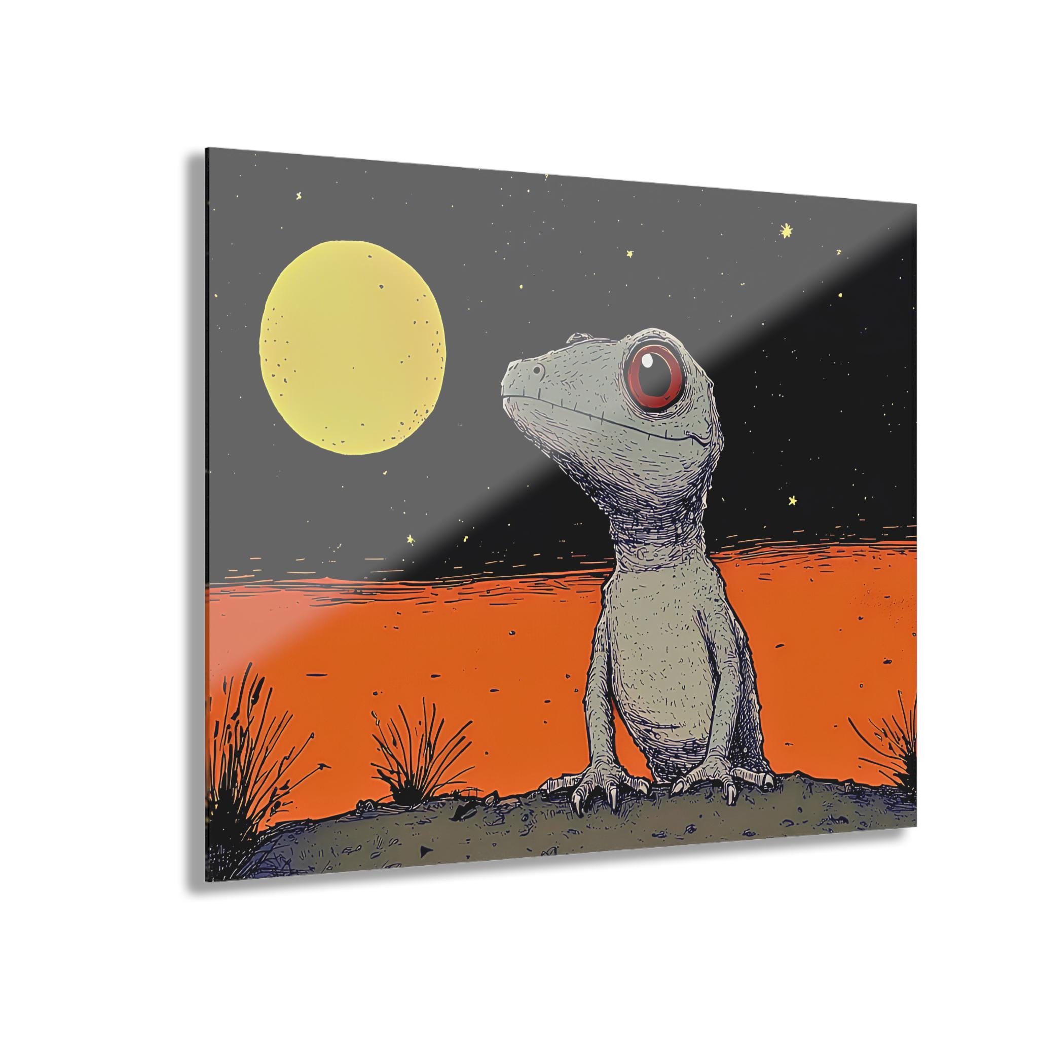 Acrylic wall art that brings quiet wonder and a touch of oddball charm to any room. The glossy finish deepens rich blacks and vibrant oranges, making the little gecko and moonlight glow like a memory from a night walk. Mounted on 0.25” grade-A acrylic with a white vinyl back, the piece floats off the wall and reads like a vivid, contemporary illustration. The included French cleat backing and screws make hanging straightforward and secure — instructions are included so you can place it exactly where the light catches the edges. This print works equally well as a focal point over a desk, in a nursery with adventurous taste, or grouped in a gallery wall with other illustrated pieces.