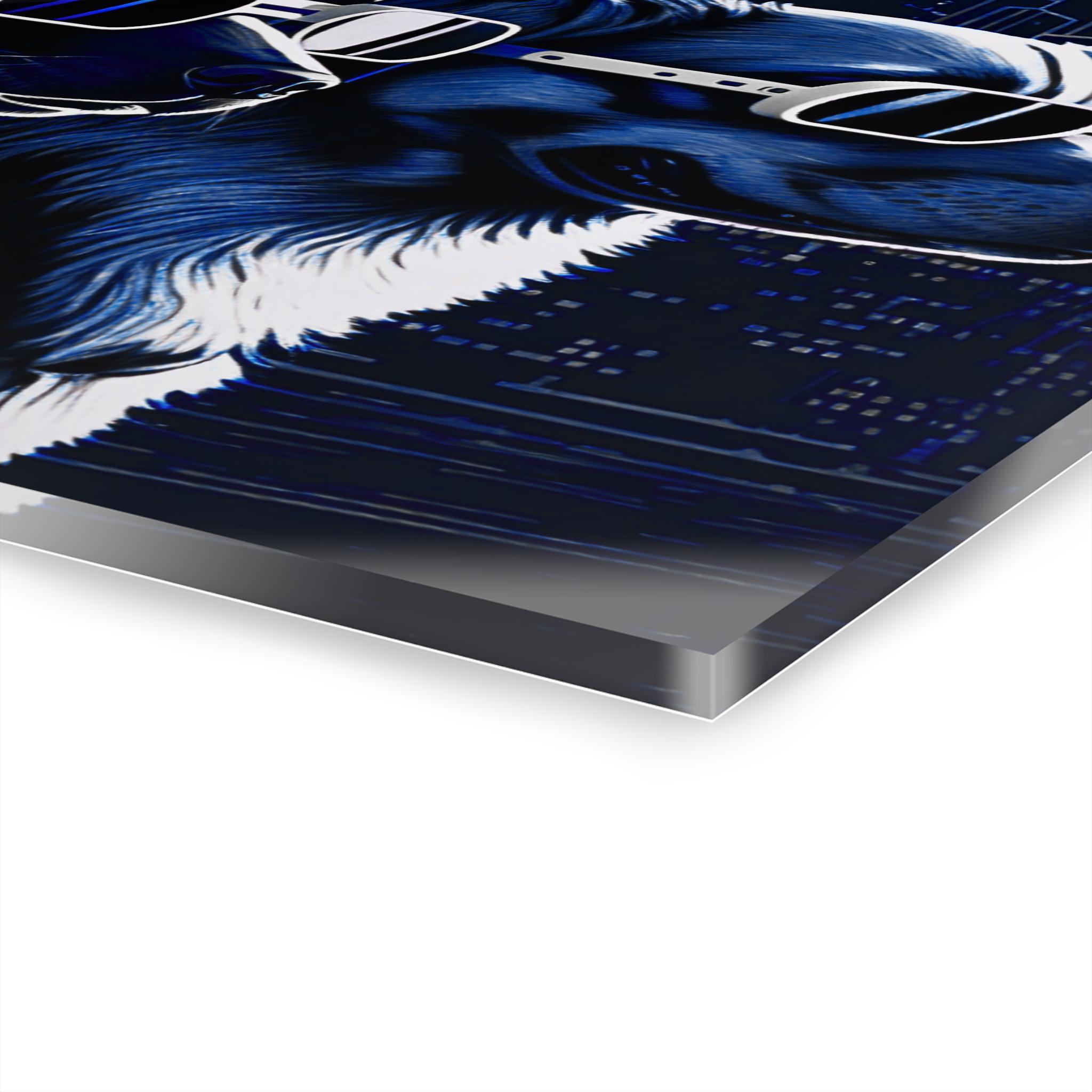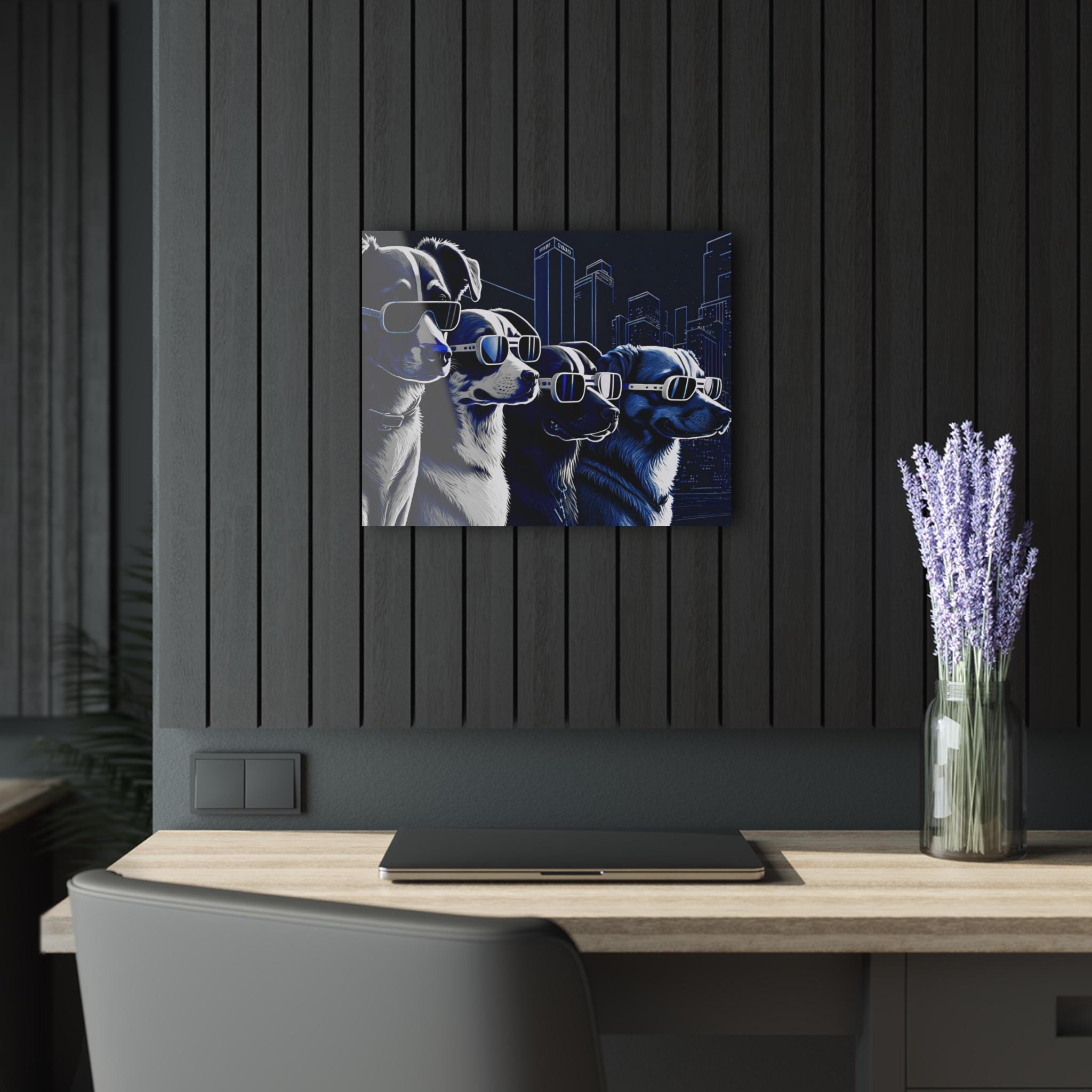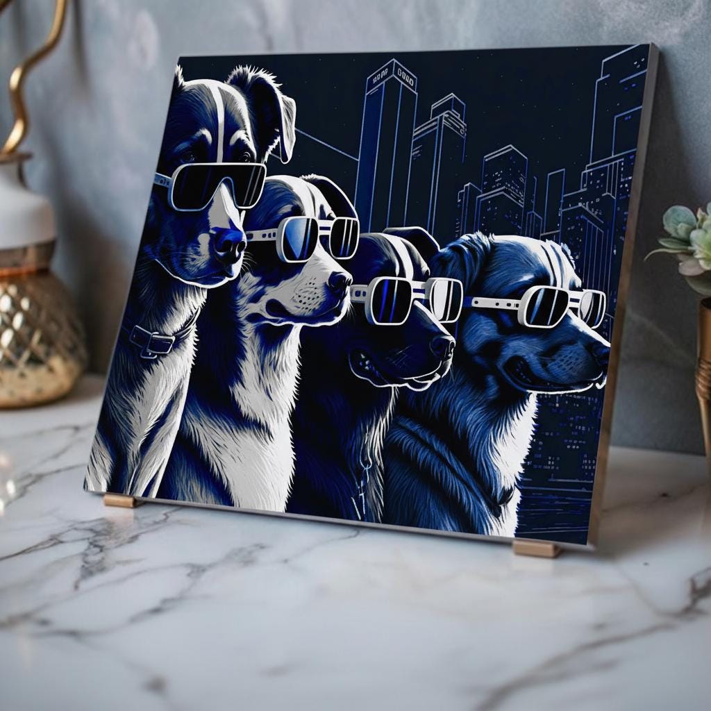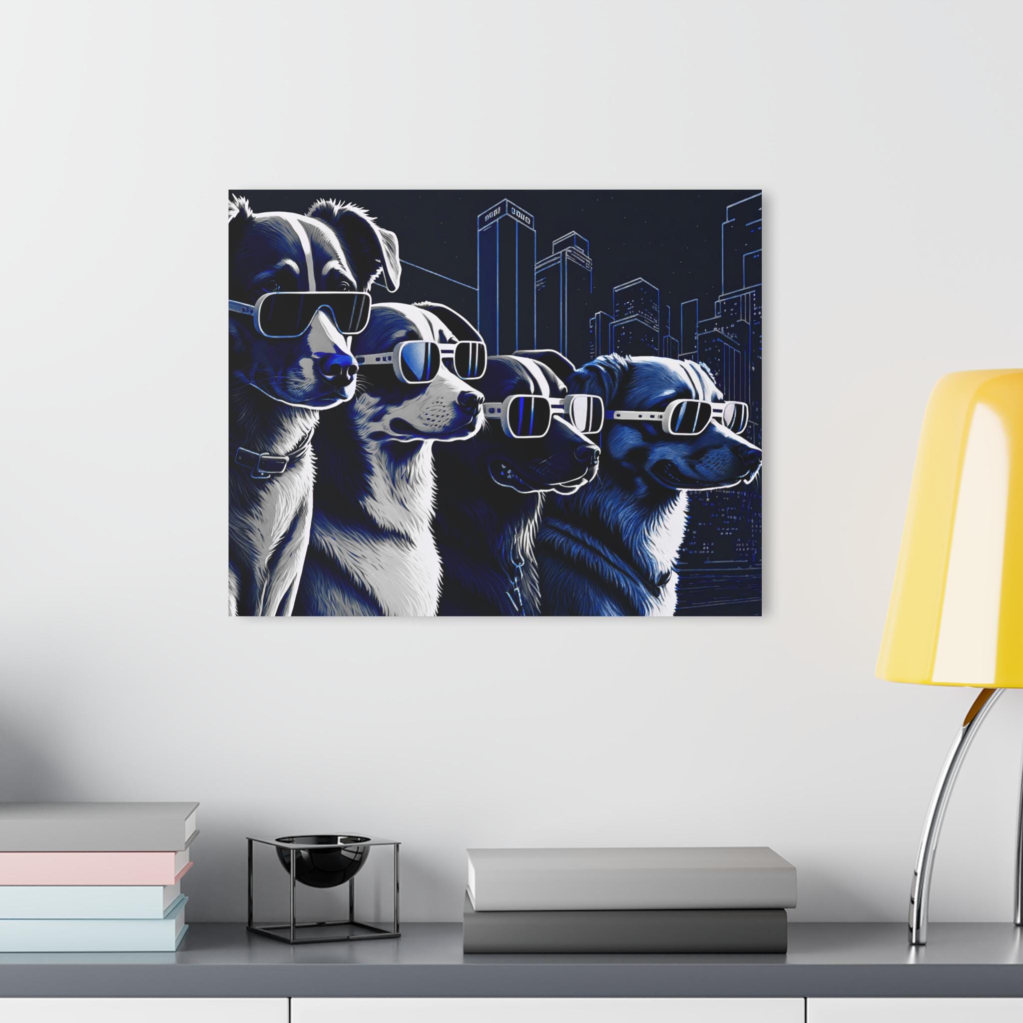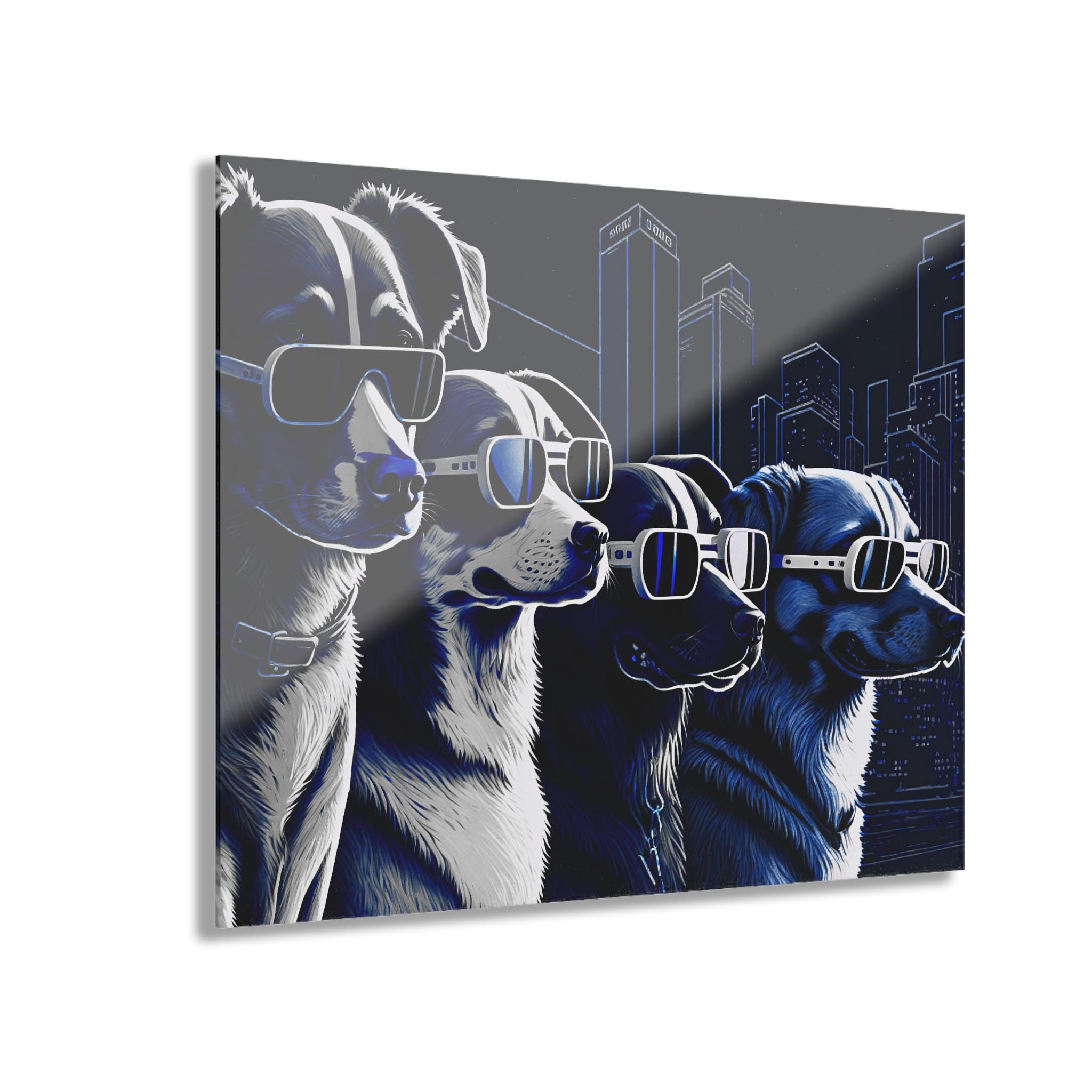 Bring a burst of personality and futuristic flair to your space with this striking acrylic canvas print featuring four ultra-cool dogs sporting sleek, high-tech sunglasses against a glowing cityscape. Rendered in rich shades of blue, white, and black, the artwork blends urban energy with playful charm, making it a perfect statement piece for modern homes, offices, studios, or pet lovers with a taste for the unique.