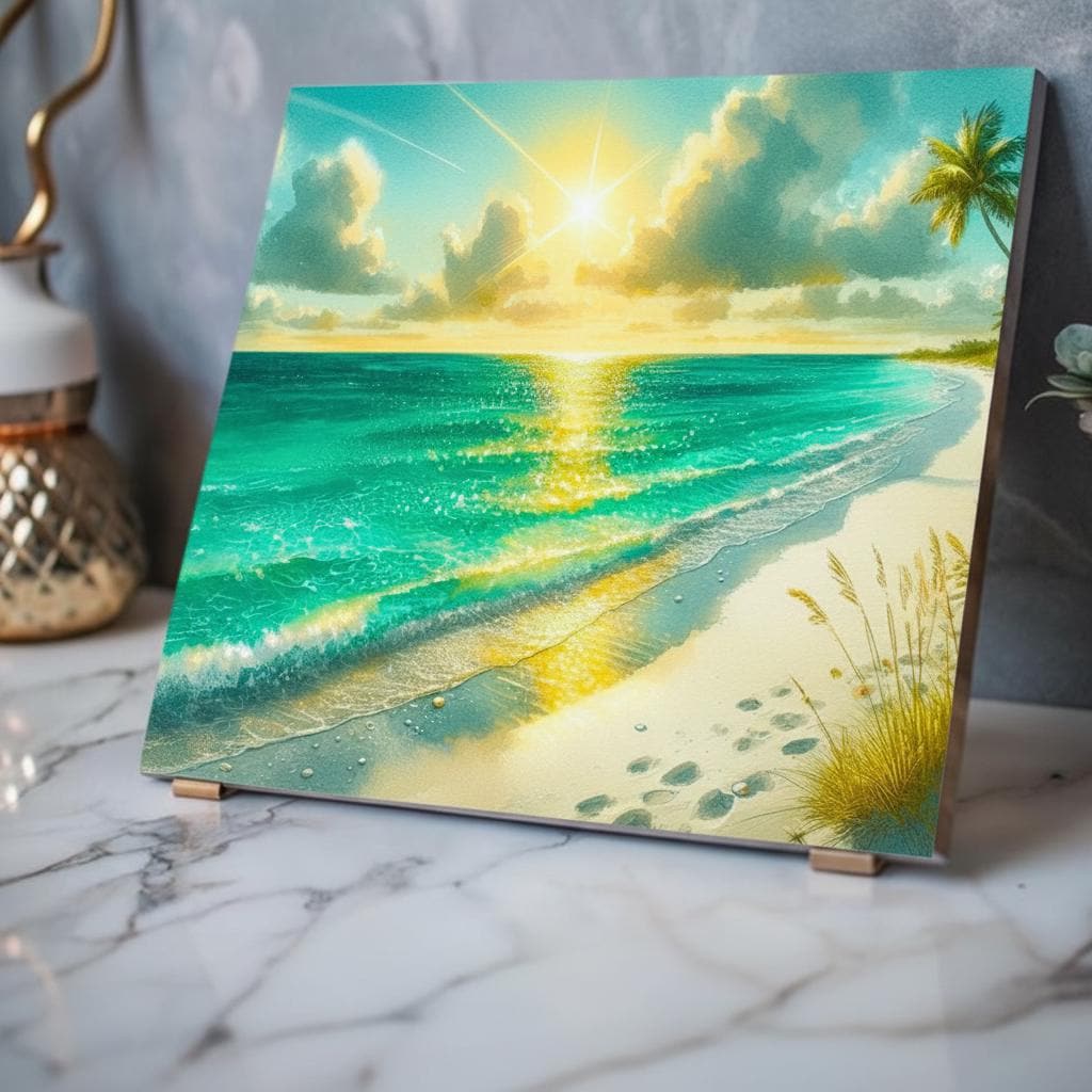 Sunlight spills across turquoise waves and warm sand in this glossy acrylic print, captured with vivid clarity and a luminous finish. The scene brings a quiet, restorative moment to any room — imagine morning light sliding across the wall as you sip coffee, or a calm, seaside pulse grounding your workspace after a long day. Mounted on sturdy, grade-A acrylic with crystal-clear edges, the image seems to float off the wall, drawing the eye without overwhelming the space. The included French cleat and hardware make installation straightforward and secure, so this piece becomes part of your room’s rhythm right away.