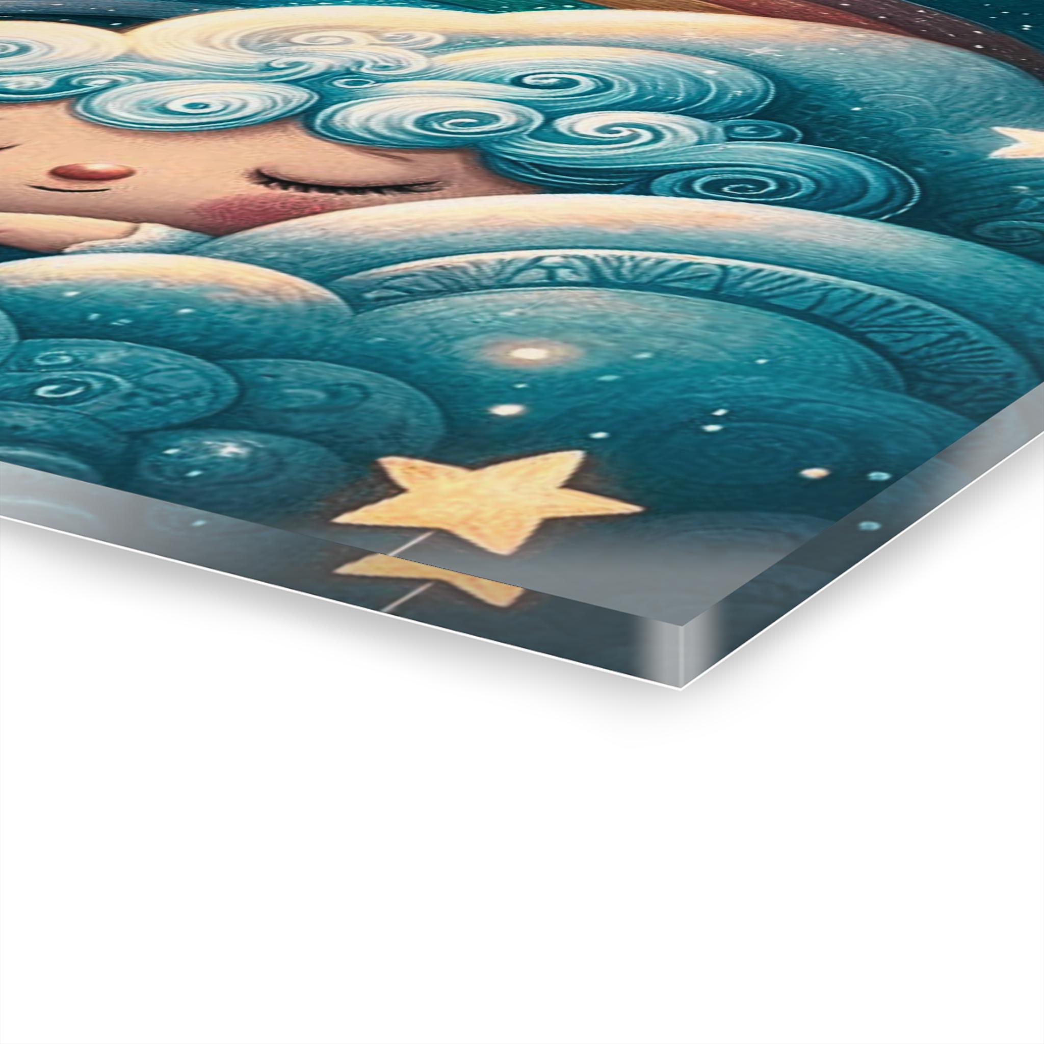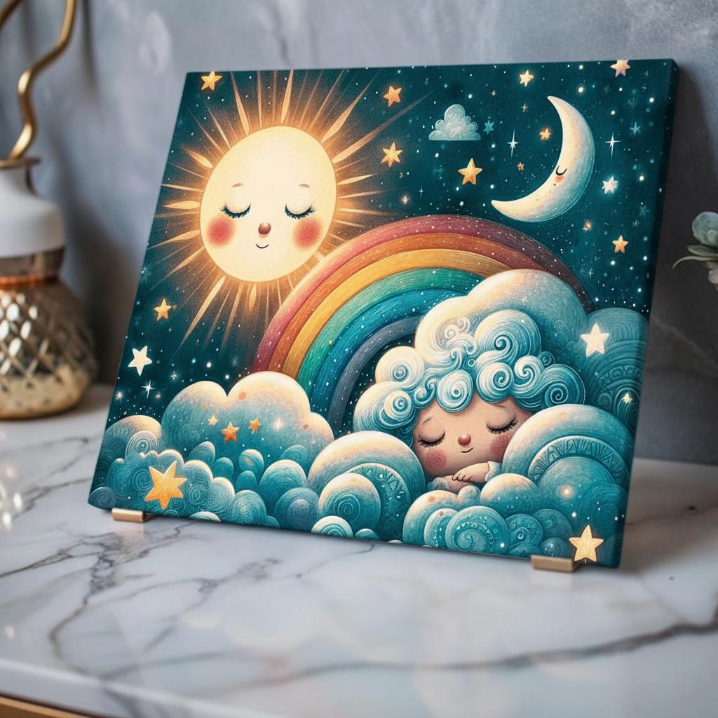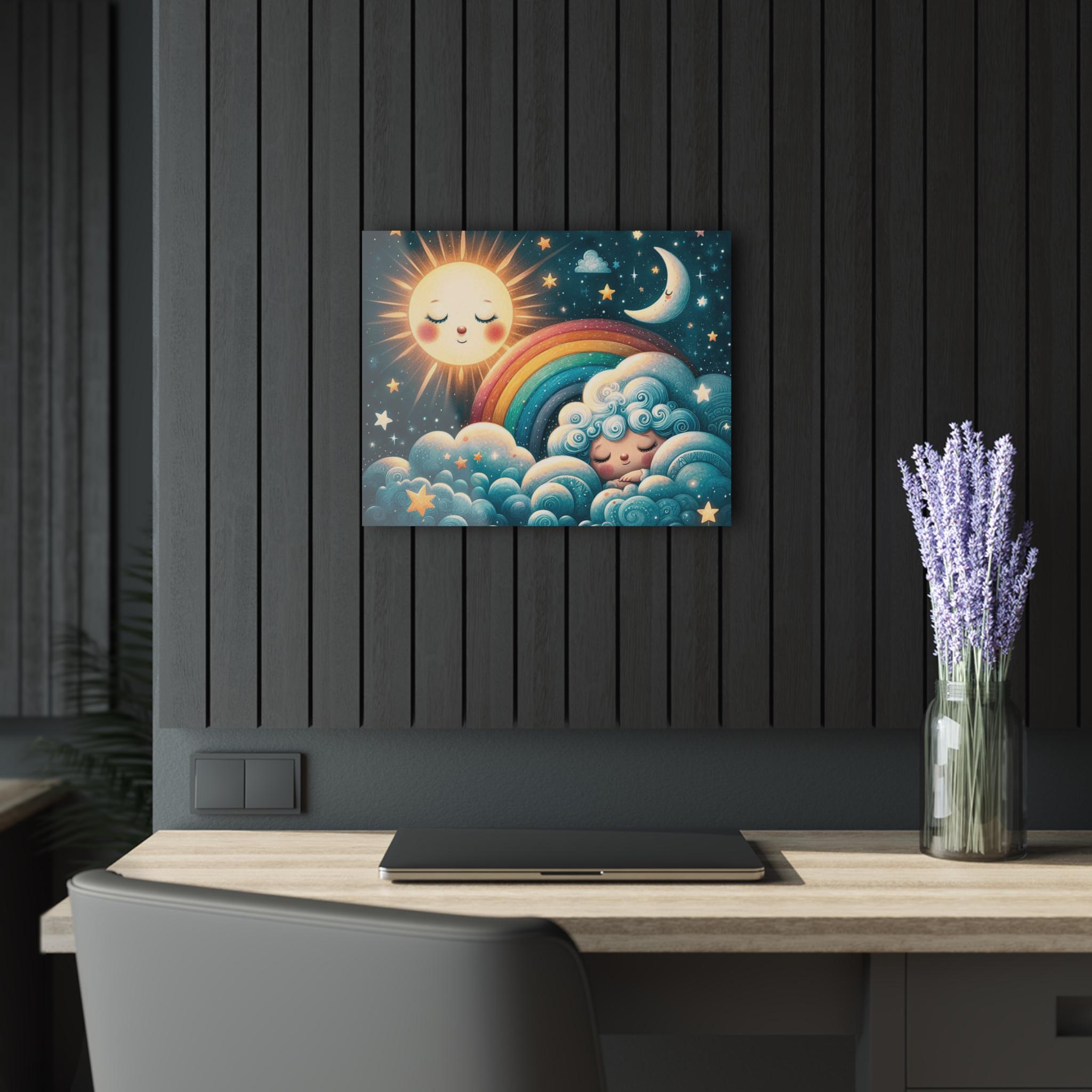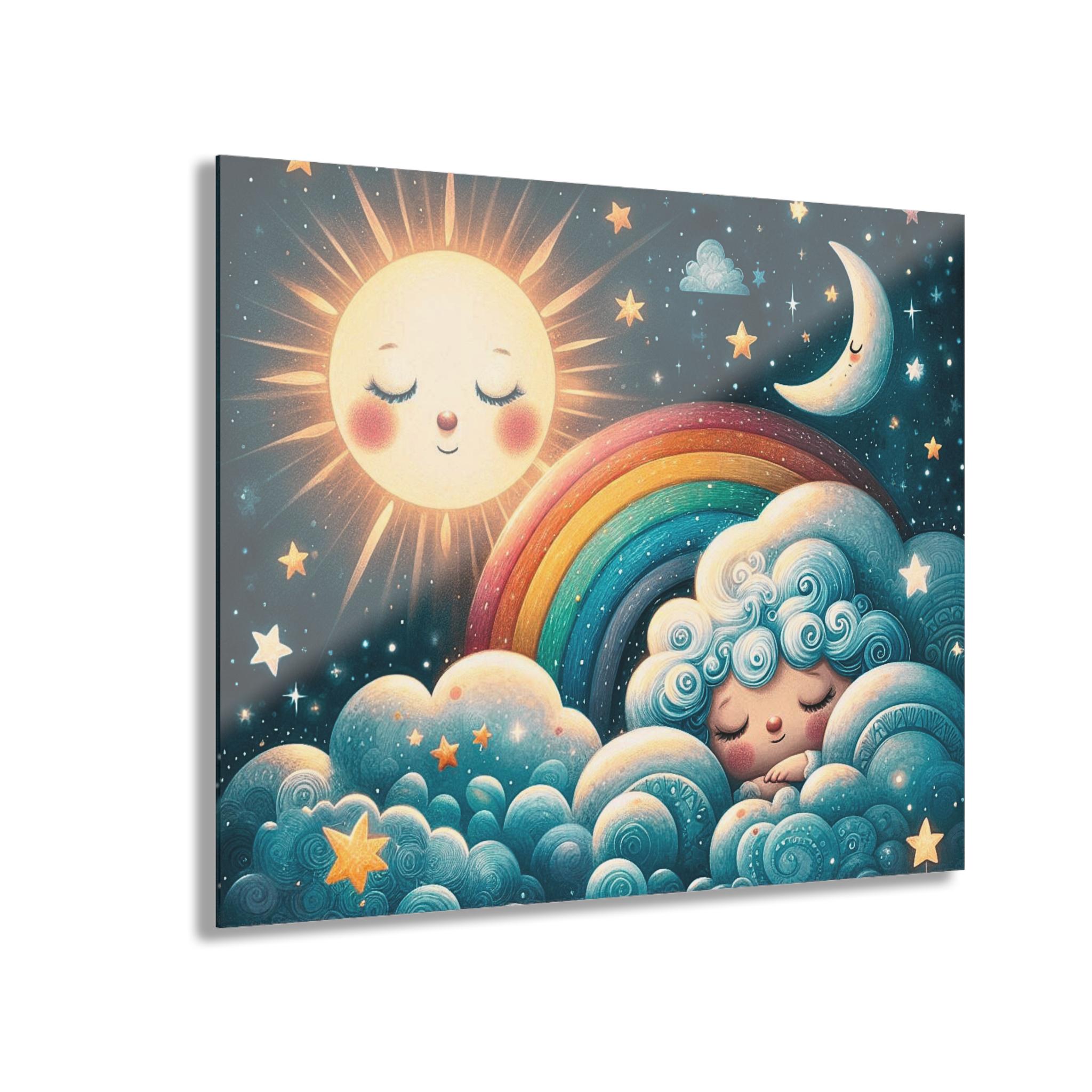Soft moonlight and a sleepy sun come alive on glossy acrylic. This slim, crystal-clear panel turns a nursery or cozy corner into a gentle dreamscape: clouds curl like cotton, a rainbow slopes between a smiling sun and crescent moon, and tiny stars seem to twinkle from within the print. Hung with the included French cleat system, the piece sits flush to the wall with a clean, professional look — a quiet, comforting presence that invites bedtime stories and slow, sighing breaths.