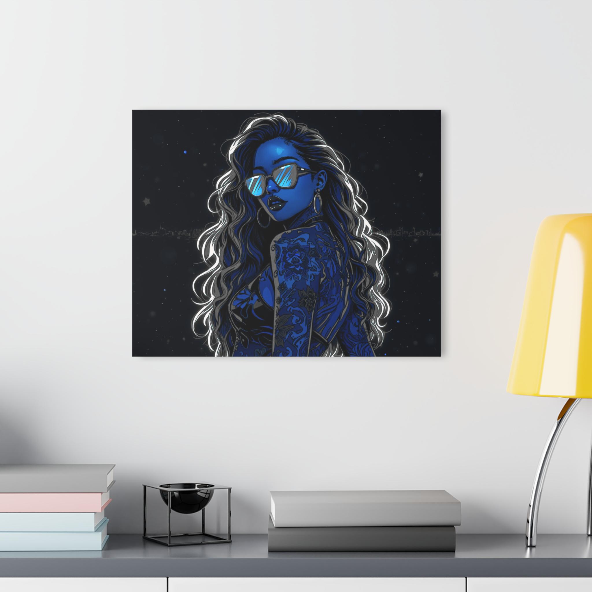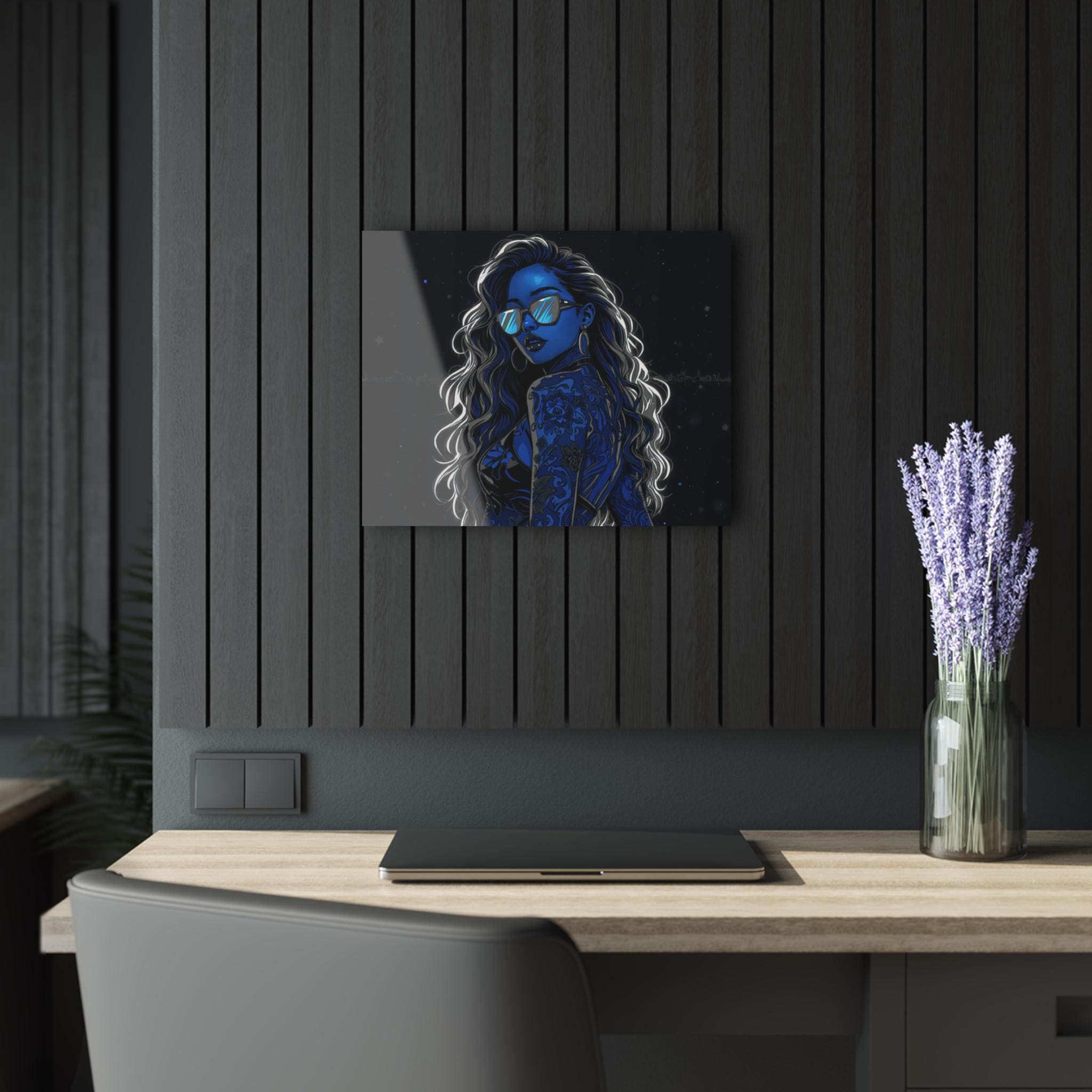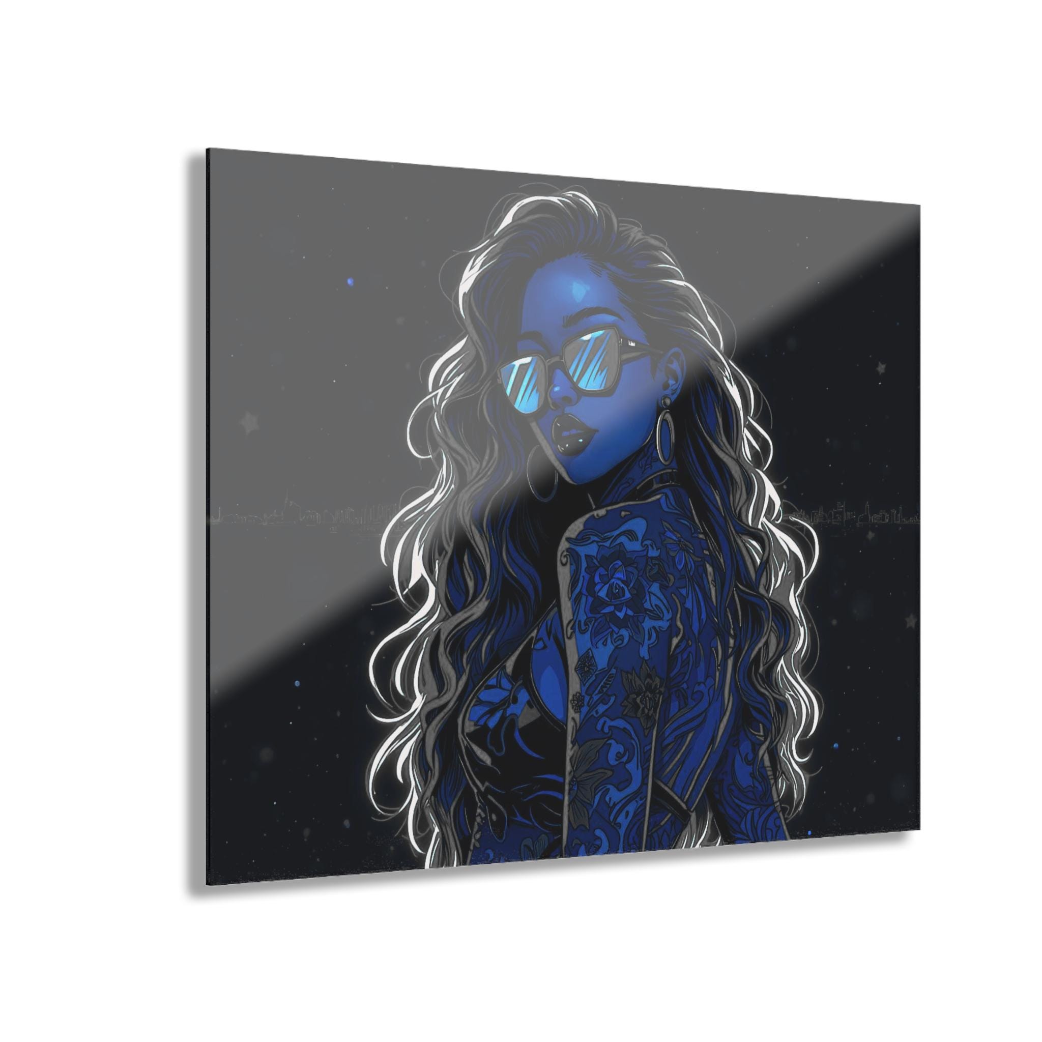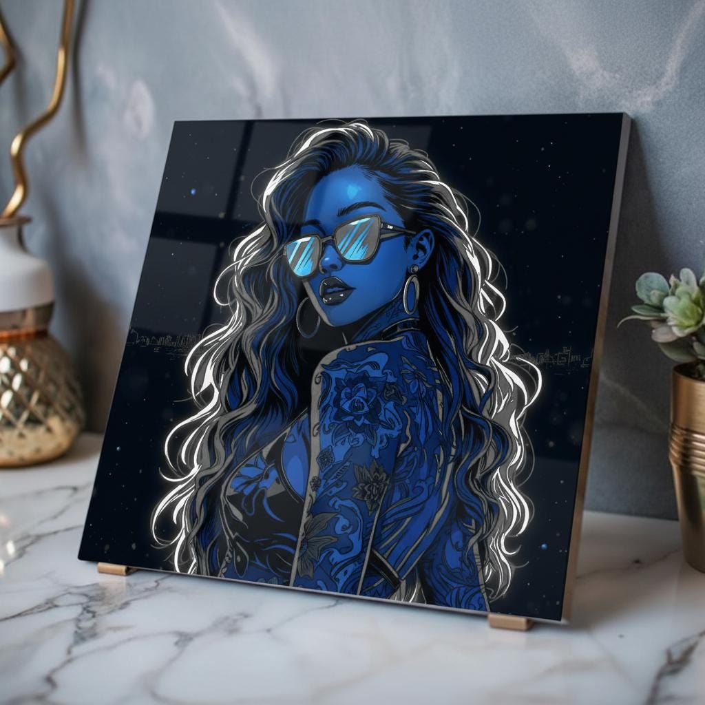 Lean back into a late-night city glow. This acrylic print captures a neon-lit portrait with deep blues, glossy highlights, and crystal-clear edges that catch light like a storefront window. Mounted on 0.25" grade-A acrylic with a white vinyl back, the image feels bright, layered, and modern — the kind of piece that turns a blank wall into a moody vignette. The French cleat backing sits flush and secure, so the artwork reads like it’s floating; installation is quick with the included screws and easy-to-follow instructions. This print belongs in spaces where late nights, city streets, and a bold, cinematic aesthetic are part of the everyday soundtrack.