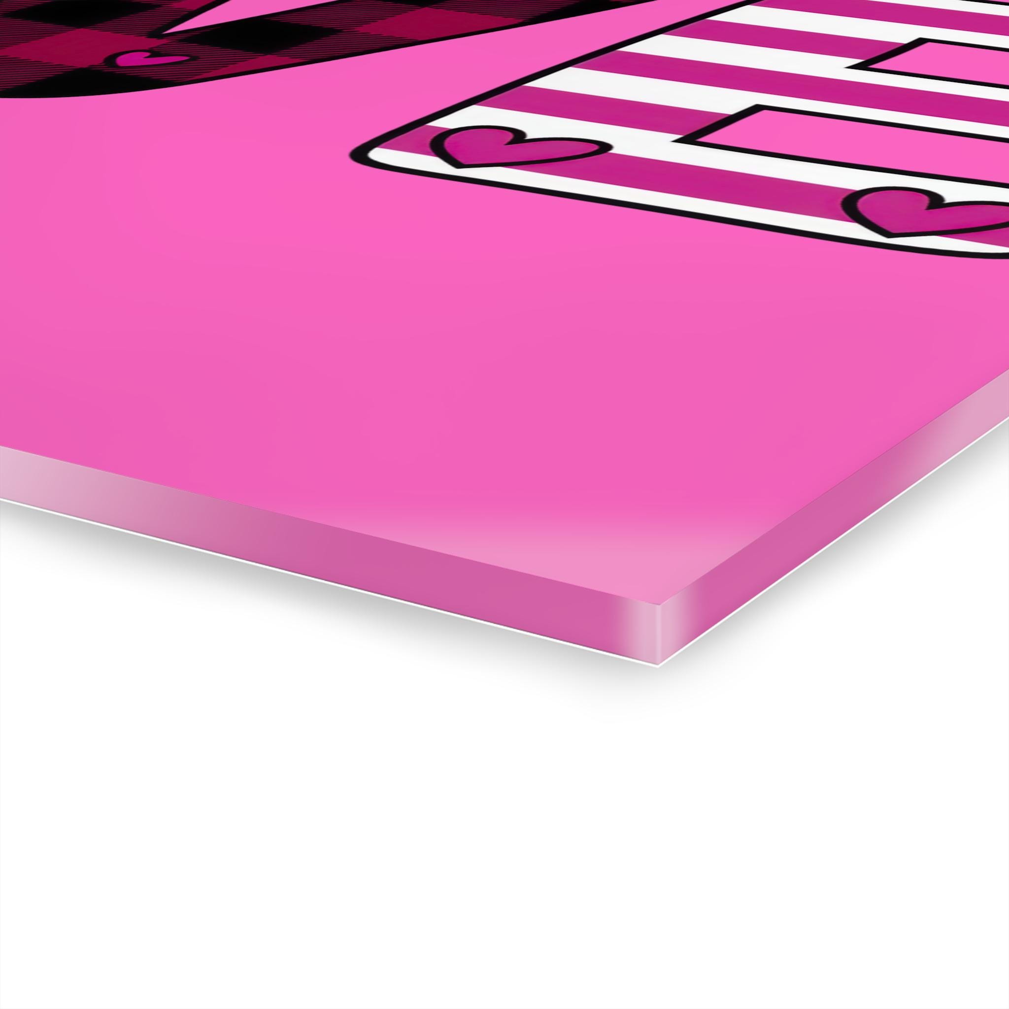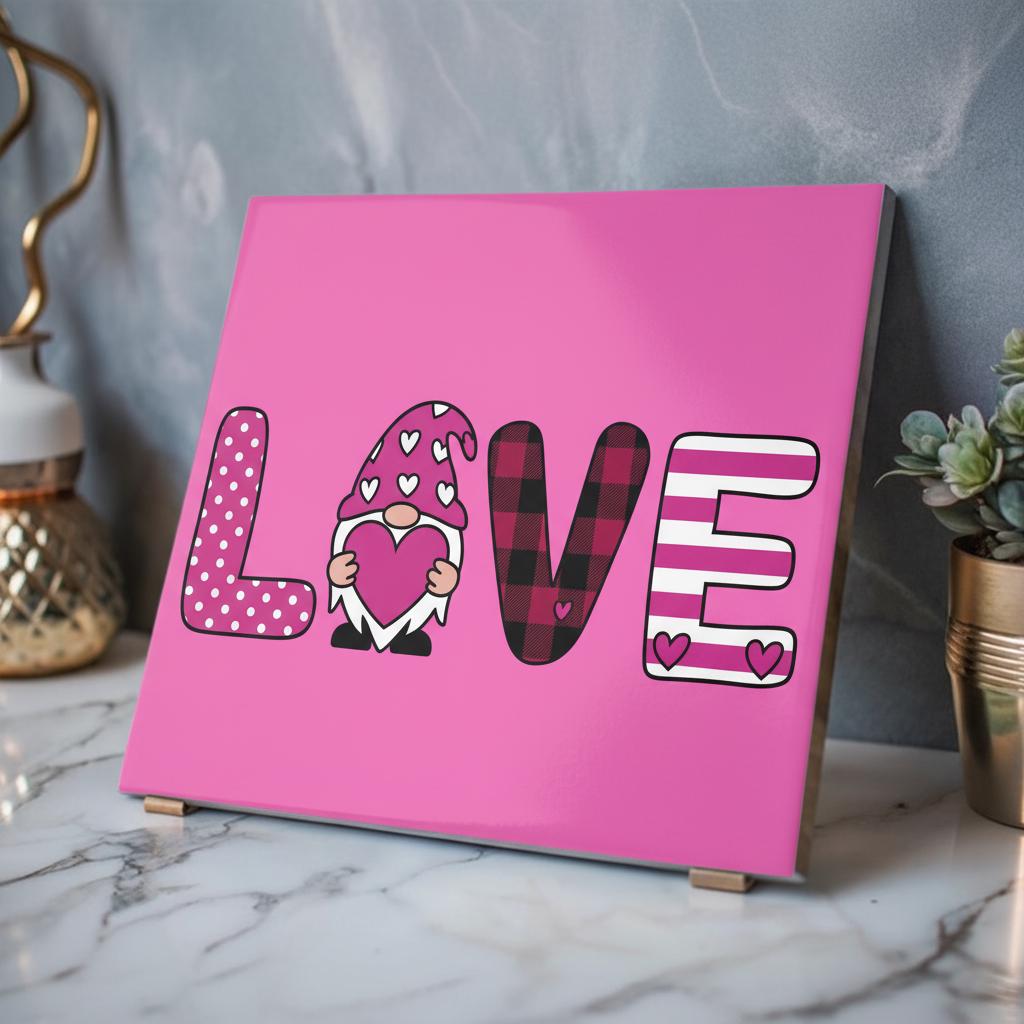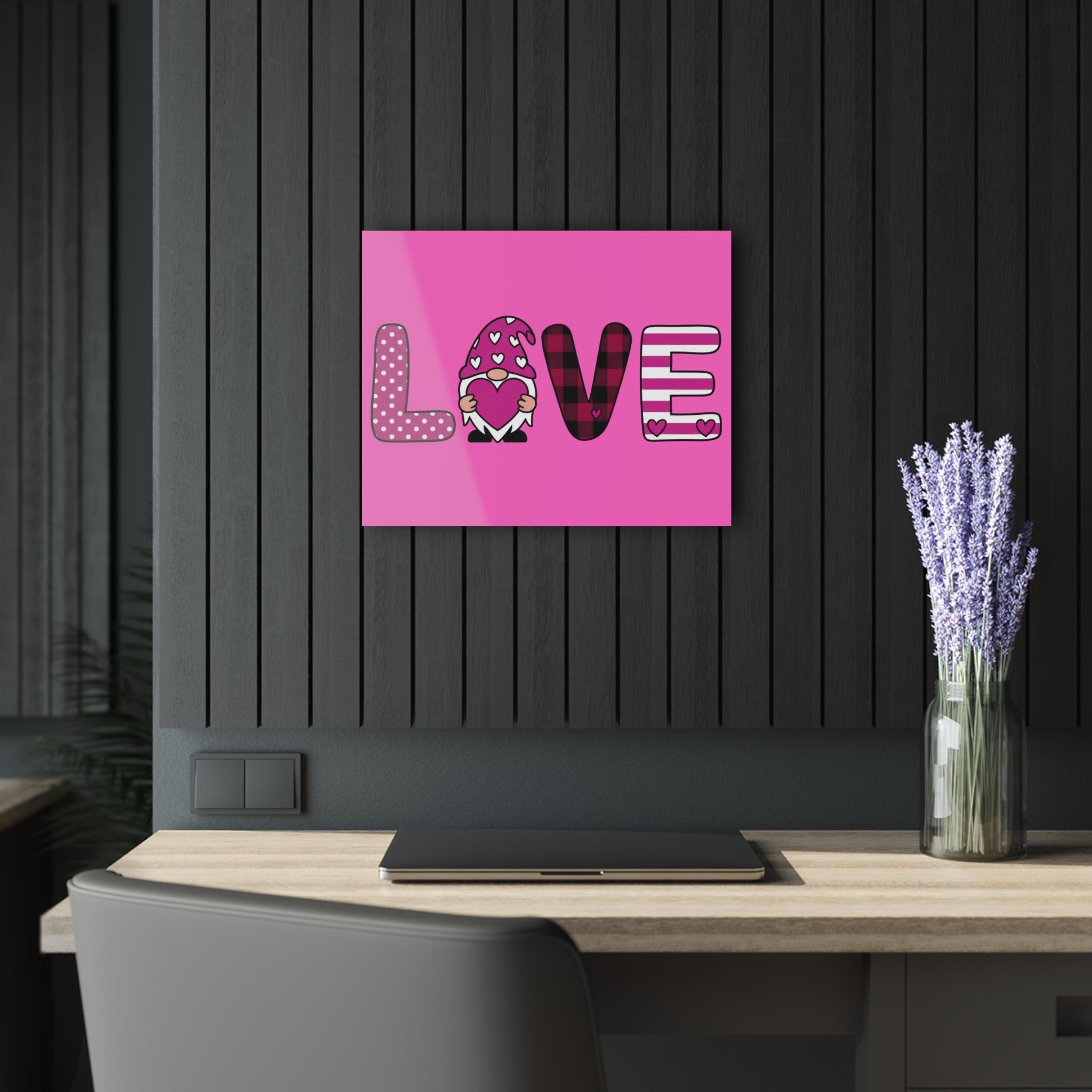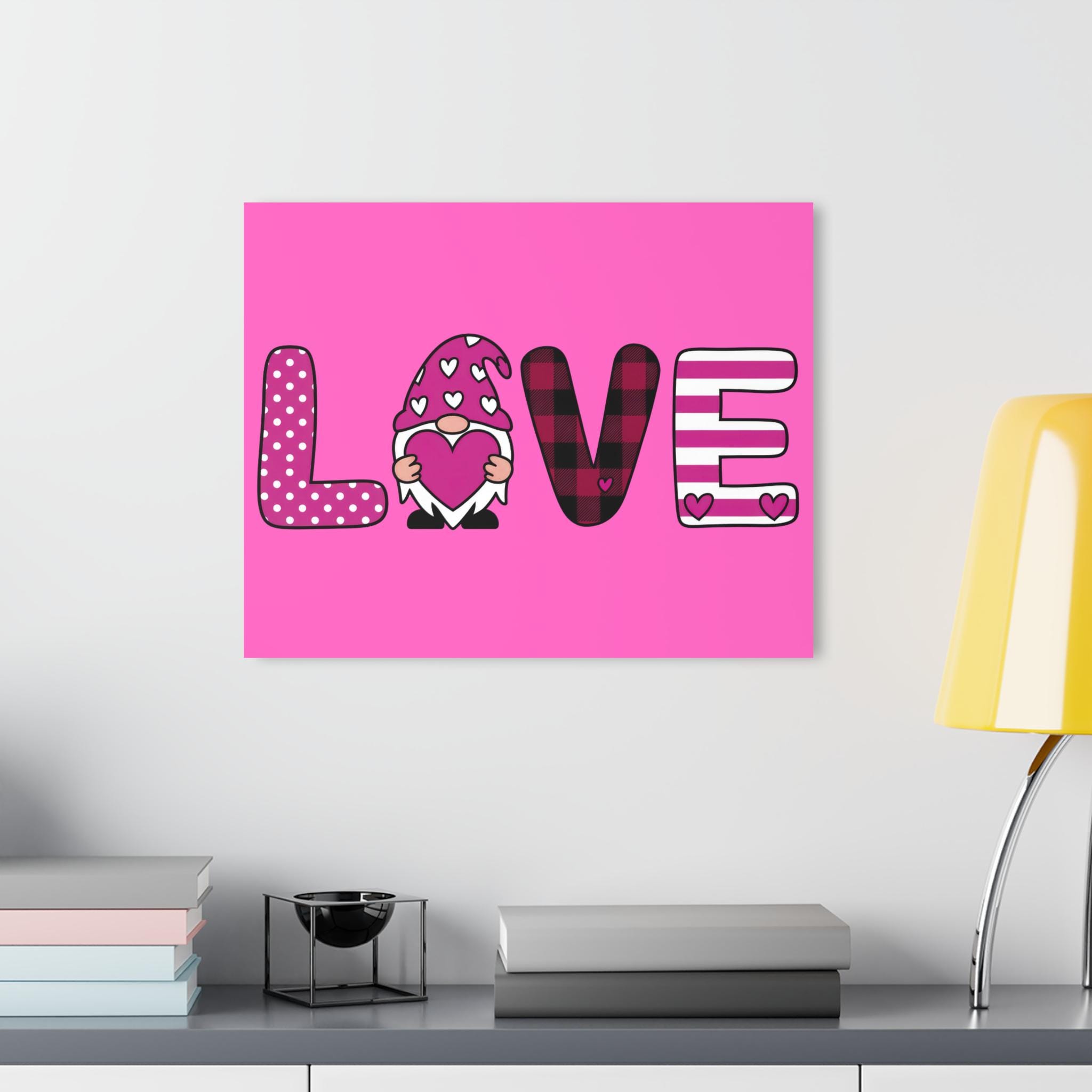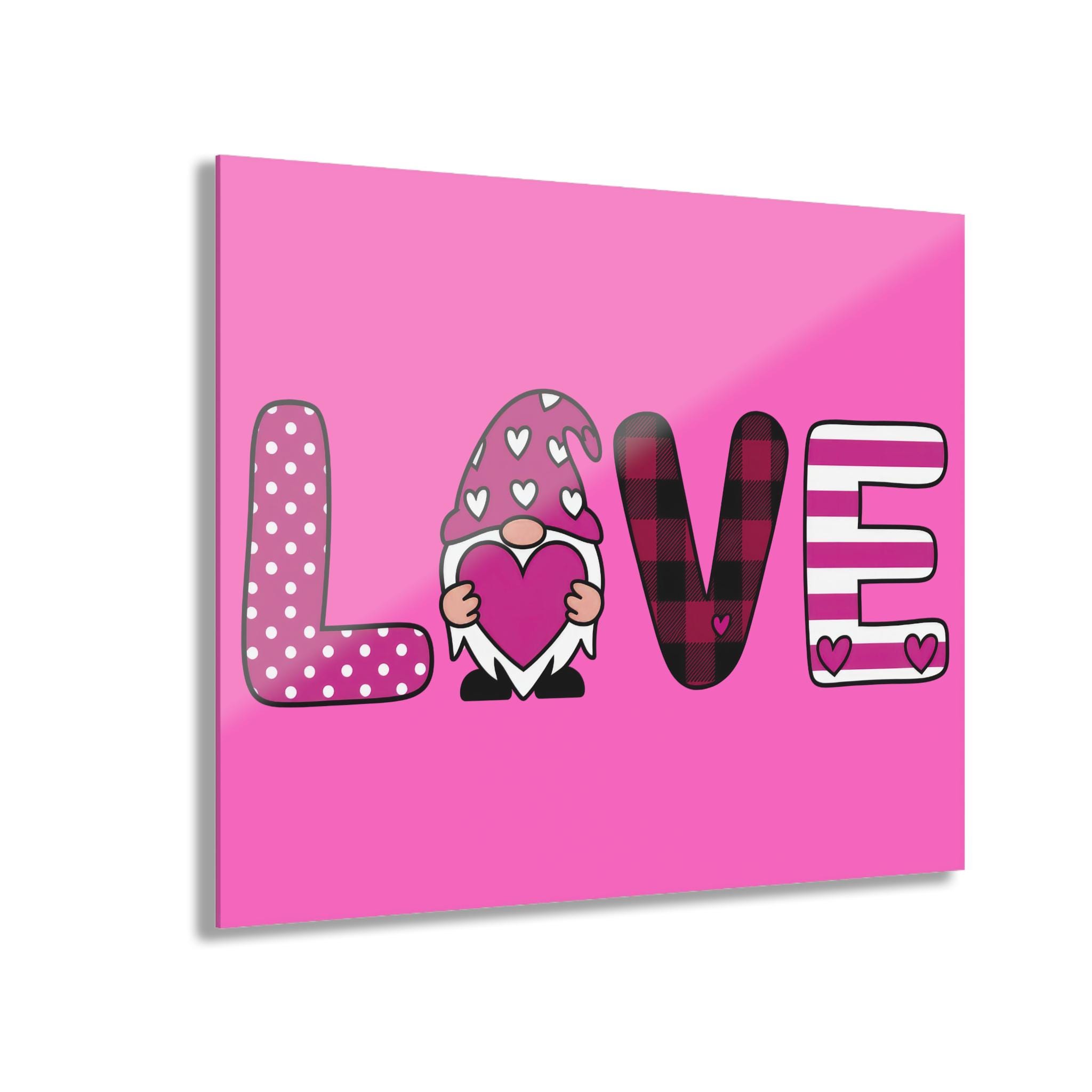 Bright, glossy acrylic print that brings playful, cozy charm to any wall. The design spells out “LOVE” in bold, patterned letters—polka dots, hearts, buffalo plaid and stripes—centered around an adorable gnome holding a heart. The clear, polished acrylic surface adds depth and a luminous finish that makes colors pop, while the white vinyl backing enhances contrast.