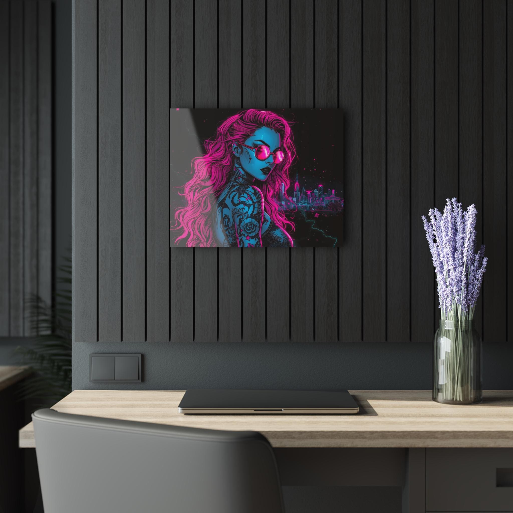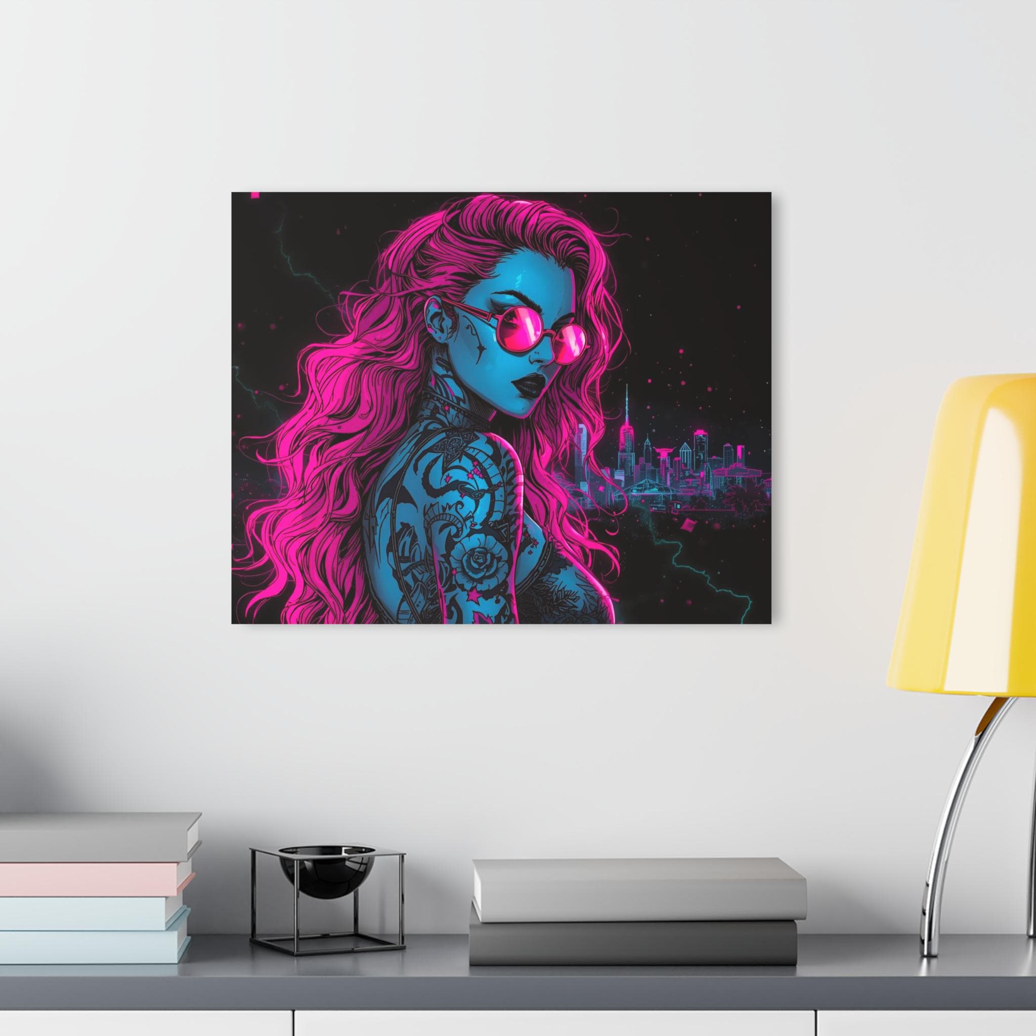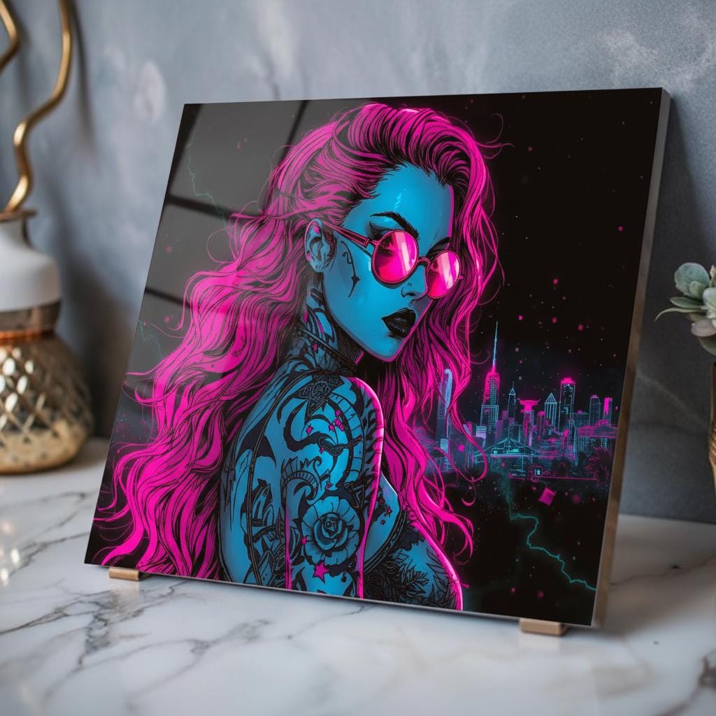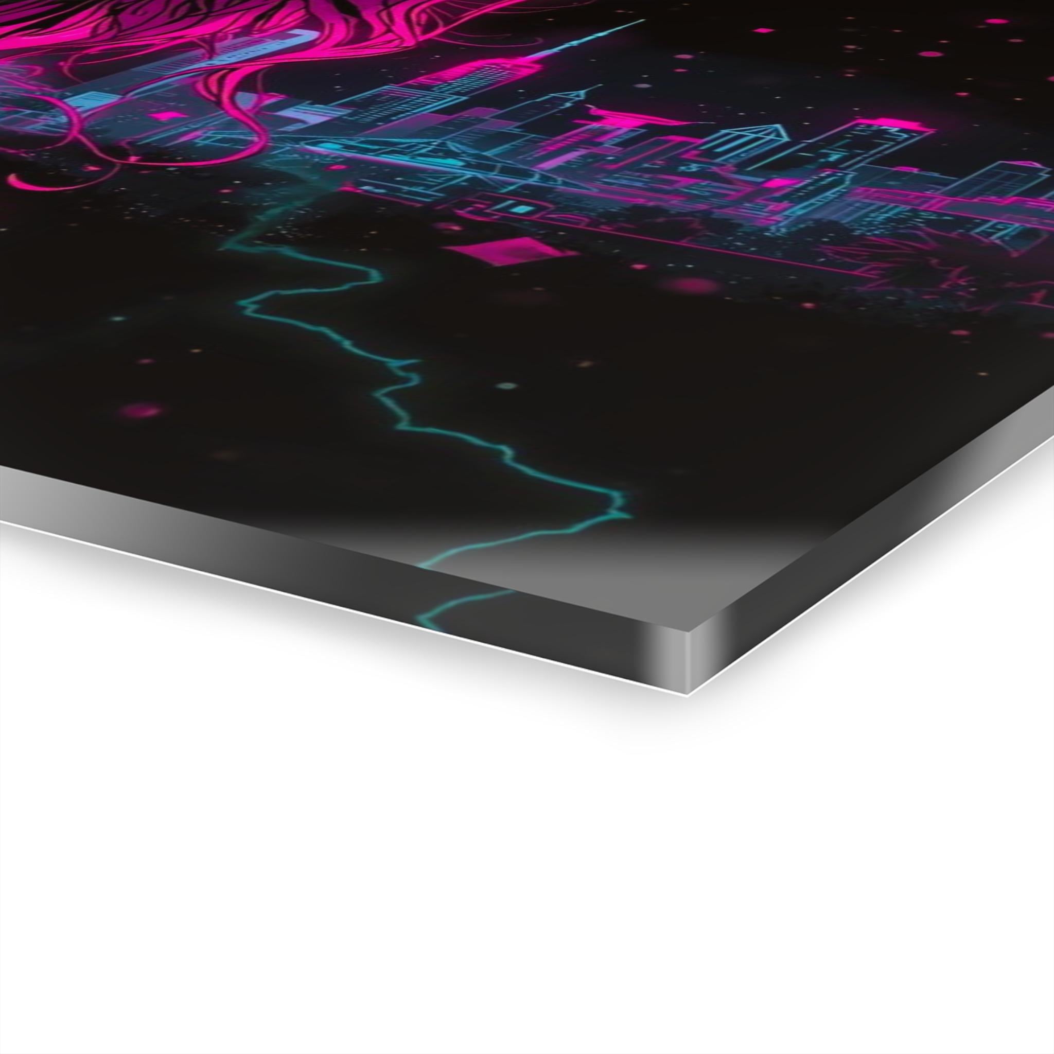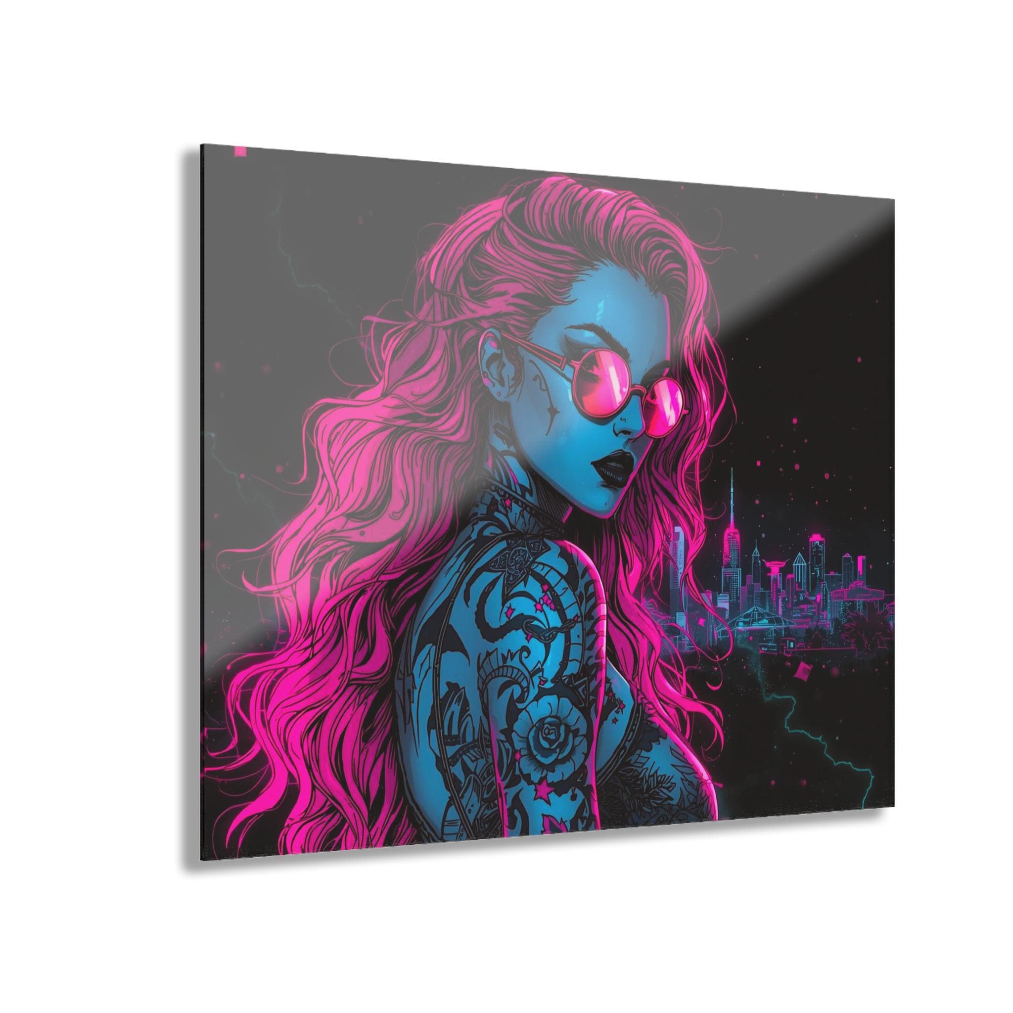 This acrylic print brings neon-noir energy into any room. Vivid archival inks fused to crystal-clear acrylic make the pinks and electric blues jump off the surface, while a matte white backing deepens contrast for a rich, gallery-quality look. The slim 0.25” acrylic with hand-polished edges reads modern and sleek on the wall. A secure French cleat system is pre-installed and includes screws and setup instructions, so the piece hangs flush and stable — no wobble, no guesswork. The water-resistant finish wipes clean, keeping the artwork bright and bold through years of display.