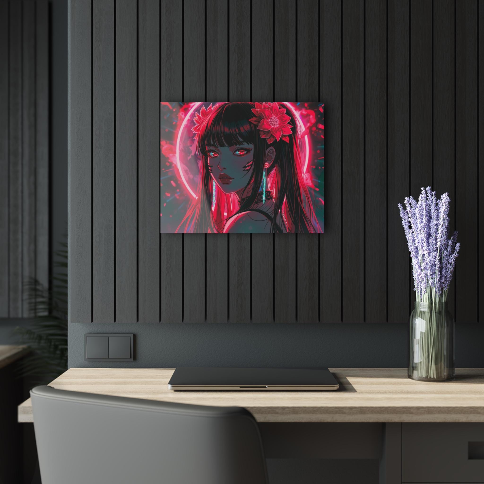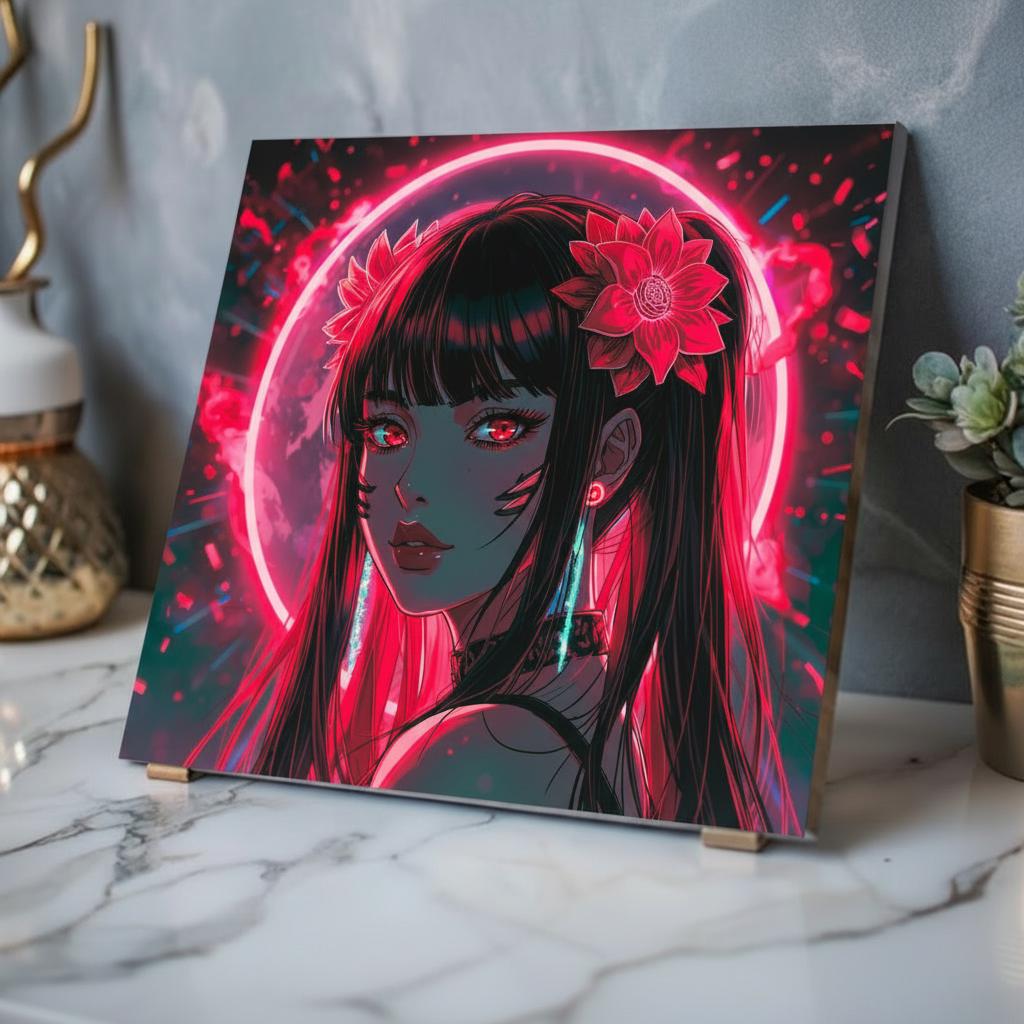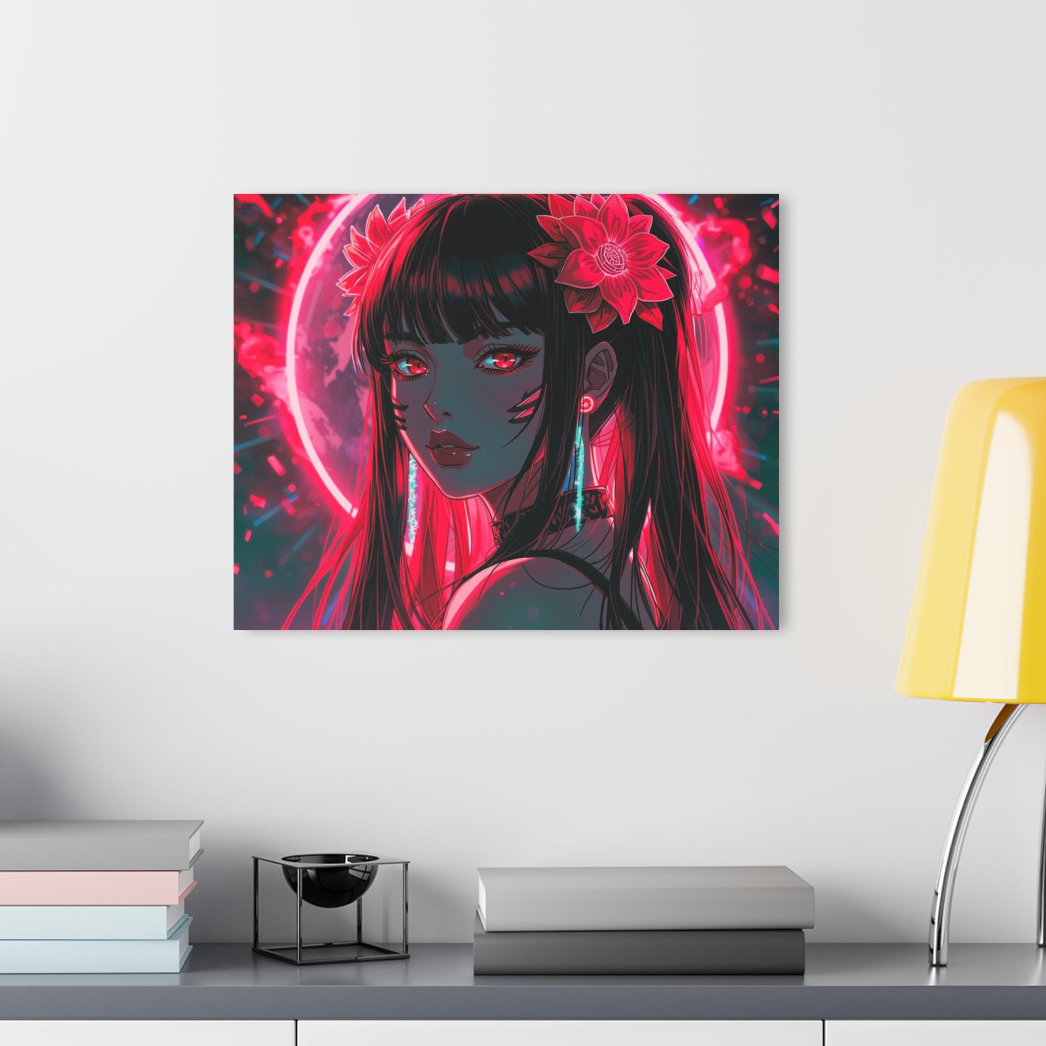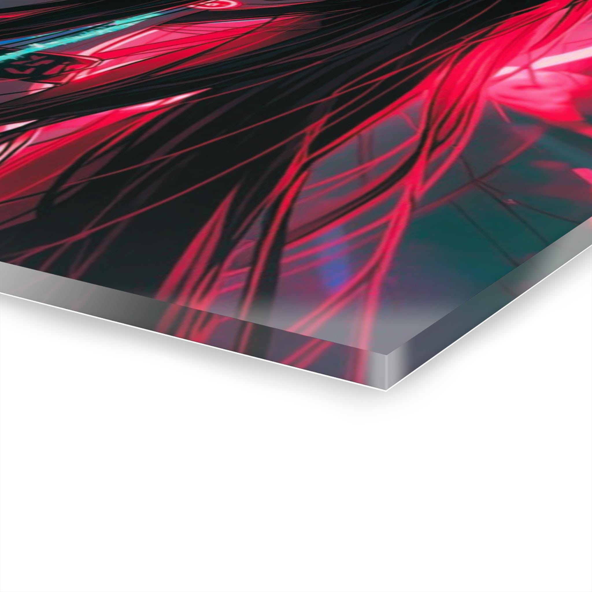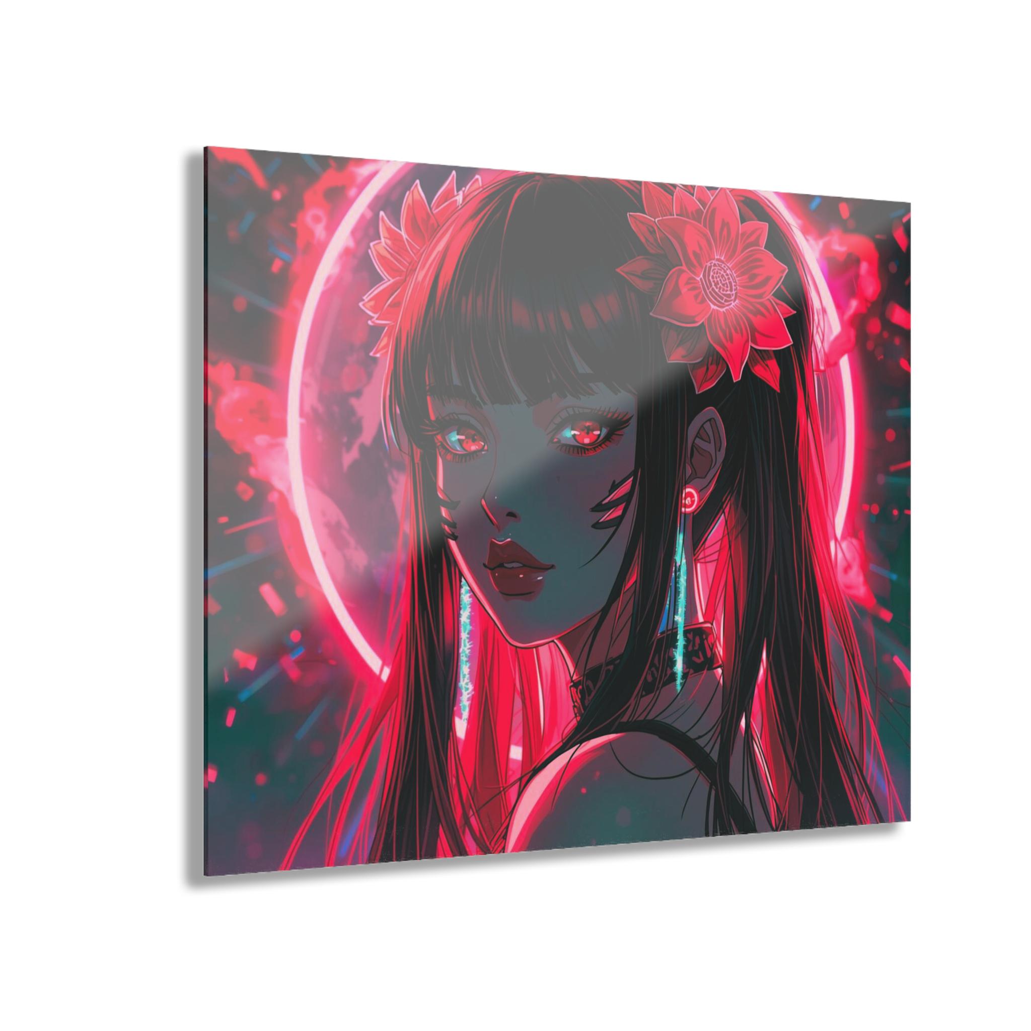 This acrylic print brings neon-drenched, anime-inspired art to your wall with gallery-quality clarity. The image is fused to 0.25” grade-A acrylic, producing vibrant colors, deep contrast, and a luminous, glass-like finish that makes the pinks and teals' pop. Hand-polished edges catch the light, while the white vinyl backing preserves color and depth. A sturdy French cleat backing and included screws make mounting straightforward and secure — instructions are provided so you can level and hang it with confidence.