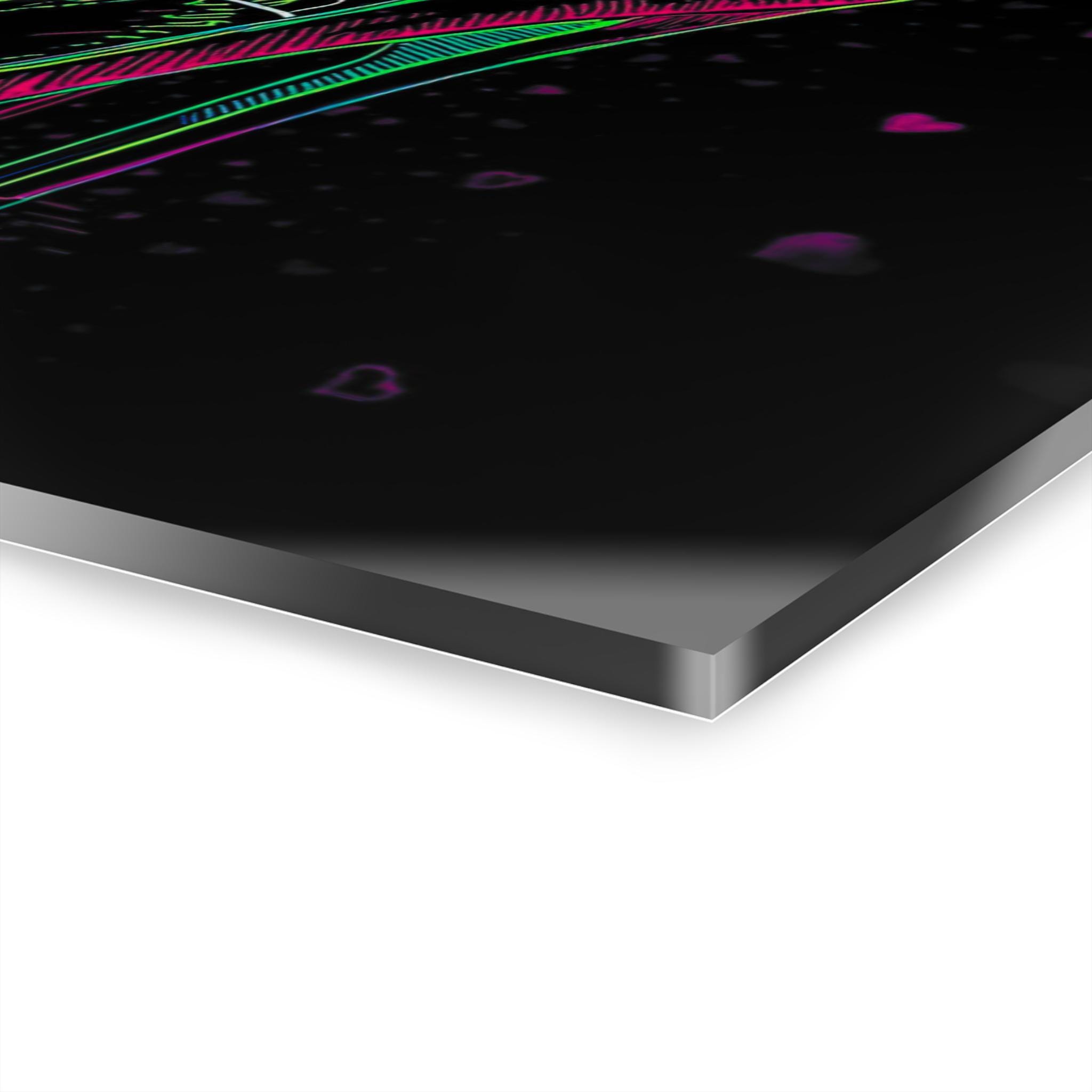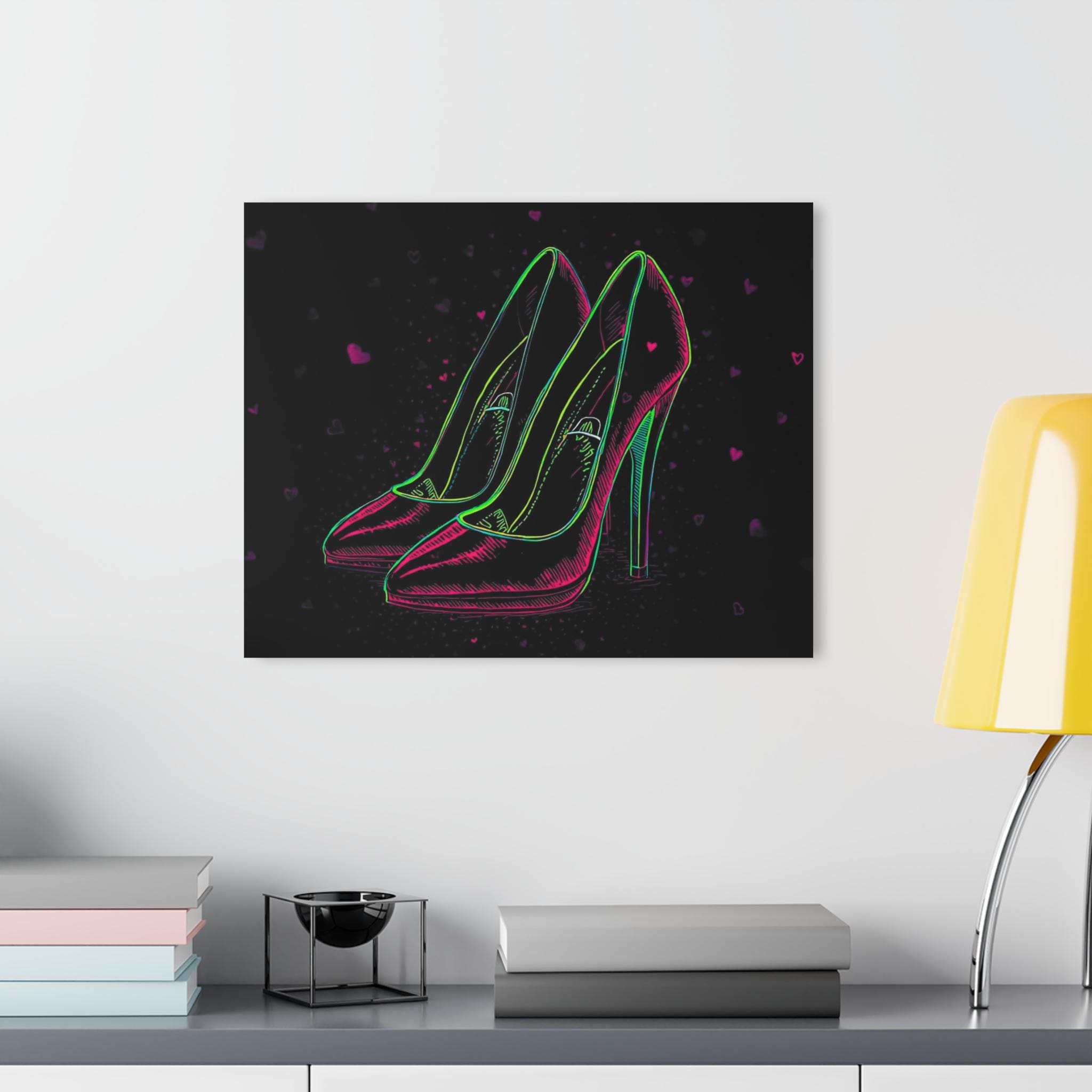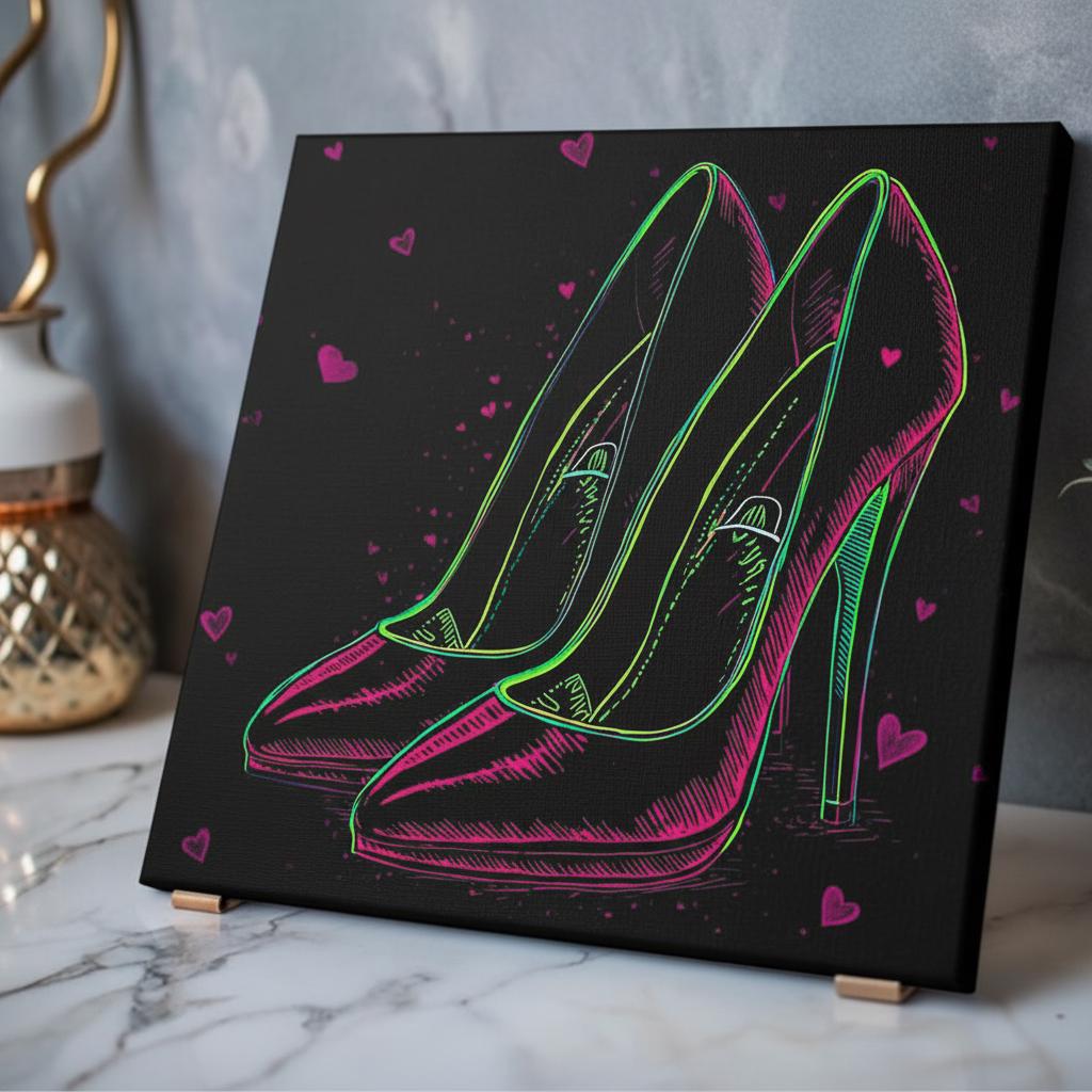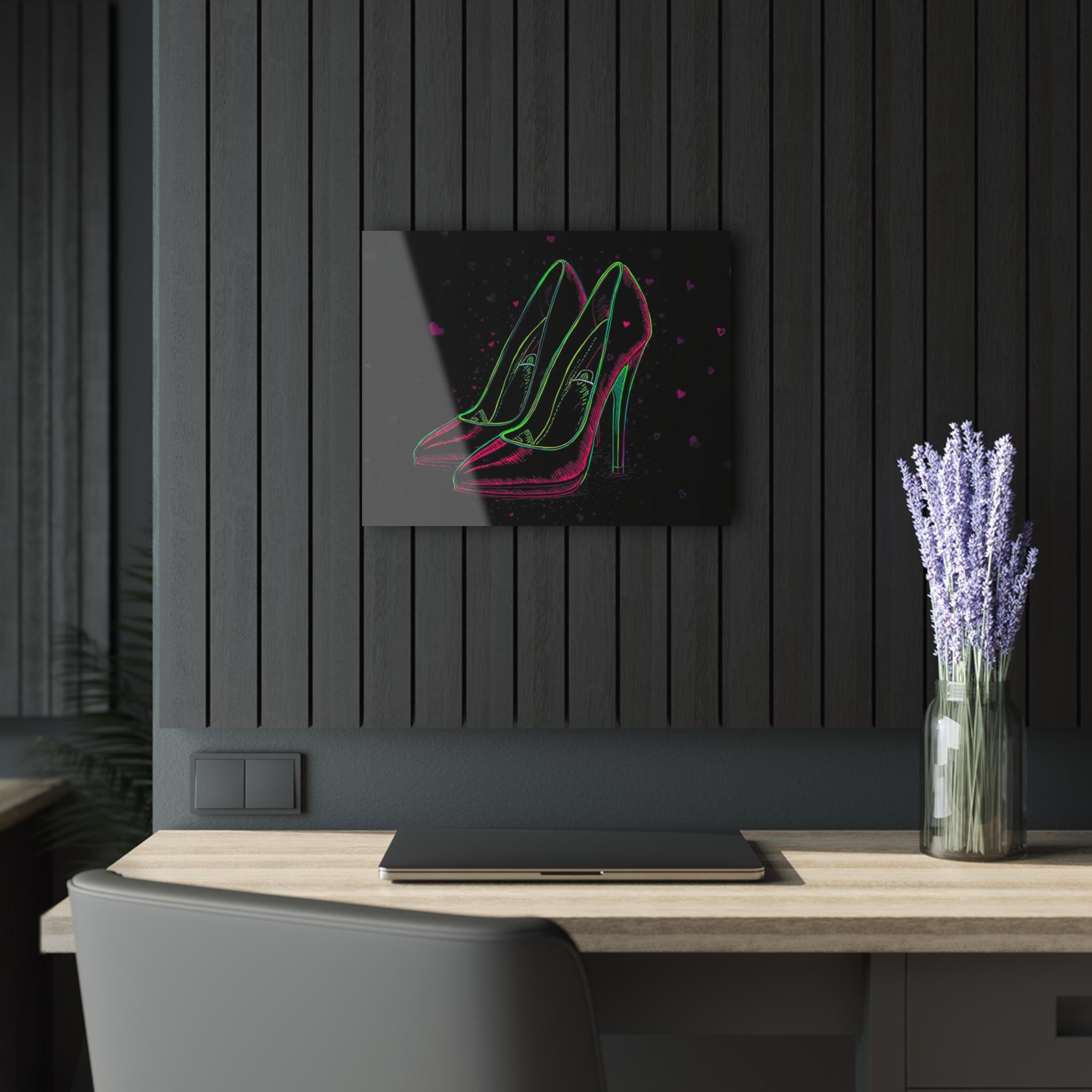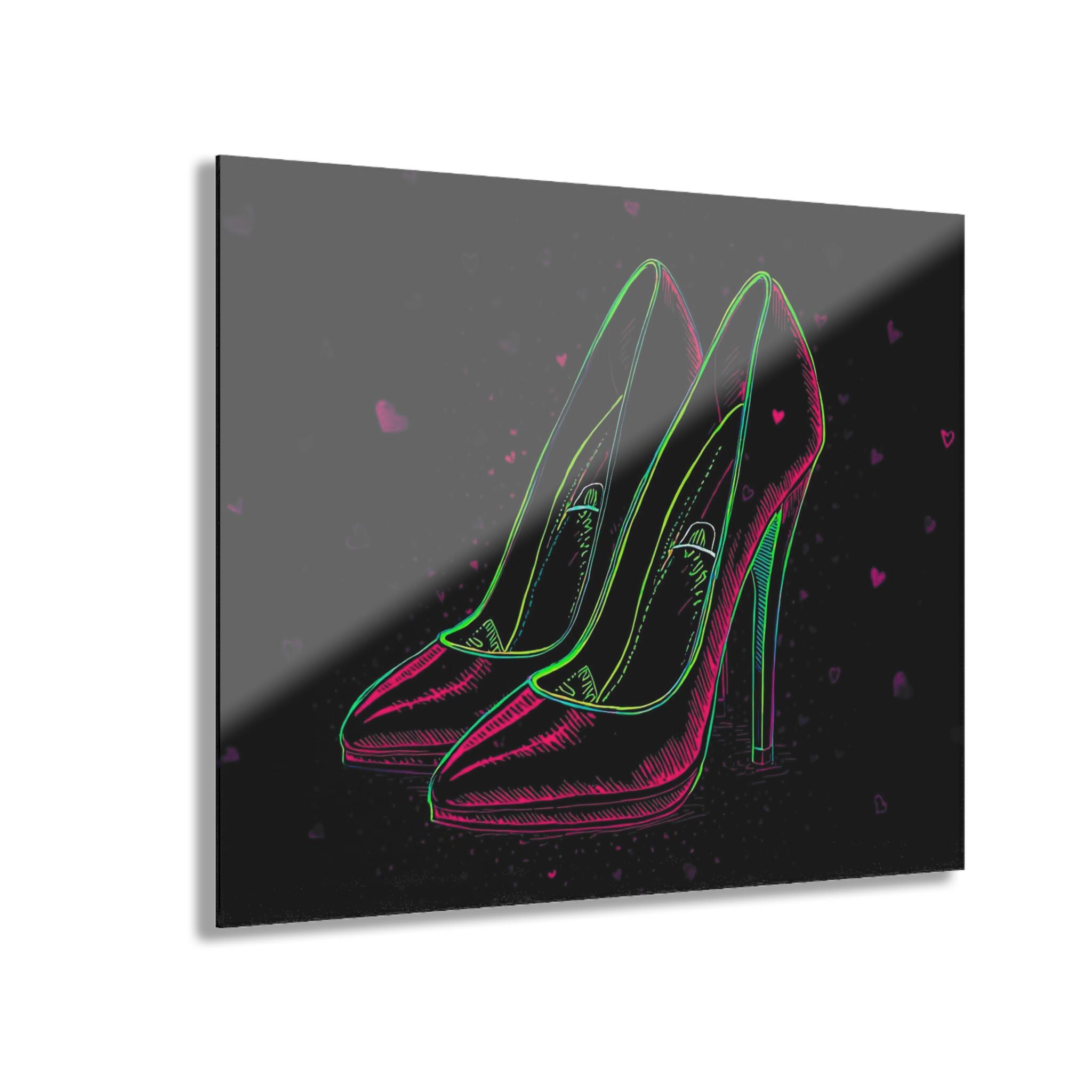 Acrylic wall art that glows with late-night glamour. This hard-edged print captures neon-outlined stilettos against a deep, shadowy backdrop — a design that reads like a secret made visible. The acrylic surface adds depth and a glass-like sheen, so colors pop and reflections dance as room light changes. Mounted on a sturdy French cleat, the piece hangs flat and secure, bringing a sleek, gallery-ready look to dressing rooms, boudoir nooks, or a fashion-forward hallway. It settles into spaces where bold color and a little attitude belong, creating an instant focal point without fuss.
