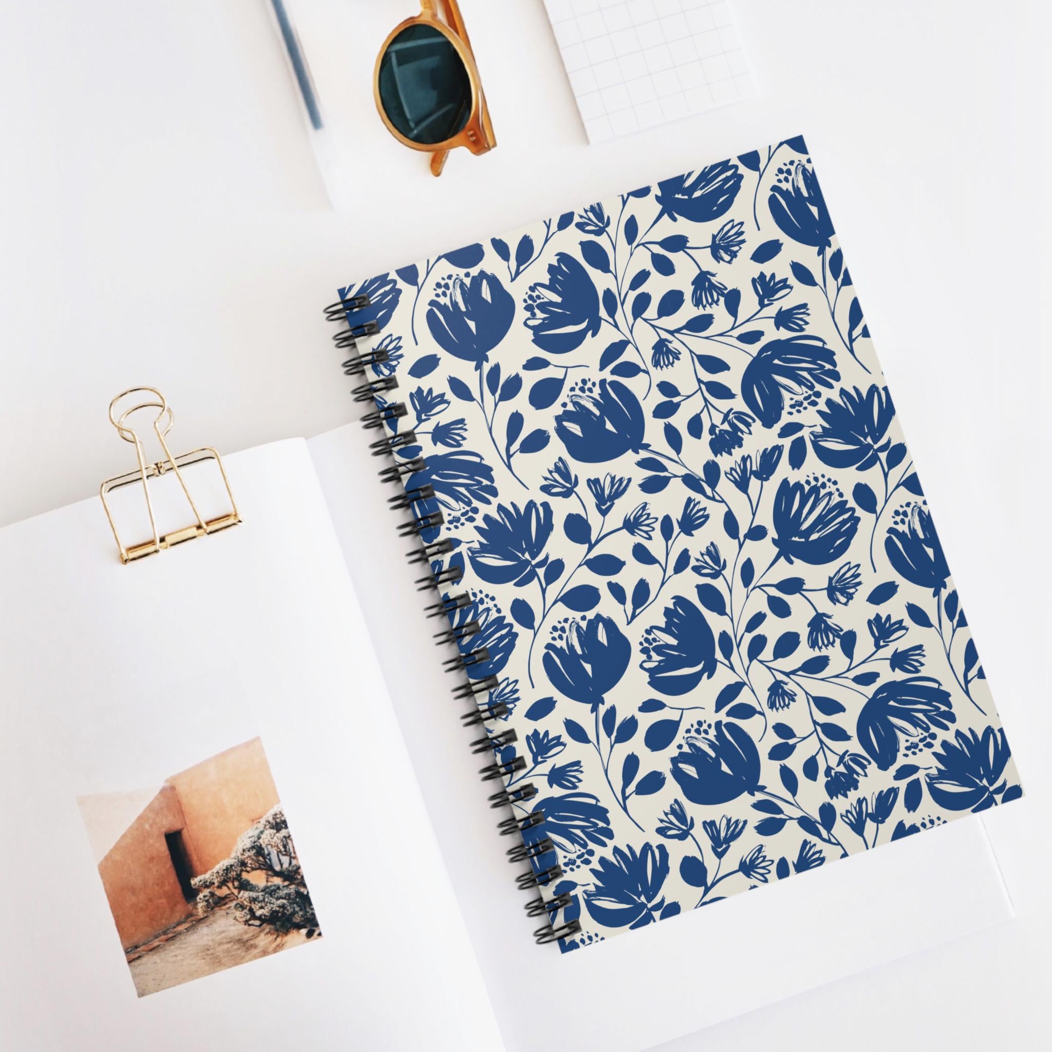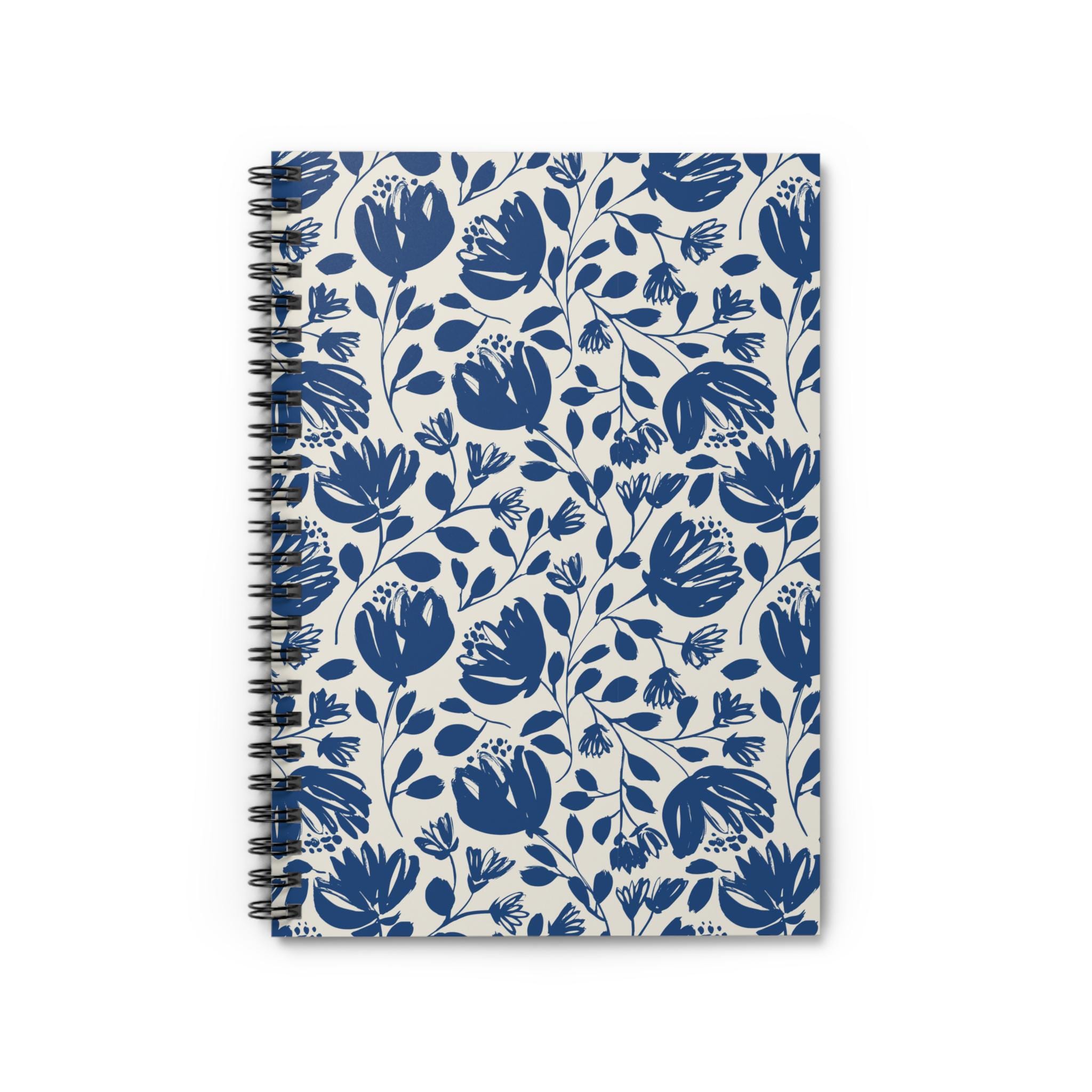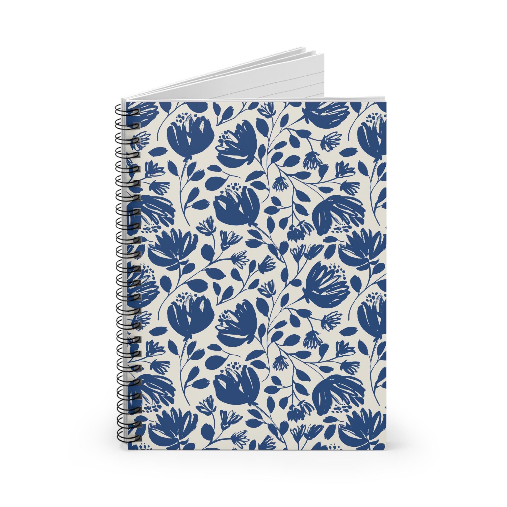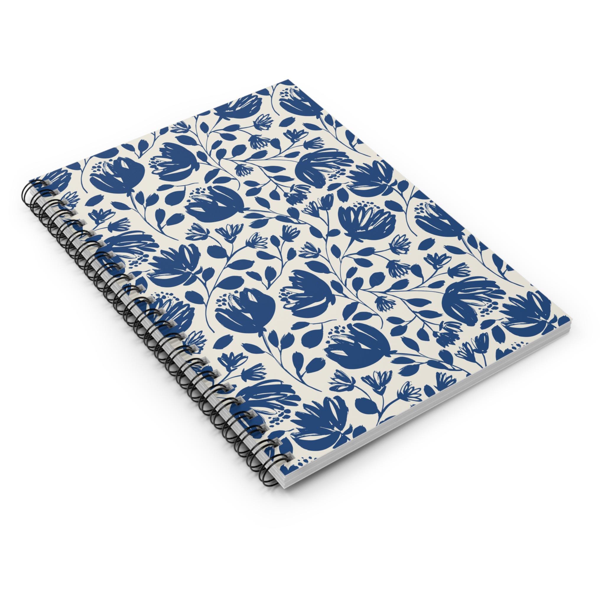This 6" x 8" spiral notebook brings a calm, hand-drawn floral look to everyday notes. The soft cream cover is patterned with flowing indigo blooms and trailing leaves, a simple motif that encourages slow, thoughtful writing. Inside, 118 ruled pages of smooth 90gsm paper receive pen lines without heavy bleed-through, while a metal spiral binding lets the book lie flat or fold back for quick sketches, lists, or journaling. A dark grey back cover and an inner document pocket keep loose papers and mementos secure. It’s the kind of notebook you keep on a kitchen table, slip into a tote for class, or reach for during a quiet evening of planning and reflection.