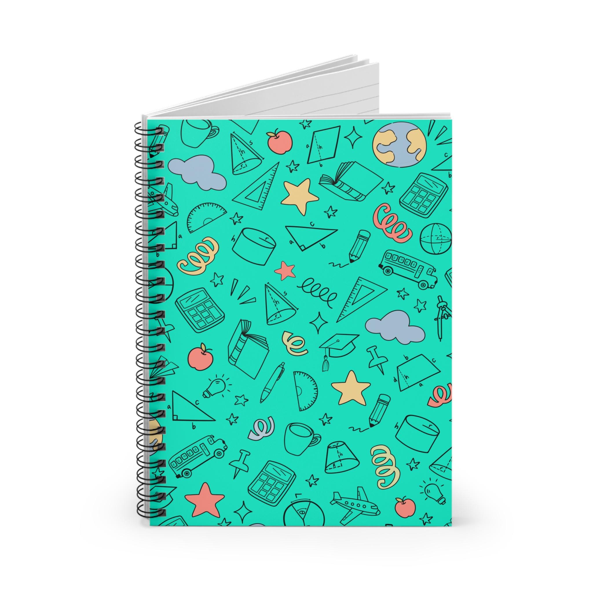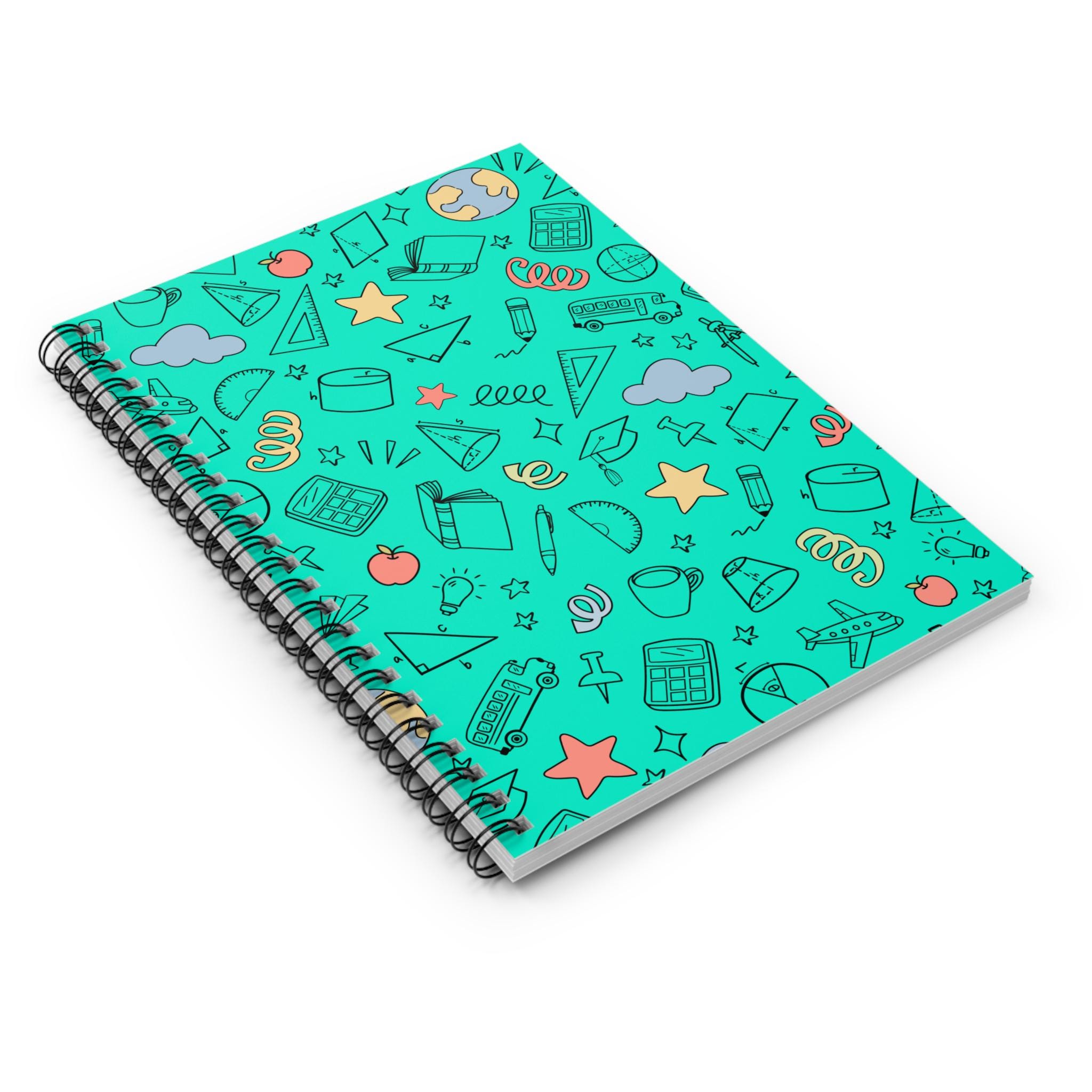 A bright, cheerful ruled spiral notebook designed to make notes, lists, and lessons feel a little more fun. The teal front cover is patterned with playful school and study icons—stars, calculators, pencils, globes, paper planes—giving it an upbeat, creative energy. Inside are 118 lined pages of smooth 90gsm paper that take pen and pencil well, while a sturdy metal spiral lets the book lie flat or fold back for comfortable writing. A dark-grey back cover and an inside document pocket keep loose papers secure. At 6" x 8" this compact notebook fits into backpacks and tote bags for class, study sessions, or everyday planning.