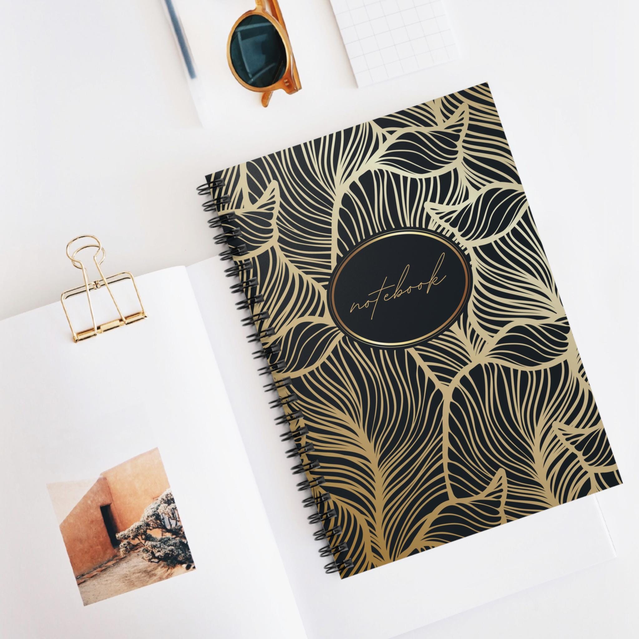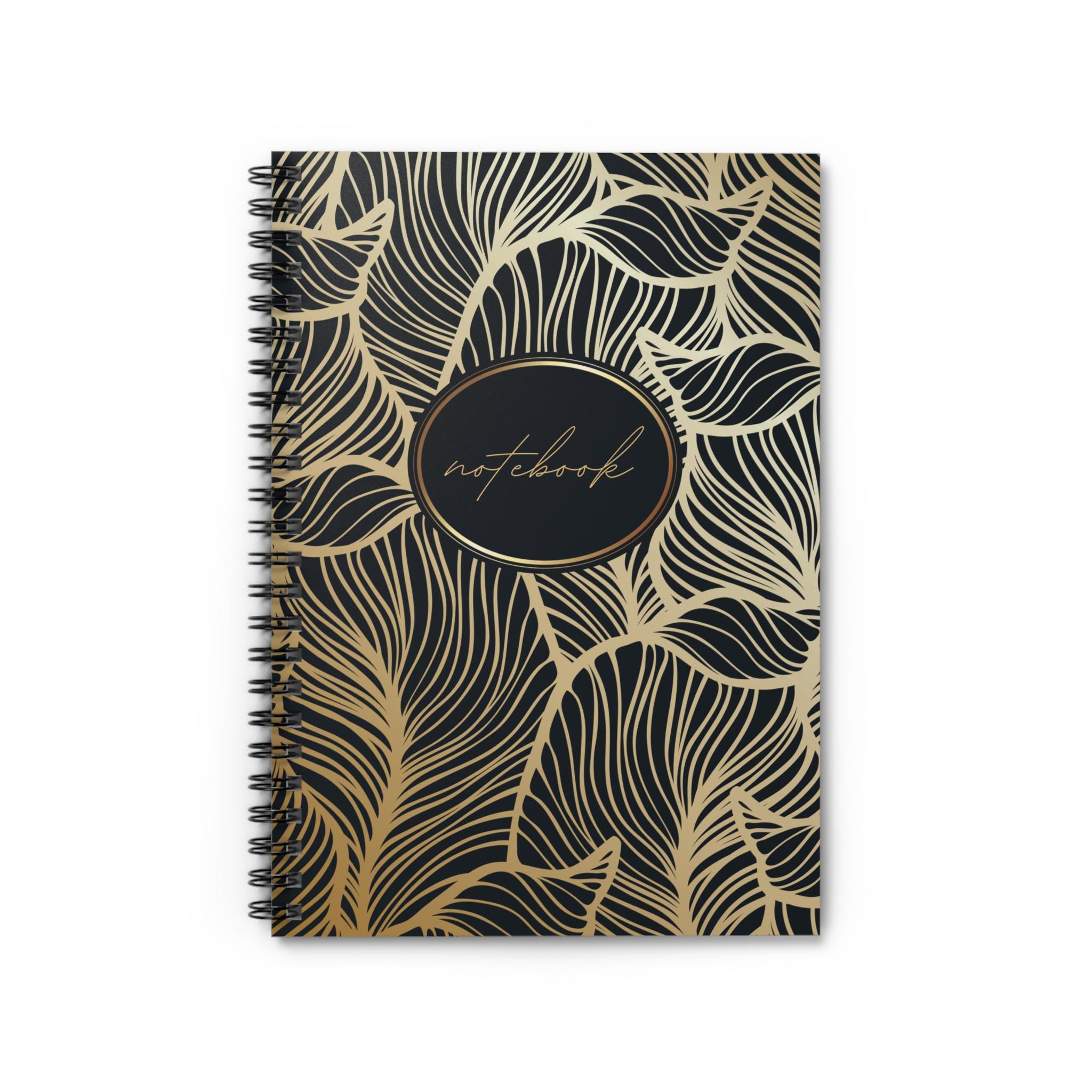 This spiral notebook blends everyday function with a touch of luxe. The 6" x 8" ruled pages give your handwriting room to breathe while the heavy printed cover — a swirling gold-on-black leaf pattern — keeps things stylish on your desk or in your bag. A sturdy metal spiral lets pages lie flat for easy note-taking and removes cleanly if you want to tear out a sheet. Inside, 118 lined pages of smooth 90gsm paper feel substantial under pen and pencil. A hidden document pocket in the inside back cover keeps receipts, sketches, or class notes neatly stashed. Carry it to lectures, meetings, or coffee-shop brainstorming sessions; it looks like a thoughtful companion and writes like one.