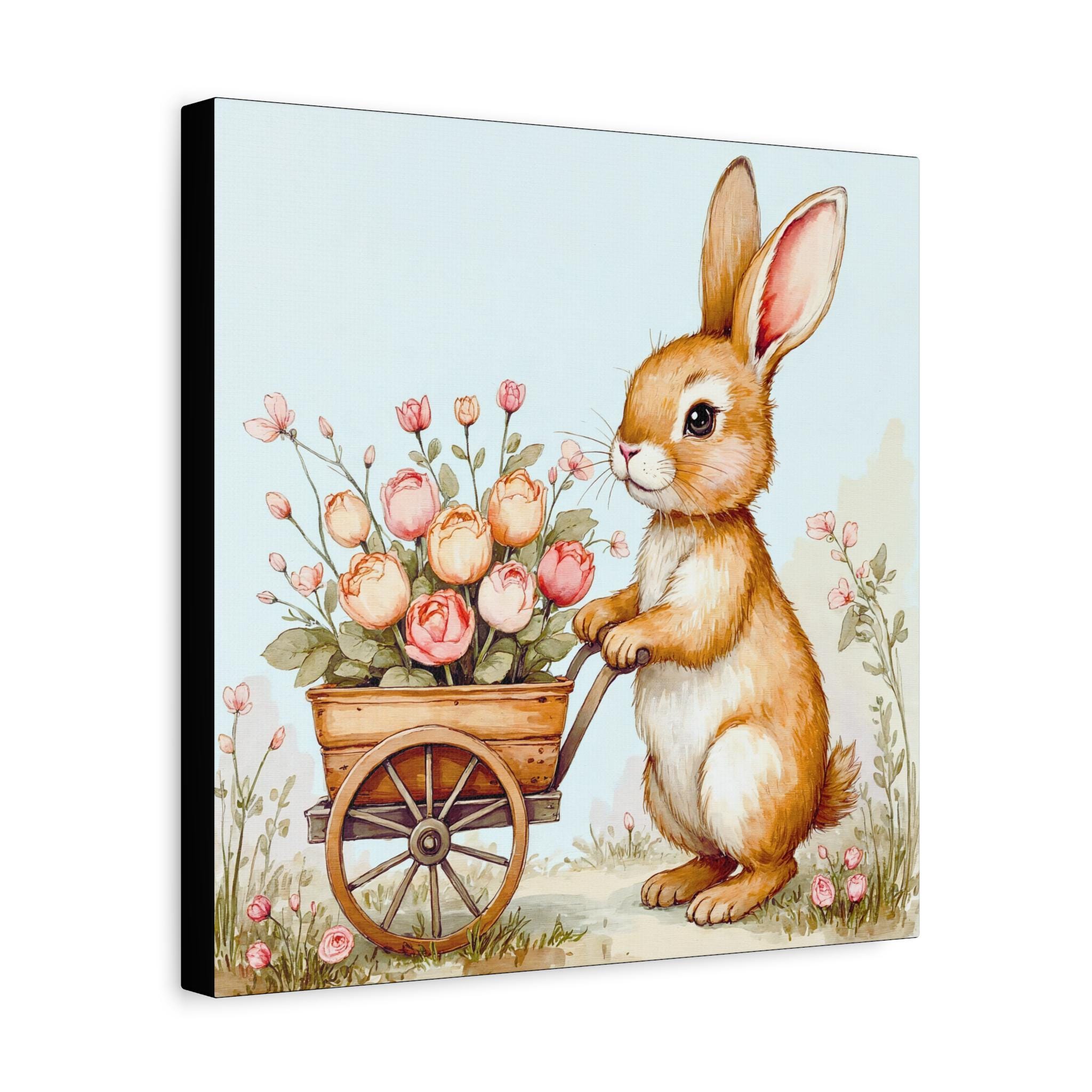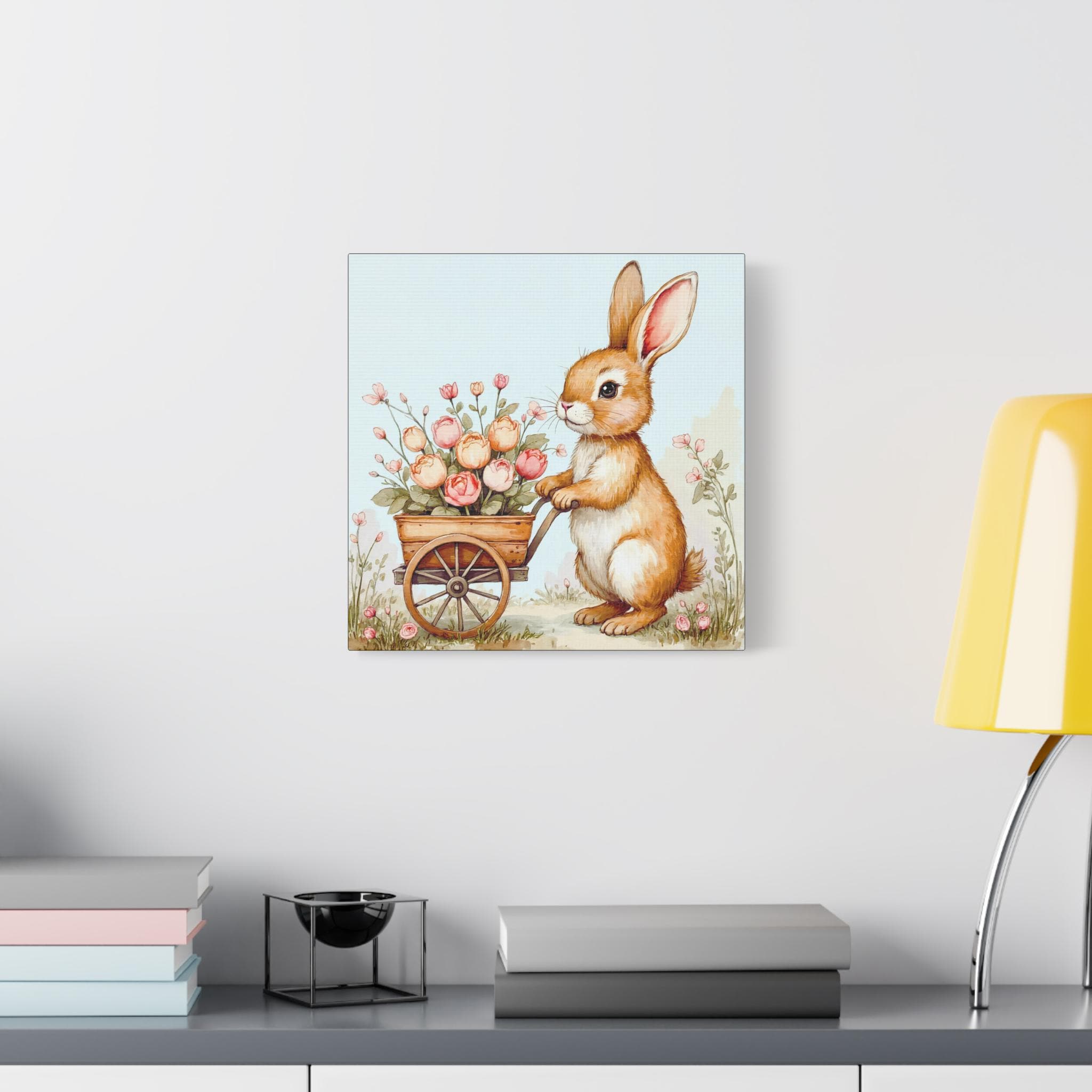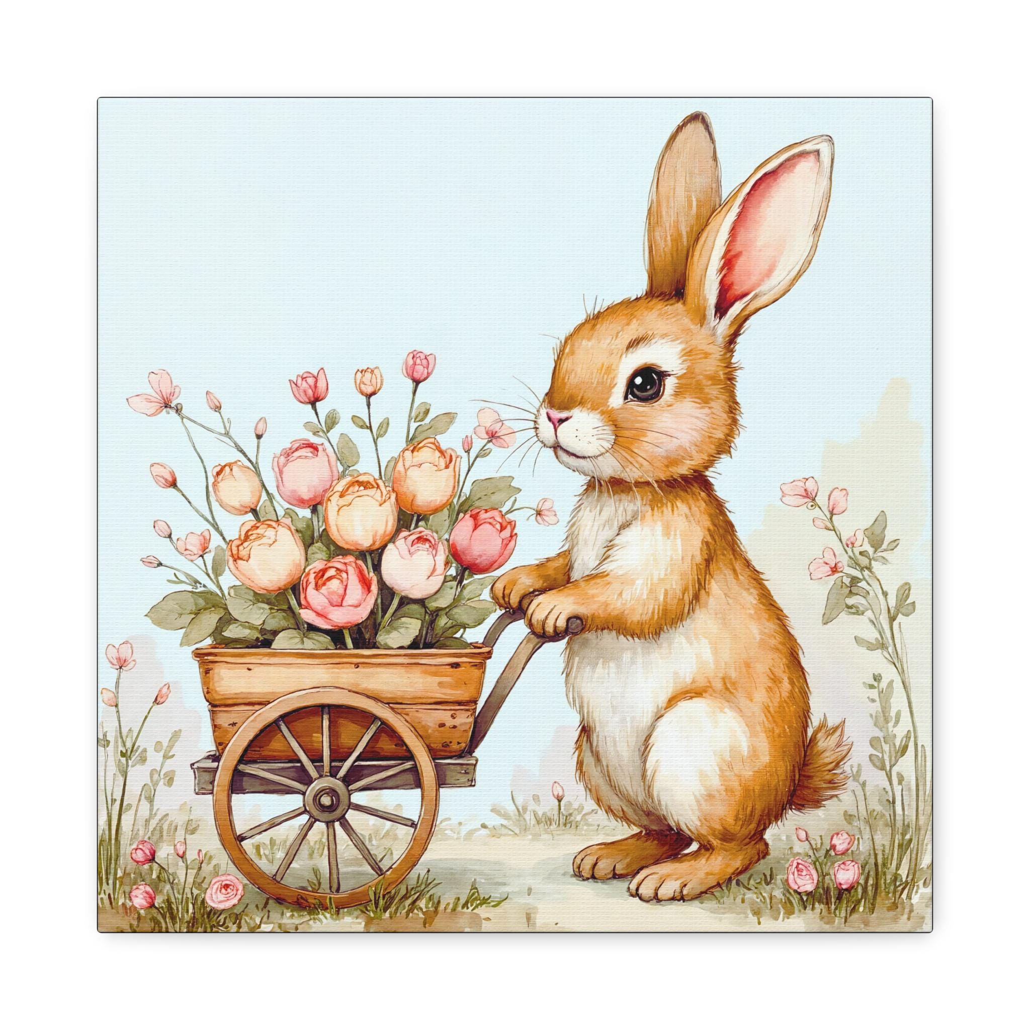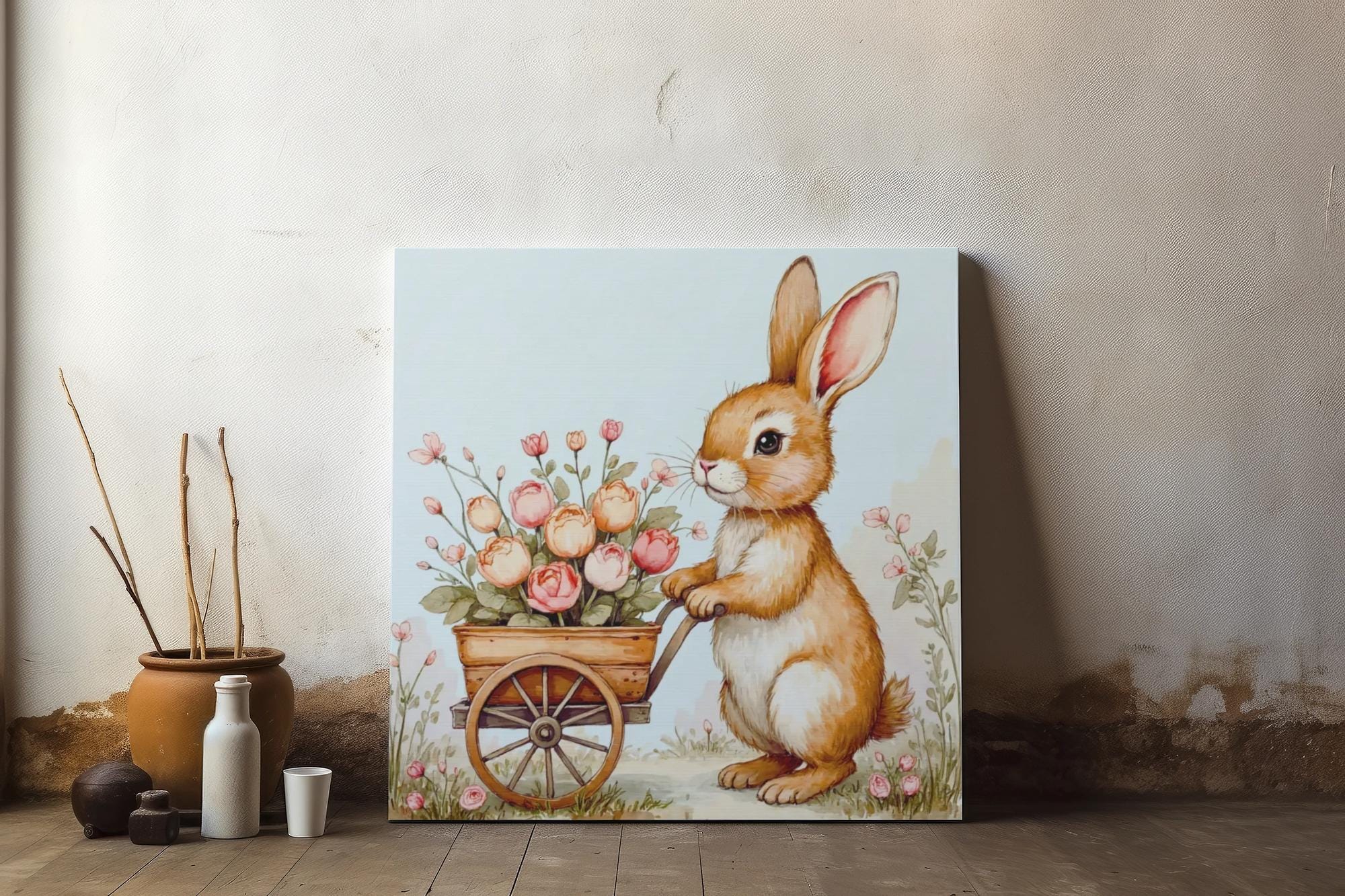 A soft, storybook moment captured on stretched matte canvas. A sweet brown bunny gently pushes a wooden wheelbarrow overflowing with blush tulips and sprays of meadow flowers. The muted sky-blue background and watercolor-style details create a calm, tender scene that feels like a quiet morning in a cottage garden. Hung above a crib, tucked into a nursery corner, or placed on a gallery wall with other nature-themed pieces, this canvas brings a feeling of gentle wonder and childhood warmth to the room. The museum-style stretch and subtle texture let the painted brushstrokes and delicate linework breathe, adding handcrafted charm without overpowering a soft, neutral palette.