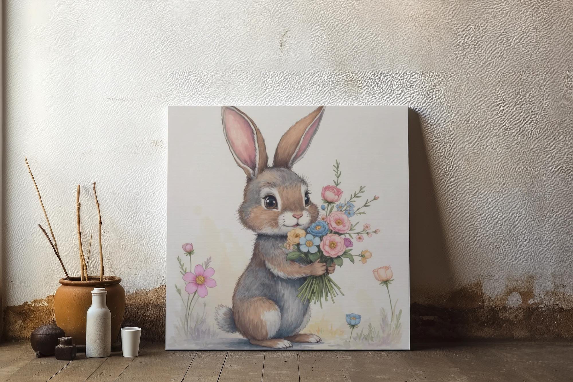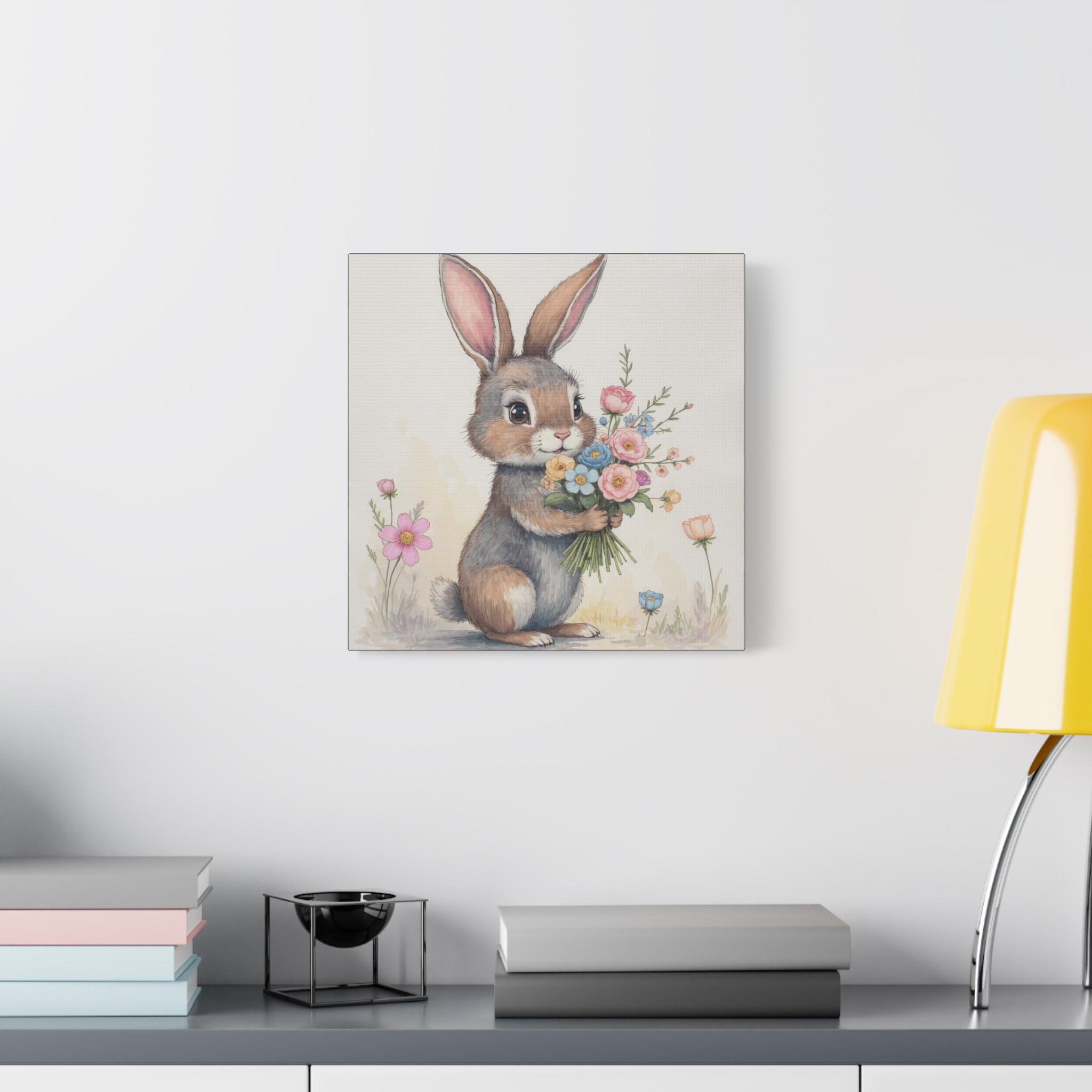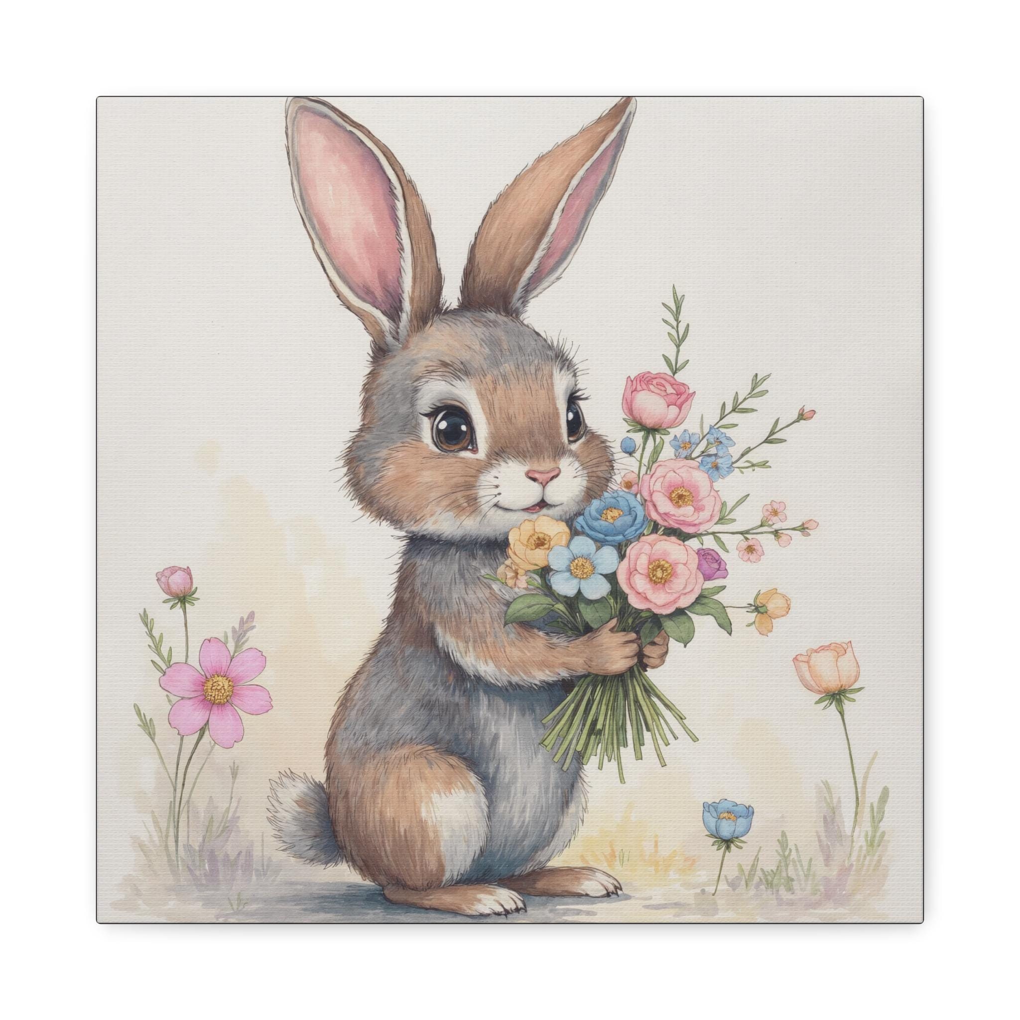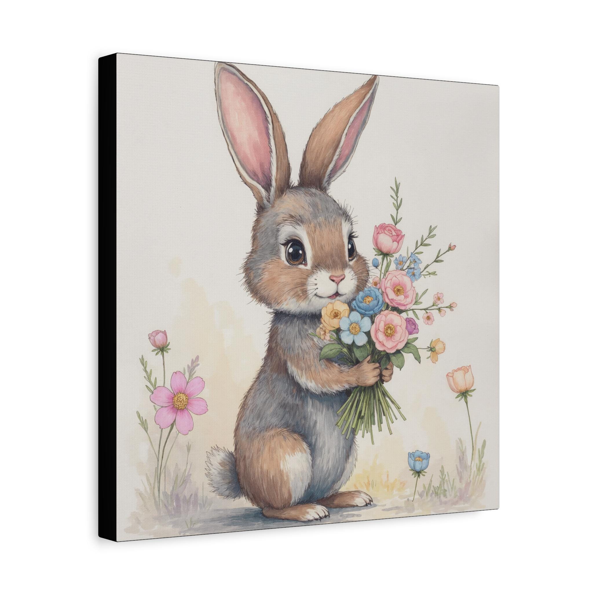 Bring a soft, storybook moment into a nursery or cozy corner with this matte stretched canvas. The hand-painted bunny holds a wildflower bouquet, rendered in gentle pastels and delicate brushwork that feels like a memory of spring mornings. Mounted on a slim 1.25" pine frame, the print reads like a little scene—quiet, warm, and full of small details to discover: soft fur strokes, tiny blossoms, and a muted backdrop that lets the illustration breathe. It hangs easily and sits flush to the wall, adding an understated, whimsical touch to baby rooms, play spaces, or anywhere you want a calm, tender accent.