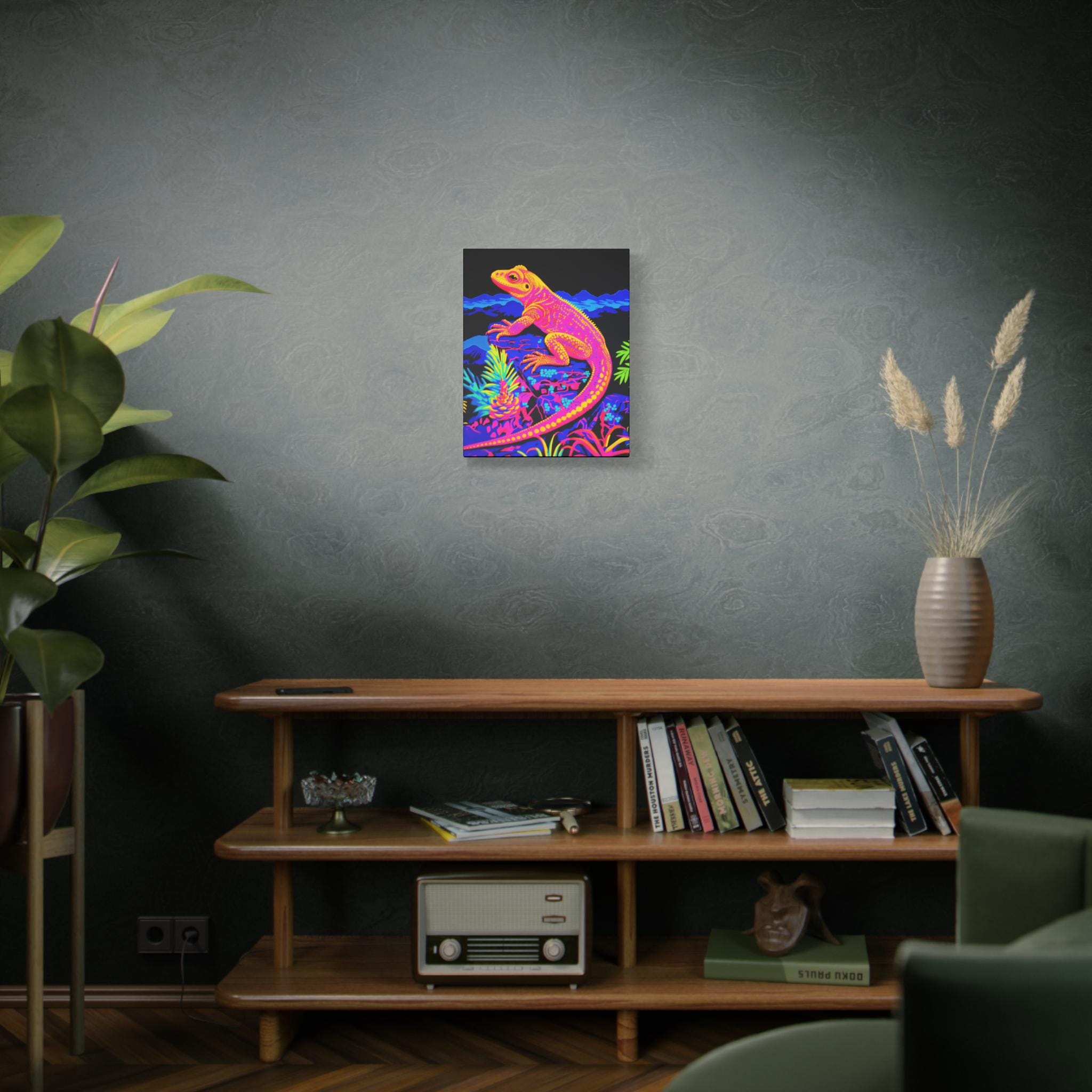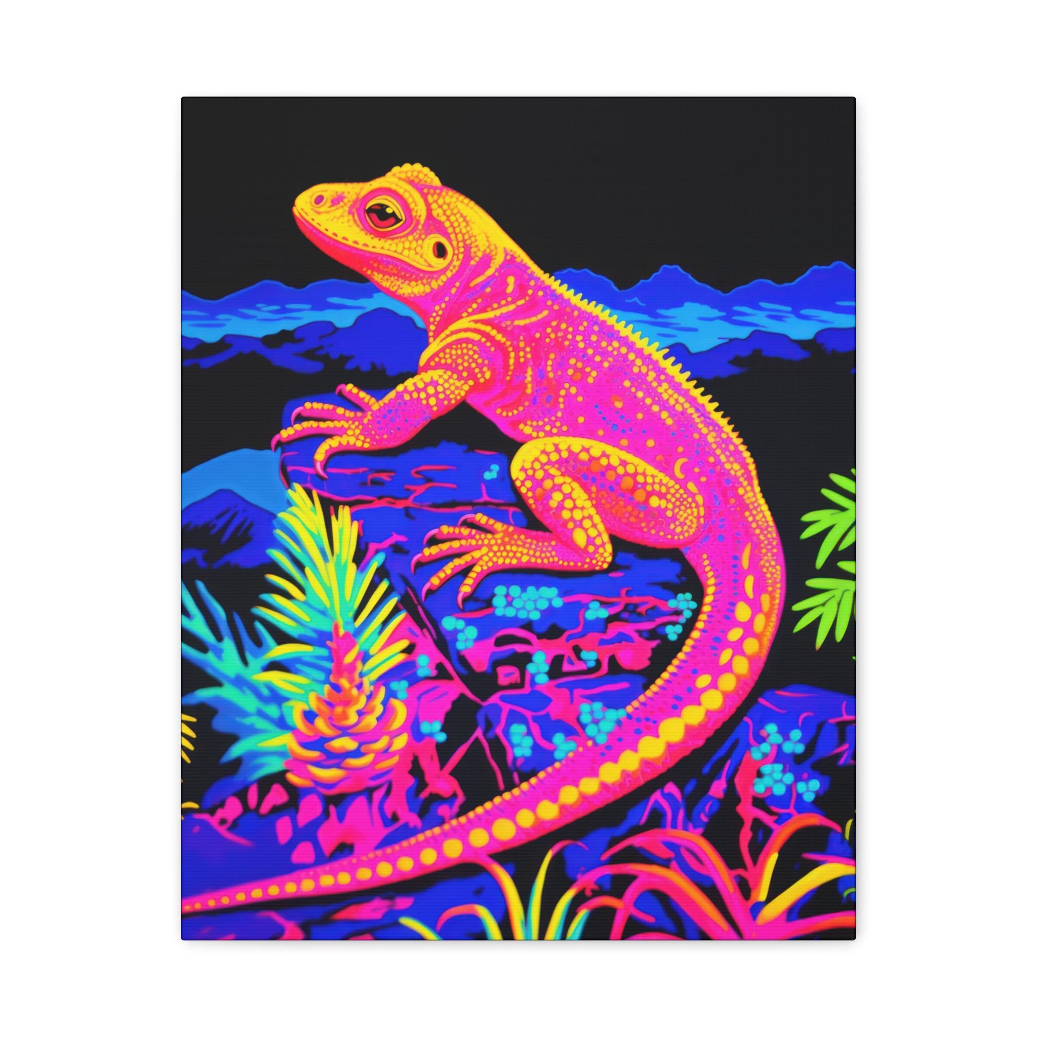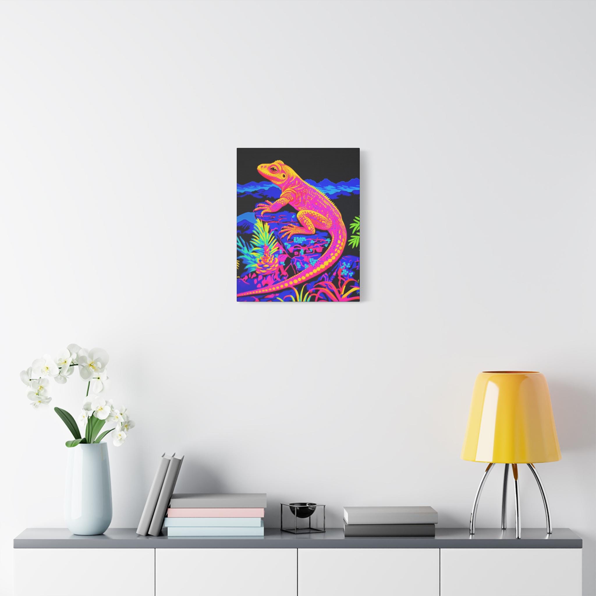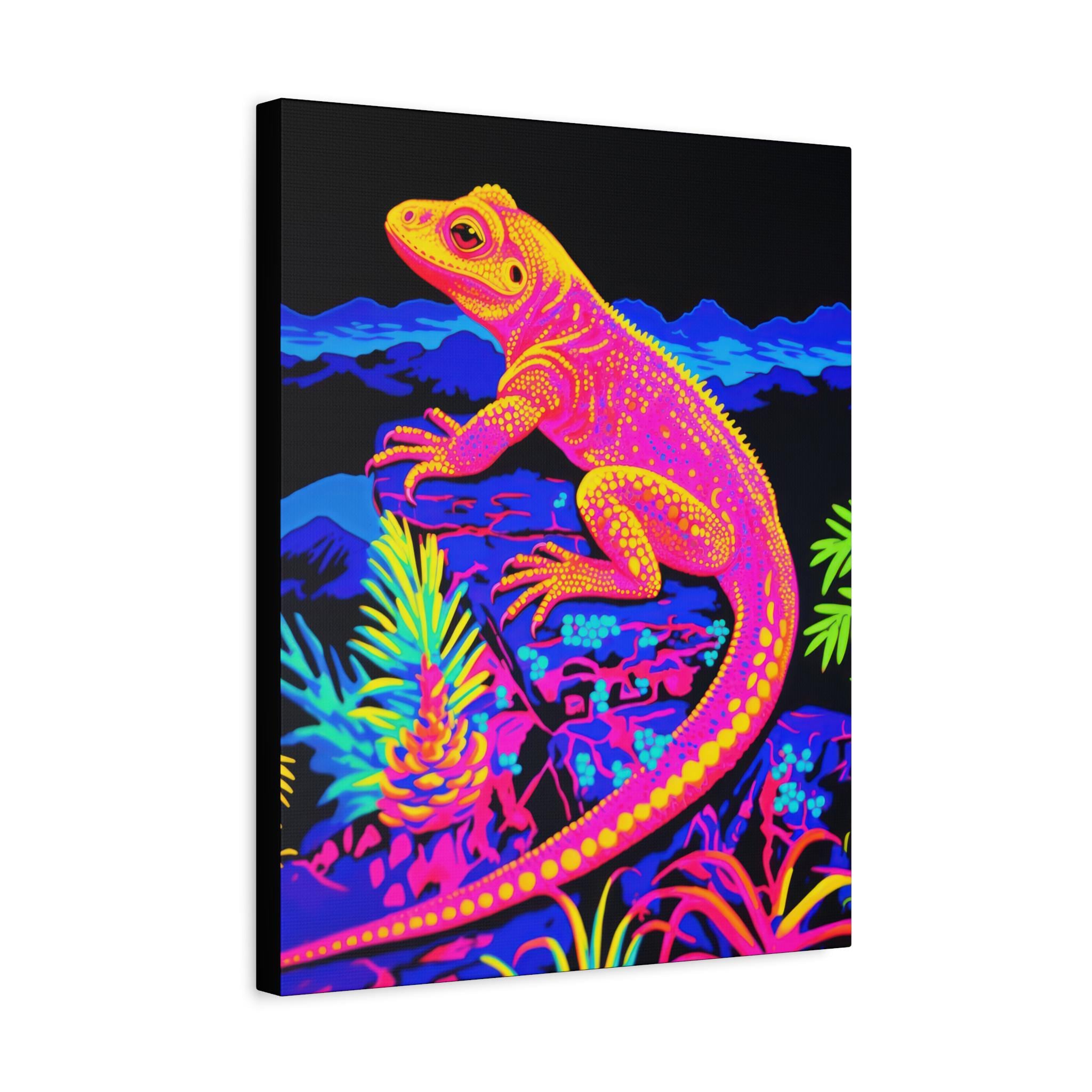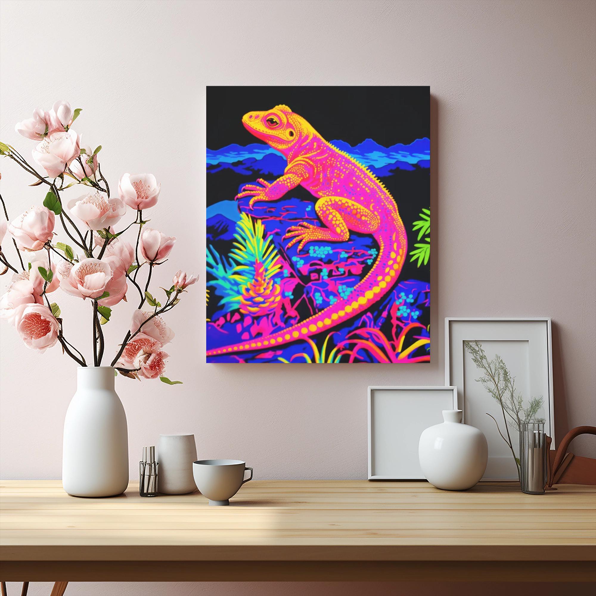 Vivid neon life on stretched matte canvas — this gallery-quality print brings a bold, tropical lizard scene into your space with intense, saturated colors and a deep, velvety matte finish. The artwork’s electric pinks, blues, and greens pop against a rich black background, creating a modern, vibe-driven focal point that feels equal parts retro and contemporary. Lightweight yet sturdy, the canvas is stretched over a pine inner frame and arrives ready to hang; subtle rubber feet protect your wall and keep the piece aligned. It’s the kind of bold piece that transforms a studio, game room, or creative nook into a place you want to linger and get inspired.