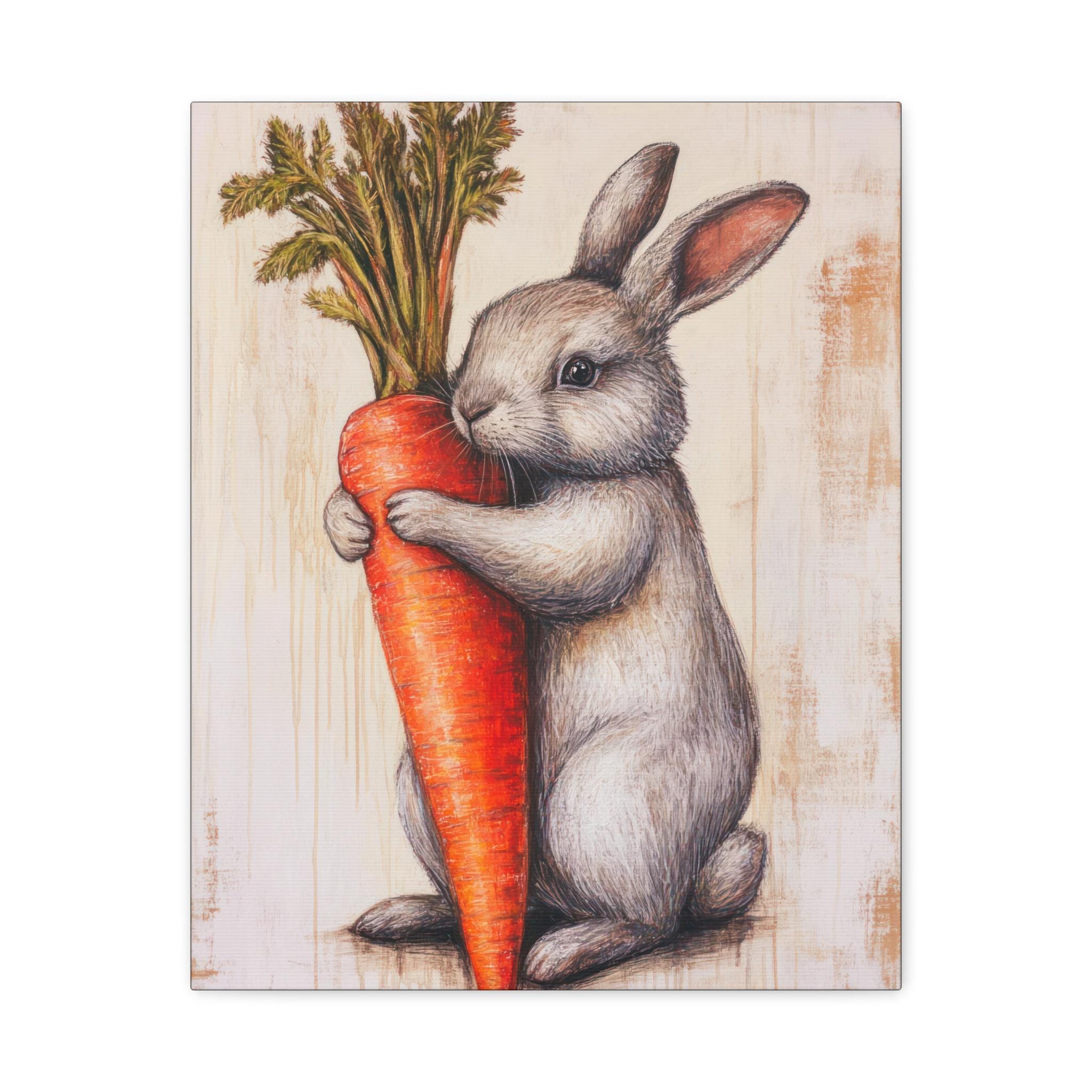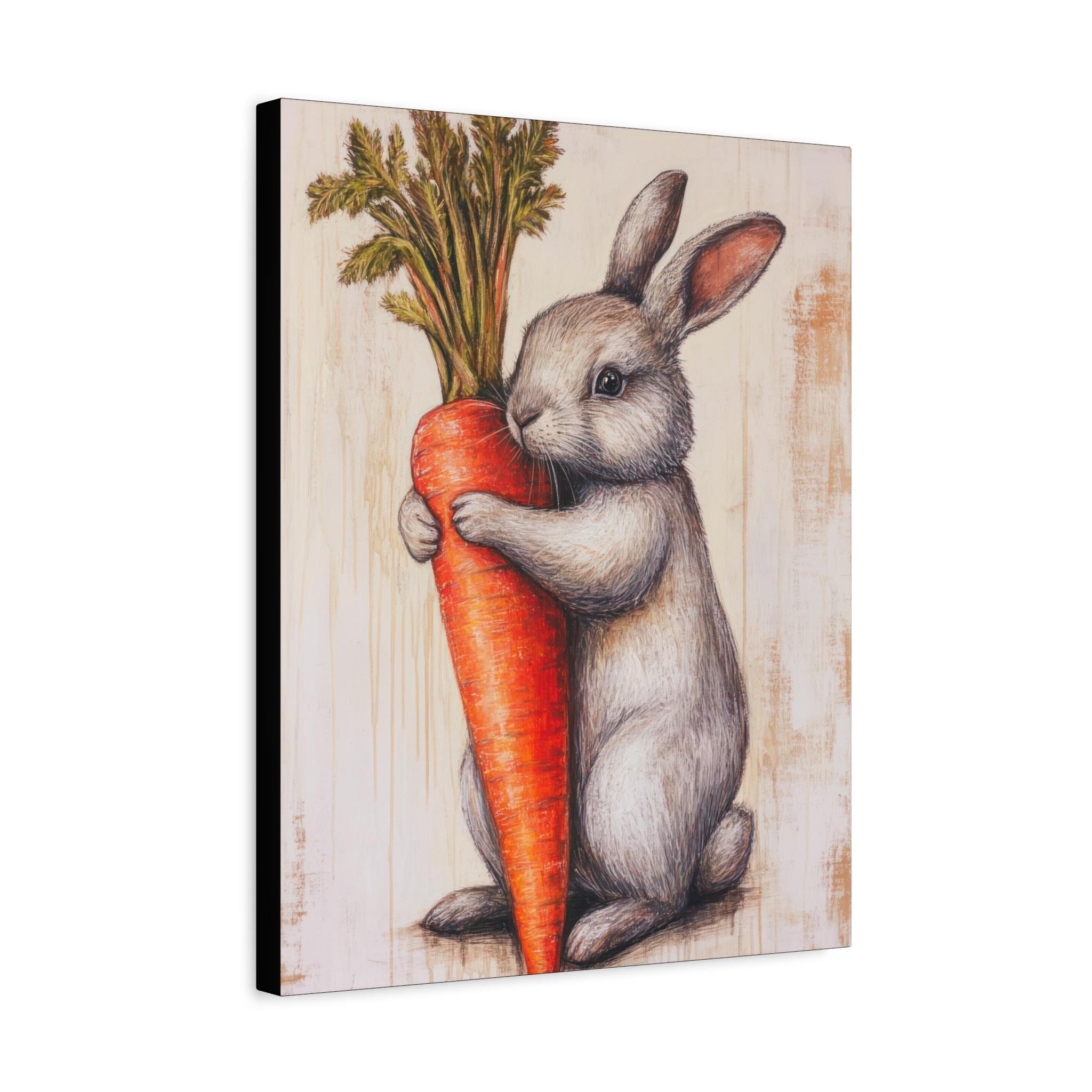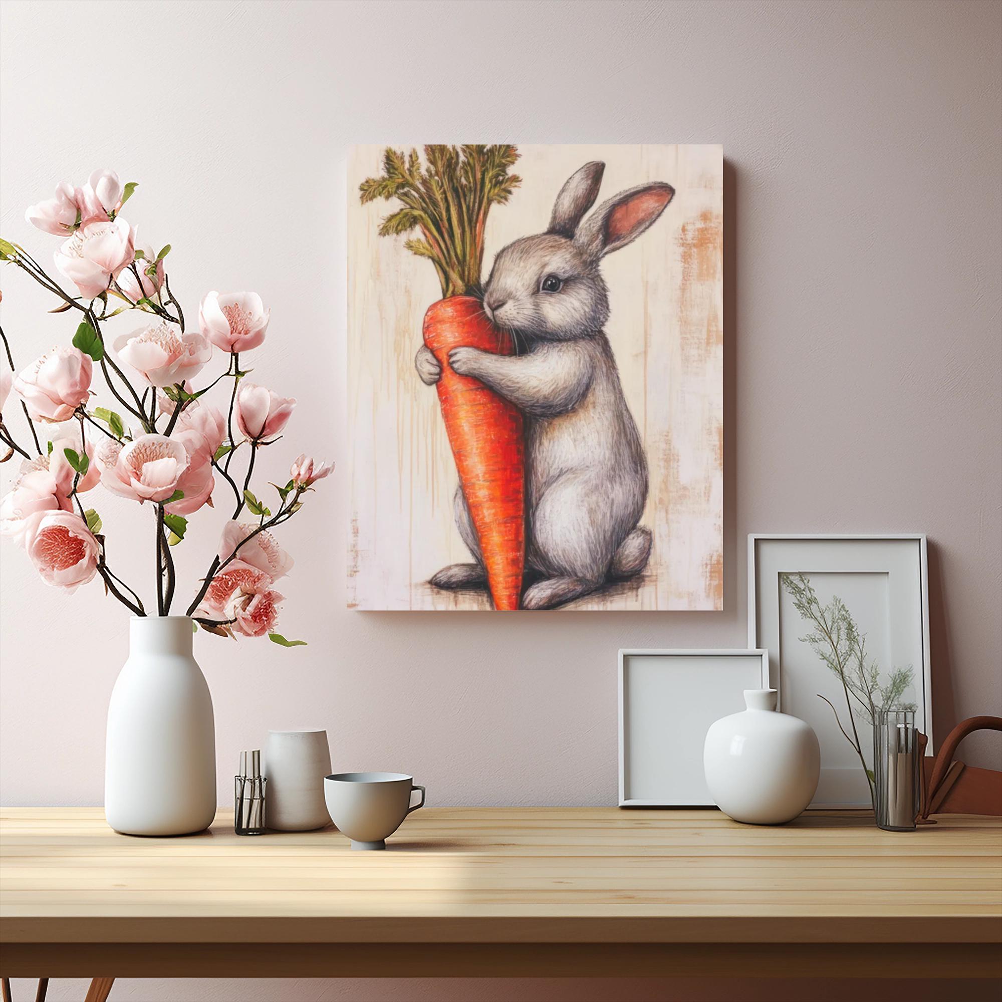 A warm, hand-painted rabbit clutching a bright carrot—this stretched matte canvas brings gentle farmhouse charm to nurseries, kitchen nooks, or cozy reading corners. The soft, sketch-like strokes and muted wood-grain background create a quiet, storybook moment that feels both vintage and fresh. Hung above a changing station, on a gallery wall, or leaning on a mantel, it adds a calm, whimsical note that welcomes slow mornings and small smiles.