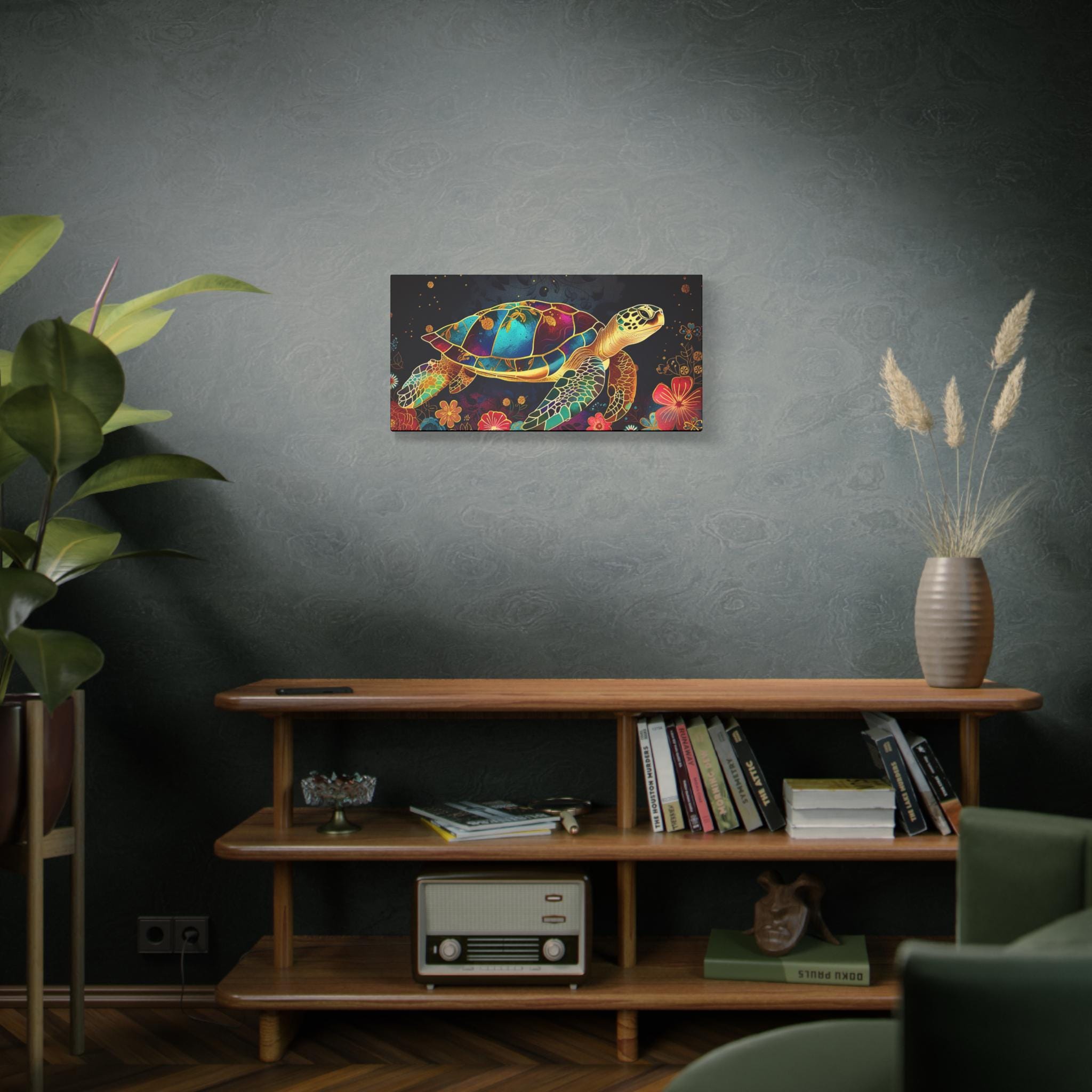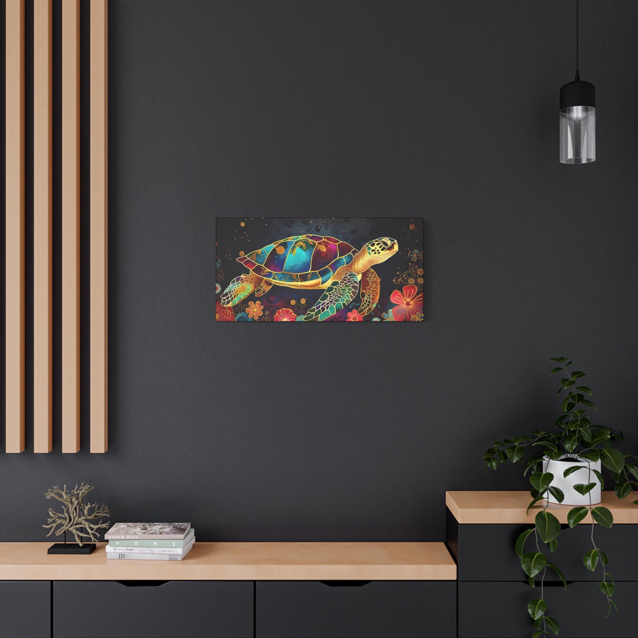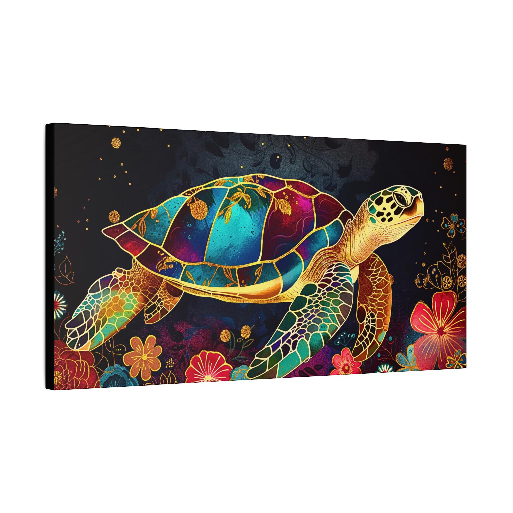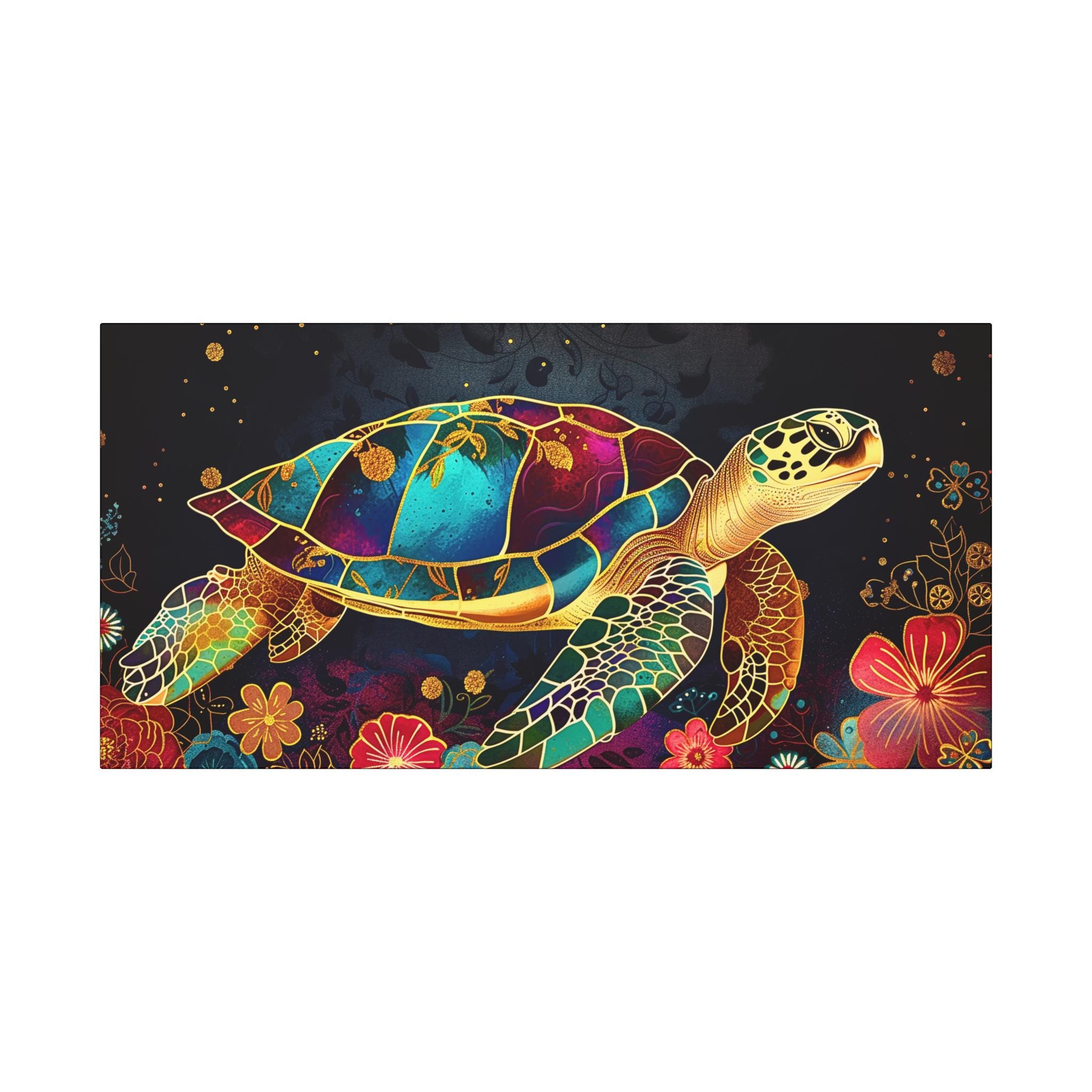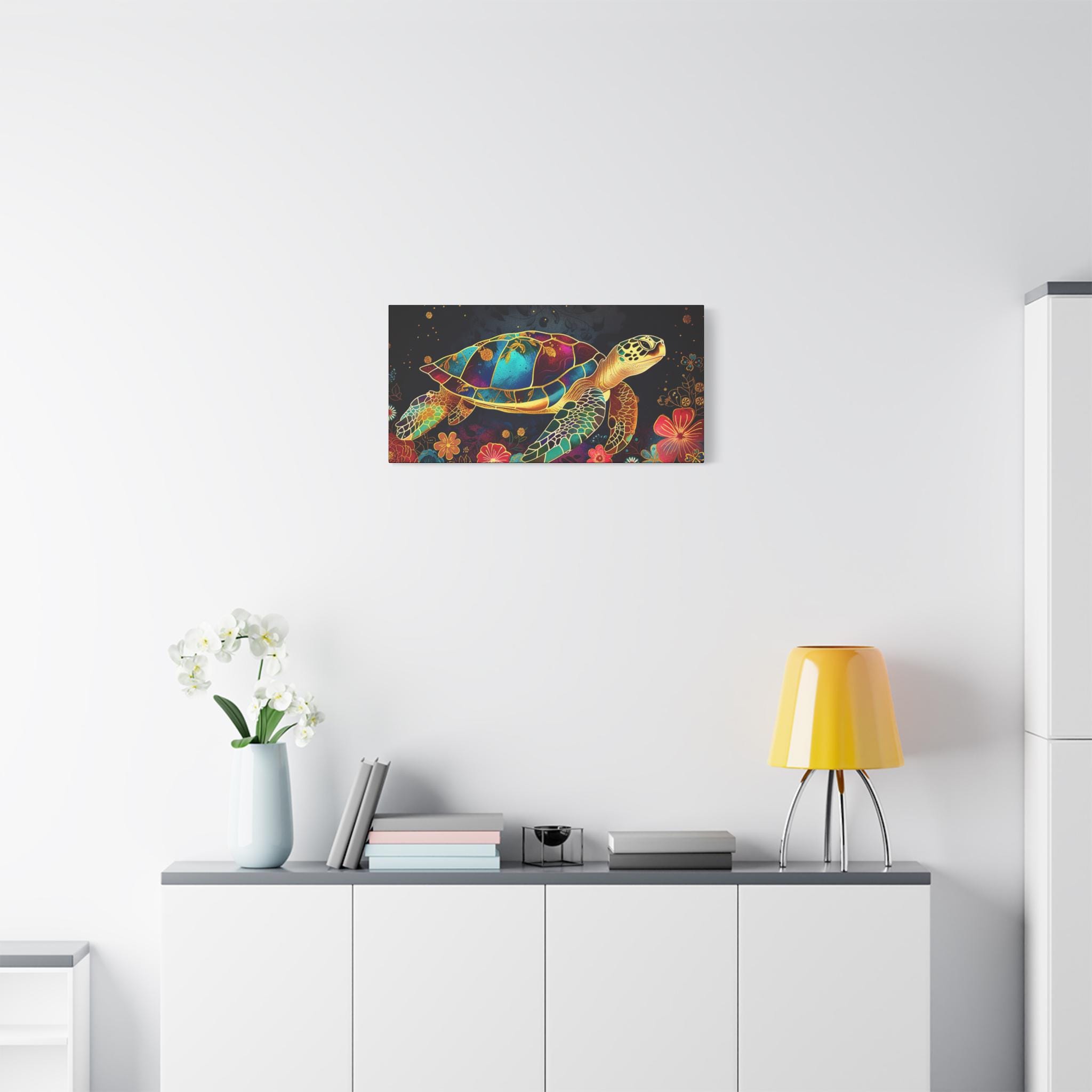 A vibrant stretched matte canvas that brings a luminous sea-turtle scene to life. Rich, jewel-toned colors sit against a deep background, giving the print a glow that reads like stained glass underwater. The slim 1.25" profile keeps the focus on the artwork while the wrapped edges deliver a clean, modern look. Lightweight yet sturdy, it arrives ready to hang with soft rubber dots on the back to protect walls and a built-in hanging system. This piece turns an ordinary wall into a calm, colorful corner — a quiet reminder of ocean nights, coral gardens, and slow, graceful movement.