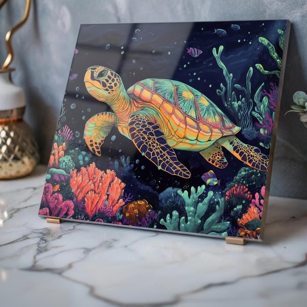 Bring the tide indoors with a luminous acrylic print that captures the slow, graceful drift of a sea turtle through a neon coral reef. The colors pop against crystal-clear acrylic, giving depth and a soft glow to every brushstroke. Hung with a sturdy French cleat, this piece feels like a window to the ocean—calm, alive, and endlessly watchable. Small splashes and fingerprints wipe away easily, and the polished edges catch light for an elegant finish.