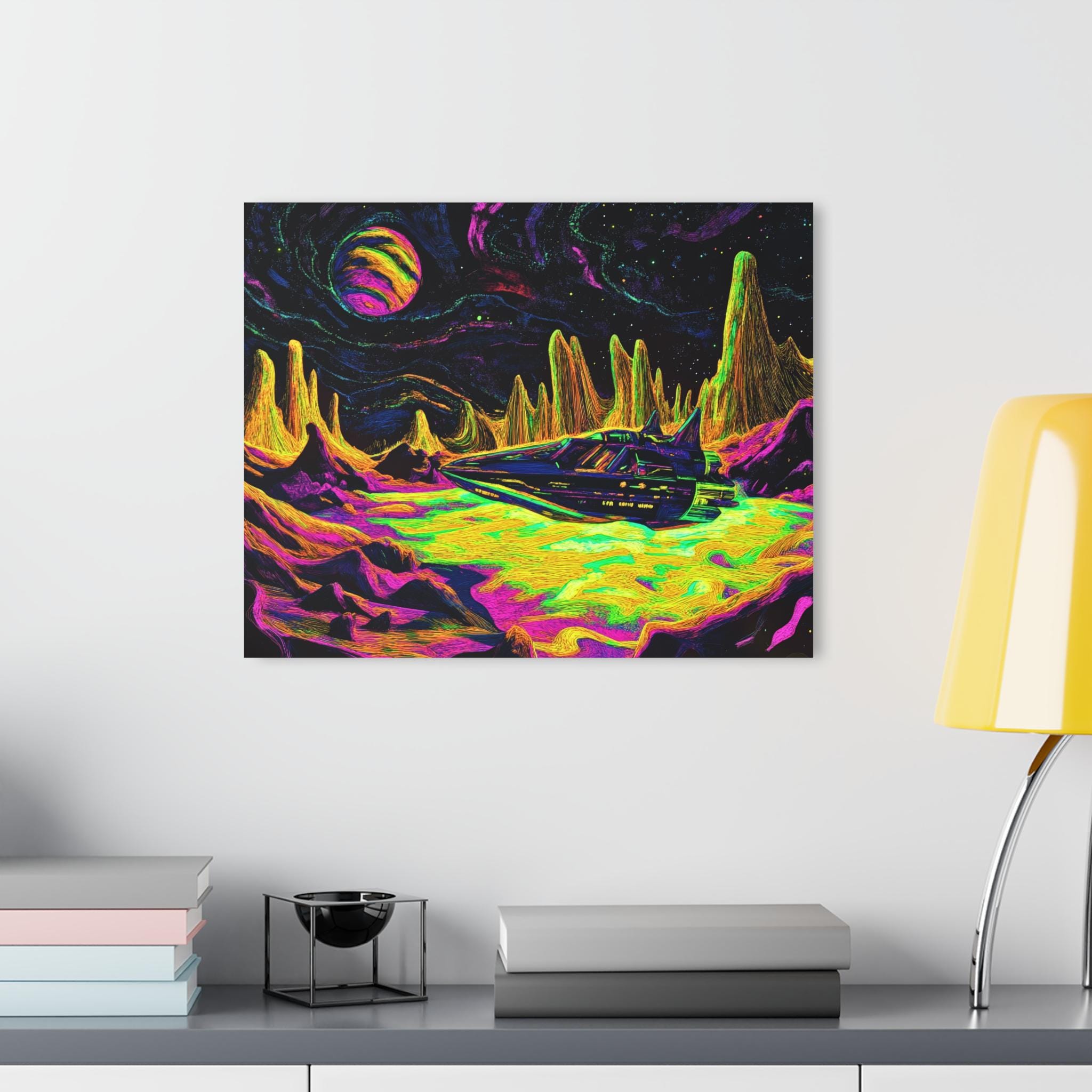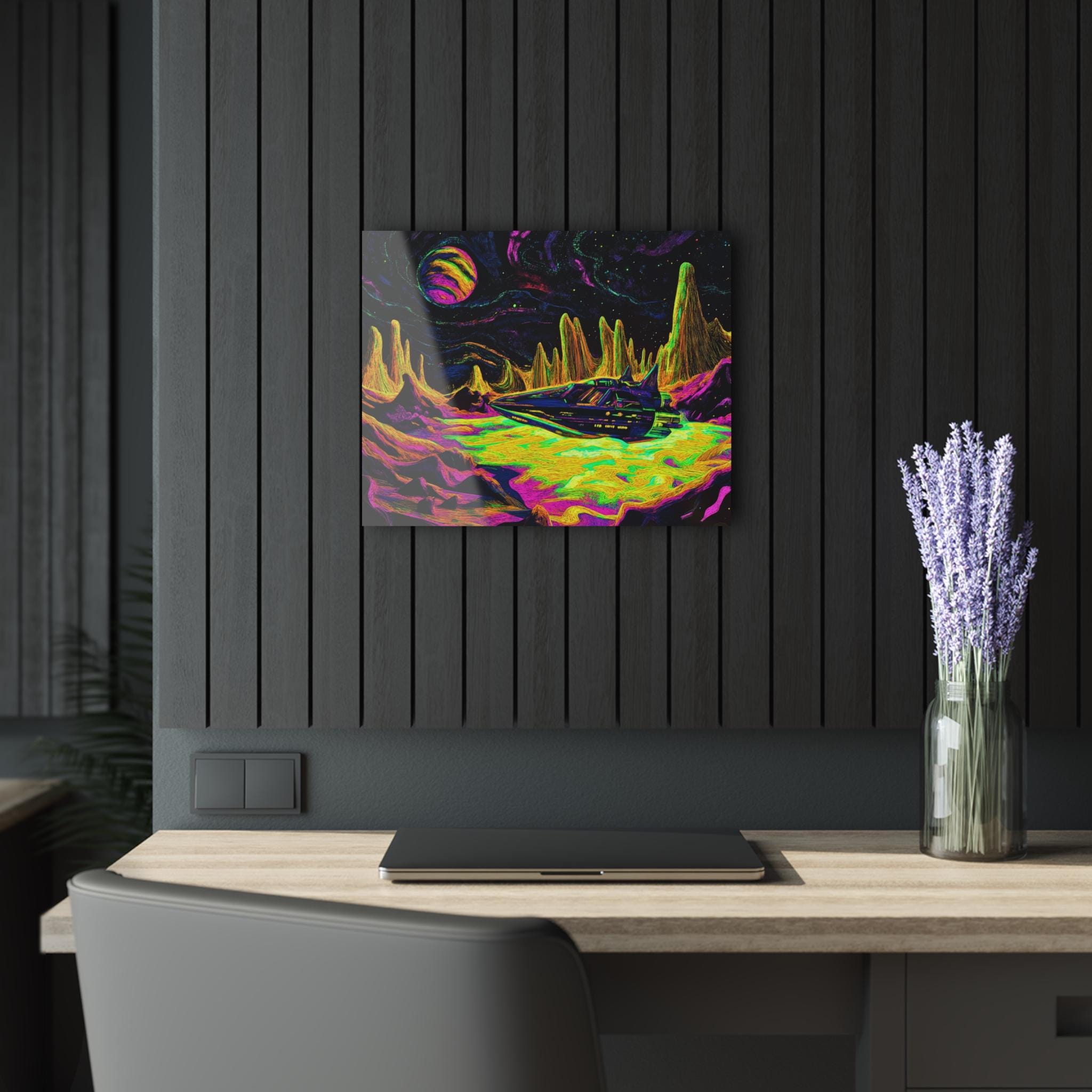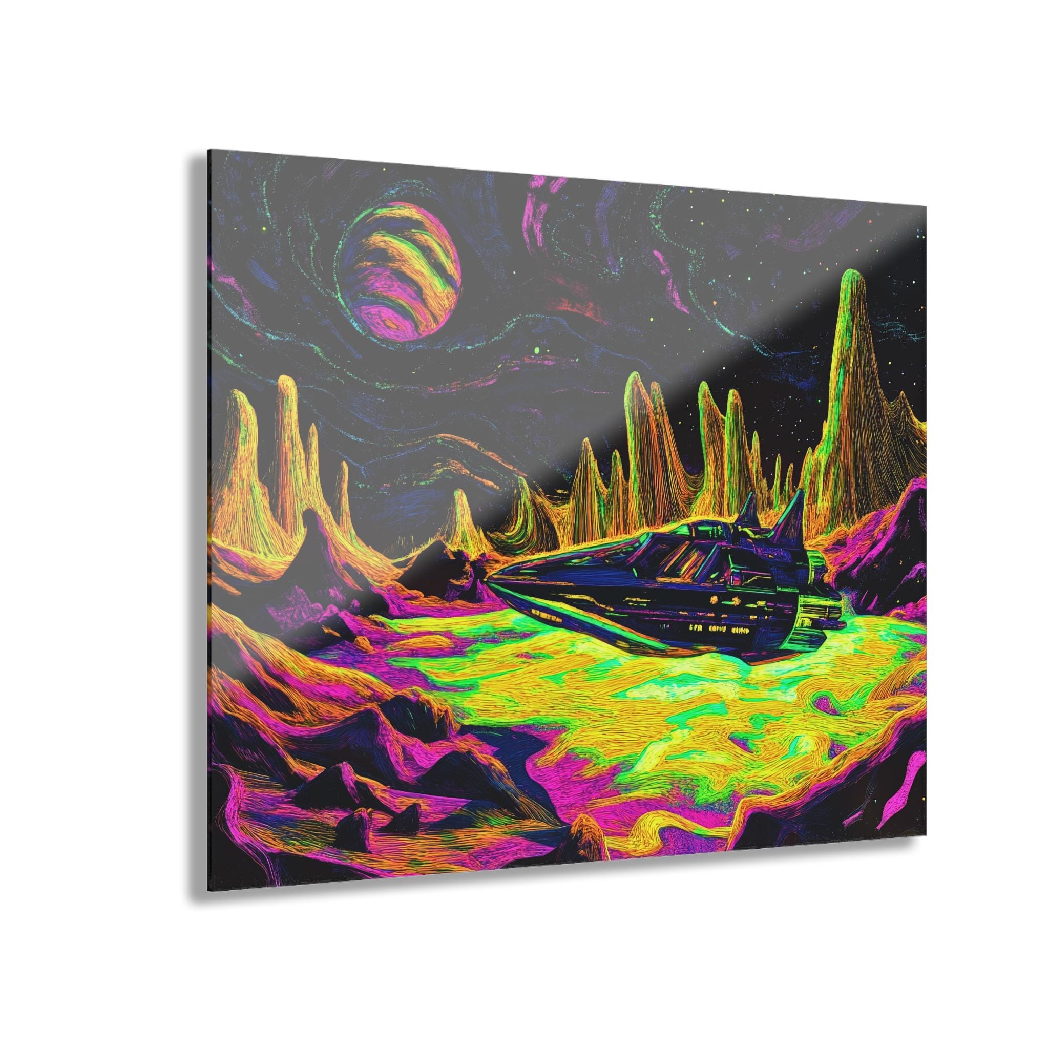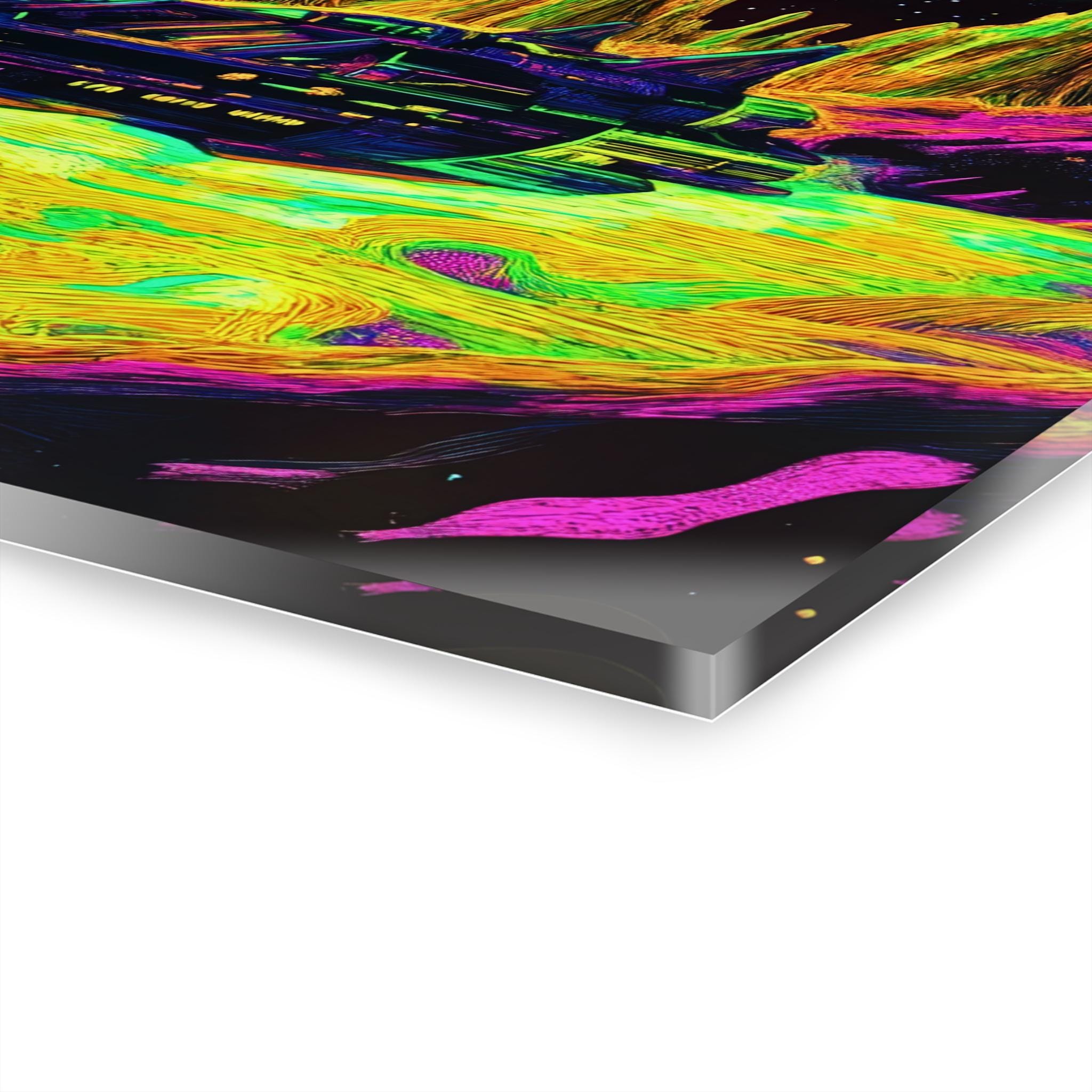 A vibrant acrylic print that brings otherworldly color and depth to your wall. Printed on archival photographic paper with fade-resistant inks and fused to 0.25" grade-A acrylic, the image pops with crystal-clear clarity and luminous saturation. The glossy surface resists splashes and wipes clean easily, while hand-polished edges catch the light for a polished, gallery-ready look. A sturdy French cleat is pre-fitted on the back and screws are included, so mounting feels secure and precise.