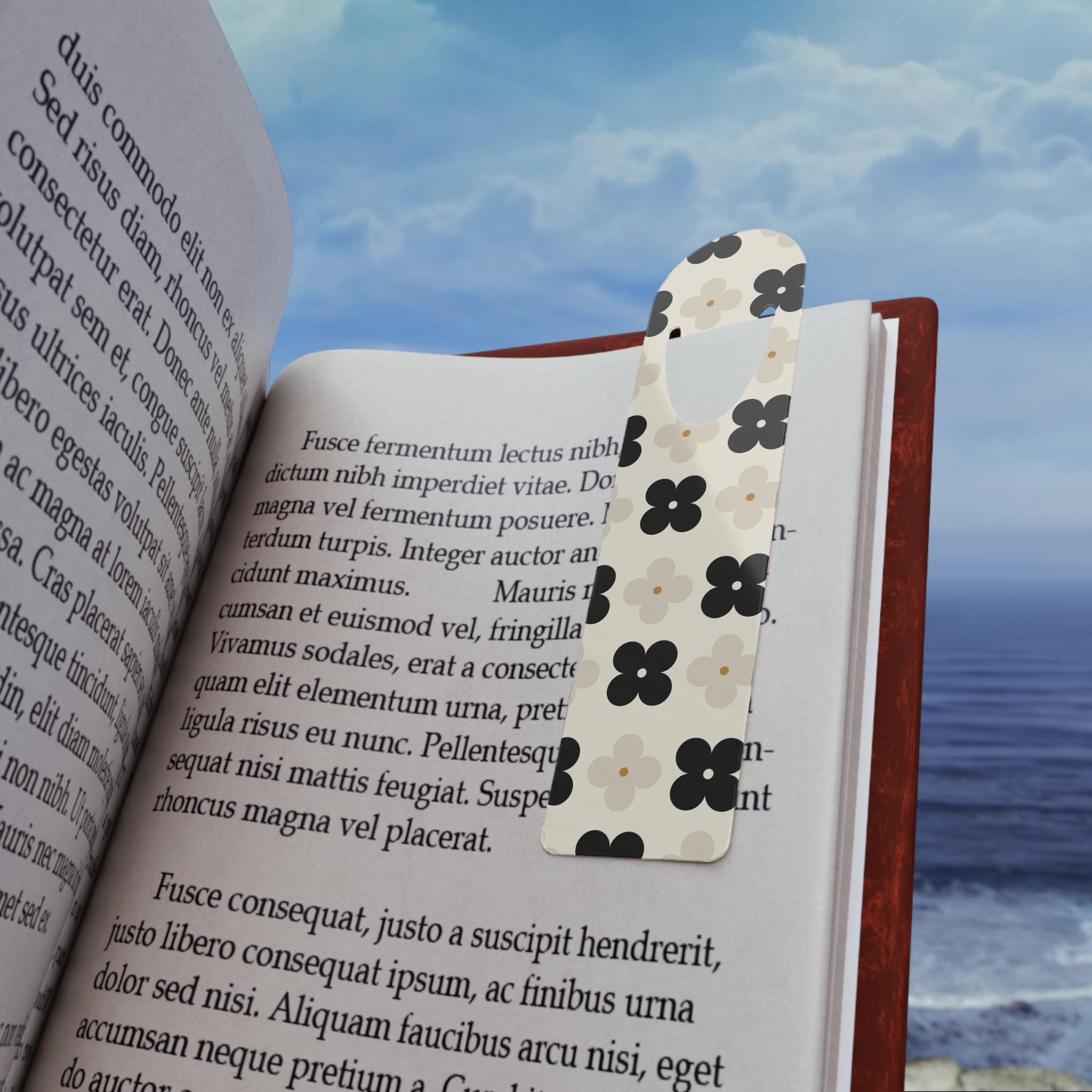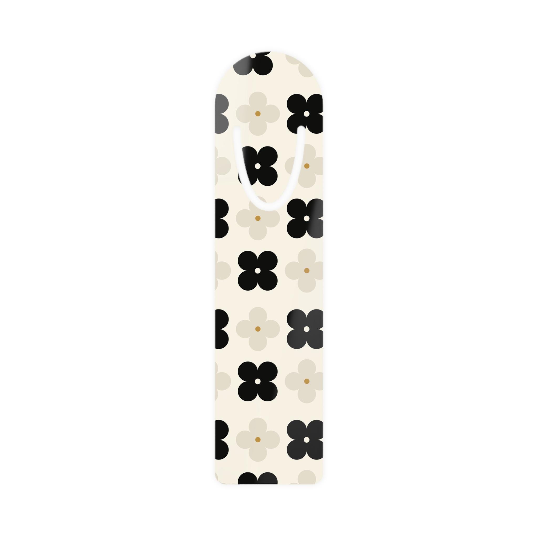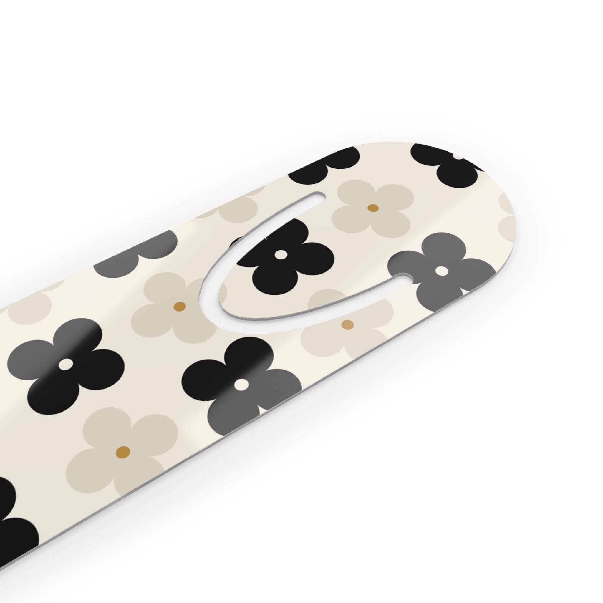 A slim, lightweight aluminum bookmark that brings calm charm to every reading session. The front side features a soft, repeat floral pattern in neutral black, gray, and cream tones, while the brushed aluminum back adds subtle sheen and durability. A U-shaped slot at the top slips over a page to stay put without damaging paper. Rounded edges make it comfortable to slide in and out of books. Assembled in the USA from globally sourced parts, this bookmark sits quietly between chapters — a small, tactile pause that keeps your place and lifts the look of your favorite reads.