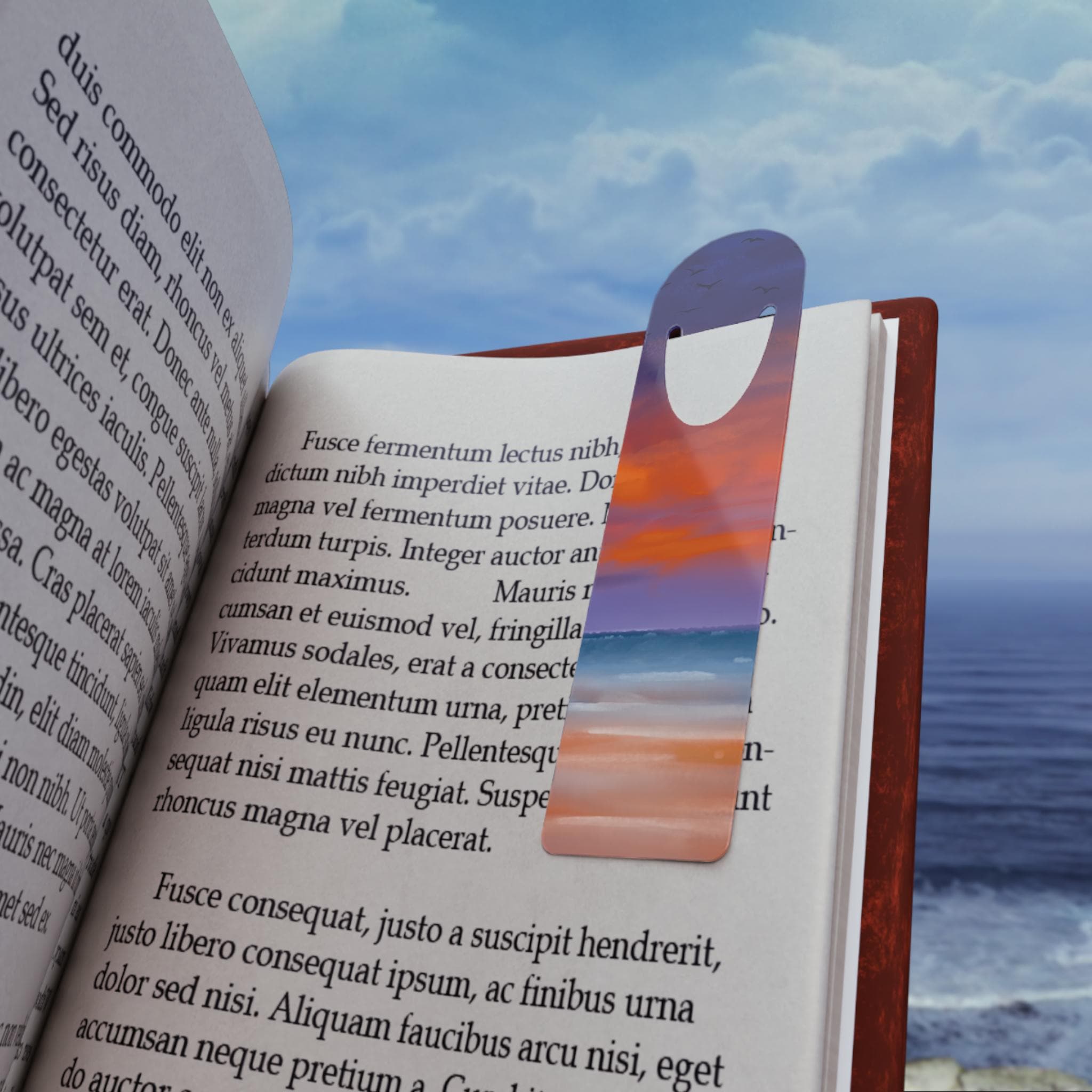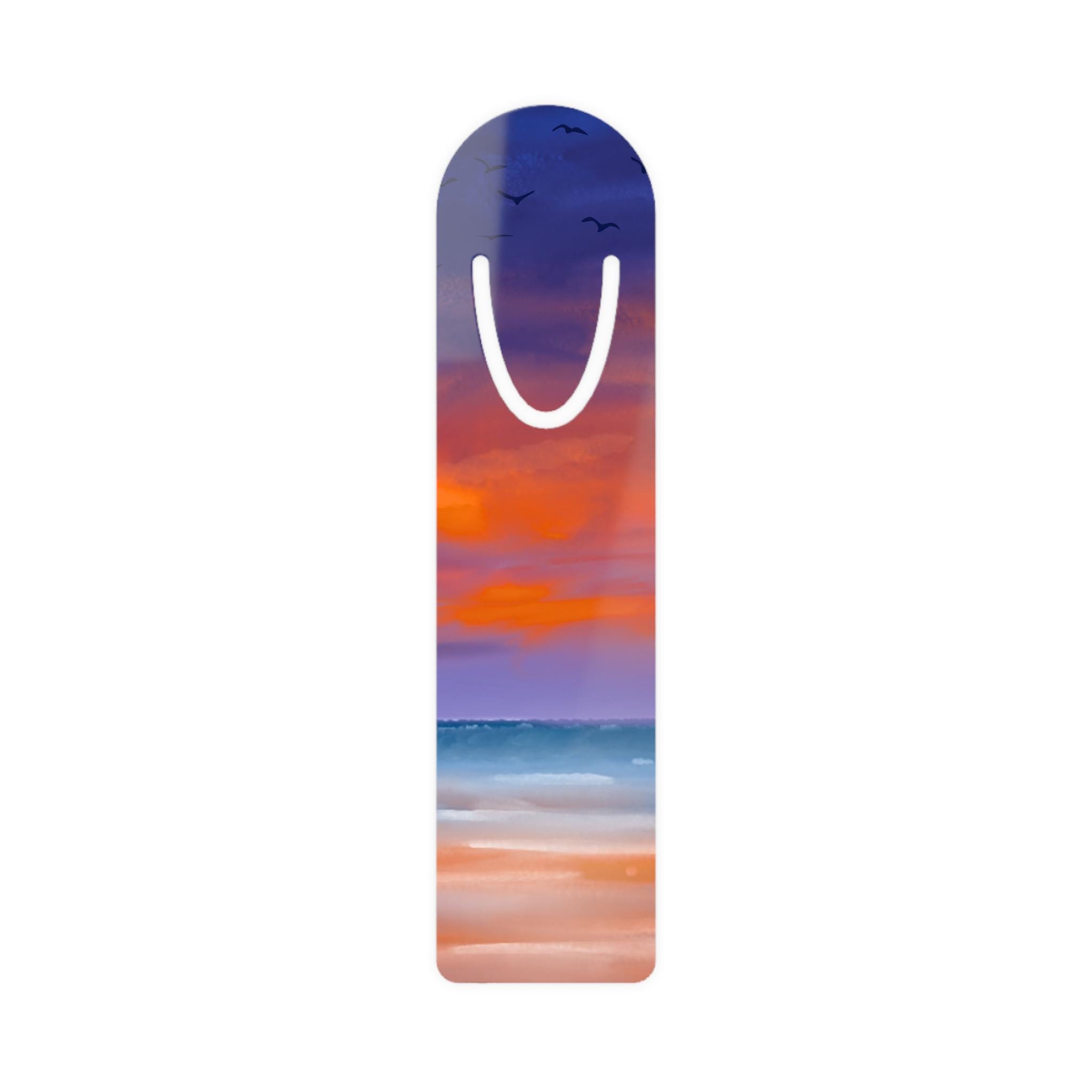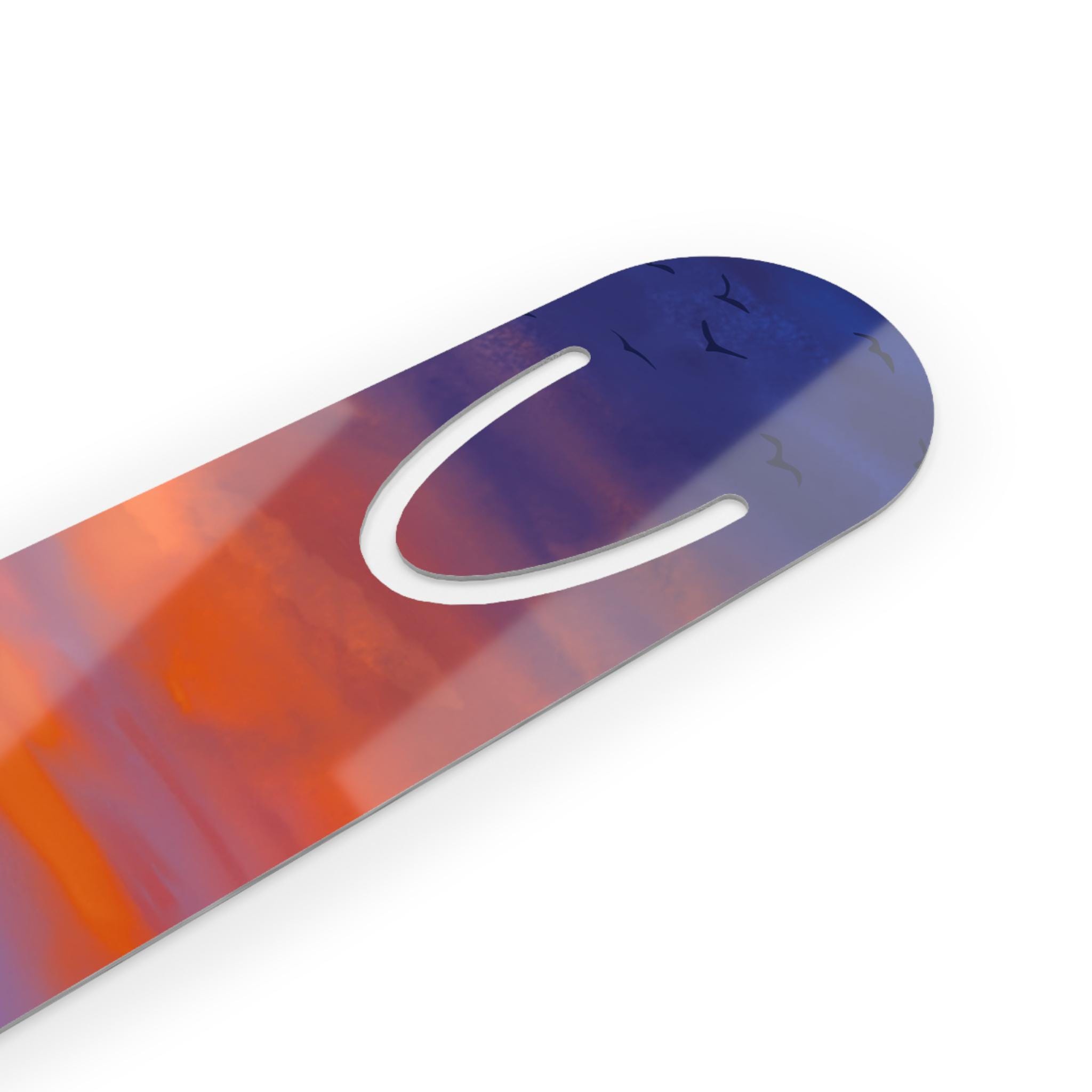 A slim, lightweight aluminum bookmark that brings a quiet moment of wonder to every reading session. The front showcases a single-sided, vibrant beach sunset scene—warm orange clouds melting into cool twilight over gentle waves—while the brushed aluminum back adds subtle weight and resilience. A curved U-shaped slot at the top slips neatly over a page, holding your place without bulk. It’s small enough to slide into a paperback or a treasured hardcover, and built to travel from commute to bedside. As evenings lengthen and the page turns, this bookmark evokes the hush of shoreline light, making ordinary reading feel like a brief escape.