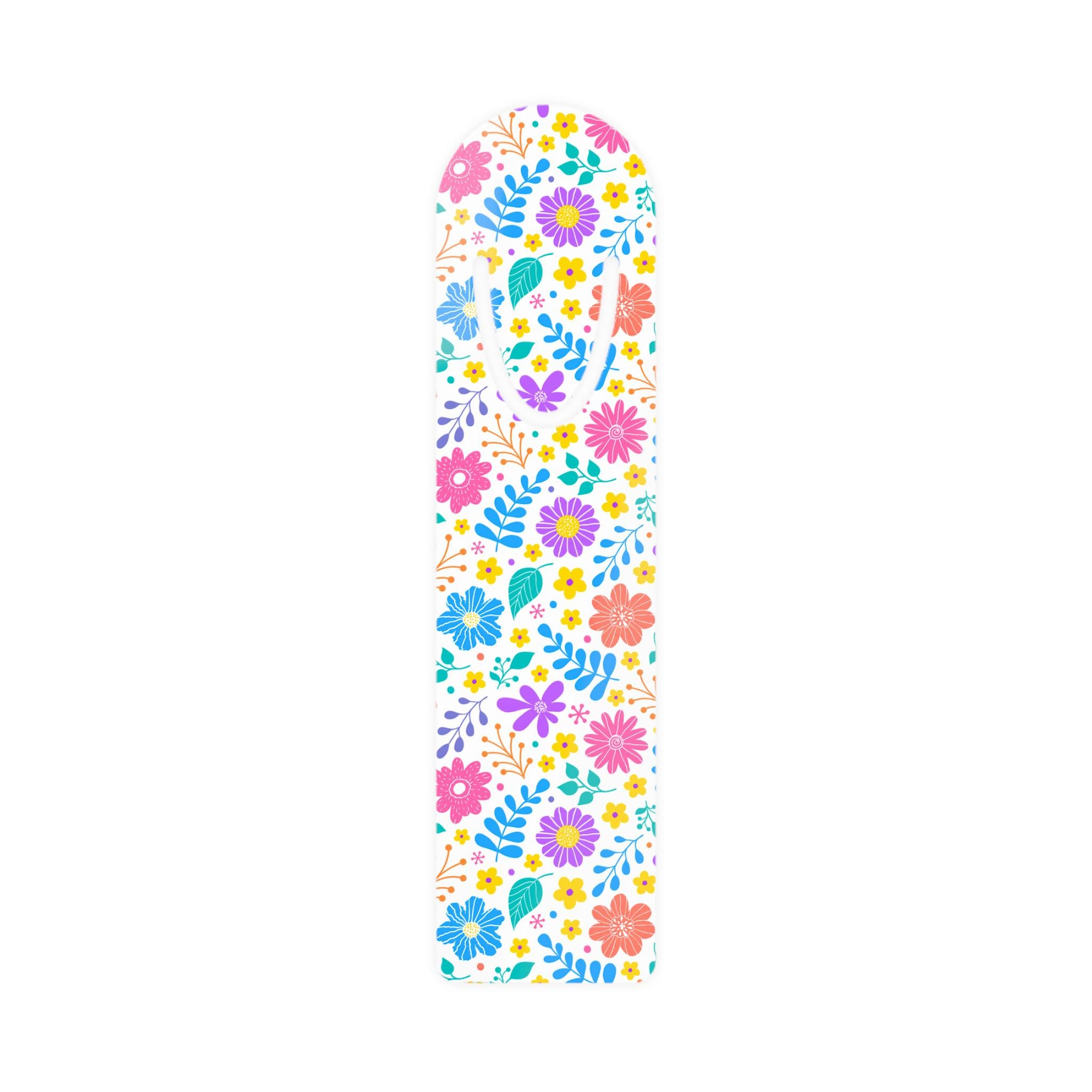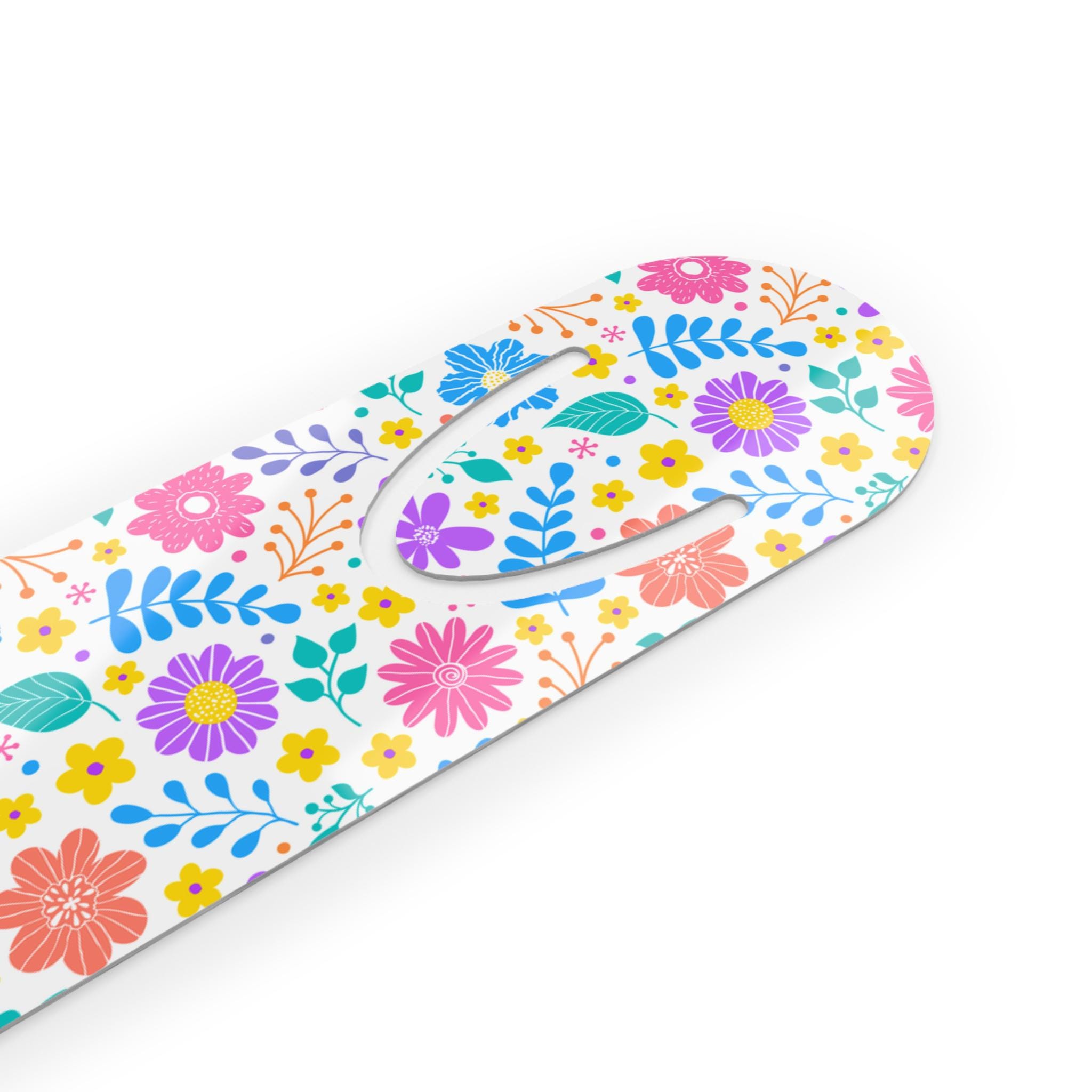 Bright, slim, and gently rounded — this lightweight aluminum bookmark brings a pocket of cheer to every reading session. The front showcases a lively floral pattern in crisp, vibrant color while the brushed aluminum back gives a cool, tactile contrast. A subtle U-shaped slot at the top slips over a page without bulk, keeping your place without damaging paper. It feels barely there in a bag, but noticeable in a stack of well-loved books — a small, thoughtful detail that makes daily reading feel a little more special.