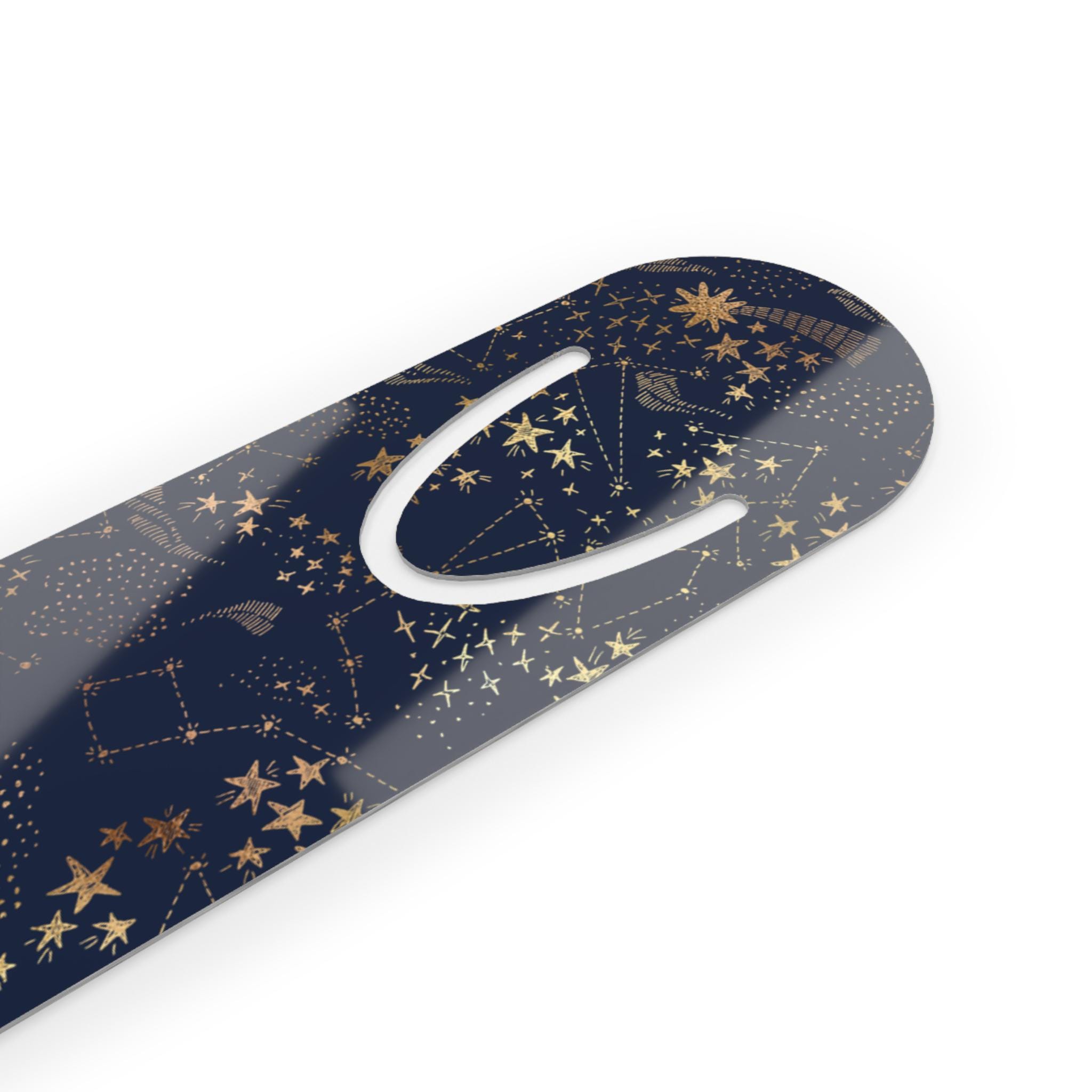 Slip this slim, celestial bookmark into the page and bring a little night-sky magic to every reading session. Lightweight brushed aluminum keeps the bookmark sturdy without weighing down your book. The rounded top and soft slot cradle a page gently, so your place is held without folding or damage. Printed on the white front with vibrant inks, the deep navy design of constellations, moons, and scattered stardust adds a quietly whimsical touch to novels, journals, and study texts. It feels thoughtful in hand and looks like a tiny talisman between chapters — a small, steady companion for readers who linger over late-night pages or gift a piece of wonder to a fellow booklover.