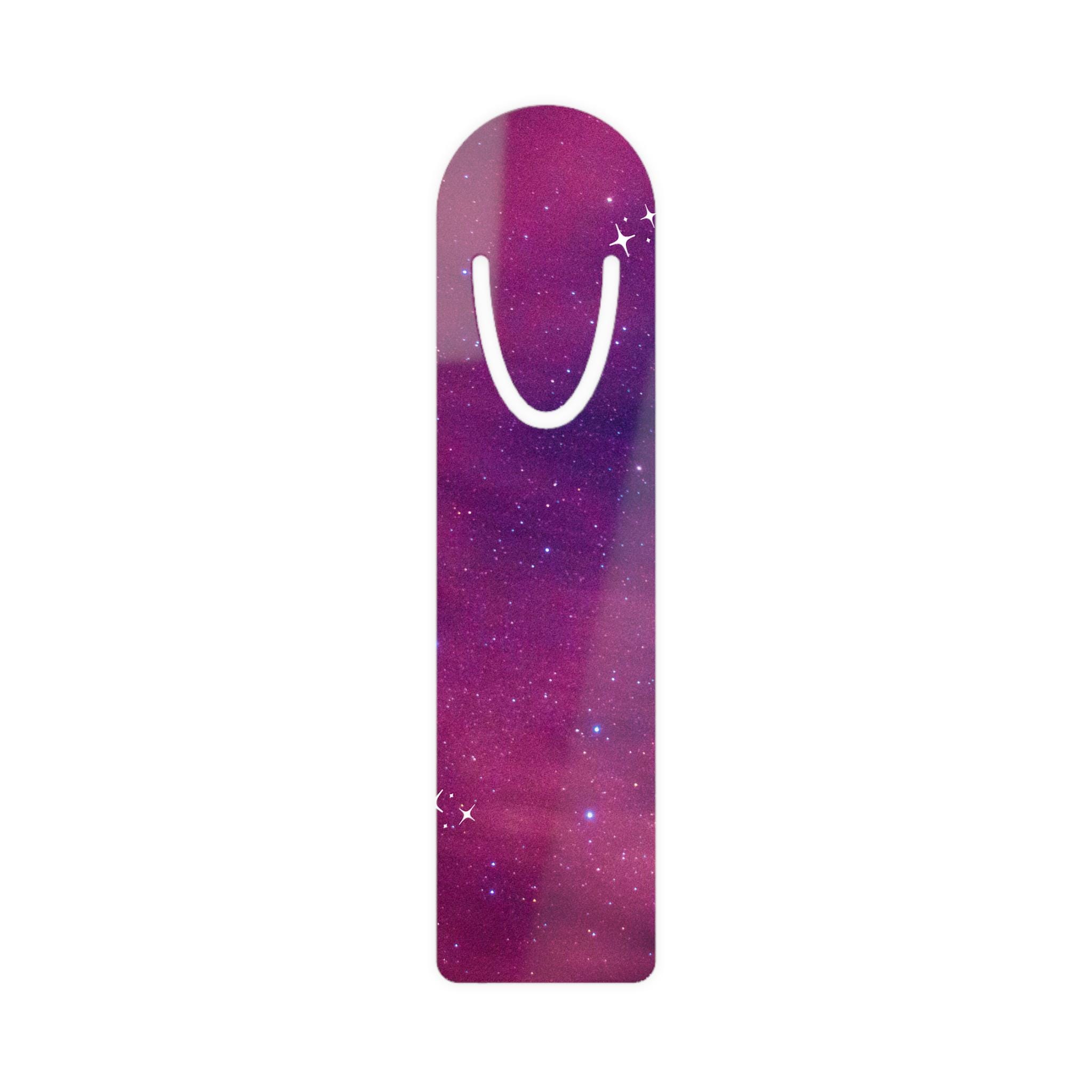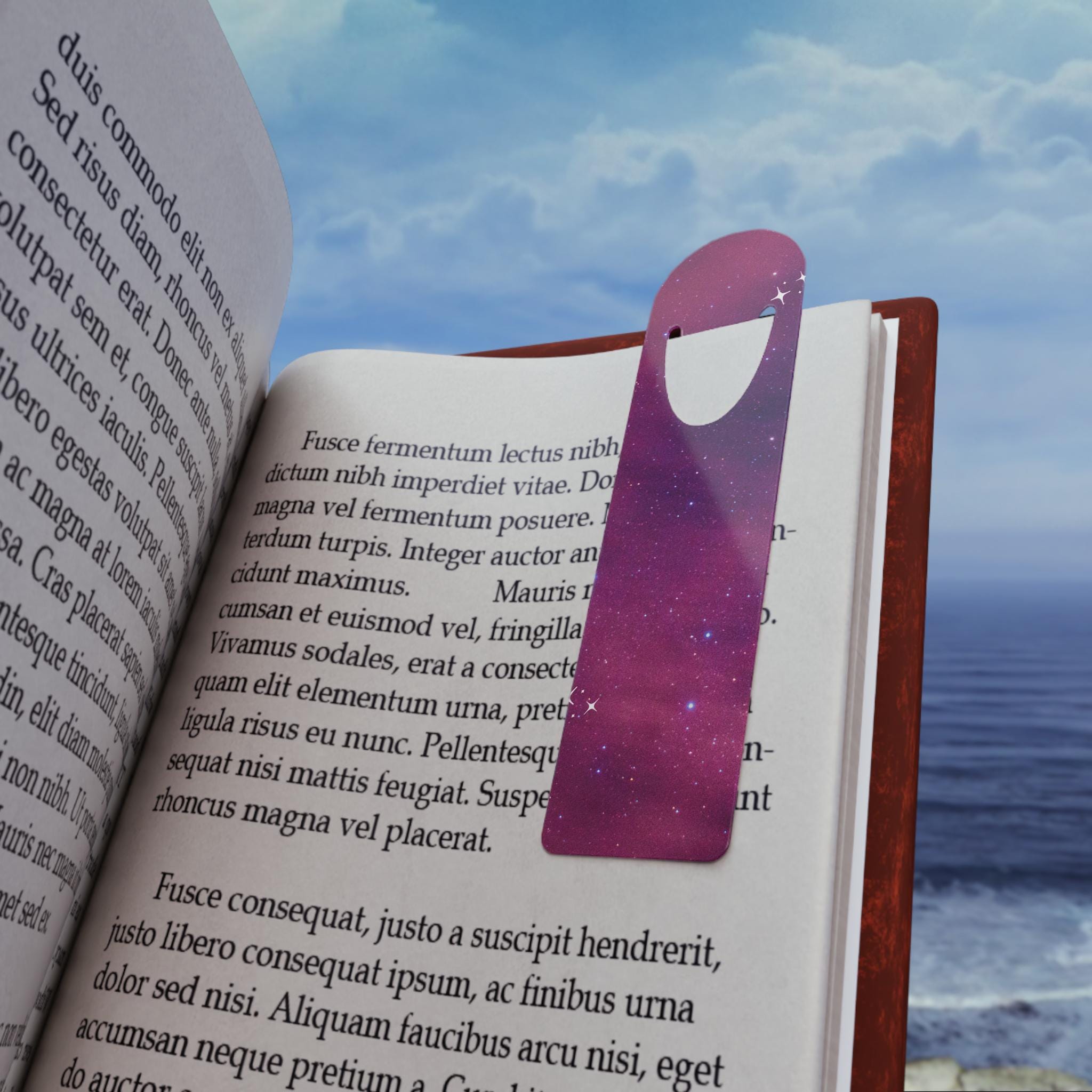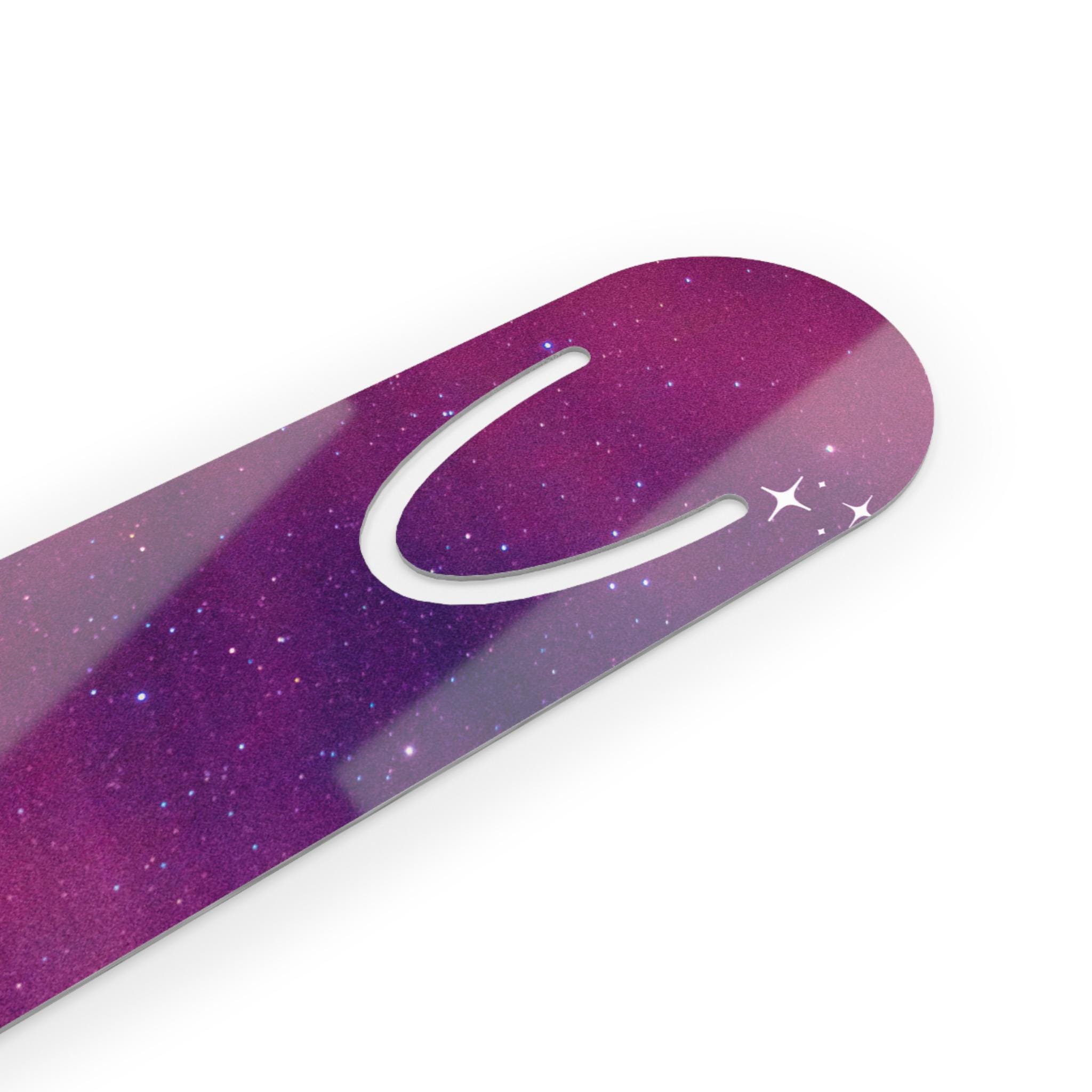 Thin, gleaming, and quietly joyful — this aluminum bookmark slips between pages without weight, leaving only a flash of color and a friendly curve at the top. The front carries a rich, galaxy-inspired print in deep purples and magentas; the back shows the brushed aluminum finish that catches light when you pull it free. The U-shaped slot hooks the page so you can close your book and come back exactly where you left off. It sits comfortably in a paperback or a hefty novel, resistant to bending and bright enough to stand out on a cluttered nightstand. Assembled in the USA from globally sourced parts, it’s a small piece of everyday magic for readers who love color, durability, and a little cosmic whimsy.