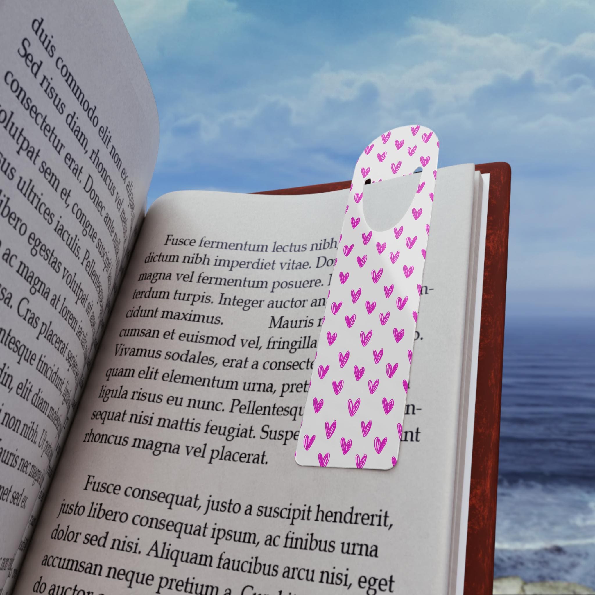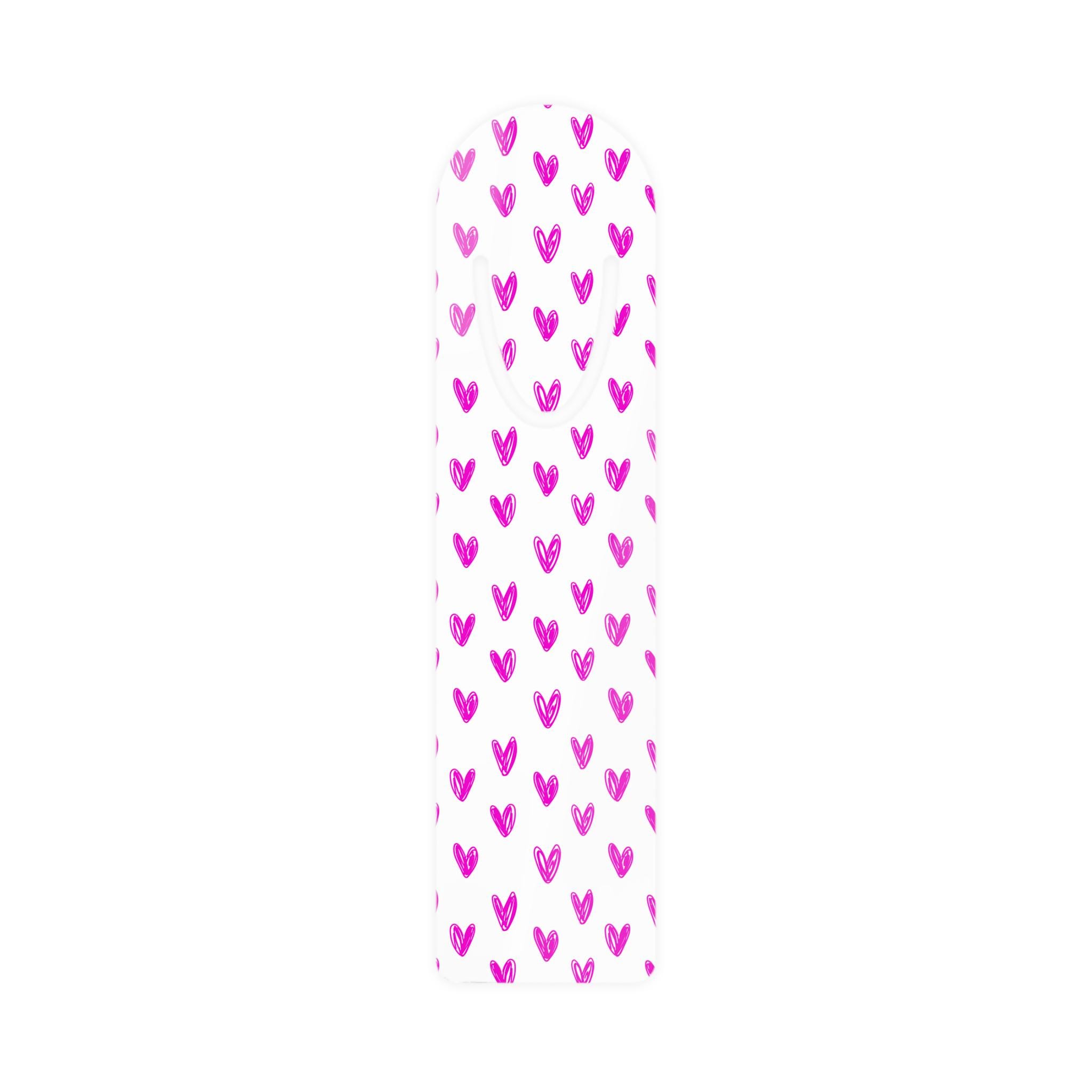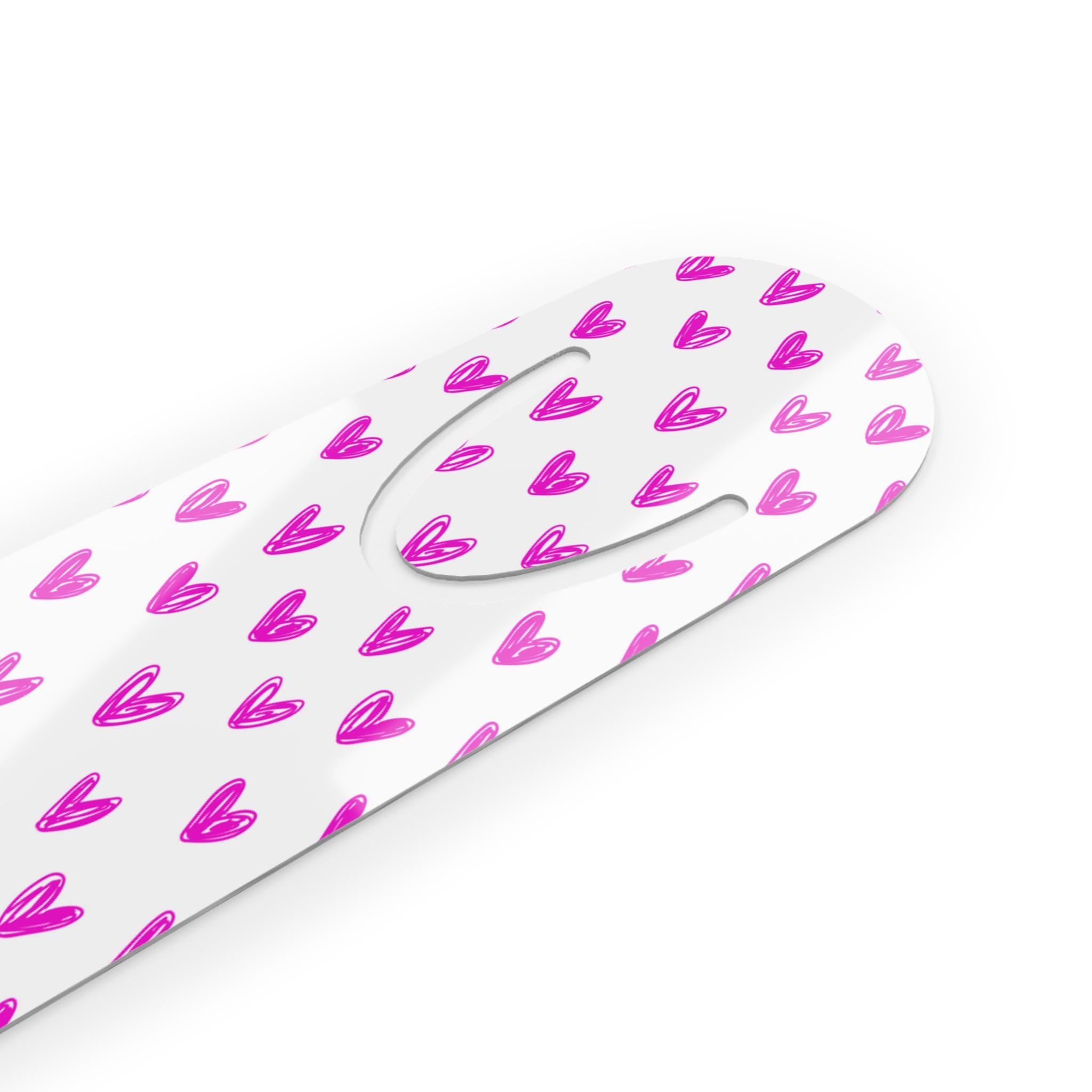 A slim, lightweight aluminum bookmark that brings a playful pop of color to every reading session. One side features a bright, hand-drawn pattern of little magenta hearts on a clean white background; the reverse shows a brushed aluminum finish with a neat U-shaped slot at the top to gently hold a page. Rounded edges make it comfortable to grip and slide between pages, while the durable aluminum base keeps it flat and long-lasting. Assembled in the USA from globally sourced parts, this bookmark blends everyday practicality with cheerful design — a small, thoughtful companion for readers who like their books to feel a little more personal.