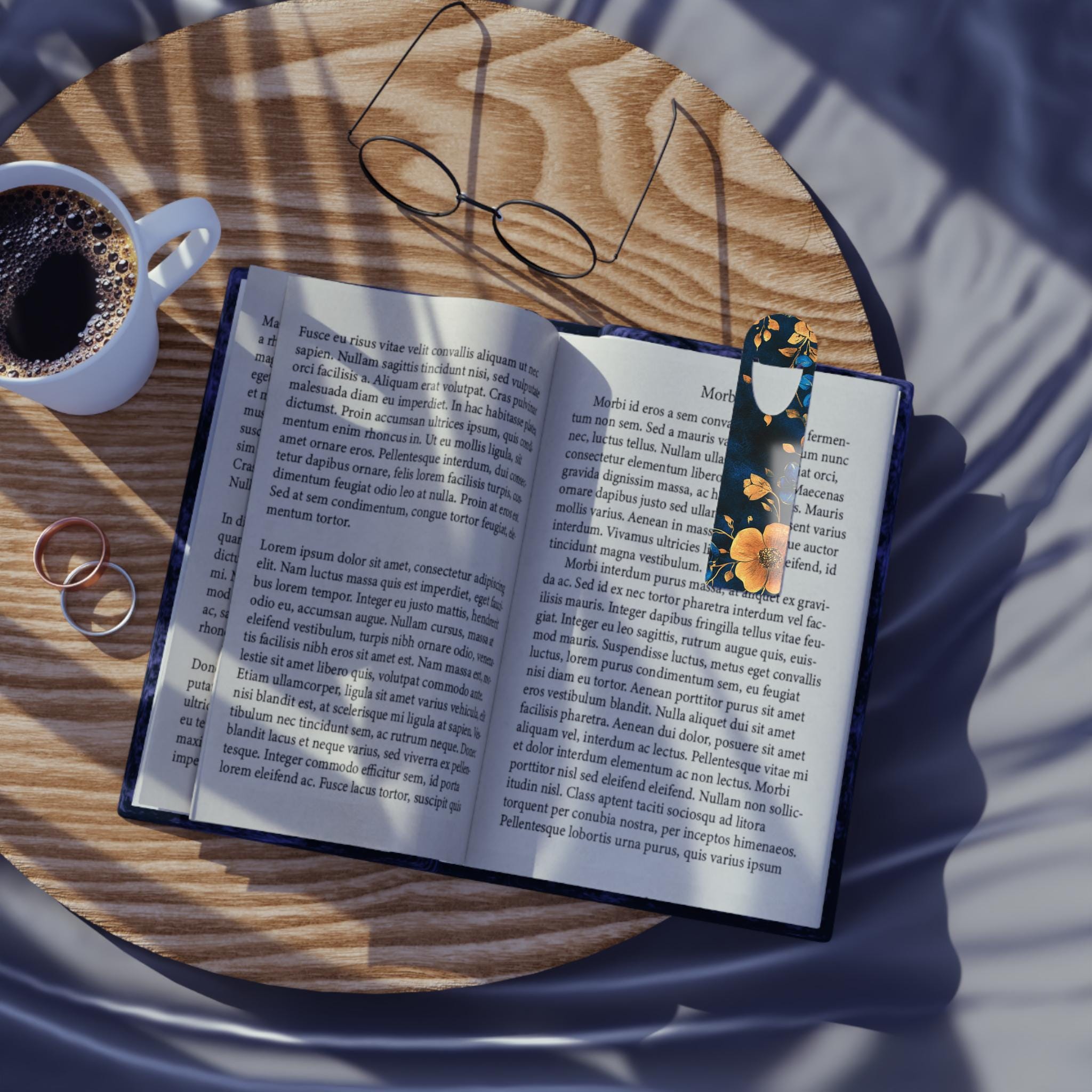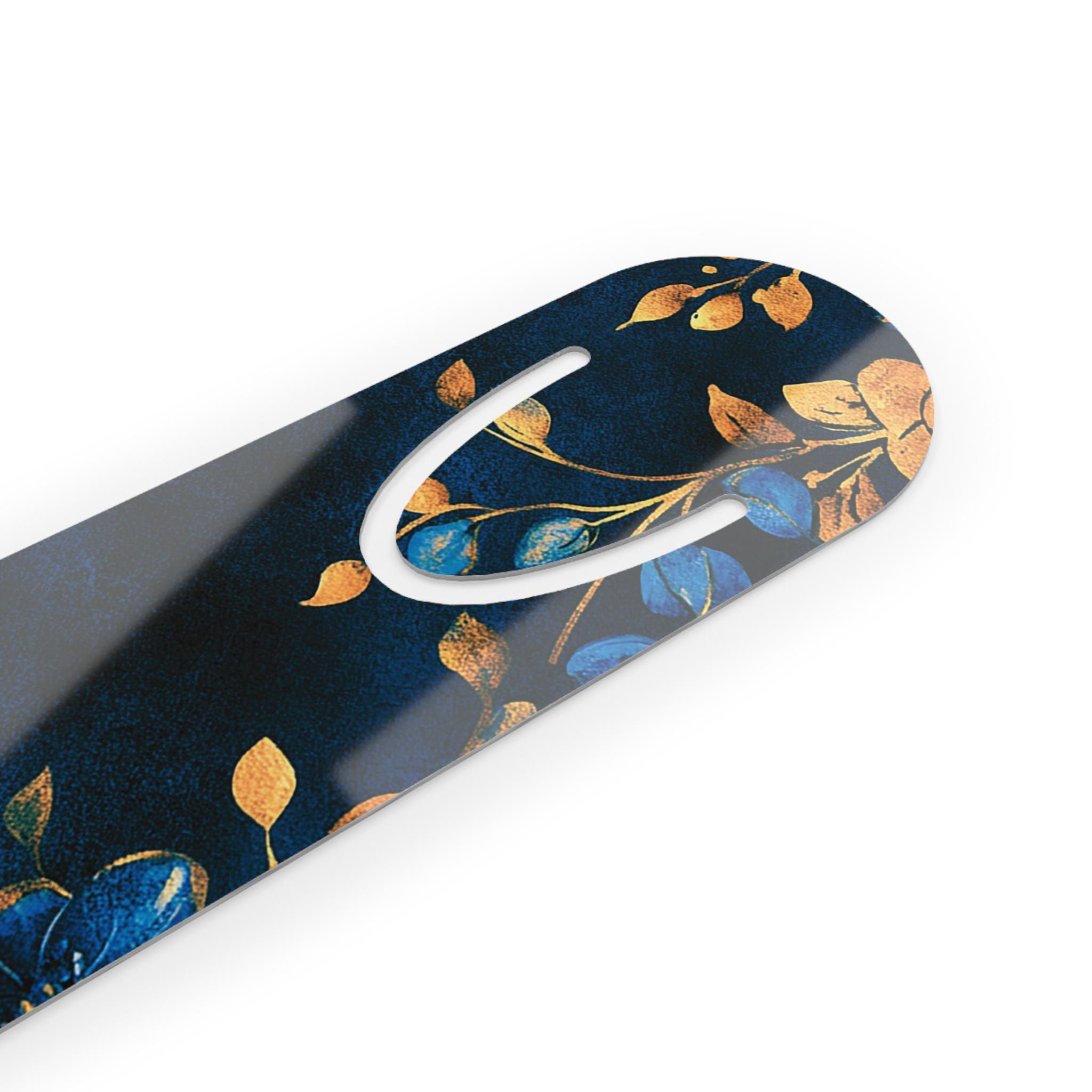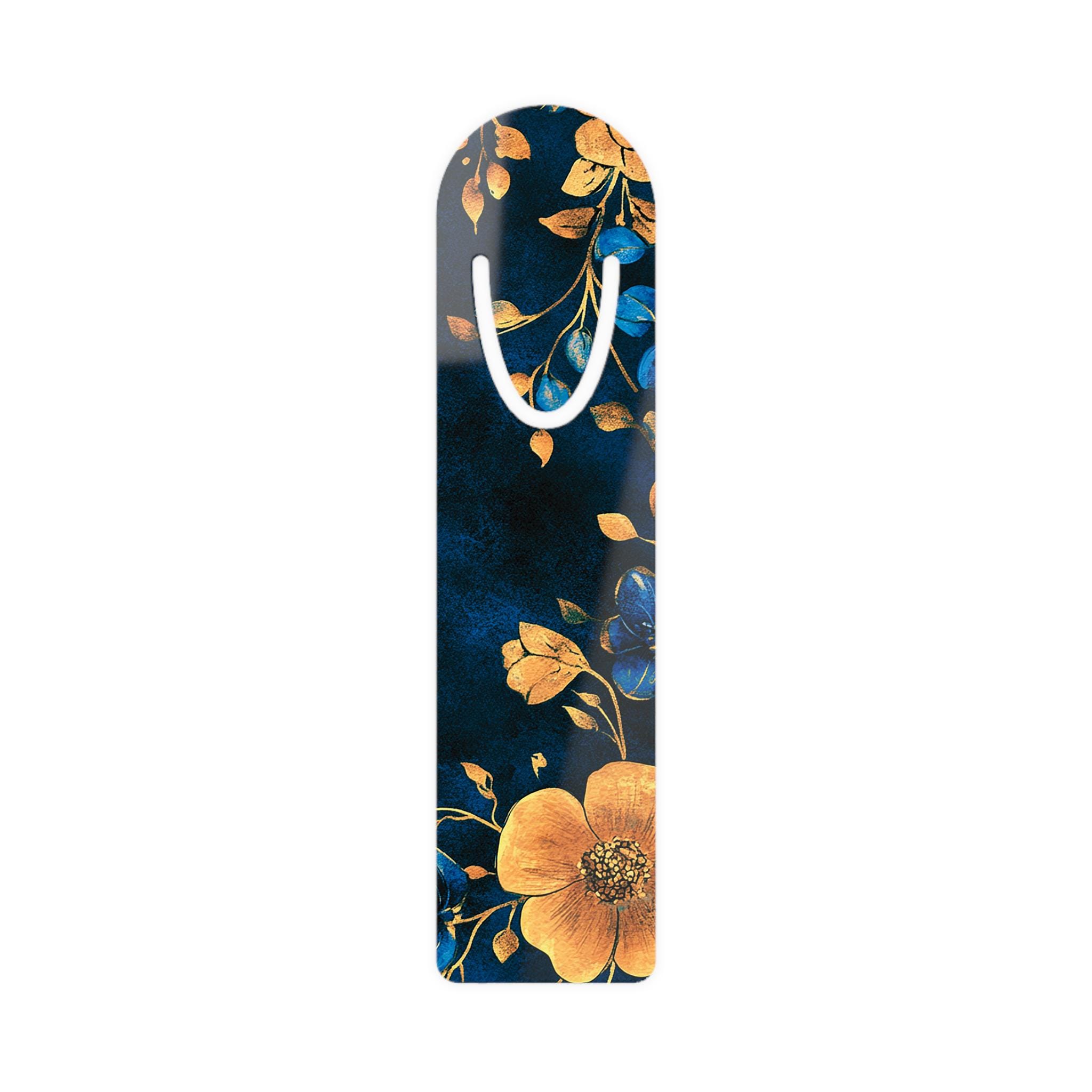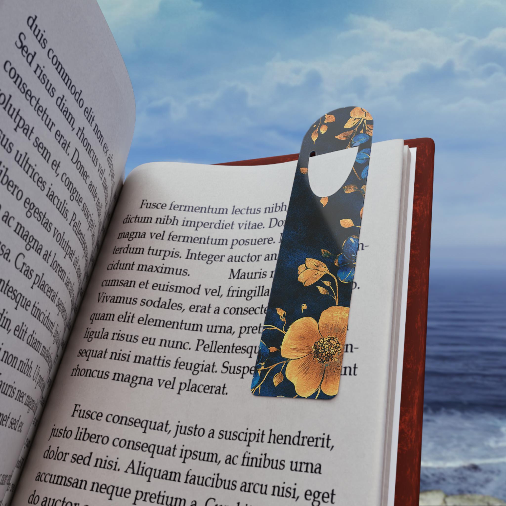 Slip into a quiet moment with this slim aluminum bookmark, where art and function meet. The front shows a painterly floral design in deep navy and warm golds that feels like turning a page in a candlelit library. Lightweight and smooth, it slides between pages without weighing your book down. The U-shaped slot hooks gently over a page so your place stays put while the rounded top peeks out like a small, elegant ribbon. Crafted with vivid printing on a white front surface and a brushed aluminum back, it brings a touch of thoughtful beauty to reading sessions, study nights, and cozy weekends with a novel.