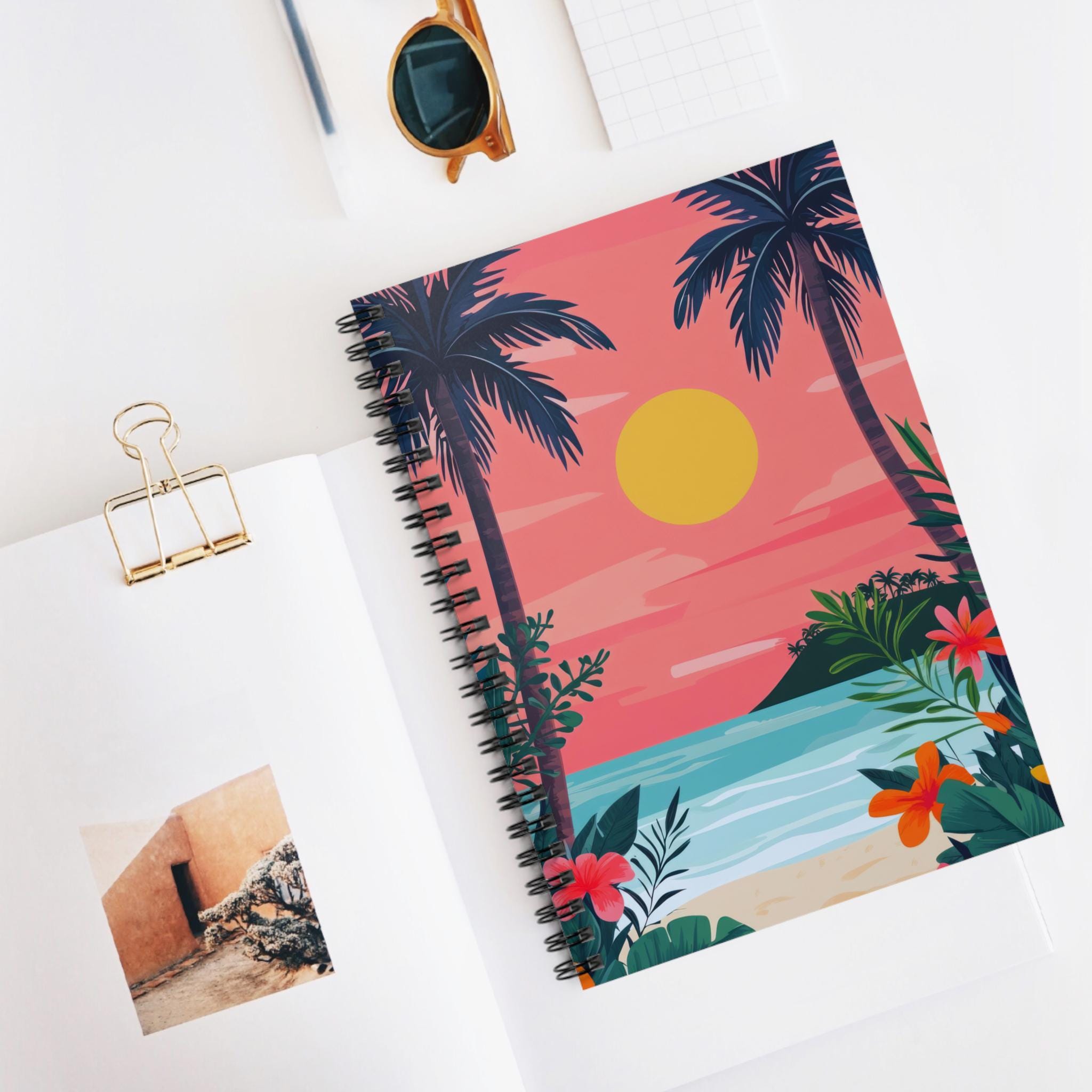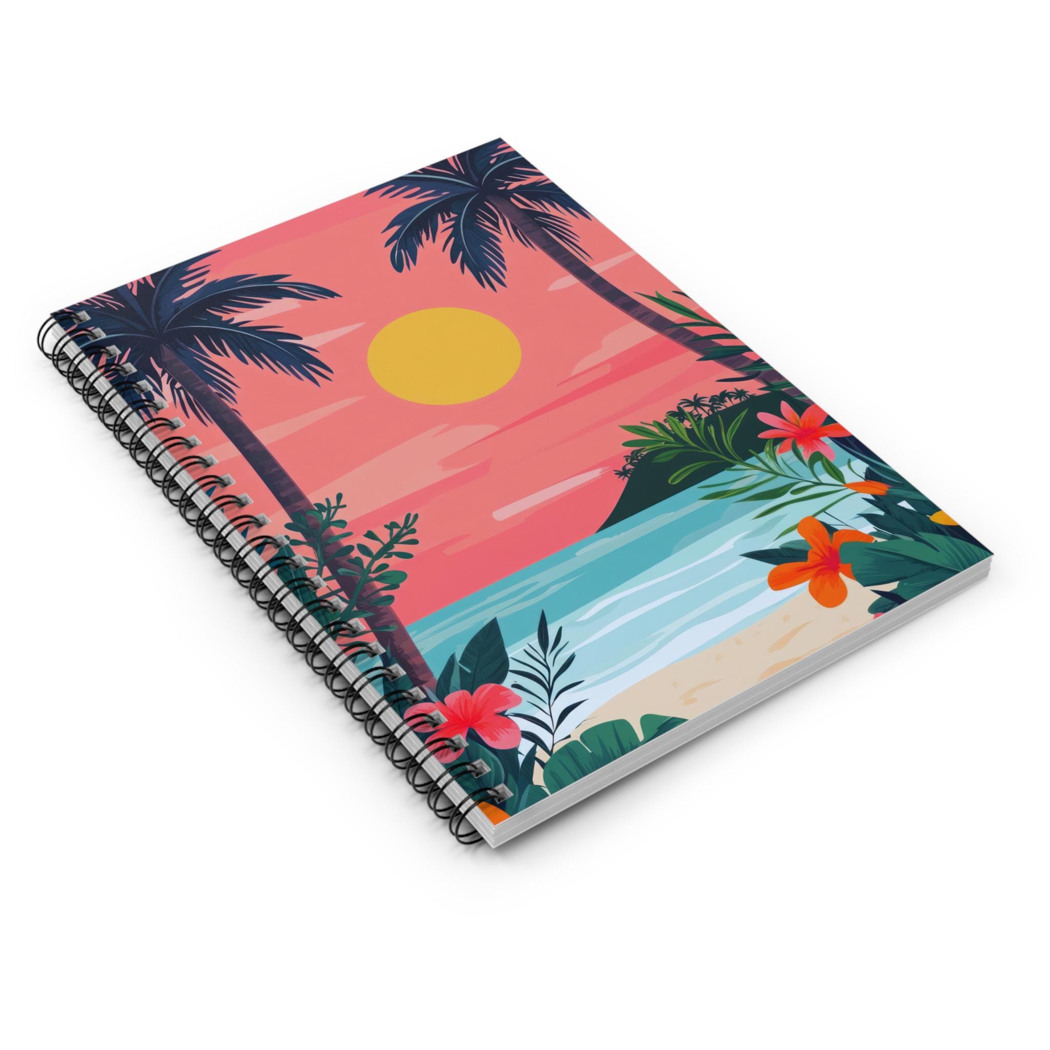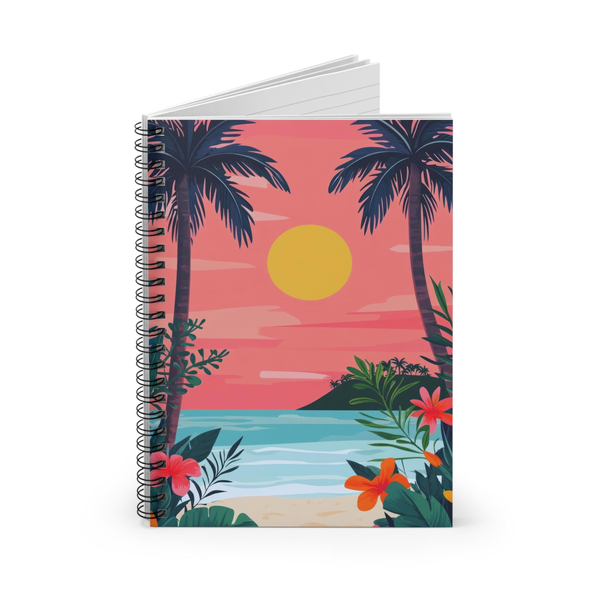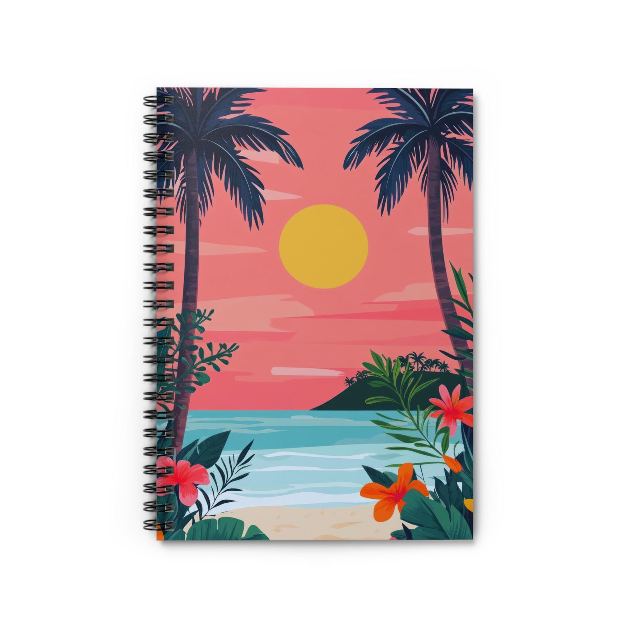 A 6" x 8" spiral notebook wrapped in a sunset-drenched tropical cover that invites quiet moments of reflection. The ruled 90gsm pages feel substantial under pen and keep ink from bleeding, while the metal spiral lays flat for easy writing and lets you tear out pages cleanly. Inside the dark grey back cover, a handy document pocket tucks loose notes, tickets, or receipts without bulking up your bag. Carry it to beachside cafés, journaling sessions at golden hour, or tuck it into your travel pack for sketching and lists on the go. The bright, illustrated front cover—a warm sun sinking behind palm silhouettes and hibiscus blooms—brings a calm, island rhythm to everyday notes and ideas.
