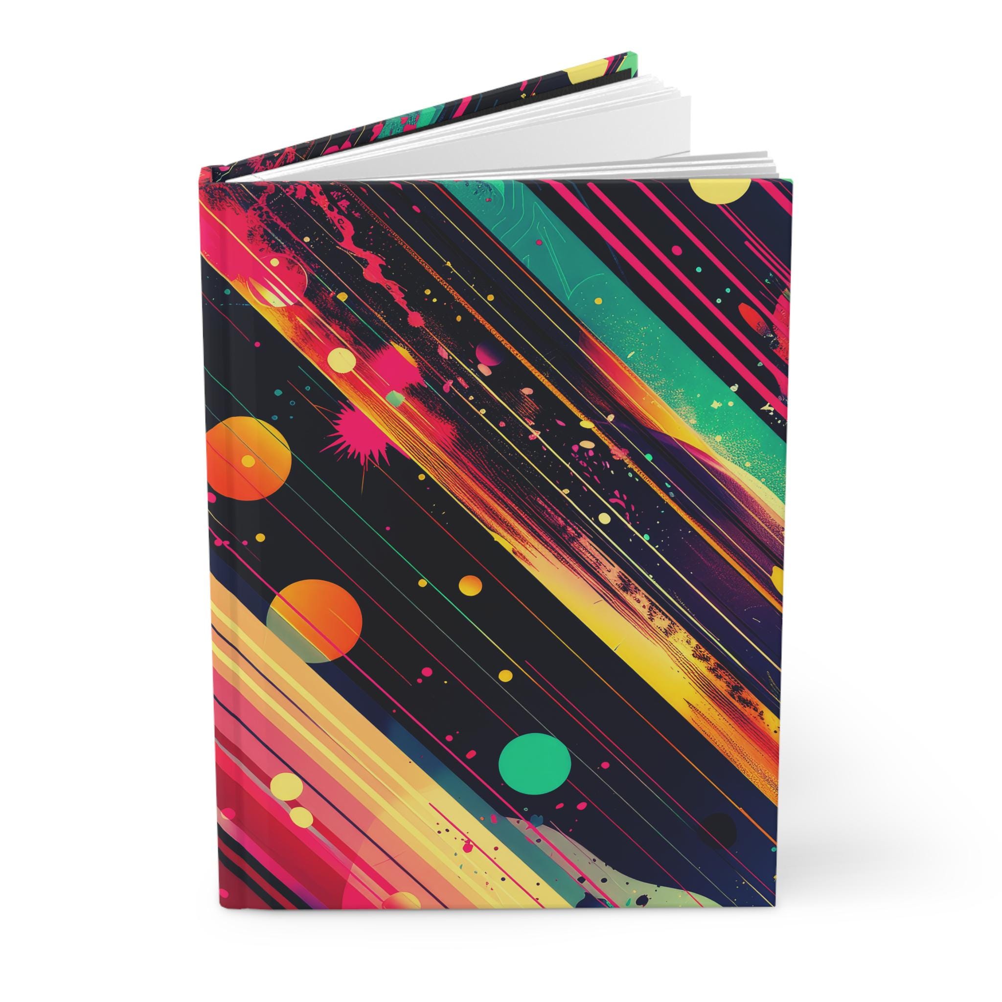 This hardcover journal brings an electric, late-night city energy to your everyday notes. Heavy matte lamination keeps the brilliant neon streaks and pops of color vivid, while the full-wrap design flows across the cover like a streak of music and motion. Inside, 150 lined pages with handy perforations give you room to map ideas, sketch concepts, or draft letters you can tear out cleanly. The sewn case wrap binding keeps the book flexible and durable, so it opens flat and travels well in a bag or under an arm. Keep it on your desk during sketch sessions, stash it in a tote for commute scribbles, or hand it to a creative friend who loves bold color and organized chaos.