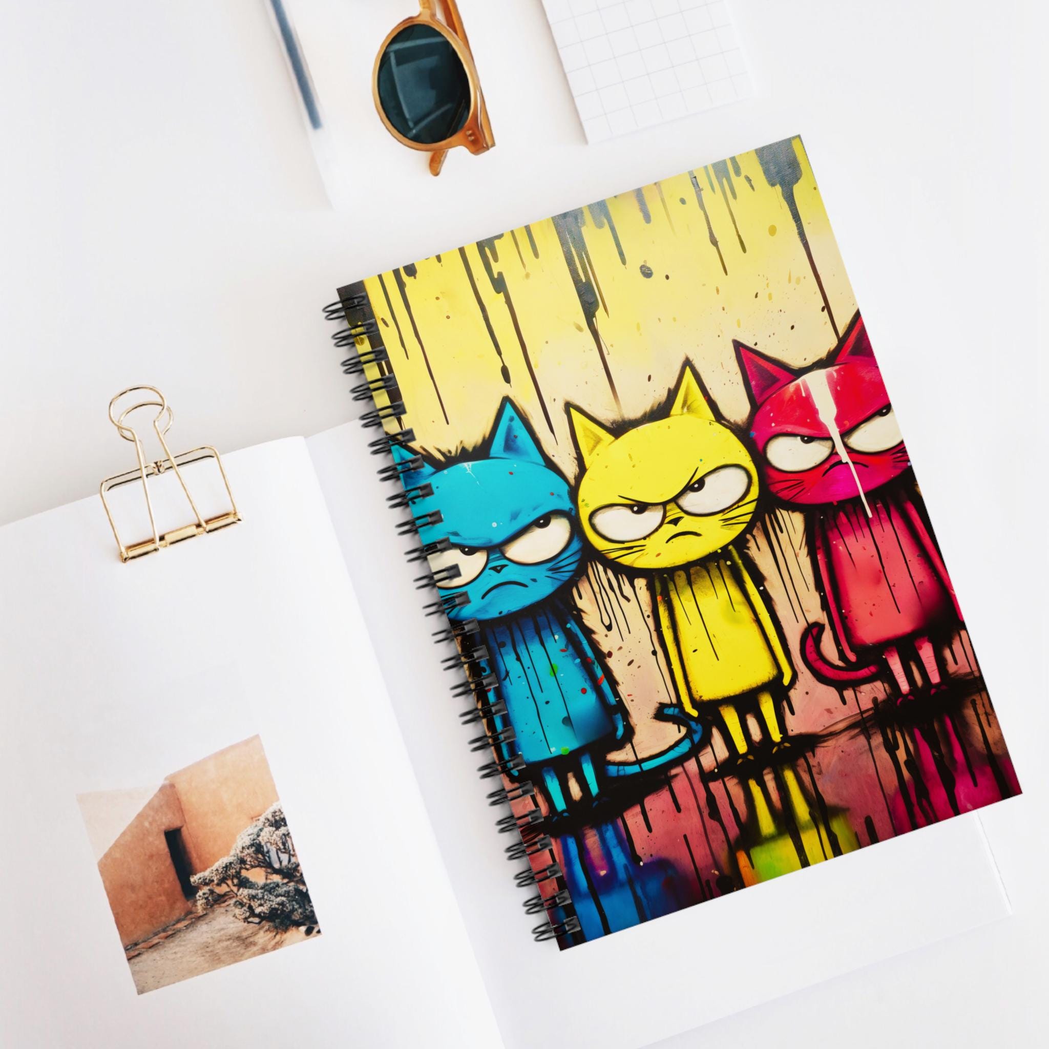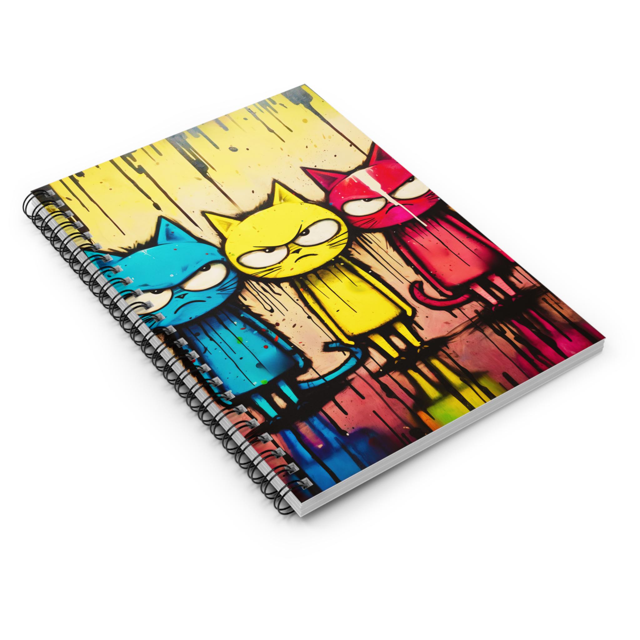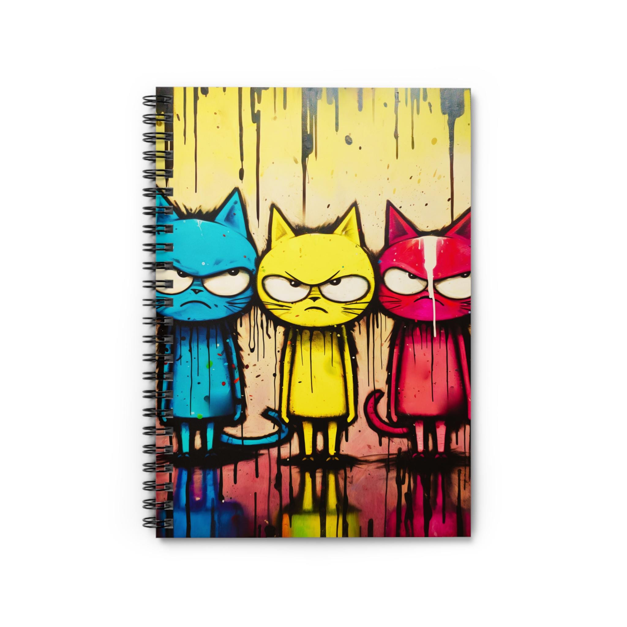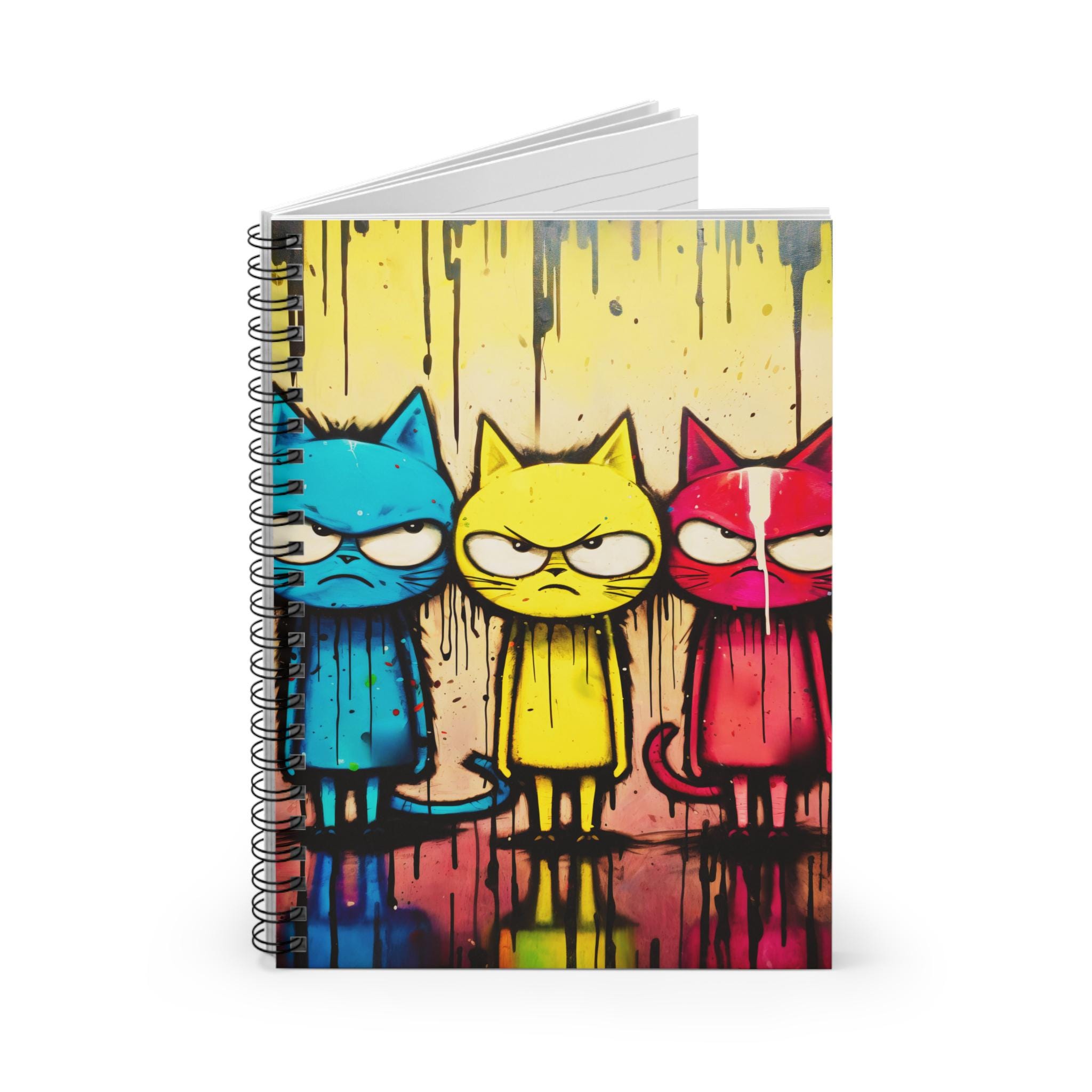 A lively ruled spiral notebook that brings bold street-art energy to everyday note-taking. The front cover features three expressive, graffiti-style cats in vibrant cyan, yellow, and magenta tones, set against paint-drip textures that feel raw and playful. Inside, crisp 90gsm lined pages invite clear handwriting and smooth pens, while a sturdy dark grey back cover and metal spiral make the notebook durable and easy to flip. A tucked document pocket on the inside back cover keeps loose notes, receipts, or small sketches close at hand. Compact and approachable at 6" x 8", it’s a colorful companion for sketching ideas, journaling thoughts, or keeping study notes organized.