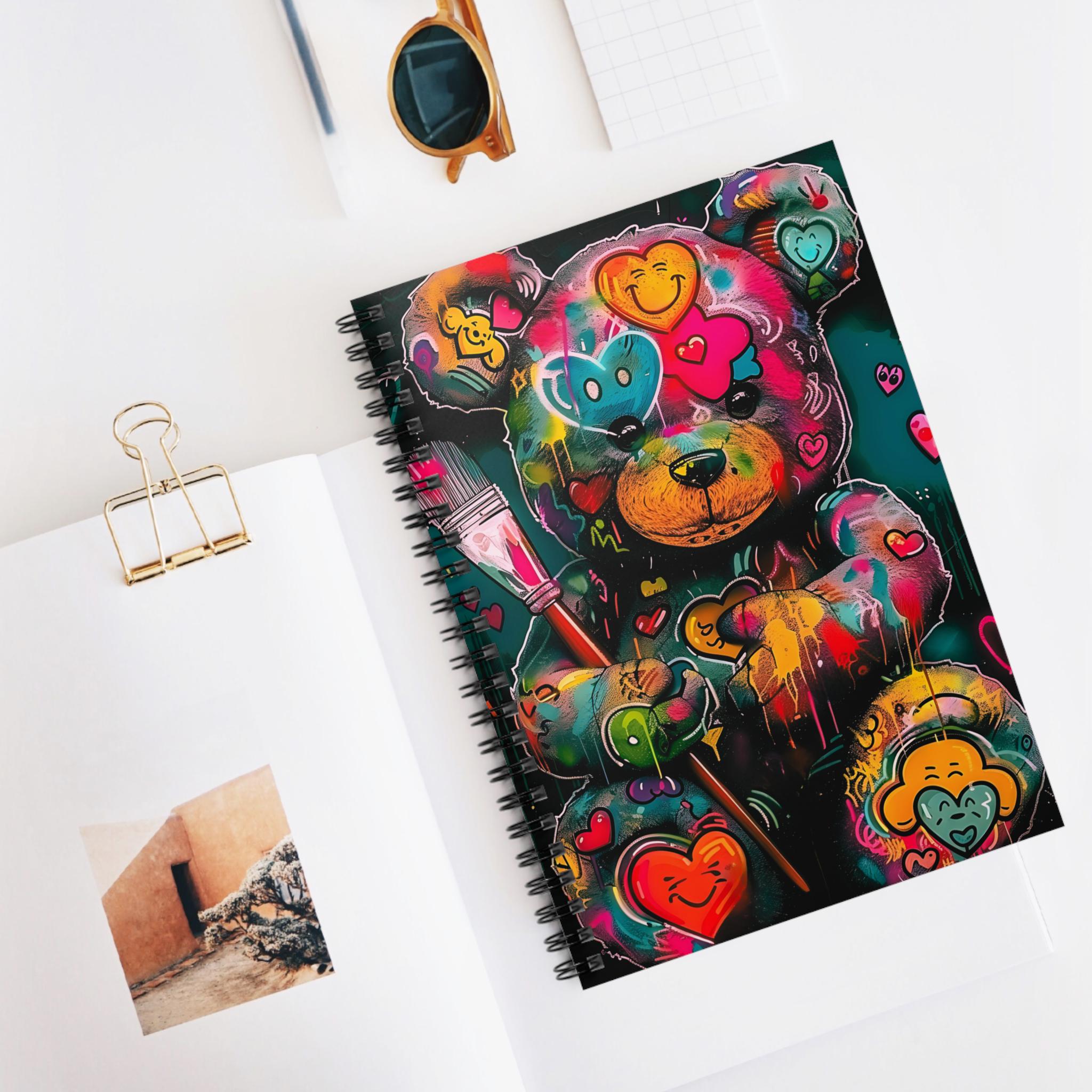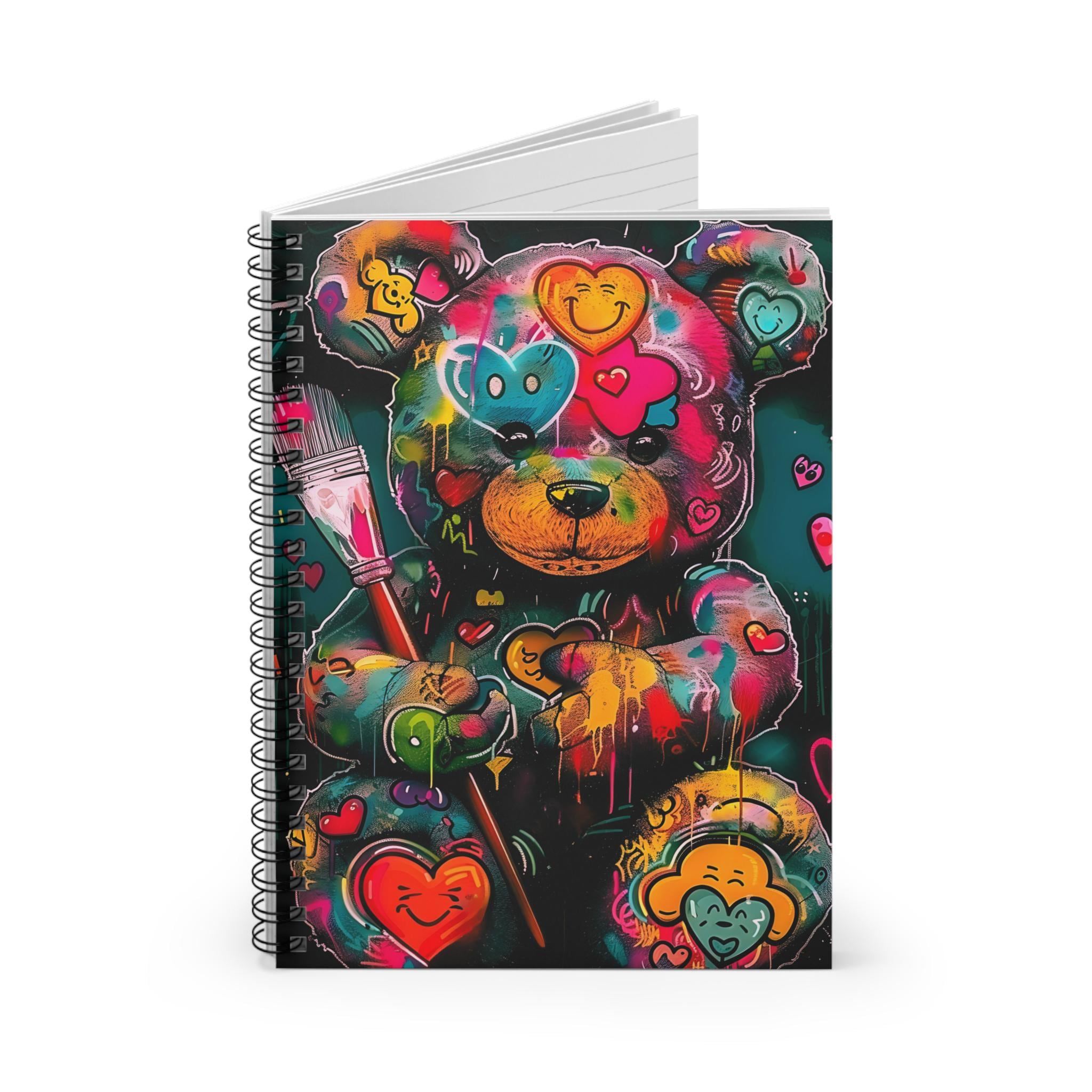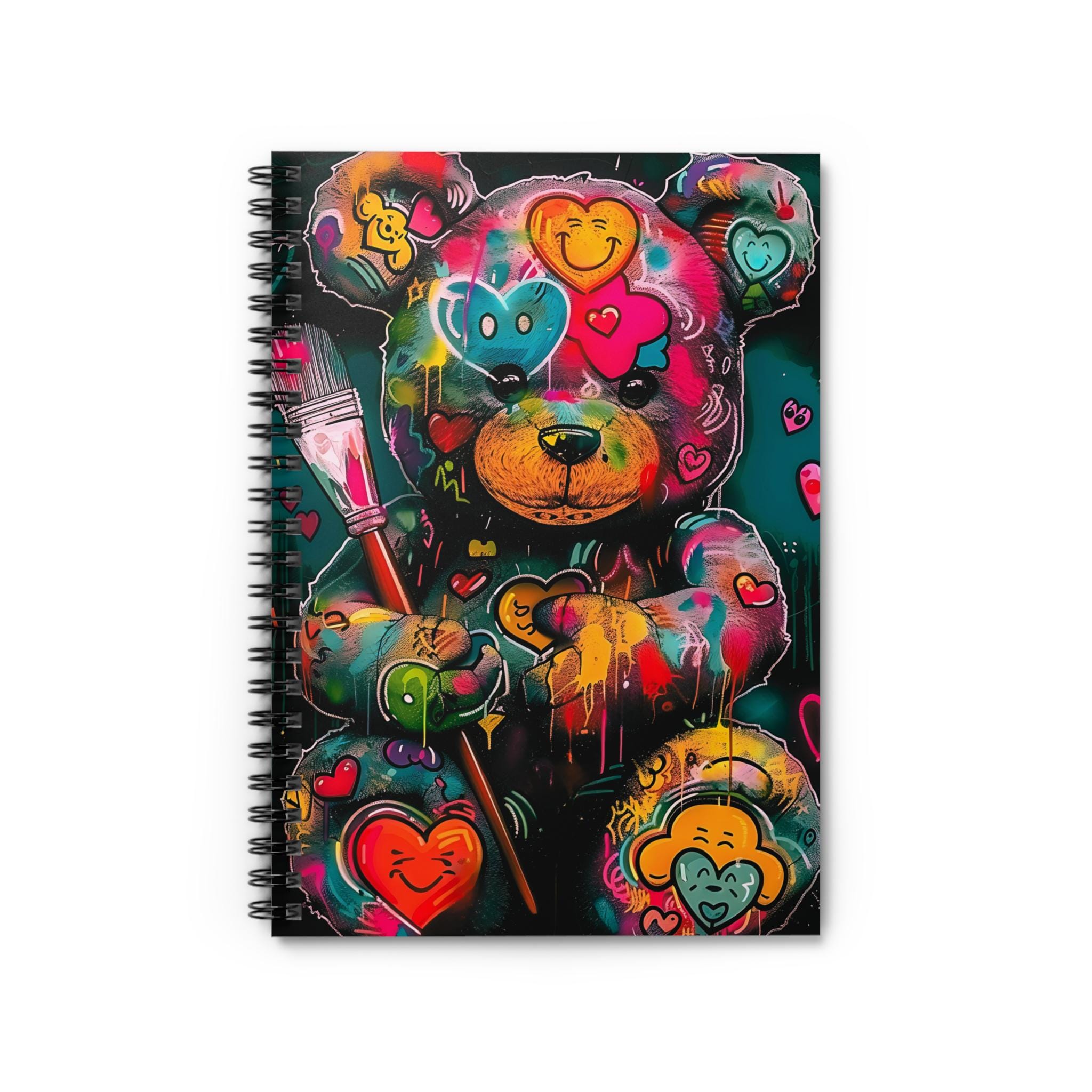 This spiral notebook brings a burst of street-art energy to everyday notetaking. The cover’s vibrant, graffiti-inspired bear — splashed with neon hearts and paint drips — turns routine lists and journal entries into something playful and expressive. At 6" x 8", it slips into bags and backpacks easily, while the sturdy 350gsm covers protect 118 ruled pages inside. A metal spiral lets pages lie flat or be removed cleanly, and a document pocket keeps loose notes or receipts tucked away. Use it for sketching color ideas, jotting down thoughts between classes, or keeping track of projects with a little extra personality.