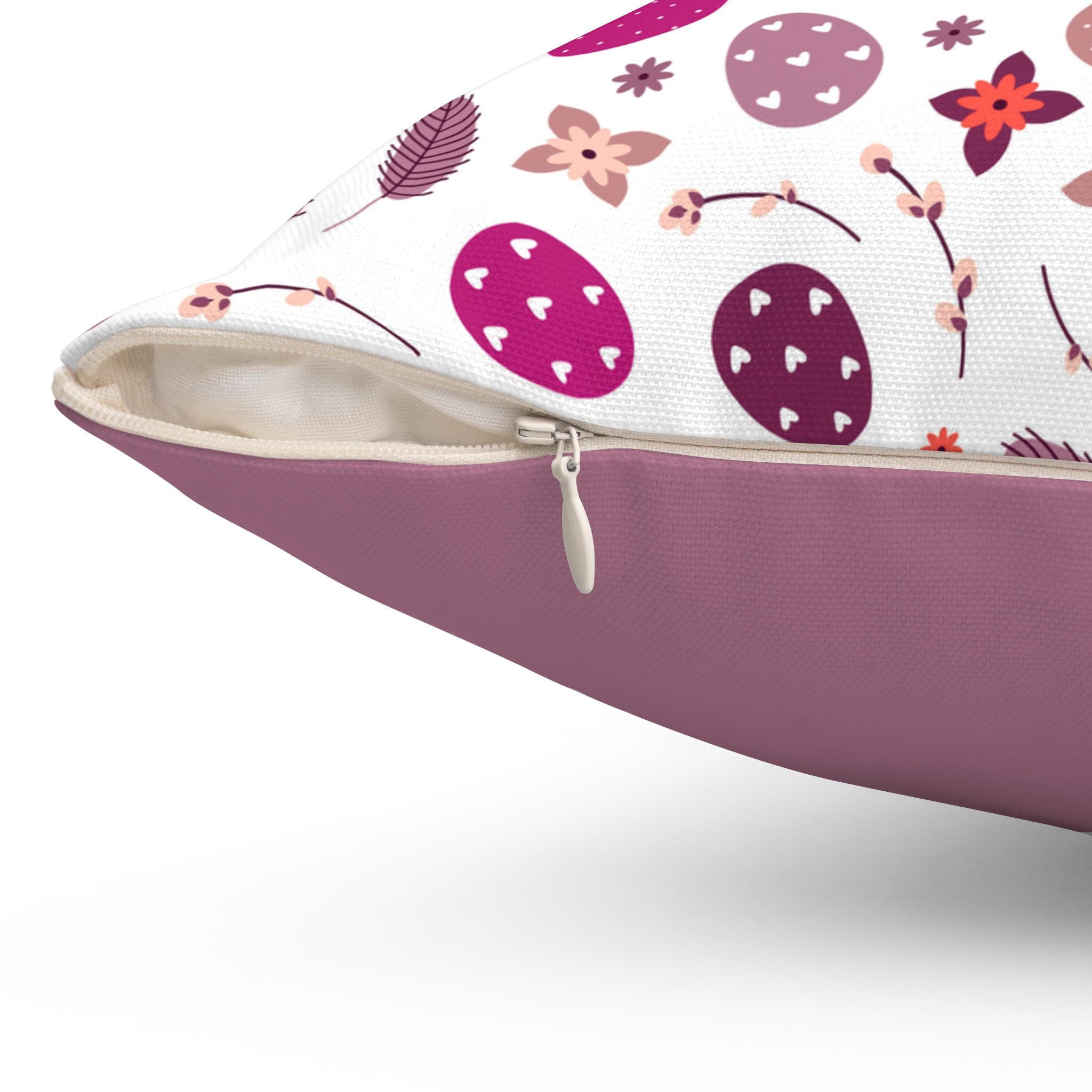 Soft, square throw pillow dressed in a warm, muted palette of mauve, blush, and dusty rose. One side shows a playful scatter of hand-drawn eggs, tiny flowers, and leaf motifs that feel both whimsical and organic. The reverse is a solid, coordinating mauve that anchors the pattern and makes it easy to style with layered cushions or minimalist decor. Light and low-maintenance, it brings a cozy, cottage-inspired note to sofas, reading nooks, or bedroom benches. The pillow arrives with a slightly oversized recycled polyester insert so the finished cushion looks plush and rounded once assembled.