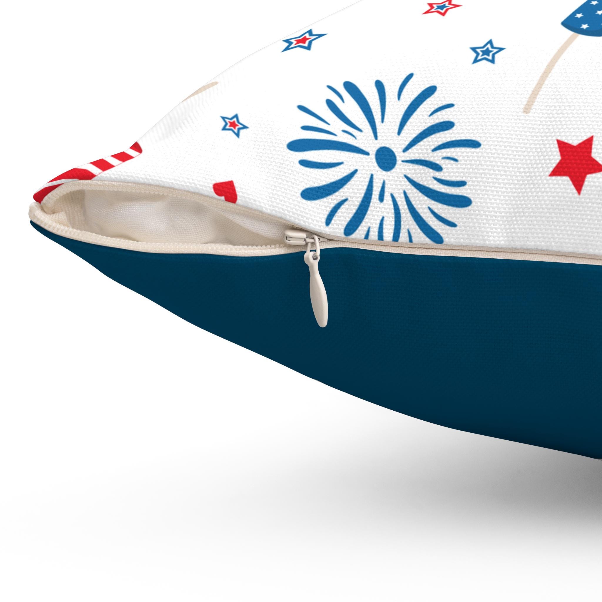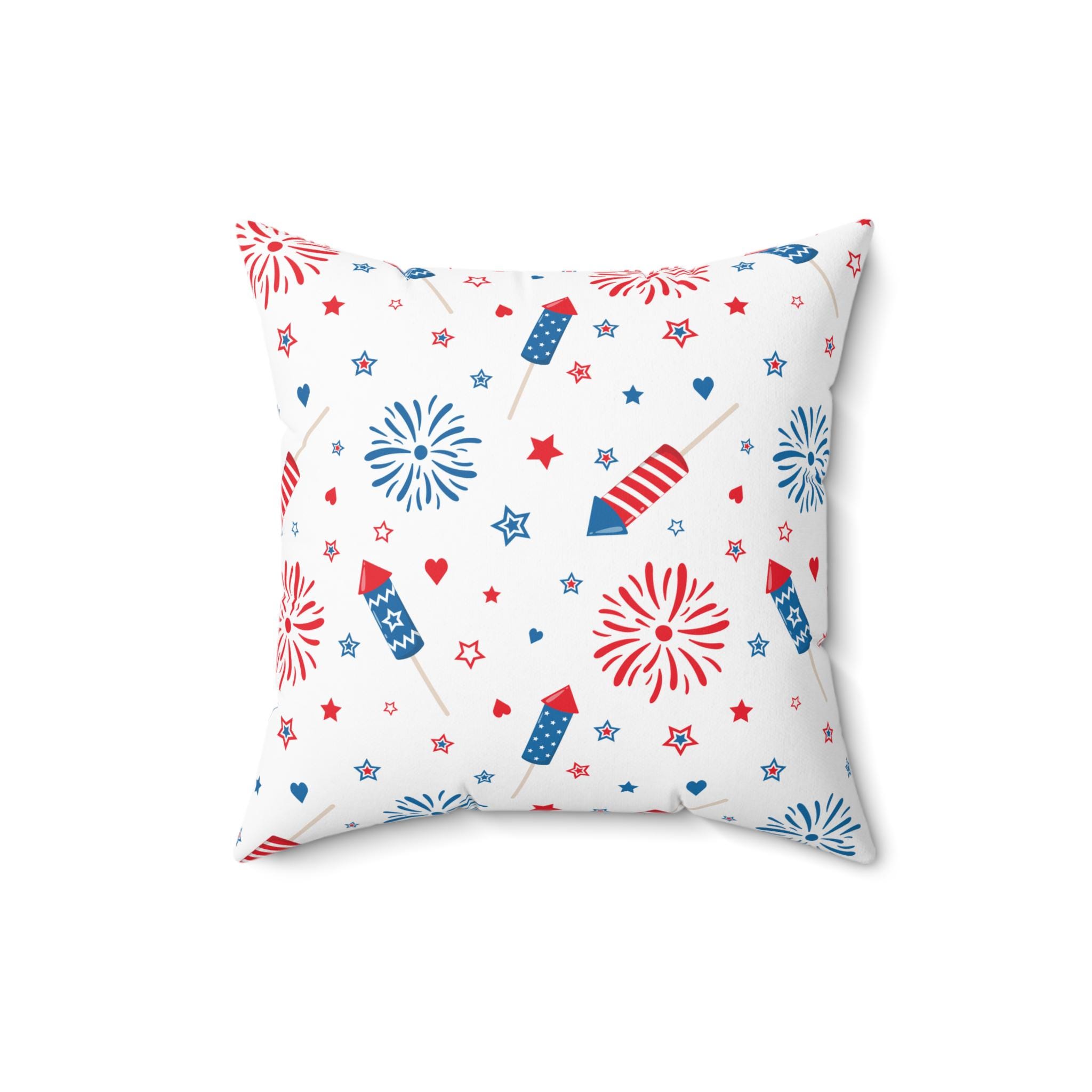 Bring playful summer nights and backyard celebrations into your living room with this vibrant square pillow. The double-sided print pairs a cheerful fireworks-and-rocket pattern in classic red, white, and blue with a deep navy reverse for a bold, balanced look. Soft spun polyester holds its shape without wrinkling, while a concealed beige zipper keeps the design seamless. Use the included recycled-poly insert to create a full, lively cushion that brightens sofas, benches, or outdoor seating during warm-weather gatherings and patriotic holidays.