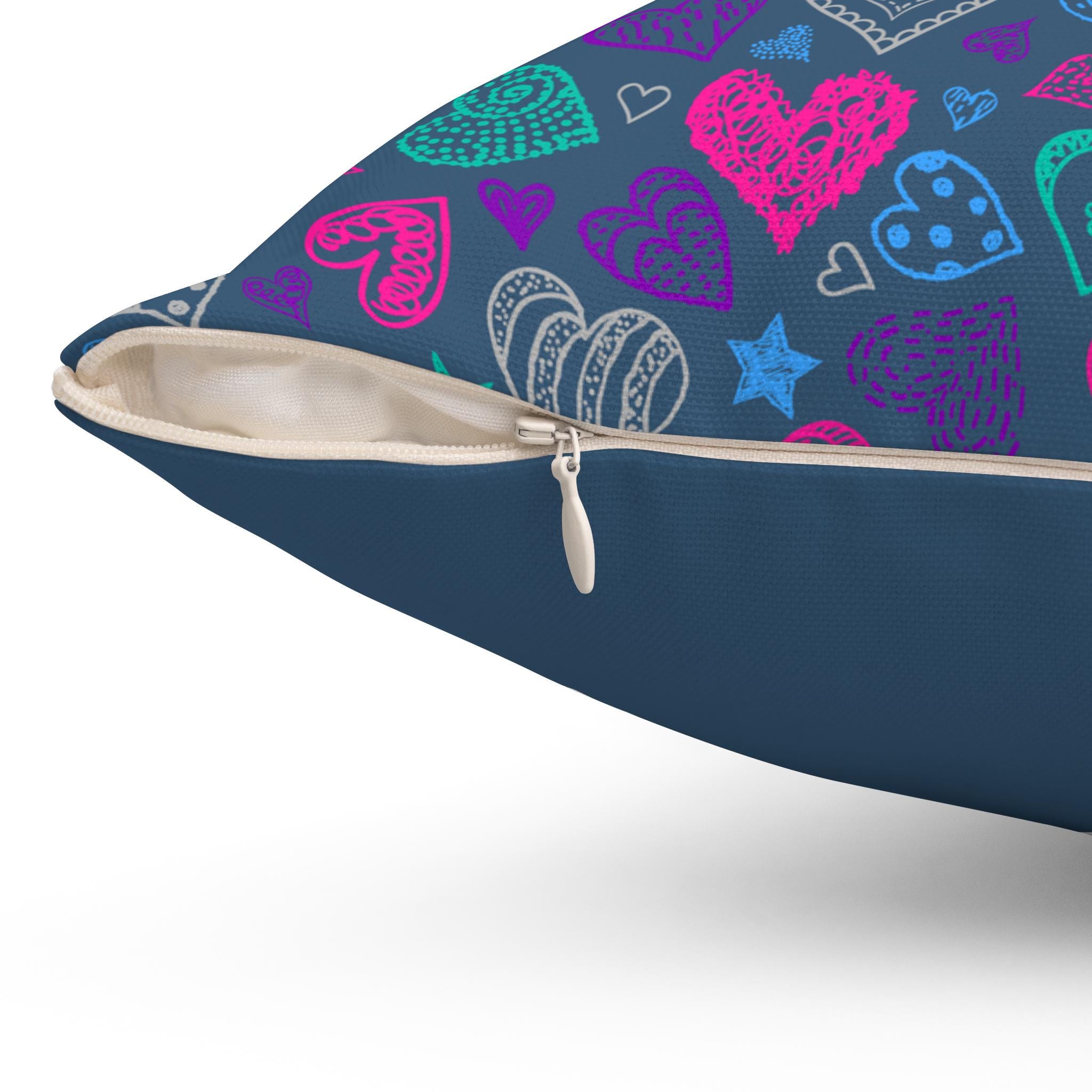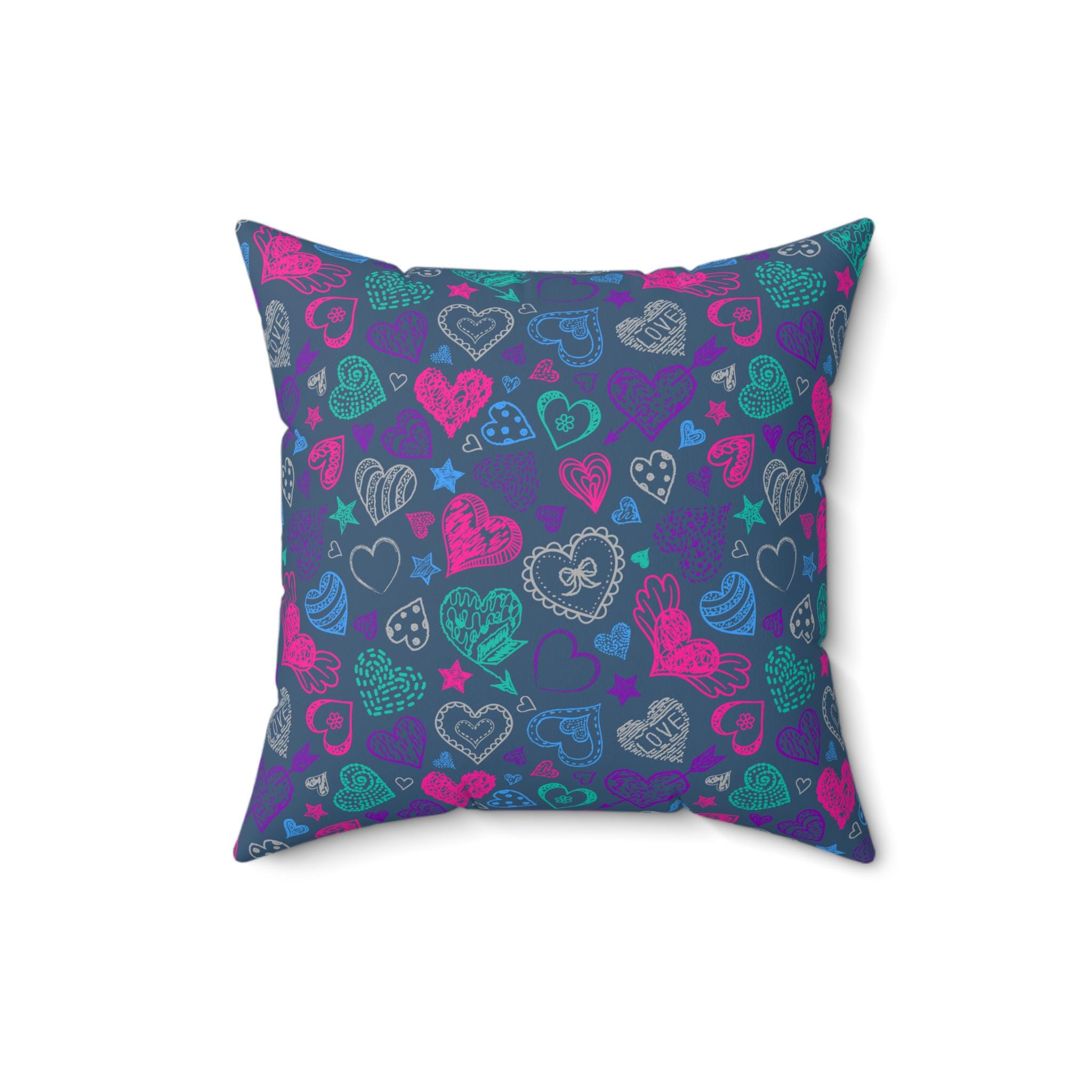 Hand-drawn hearts dance across a deep indigo field in bright teal, magenta, and slate — a playful, cozy accent that brings personality to a sofa, reading nook, or kids’ corner. The spun polyester cover keeps the colors vivid and the shape crisp, while the recycled-poly insert arrives vacuum-packed so you can fluff it up to a plush, full look. Double-sided printing means the pattern shows from every angle, and the concealed beige zipper keeps the silhouette clean. This pillow reads like a small celebration: lively, warm, and built to stay cheerful through everyday use and quiet evenings alike.