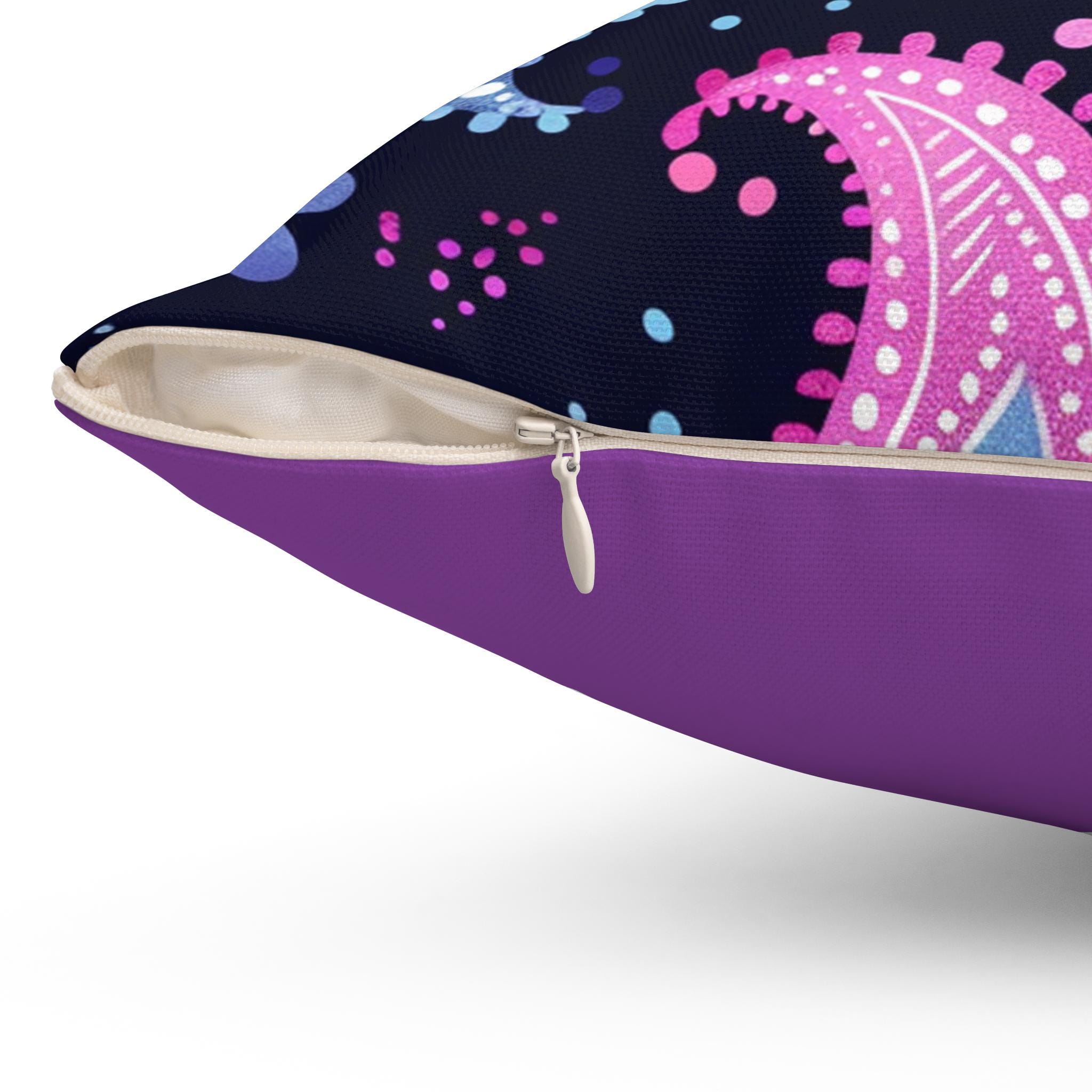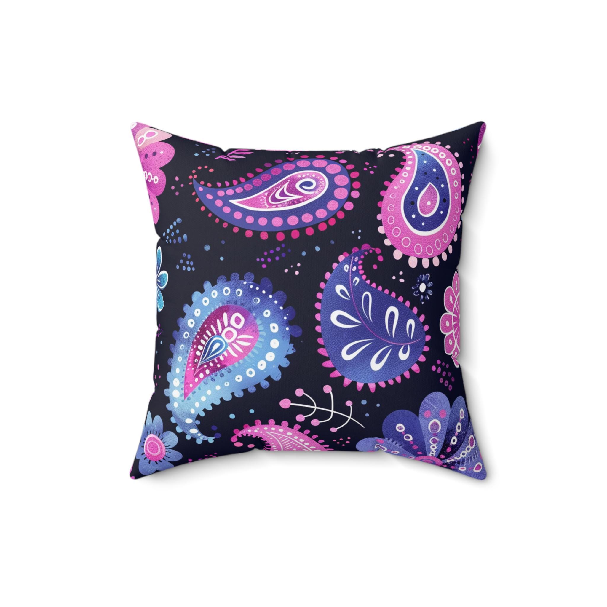 A vibrant throw pillow that brings playful bohemian energy to any room. Deep navy background sets off hand-drawn paisley motifs in bright pinks, purples and icy blues. The double-sided print keeps the pattern lively from every angle, while a concealed beige zipper maintains a clean, finished look. Plump recycled polyester insert (shipped separately) nests inside the cover to create a full, cushioned silhouette once assembled. Tuck it on a reading chair, layer it on a sofa with textured throws, or let it brighten a bedroom corner — it adds a cozy, artsy accent without demanding attention.