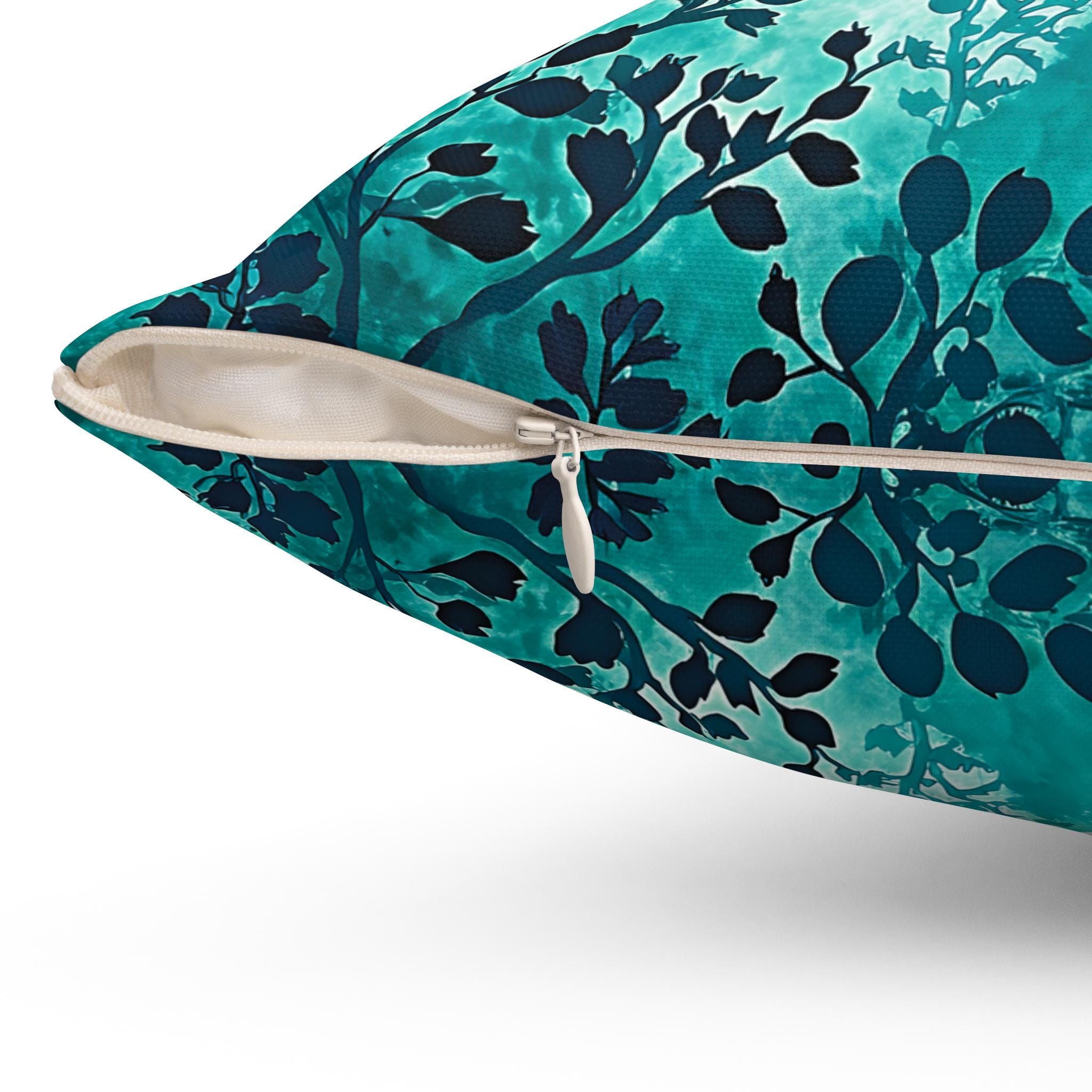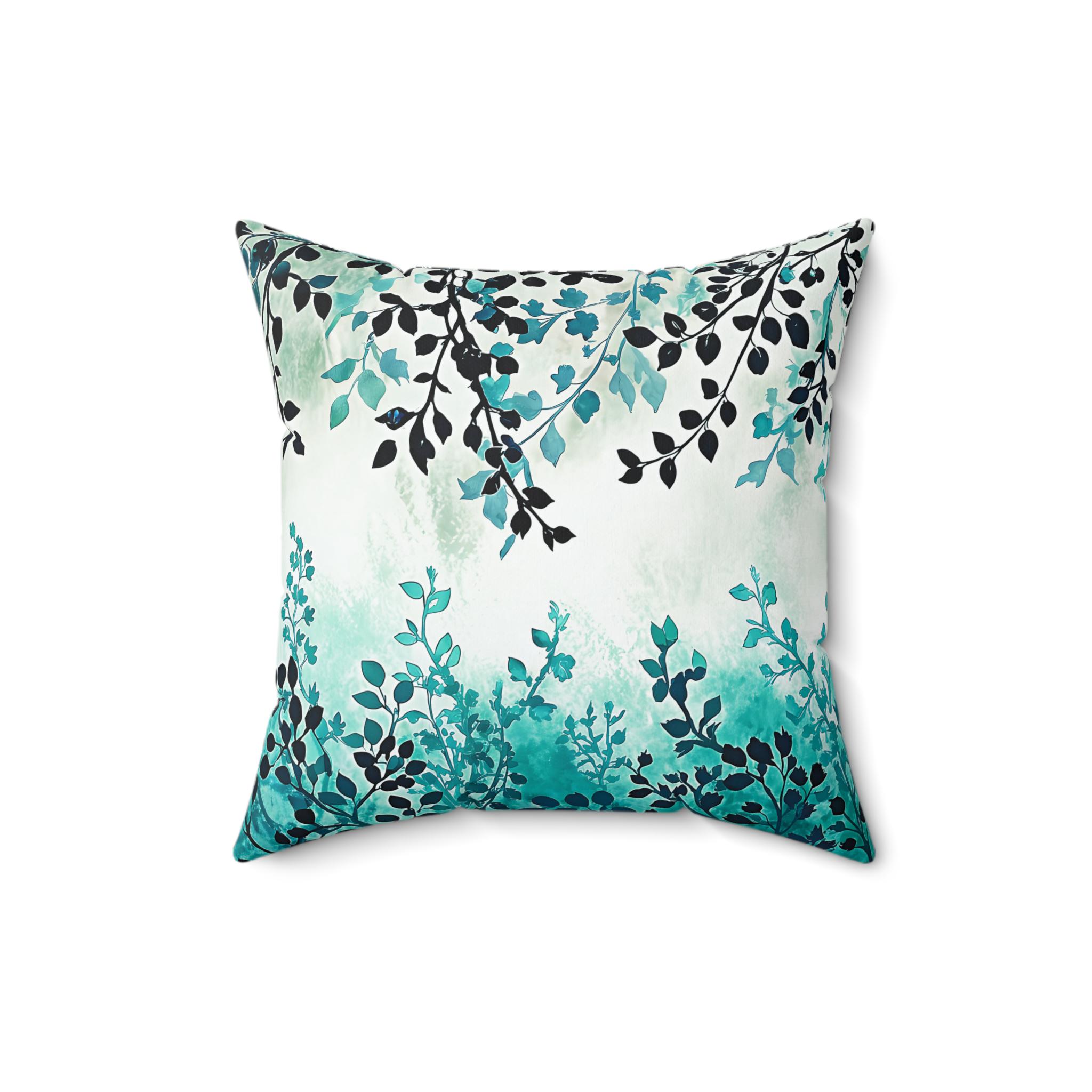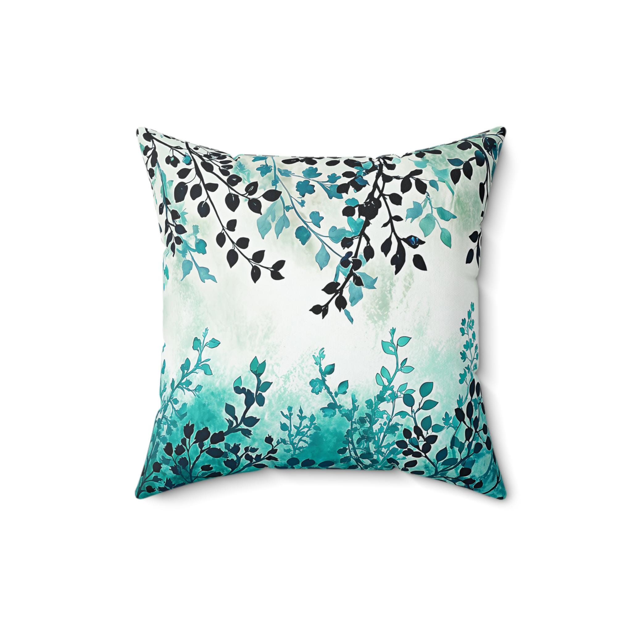Bring a wash of calm and nature into your living space with this square throw pillow. Soft, painterly foliage in teal and mint drifts across both sides, while delicate black branches add contrast and a hand-painted feel. The fabric keeps its shape and resists wrinkles, and the recycled polyester insert ships vacuum-packed so you can fluff it for a fuller, lofted look. Tuck it into a reading nook, layer it on a sofa, or place it on a bedroom bench to lend a tranquil, botanical touch that feels quietly handmade and thoughtfully curated.