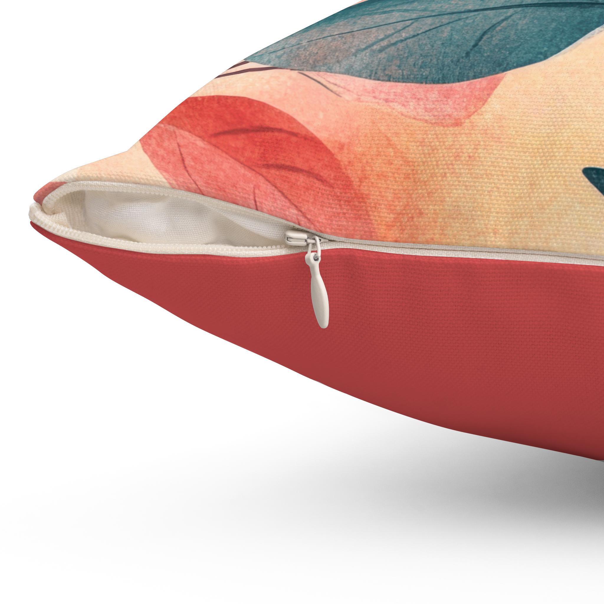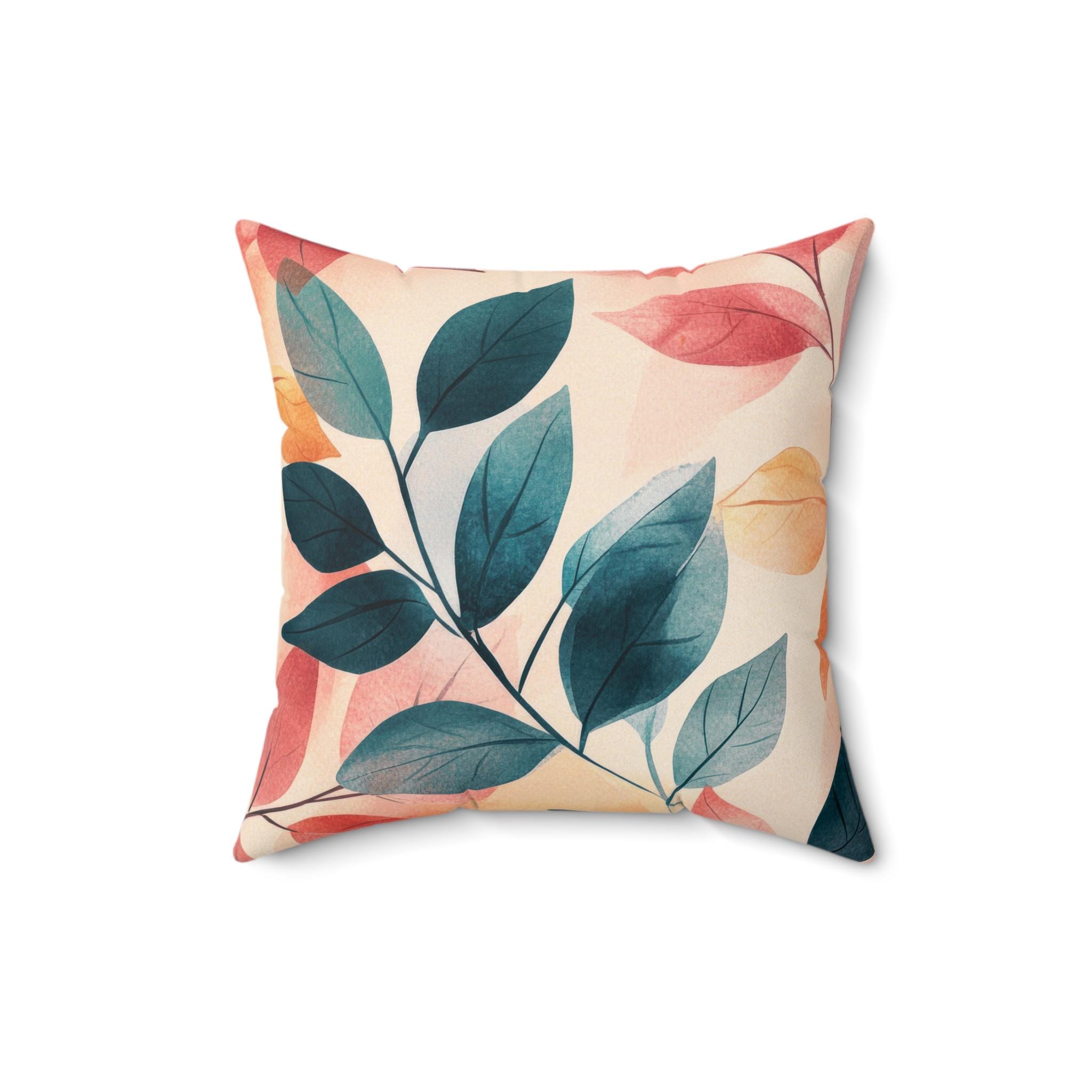 A soft, spun-polyester square pillow with a painterly botanical print on one side and a warm coral back — it brings a calm, organic touch to living rooms, reading nooks, or sunlit bedrooms. The colors feel hand-mixed: deep teal leaves and gentle coral and ochre accents on a creamy background. It holds its shape thanks to a slightly oversized recycled poly insert (shipped vacuum-packed), and a concealed beige zipper keeps the silhouette clean. Slip it into a couch cluster or lean it against a favorite armchair to add a relaxed, artful note to everyday moments.