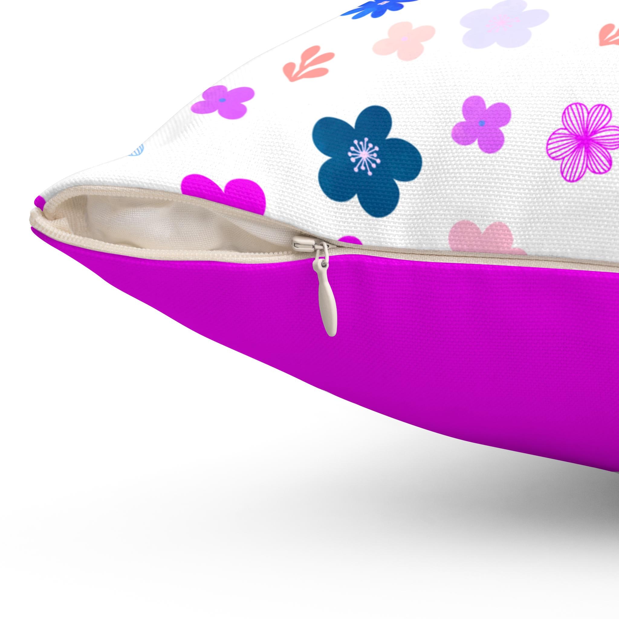 A cheerful square pillow that brings bright, playful energy to any room. The front features a double-sided floral pattern in lively pinks, purples, blues and soft peach accents on a clean white ground. The back shows a bold solid magenta that lets you switch the mood in a heartbeat. Lightweight spun polyester holds shape without wrinkling, and the concealed beige zipper keeps the look seamless. The recycled polyester insert ships vacuum-packed to avoid creases and expands 2–3 inches larger than the cover for a plump, rounded finish once assembled. Tuck it on a couch, an armchair, or a cozy reading nook to add a pop of color and a touch of handmade charm.