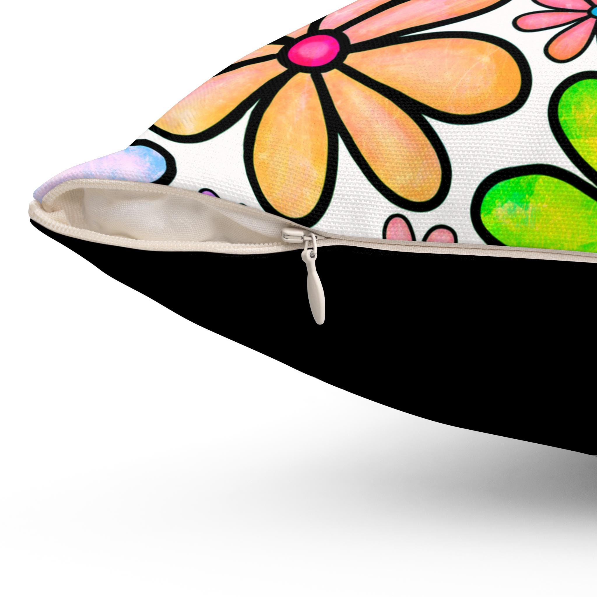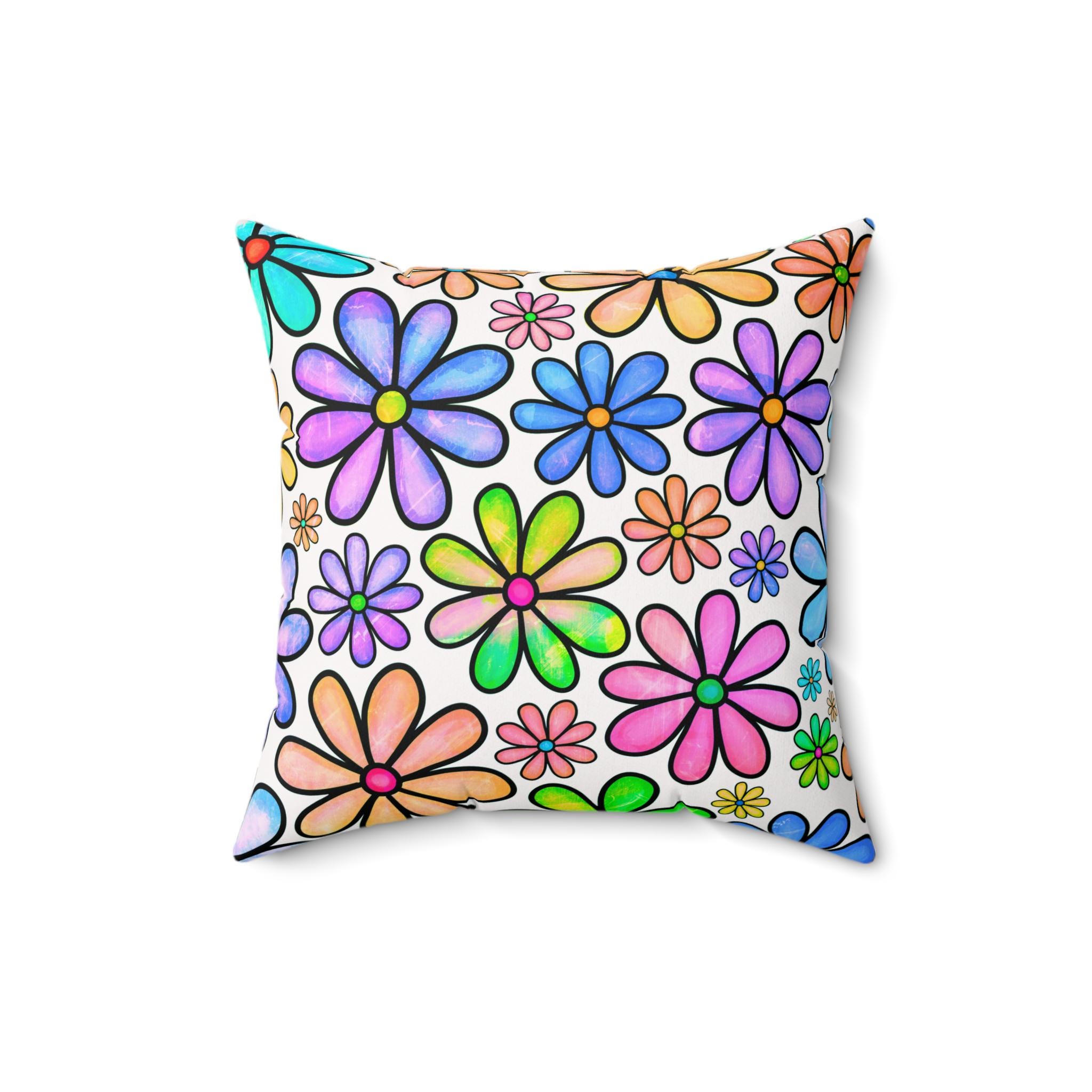 Bright, hand-drawn blooms burst across both sides of this square pillow, bringing a playful, retro-meets-modern energy to any room. The cheerful floral pattern is rendered in watercolor-like hues—lavender, mint, peach, and sunshine yellow—on a clean white background, creating a lively focal point without overwhelming the space. Stuffed with a slightly oversized recycled polyester insert, the cushion keeps a full, pillowy silhouette that invites sinking in during reading nooks, sunlit porches, or cozy living rooms. The concealed beige zipper keeps the look seamless while making it easy to remove the cover for care. Lightweight, wrinkle-resistant spun polyester preserves the crisp print and bright colors, so your pillow stays fresh and vibrant through everyday use.